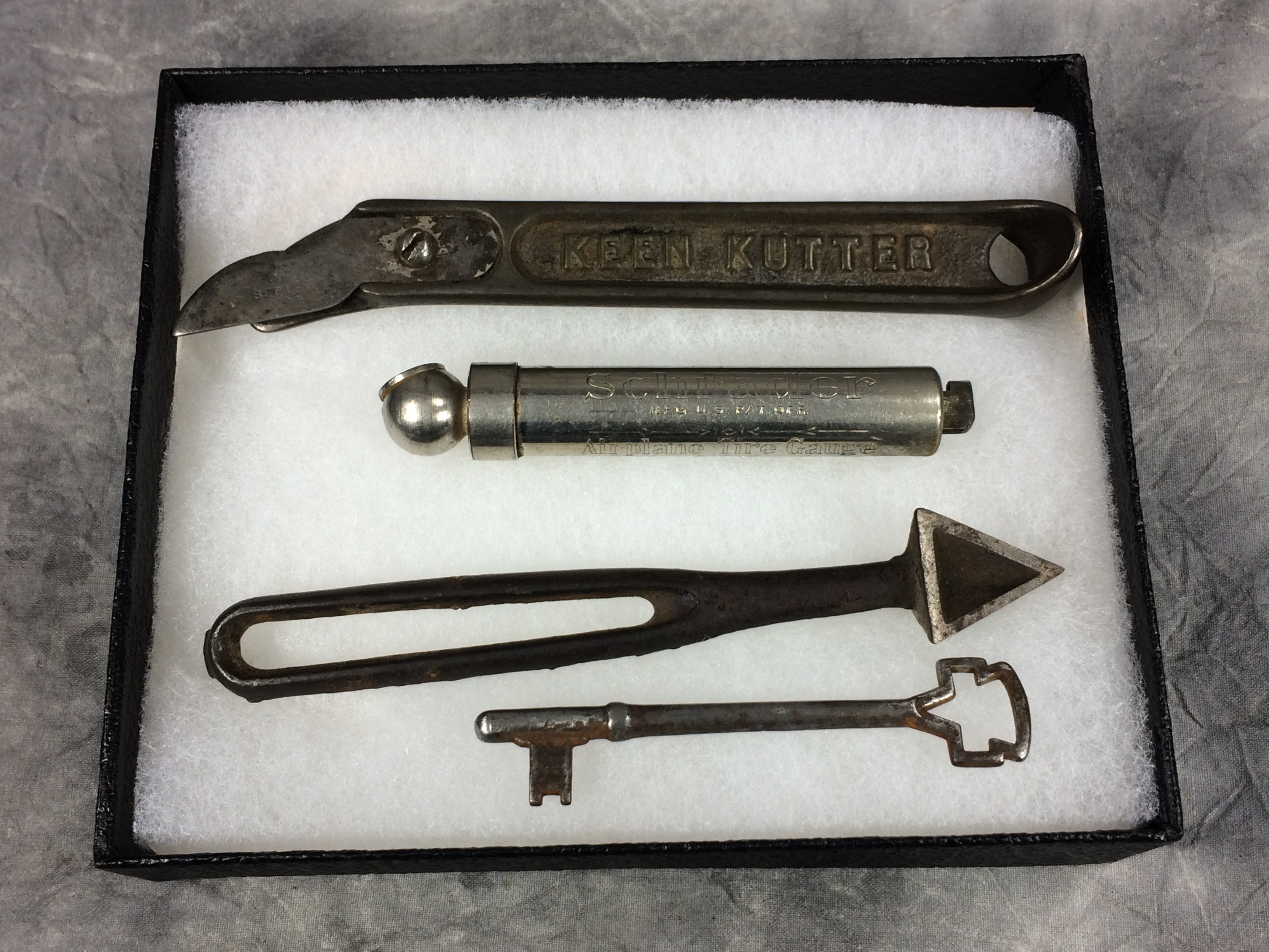 KEEN KUTTER & SCHRADER Tool Lot - Box Cutter, Key, Airplane Tire Gauge, Reamer