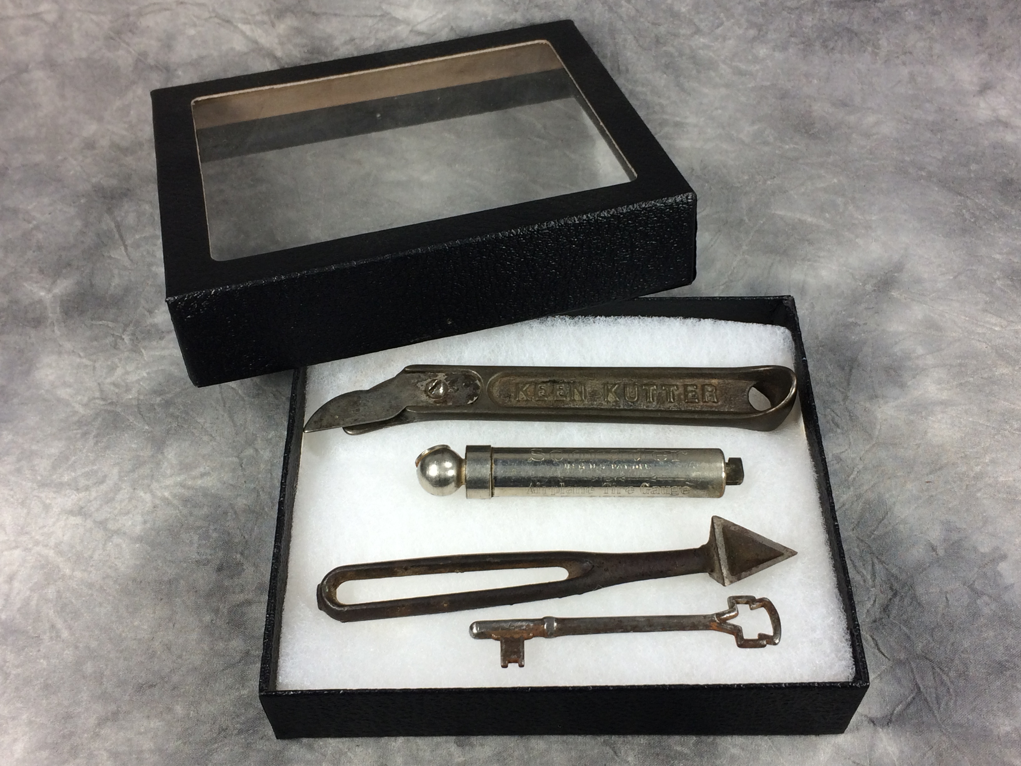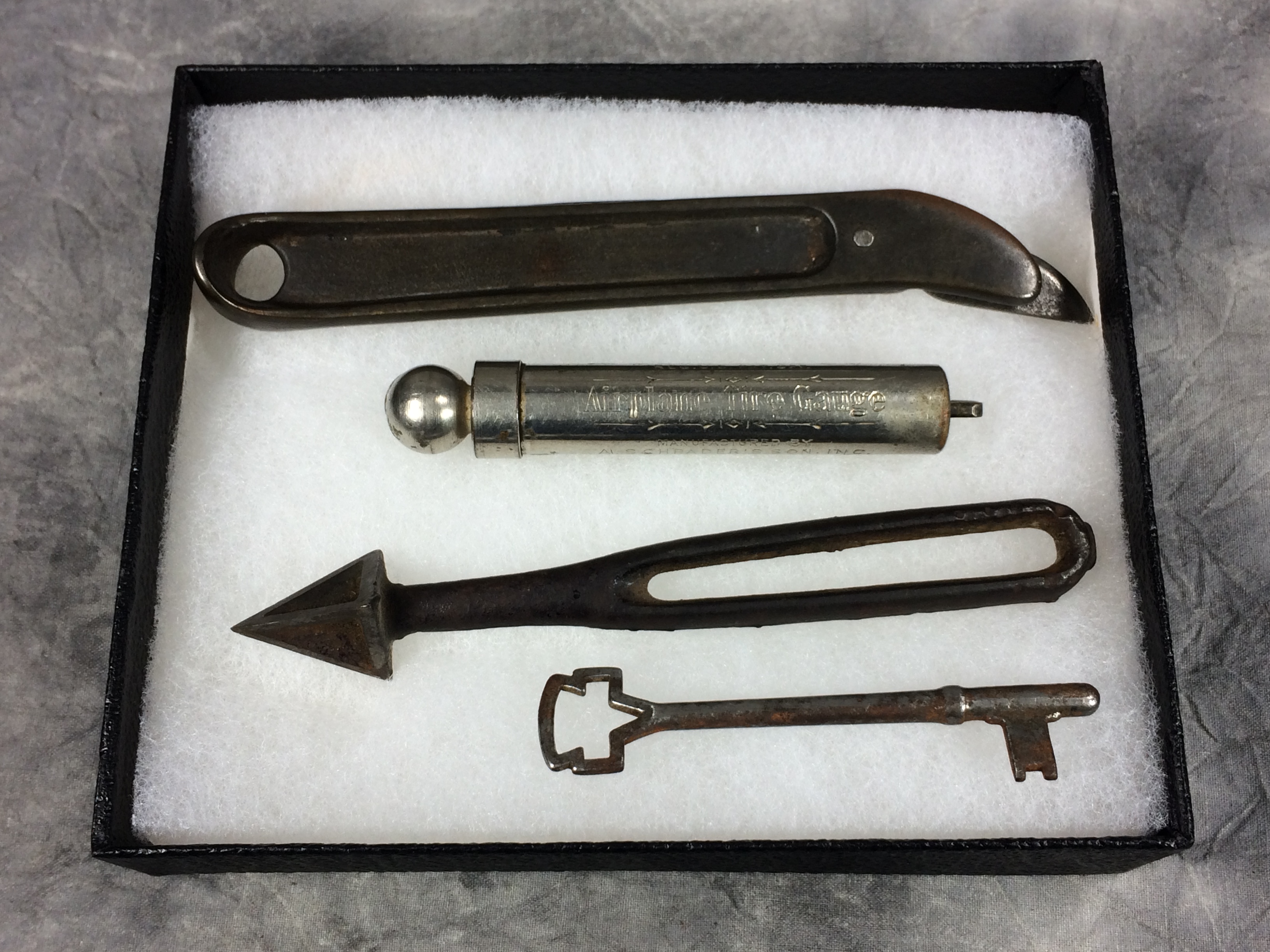 You have: KEEN KUTTER & SCHRADER Tool Lot - Box Cutter, Key, Airplane Tire Gauge, Reamer
