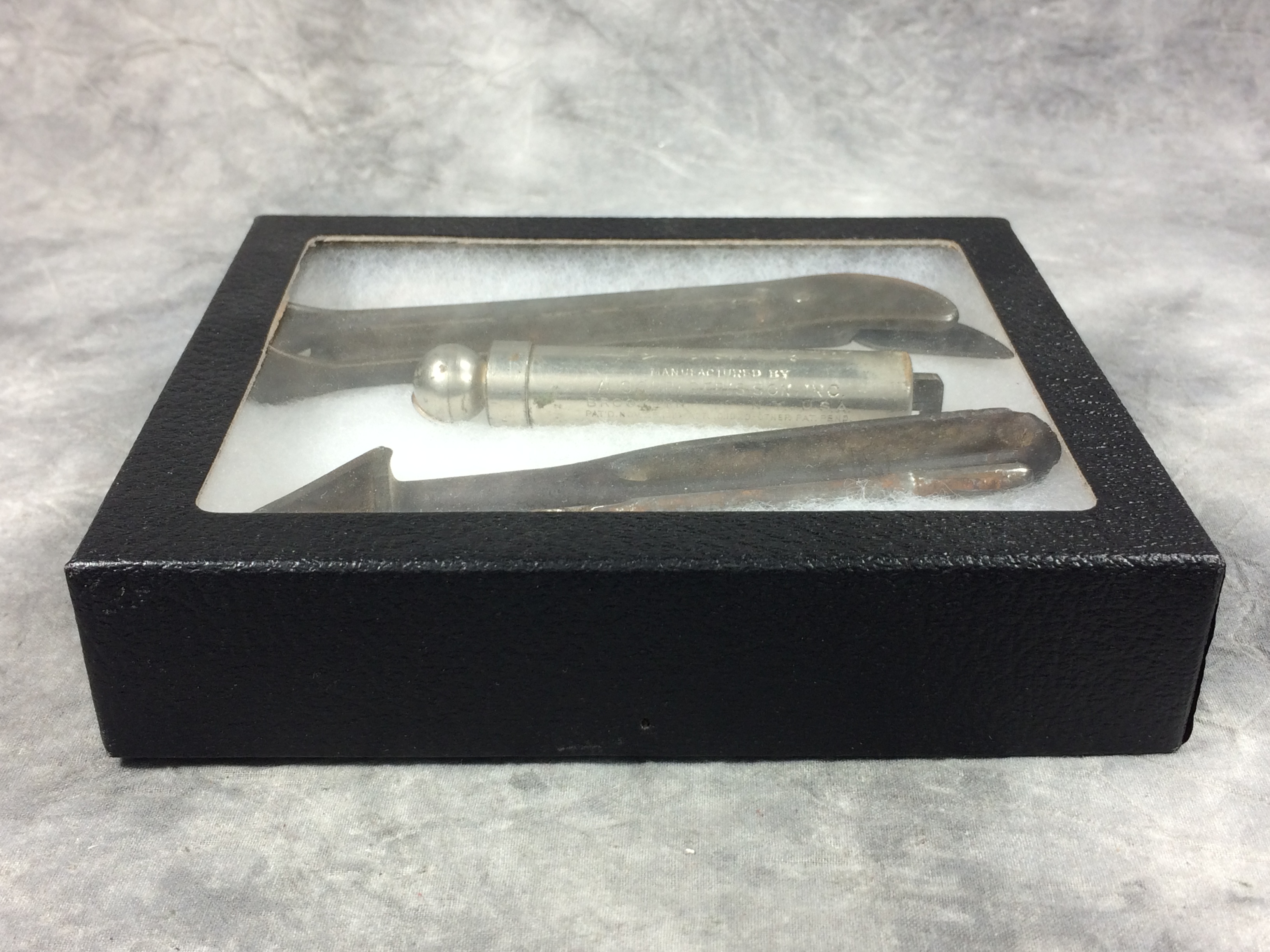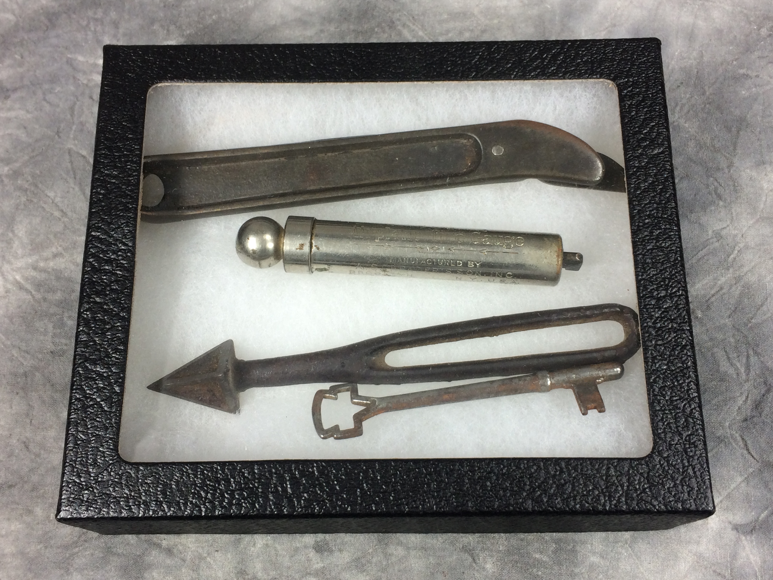 December 07, 2025 - Lot of 4 vintage tools. Includes a Keen Kutter Box Cutter and Key, a Schrader airplane tire gauge, and an unbranded tool that appears to be a reamer.
