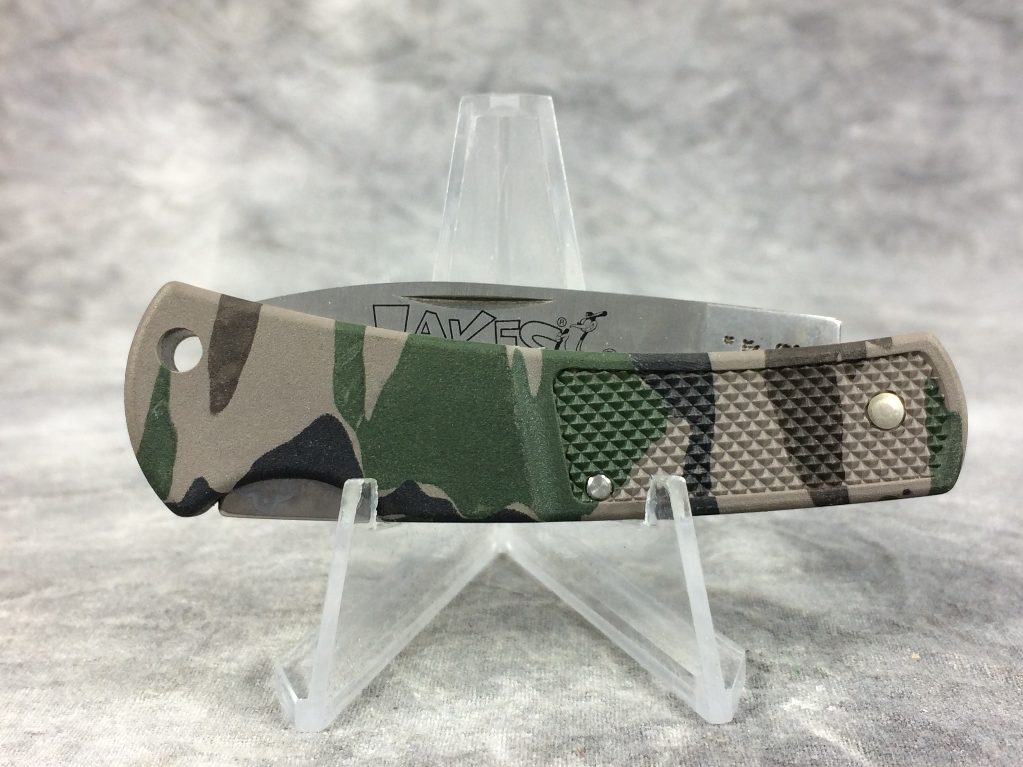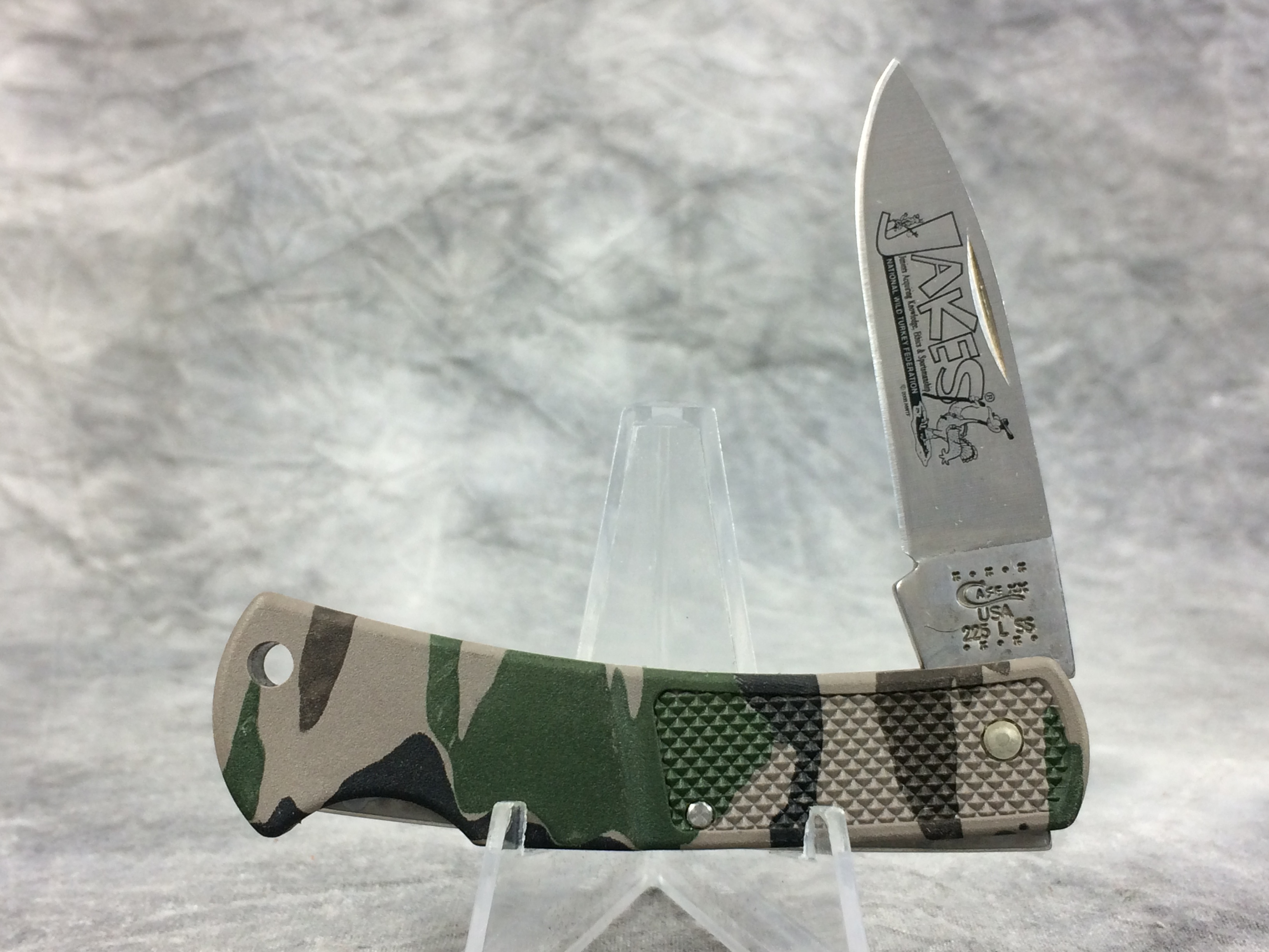 March 06, 2026 - 3 inches closed. 5-1/4 inches open. Made in USA. "  x*x*x  Case XX USA 225 L SS  *x*x*  " (with lightning bolt S) and tang stamp. Stainless Steel blade etched "JAKES Juniors Acquiring Knowledge, Ethics and Sportsmanship NATIONAL WILD TURKEY FEDERATION". Camo handle.