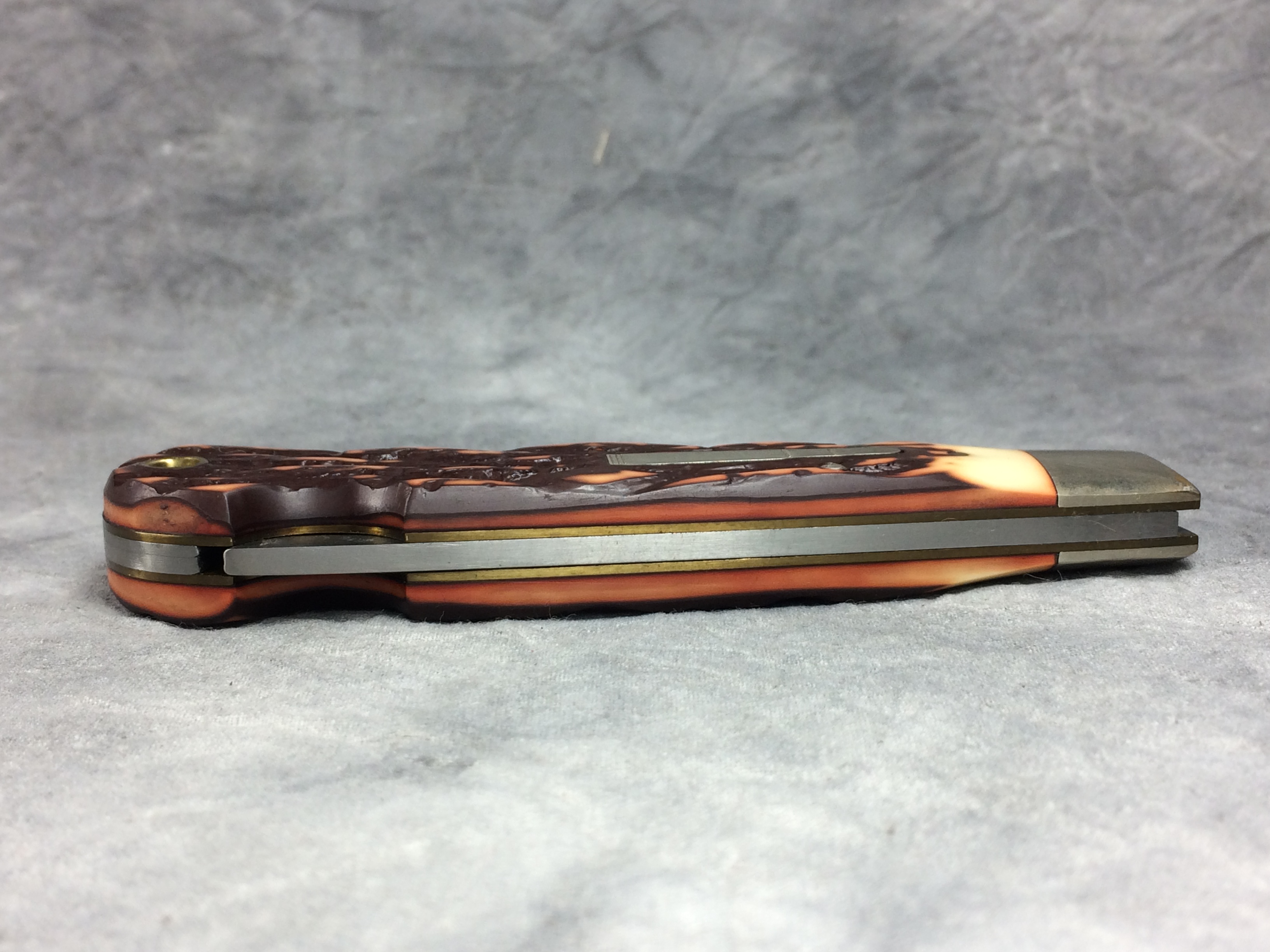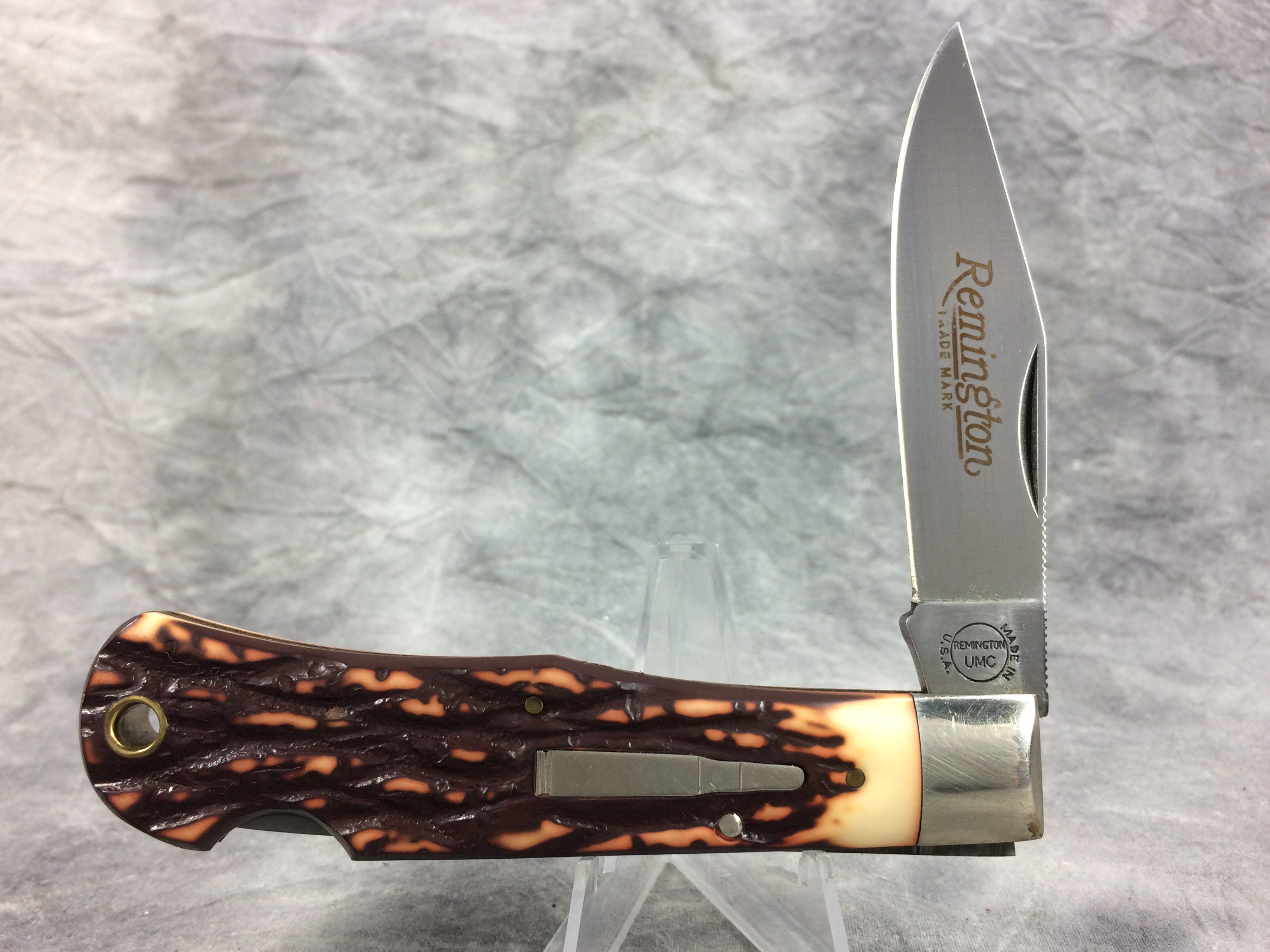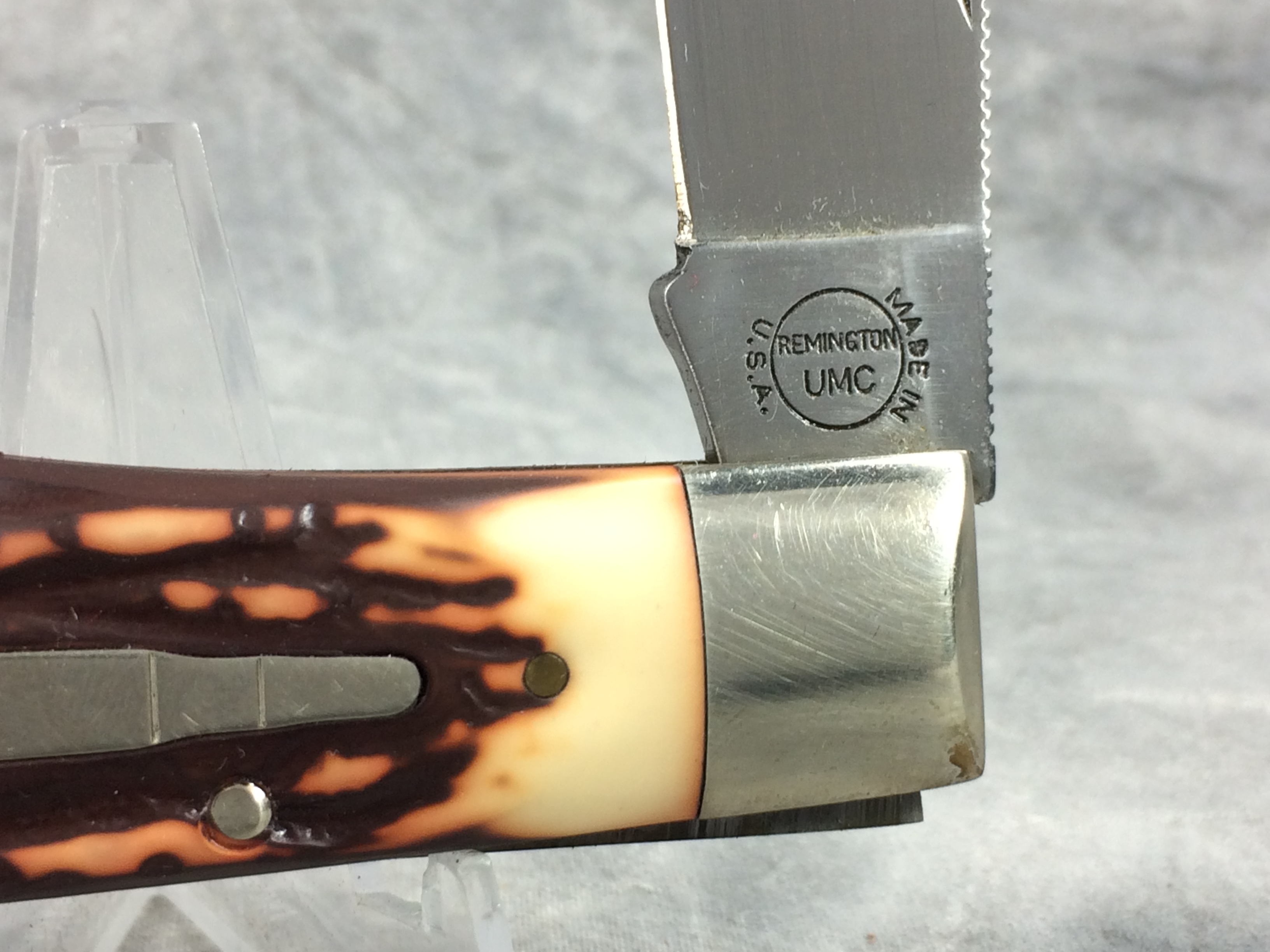 December 22, 2025 - Single-blade Bullet Knife. 4-1/2 inches closed. 7-7/8 inches open. Made in USA. 'Remington UMC Made in U.S.A.' and 'R1306 1990' tang stamps. Bullet shield. Stainless Steel blade etched 'Remington TRADEMARK'. Jigged delrin handle. Nickel Silver bolsters. Brass liner.