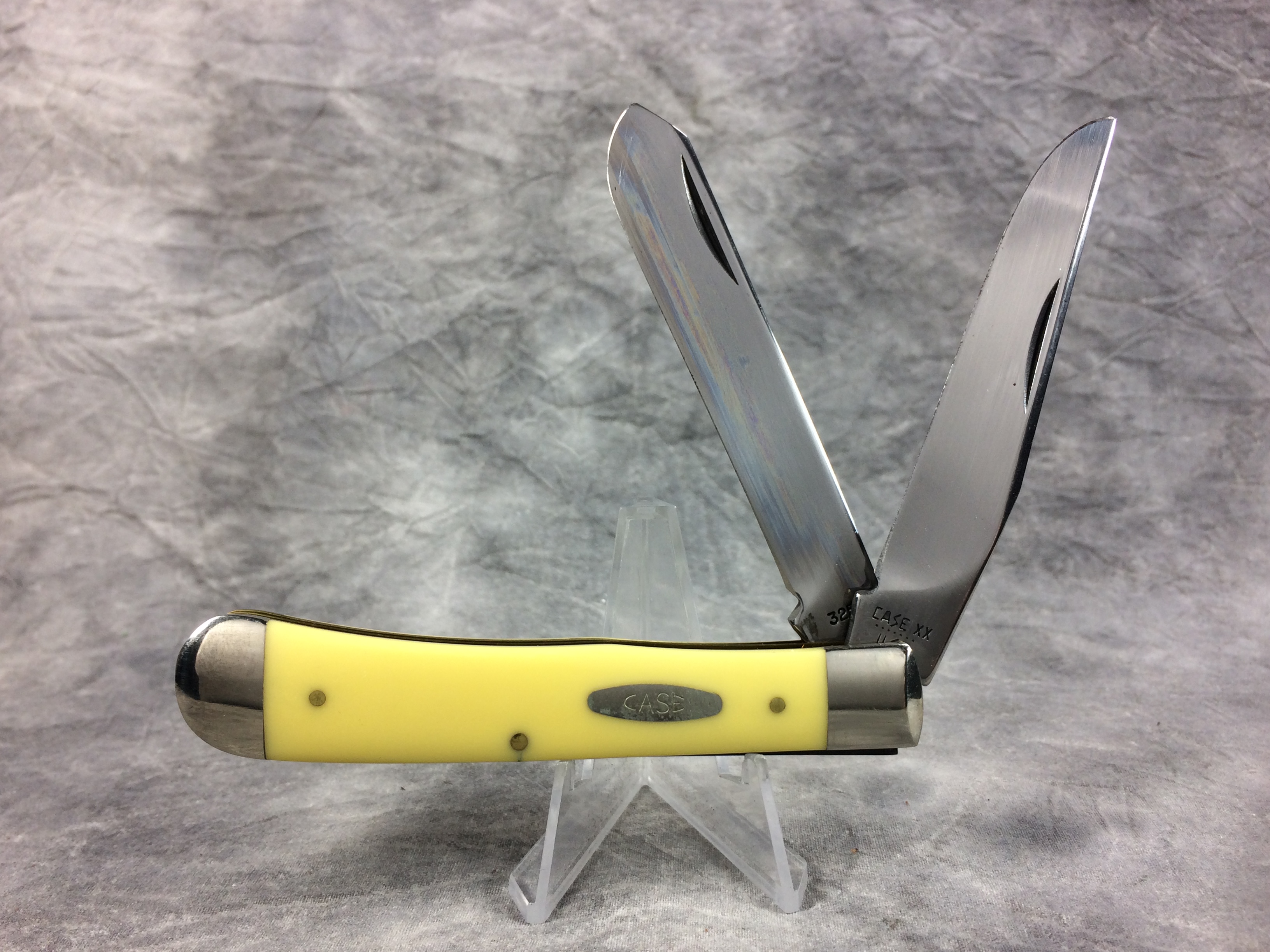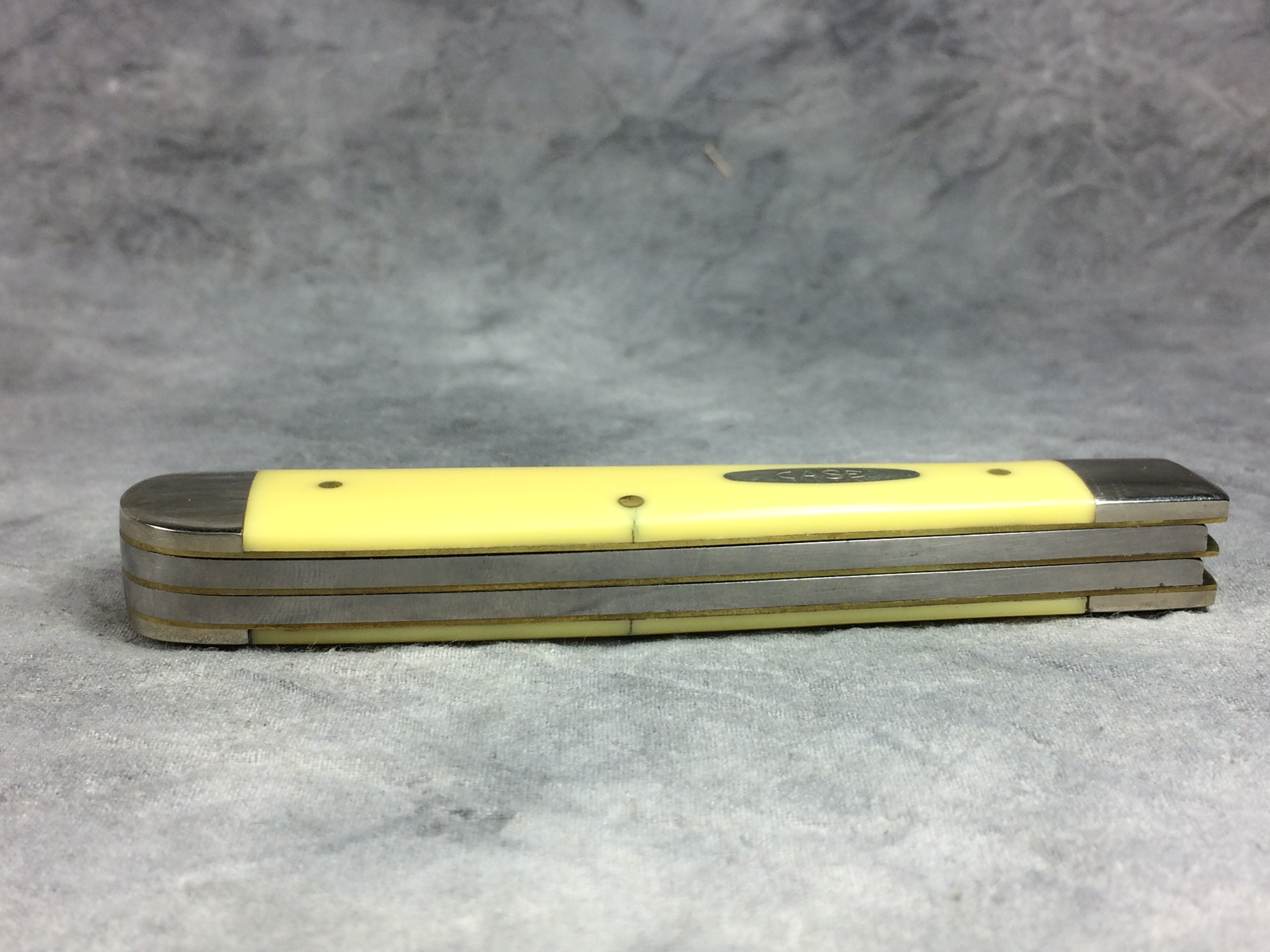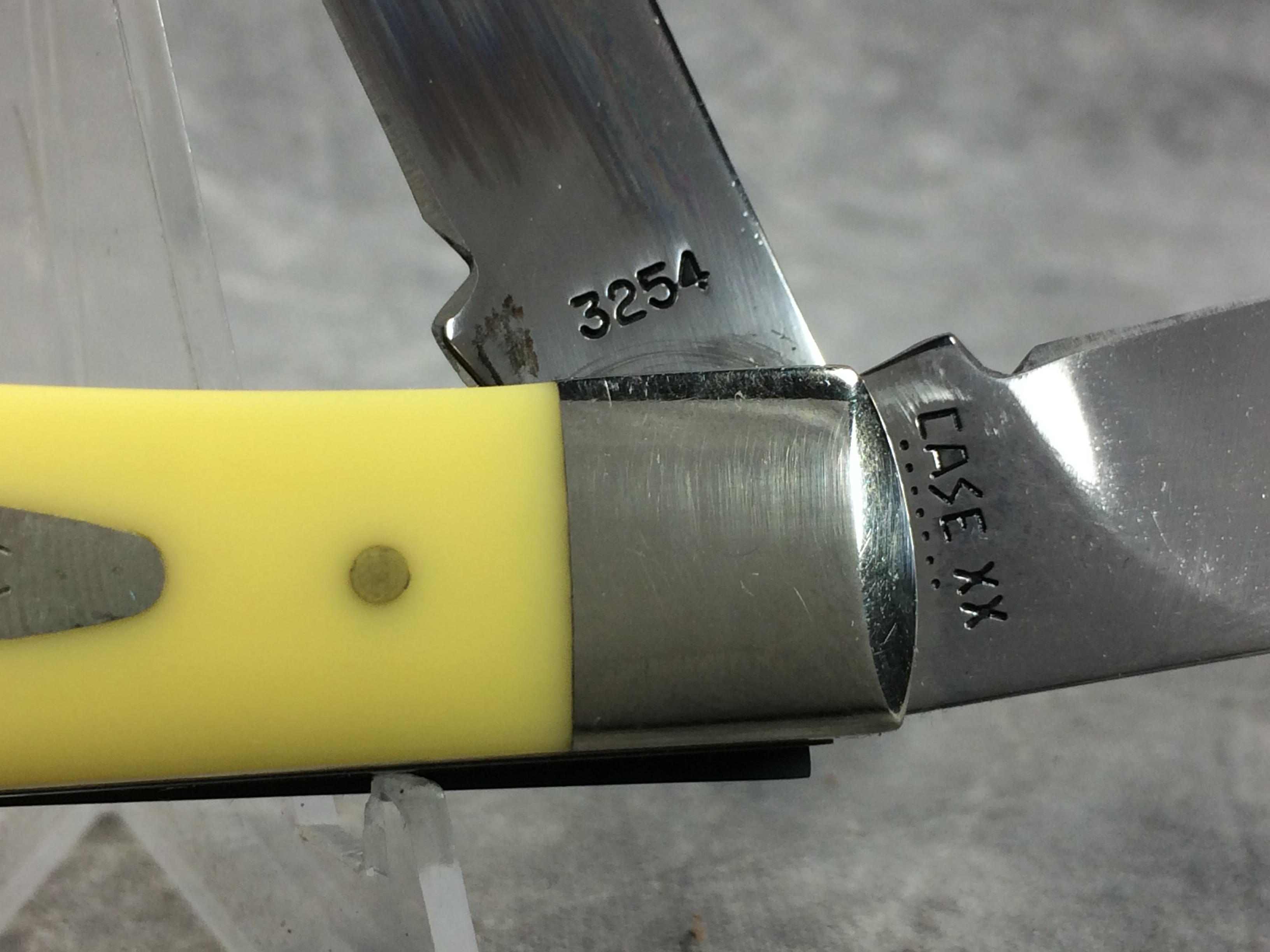 April 18, 2026 - 4-1/8 inches closed. 7-3/8 inches open. Made in USA. 'Case XX ******* USA' (7 dot with lightning bolt S) and '3254' tang stamps. Single-oval open-C "CASE" shield. Chrome vanadium blades. Yellow Composition handle. Nickel Silver bolsters. Brass liner.