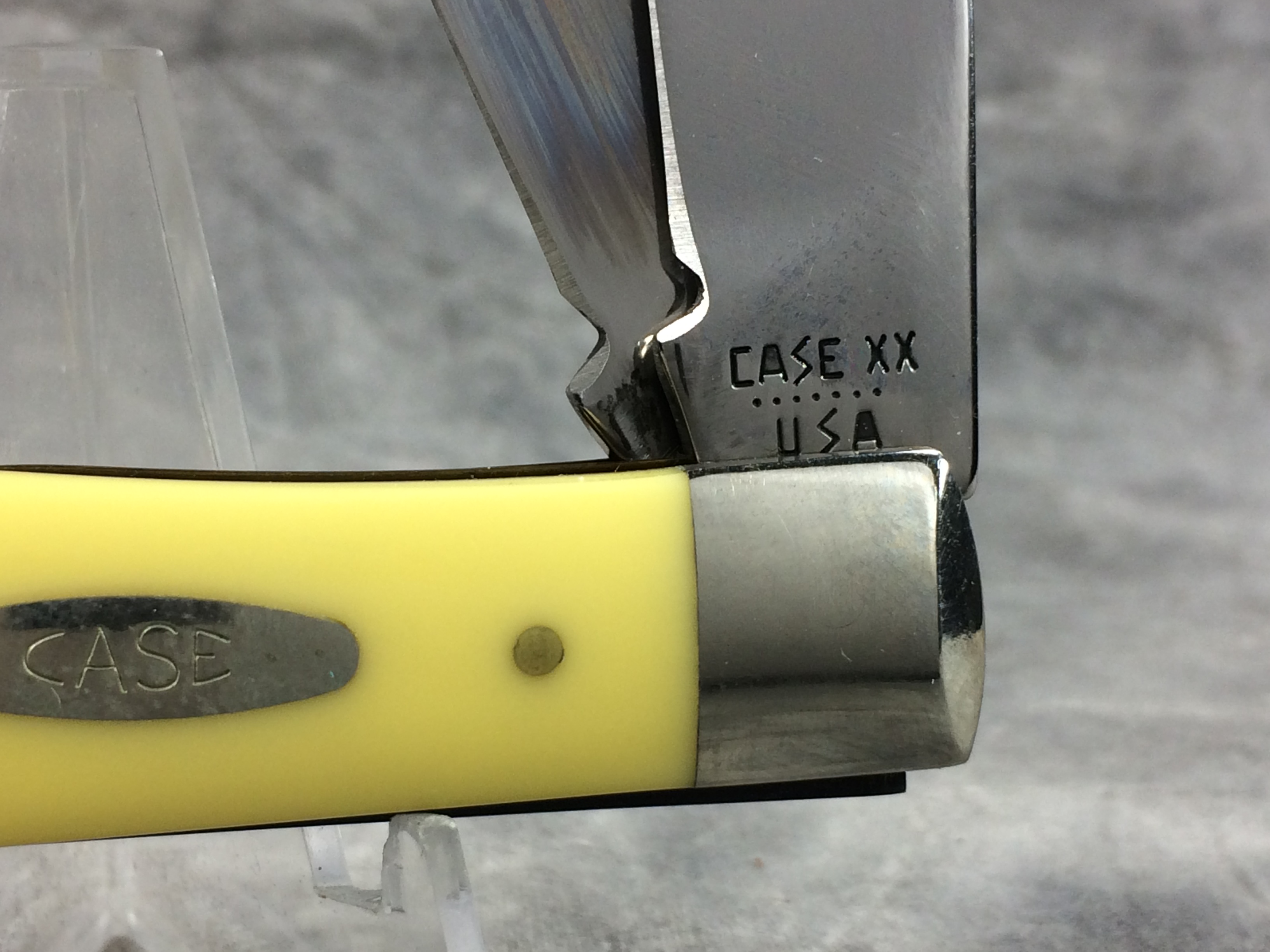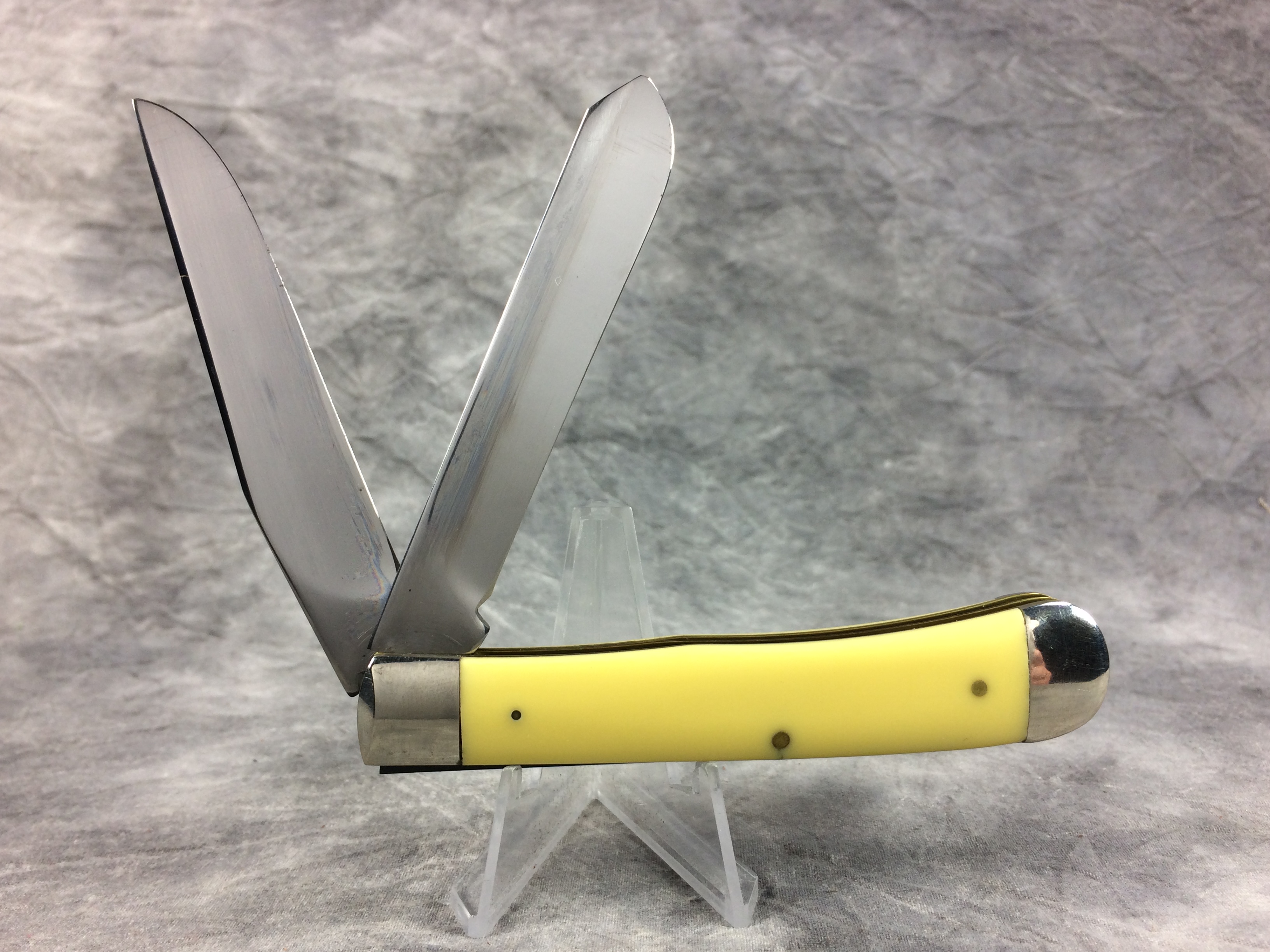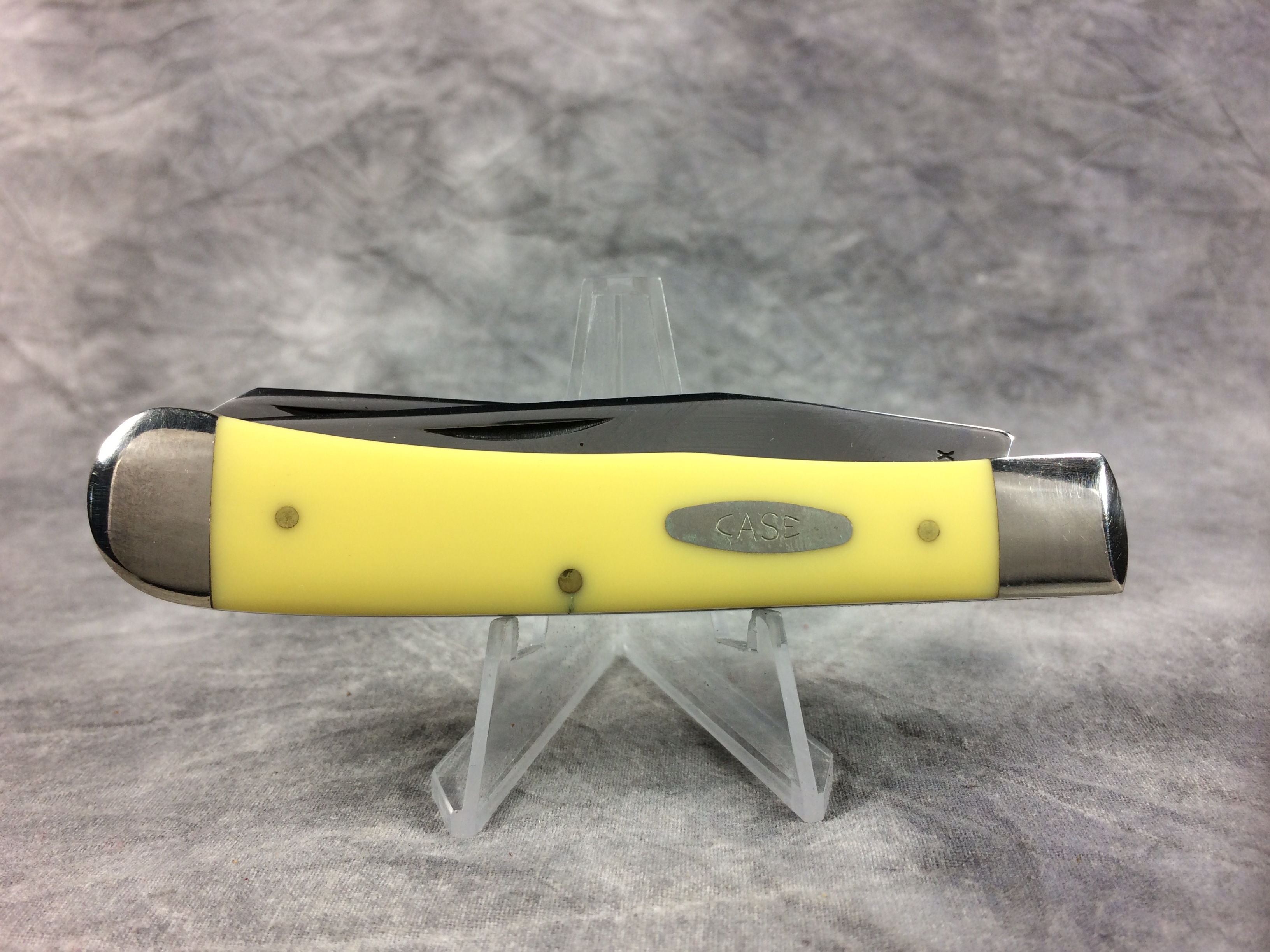 April 18, 2026 - 4-1/8 inches closed. 7-3/8 inches open. Made in USA. 'Case XX ******* USA' (7 dot with lightning bolt S) and '3254' tang stamps. Single-oval open-C "CASE" shield. Chrome vanadium blades. Yellow Composition handle. Nickel Silver bolsters. Brass liner.