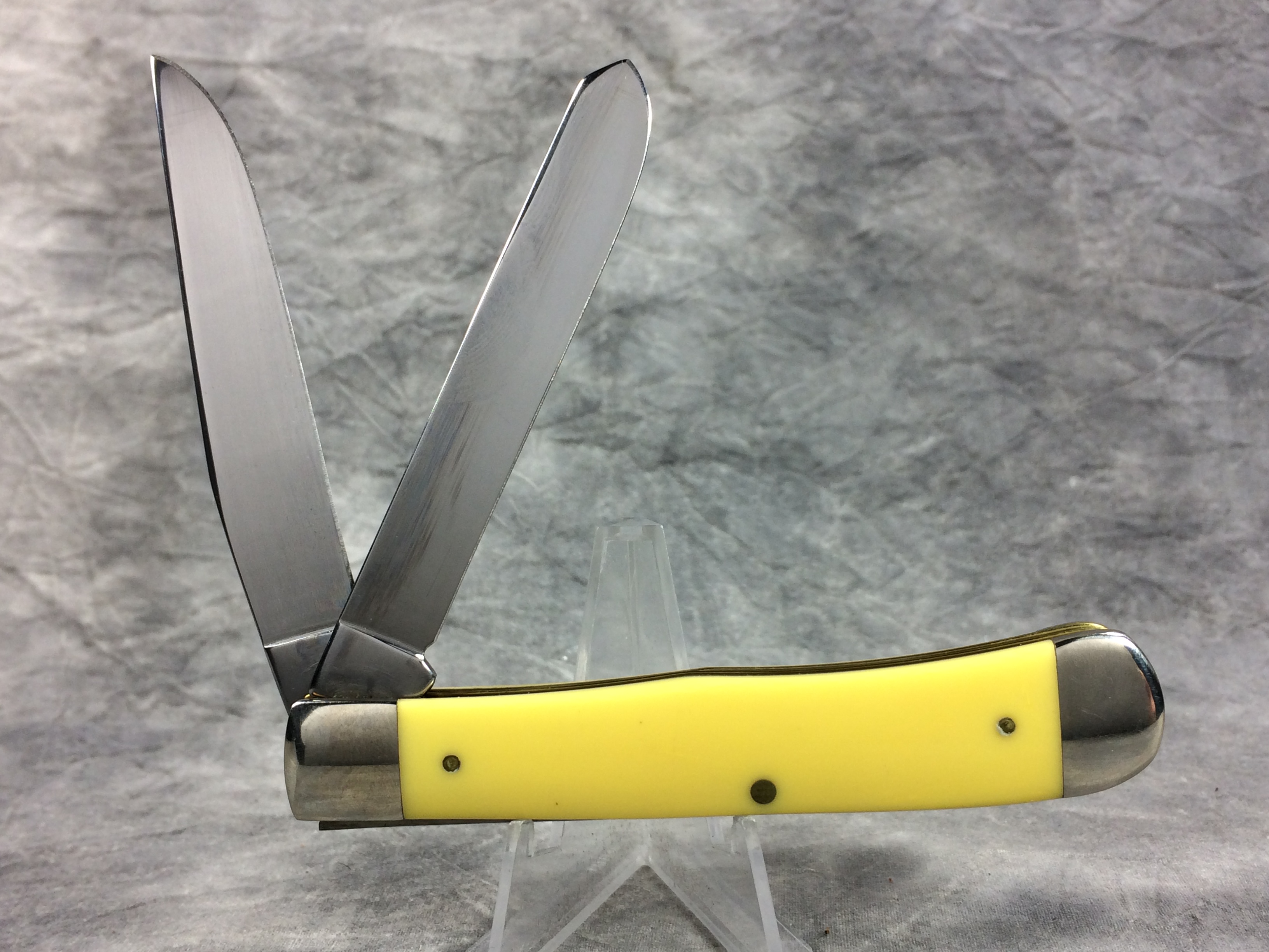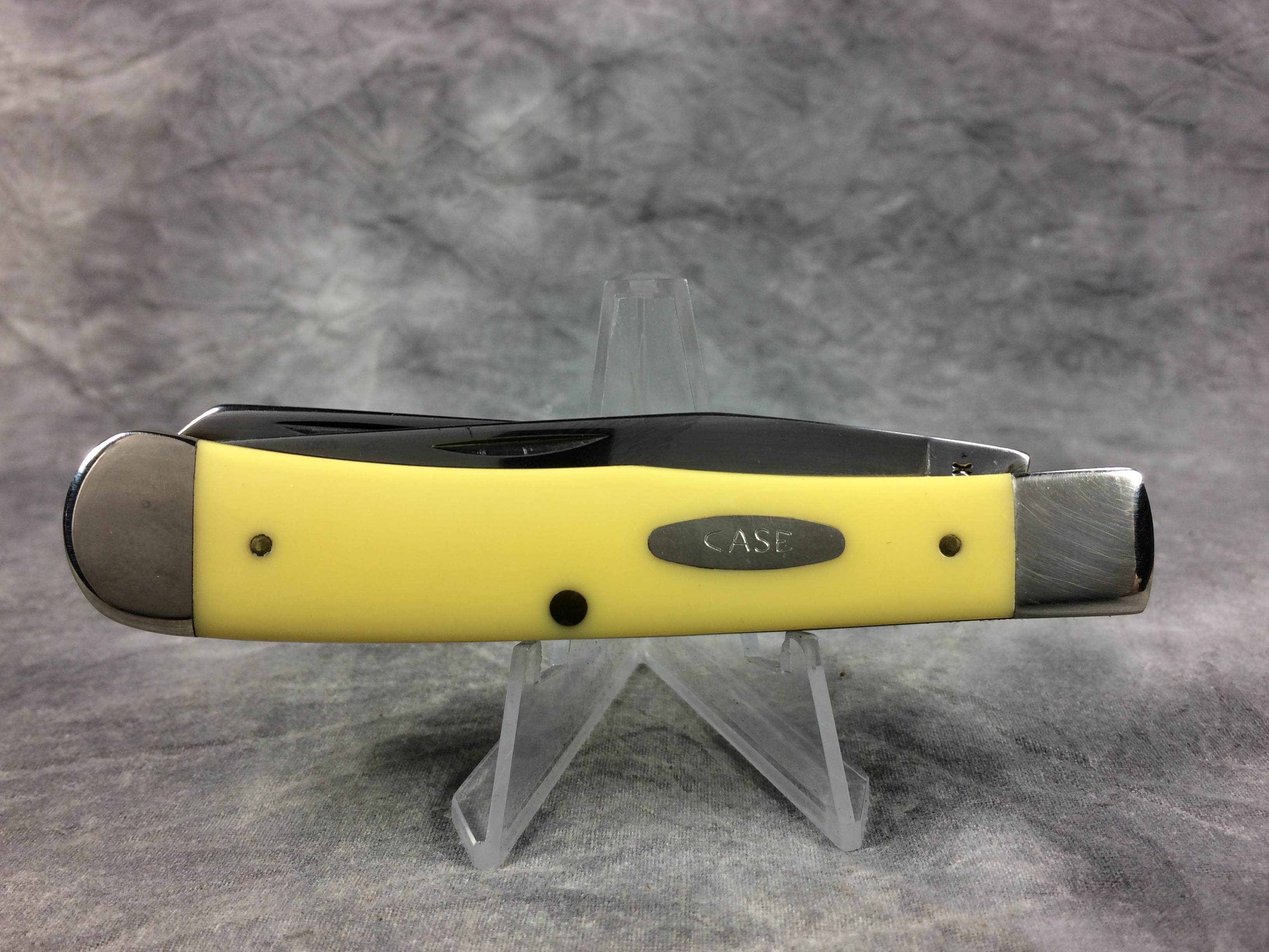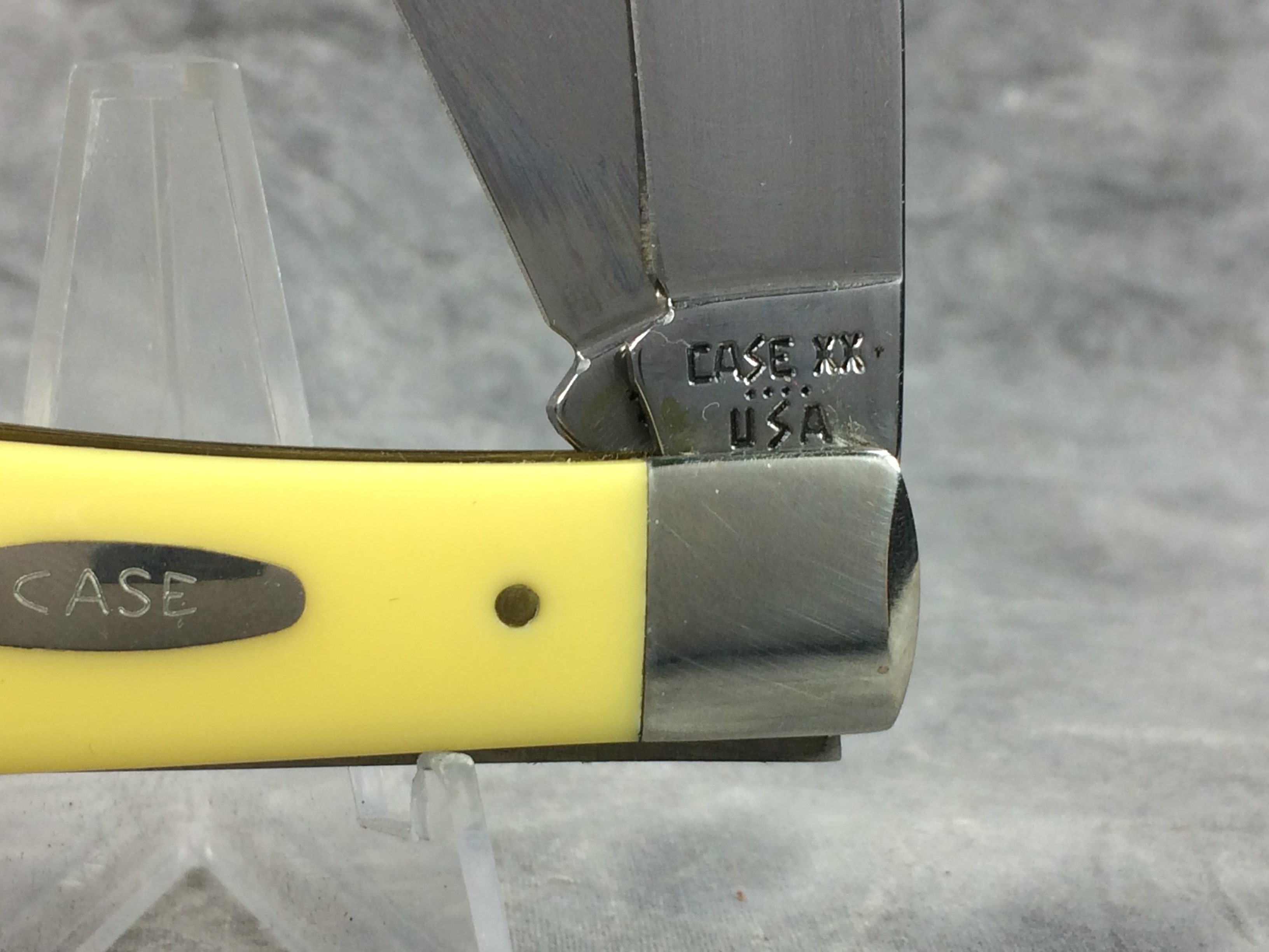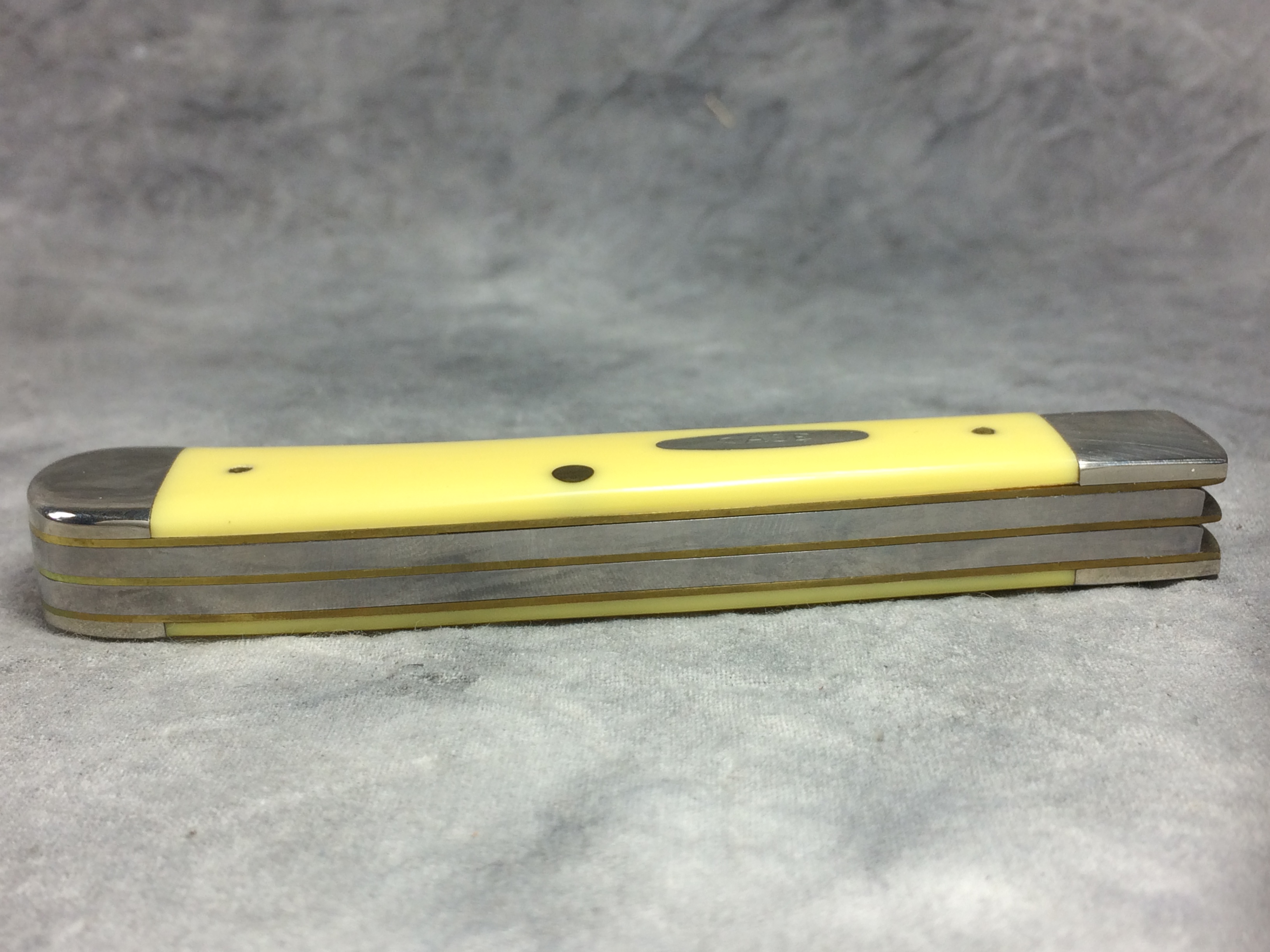 March 06, 2026 - 4-1/8 inches closed. 7-3/8 inches open. Made in USA. 'Case XX **** USA' (4 dot with lightning bolt S) and '3254' tang stamps. Single-oval open-C "CASE" shield. Chrome vanadium blades. Yellow Composition handle. Nickel Silver bolsters. Brass liner.