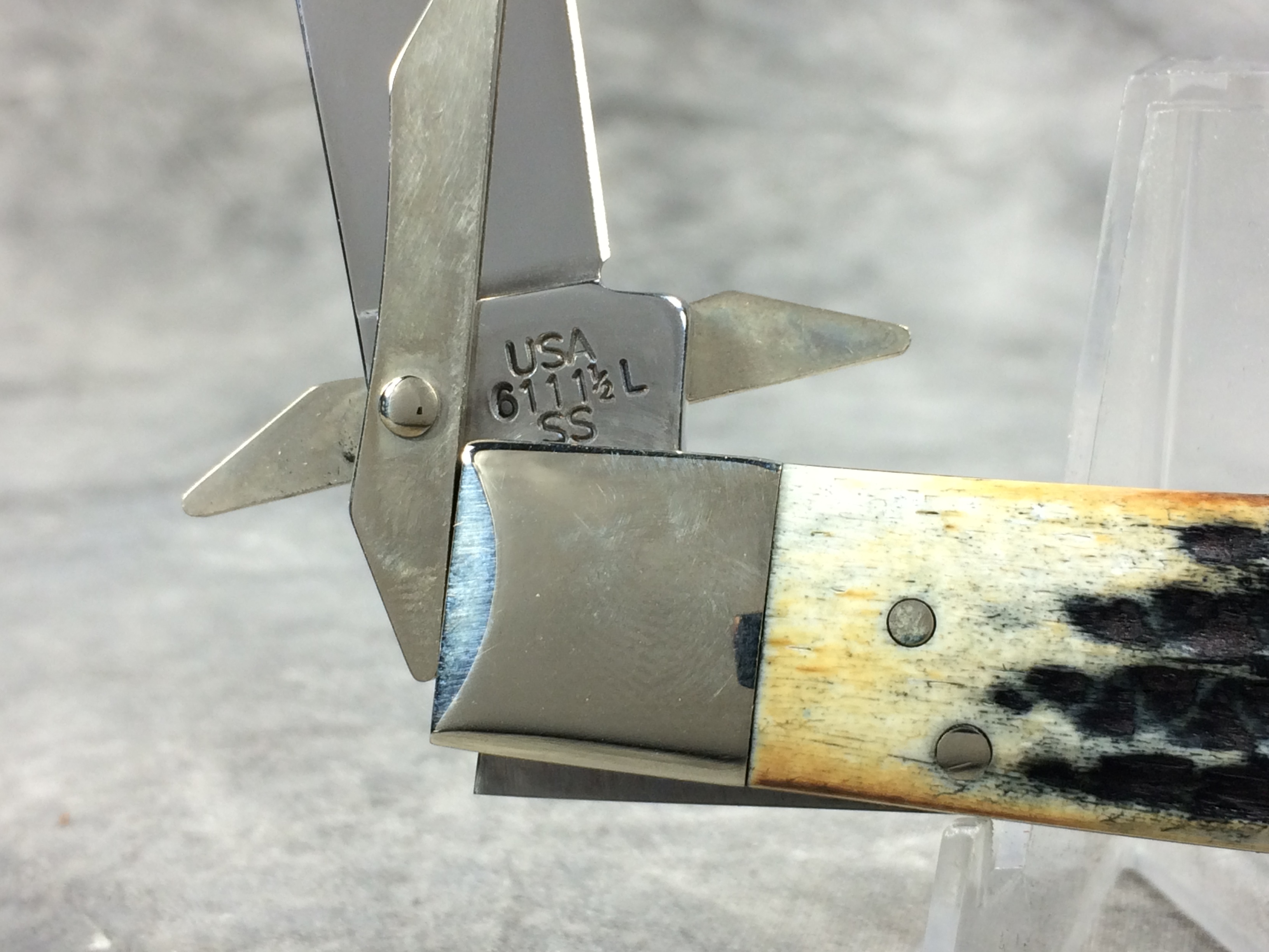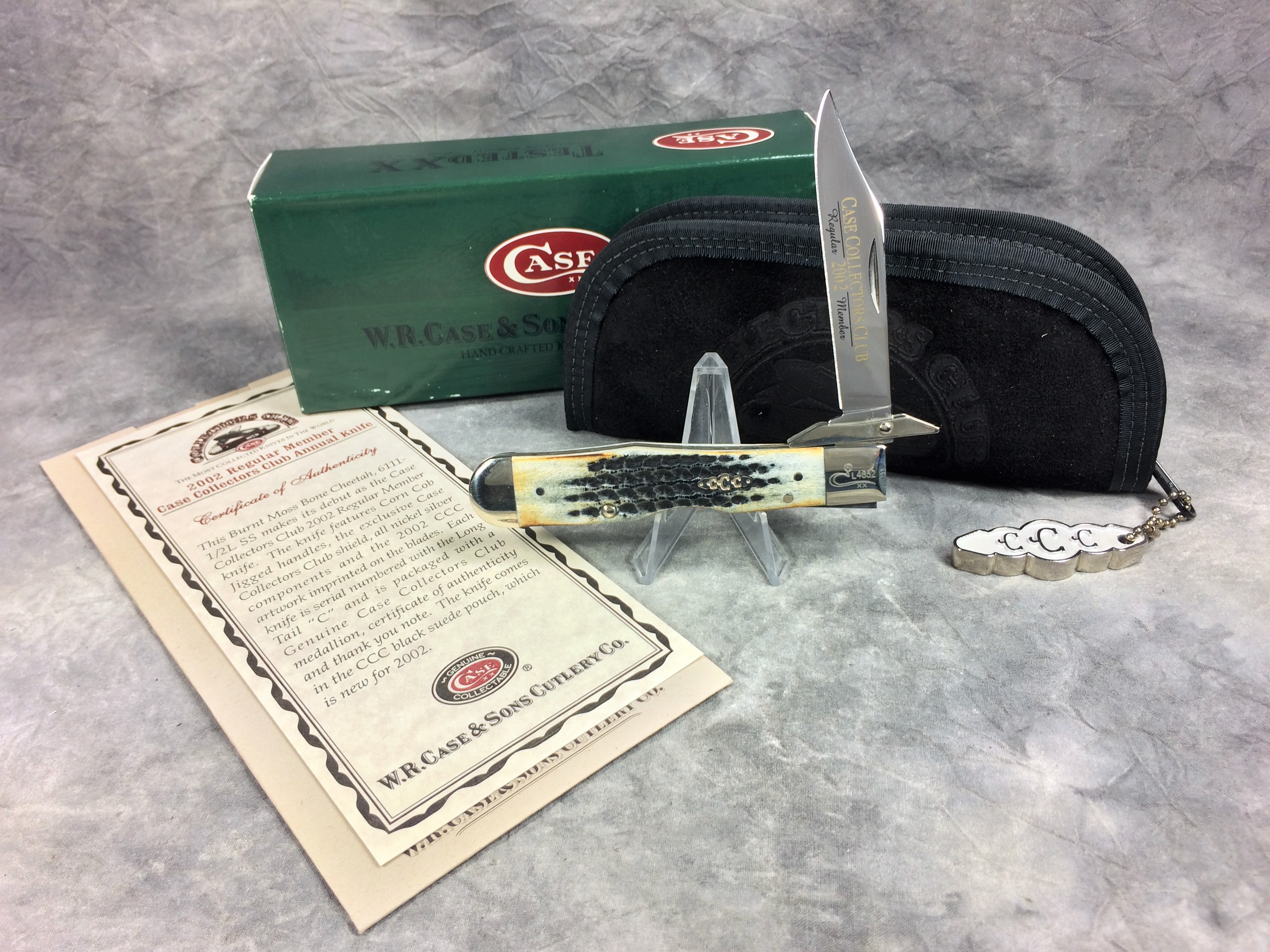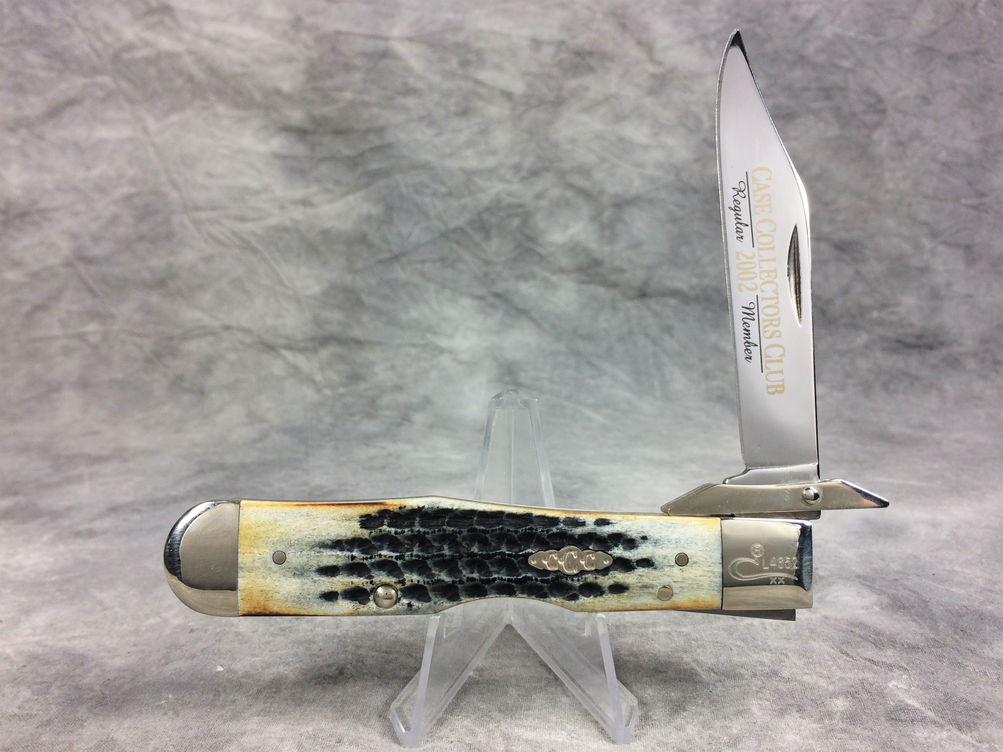 November 06, 2025 - 4-3/8 inches closed. 7-3/4 inches open. Made in USA. " x*x  CASE XX  x*x*x   " (with lightning bolt S) and "USA 6111 1/2 L SS" tang stamps. Stainless Steel blade etched "CASE COLLECTORS CLUB 2002 Regular Member". Burnt Moss jigged bone handle. Special "CCC" shield. Nickel Silver bolsters. Front right bolster etched with long-C serial number. Brass liner.