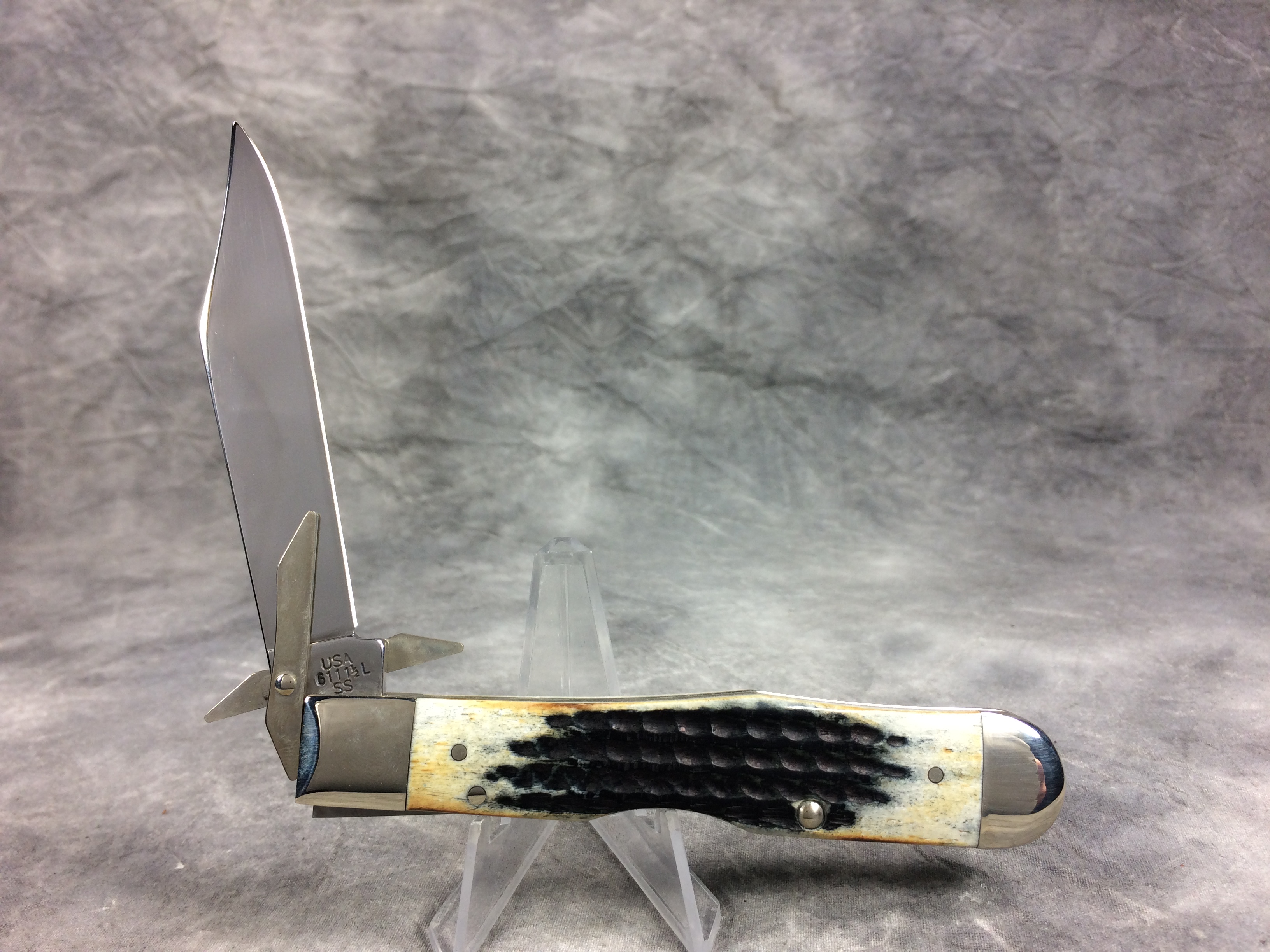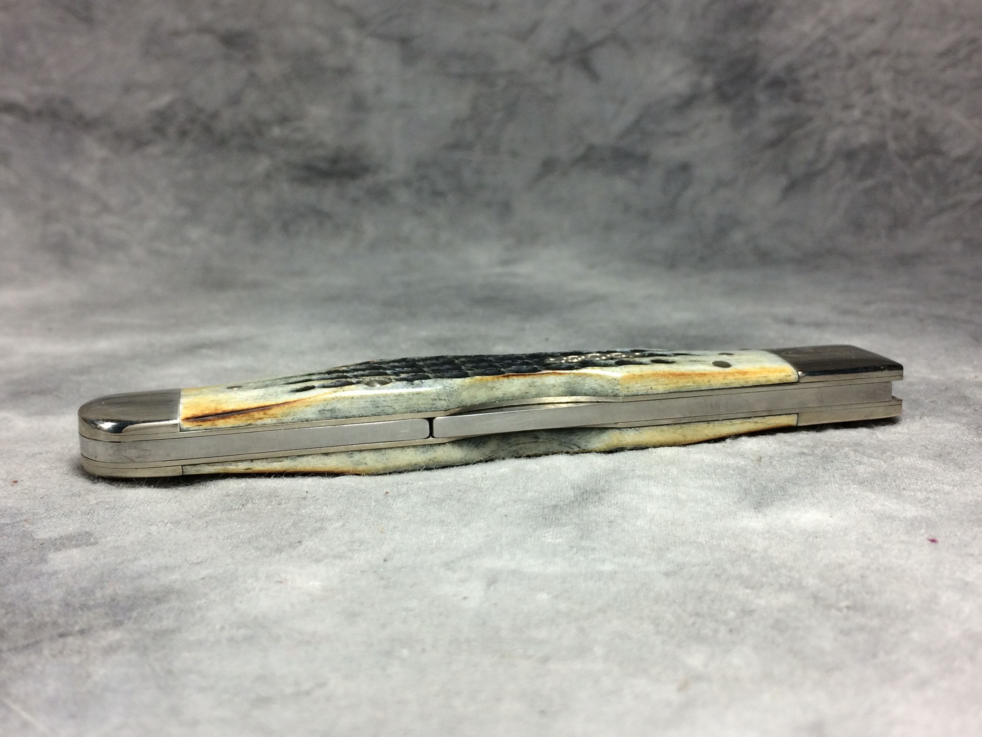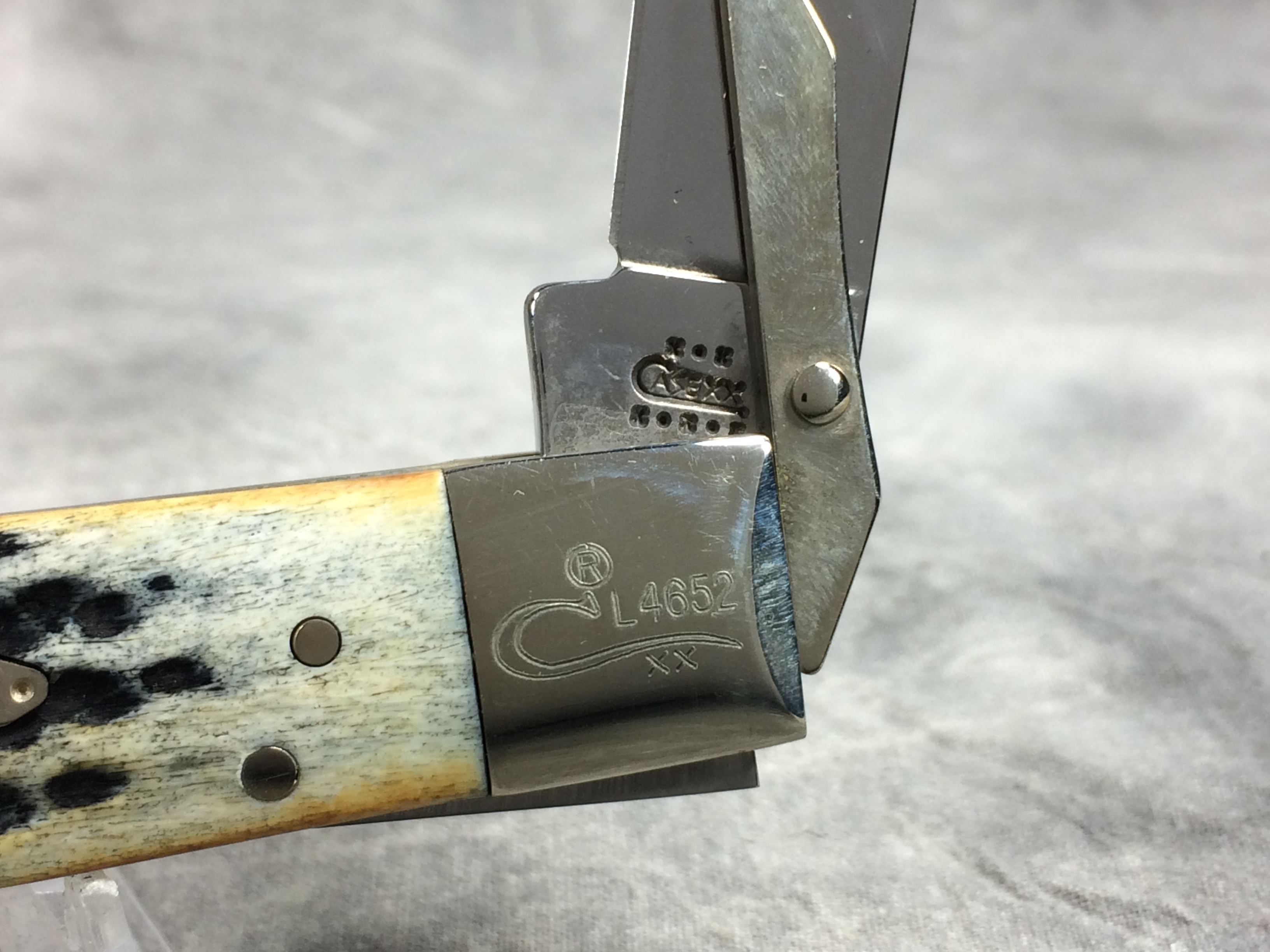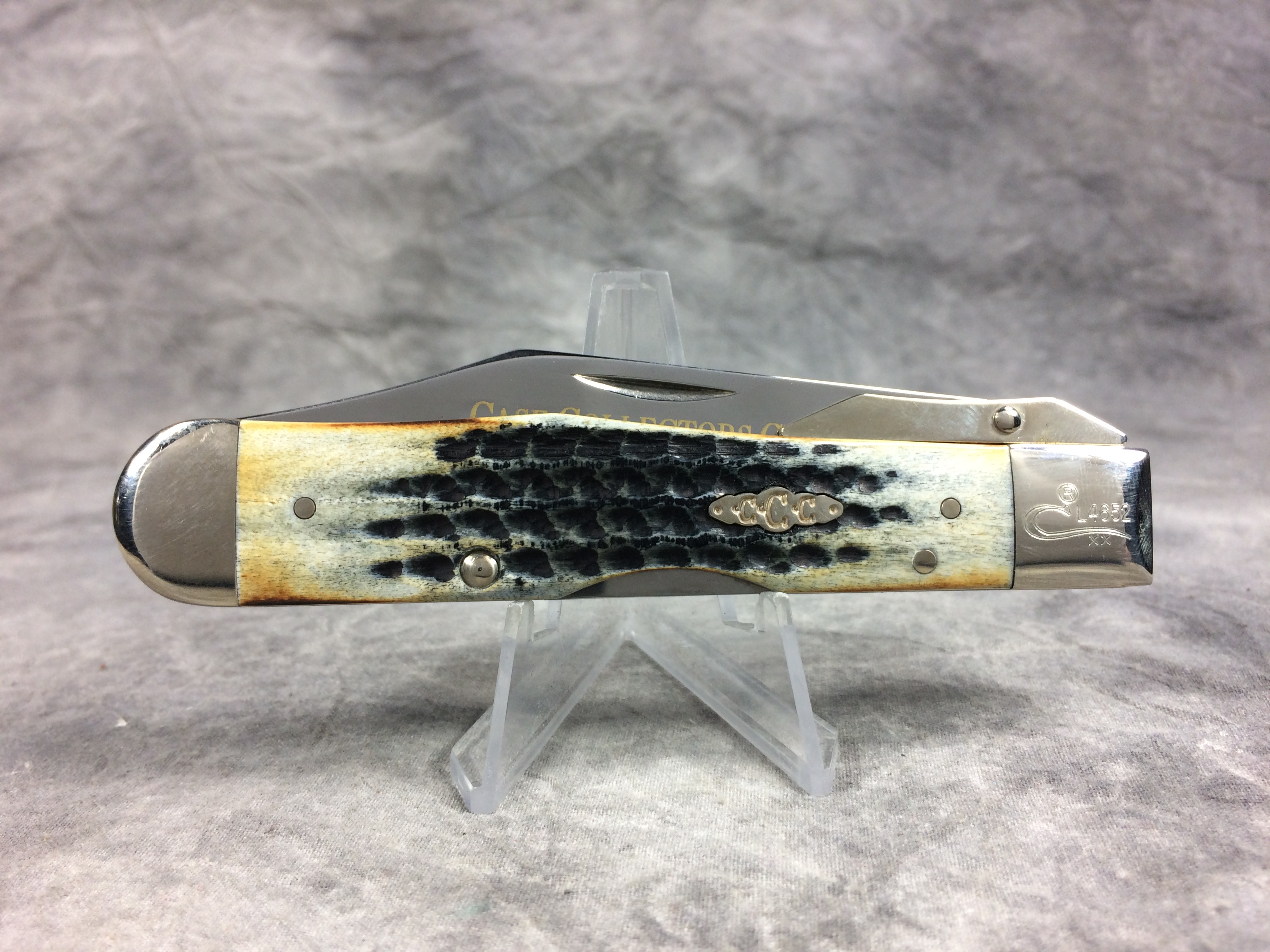 November 06, 2025 - 4-3/8 inches closed. 7-3/4 inches open. Made in USA. " x*x  CASE XX  x*x*x   " (with lightning bolt S) and "USA 6111 1/2 L SS" tang stamps. Stainless Steel blade etched "CASE COLLECTORS CLUB 2002 Regular Member". Burnt Moss jigged bone handle. Special "CCC" shield. Nickel Silver bolsters. Front right bolster etched with long-C serial number. Brass liner.