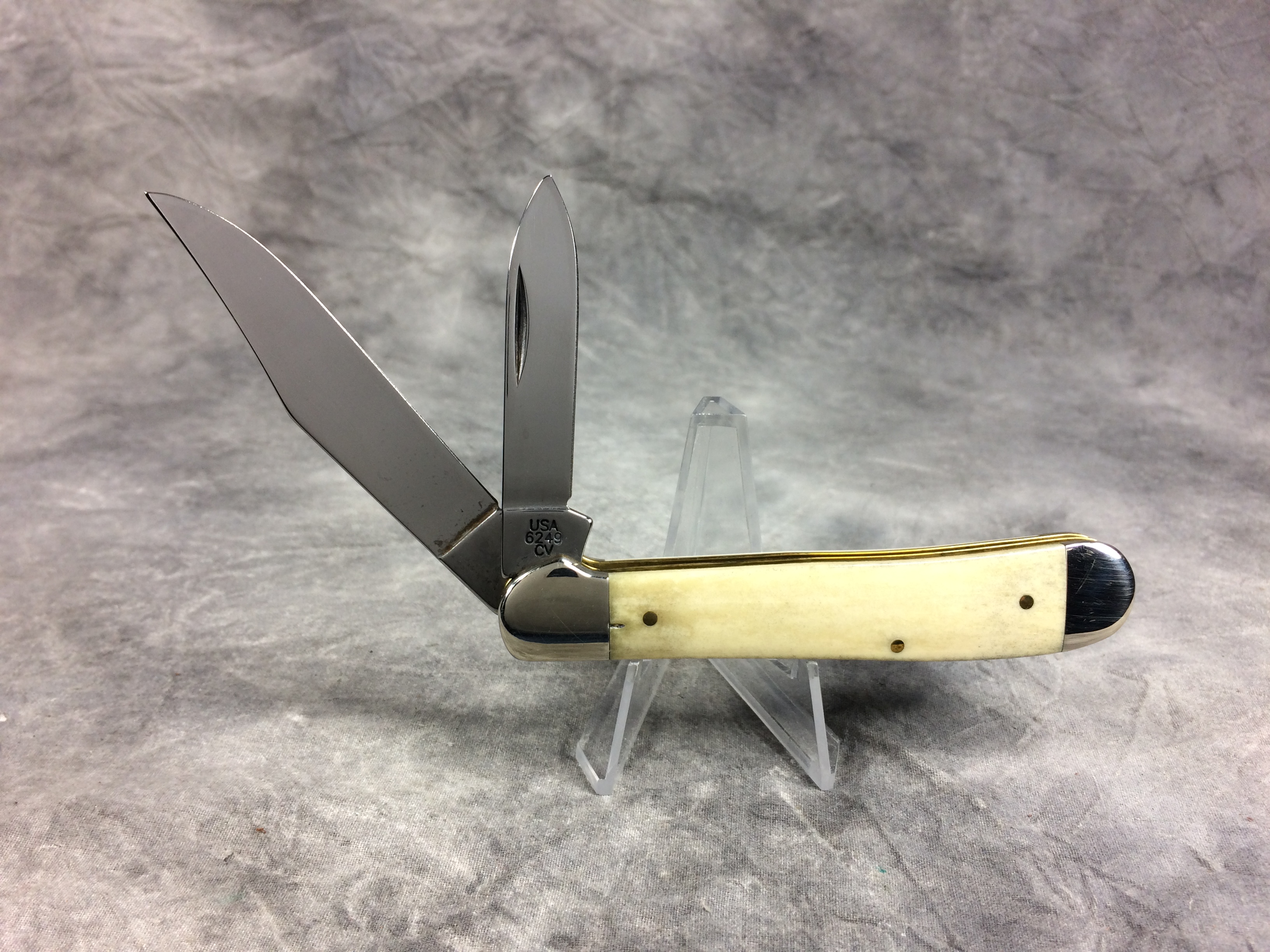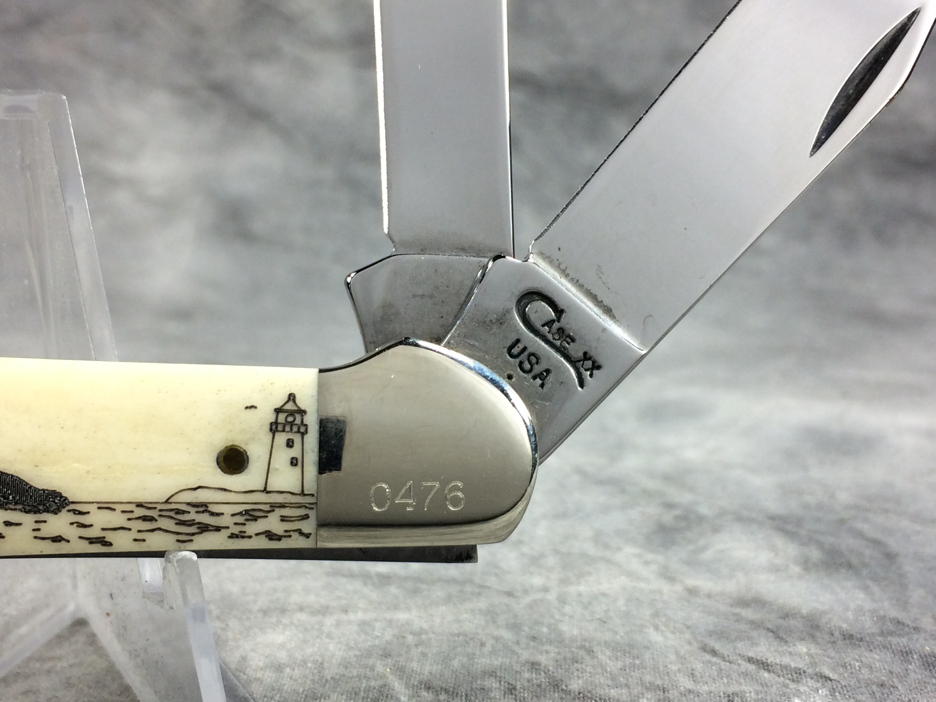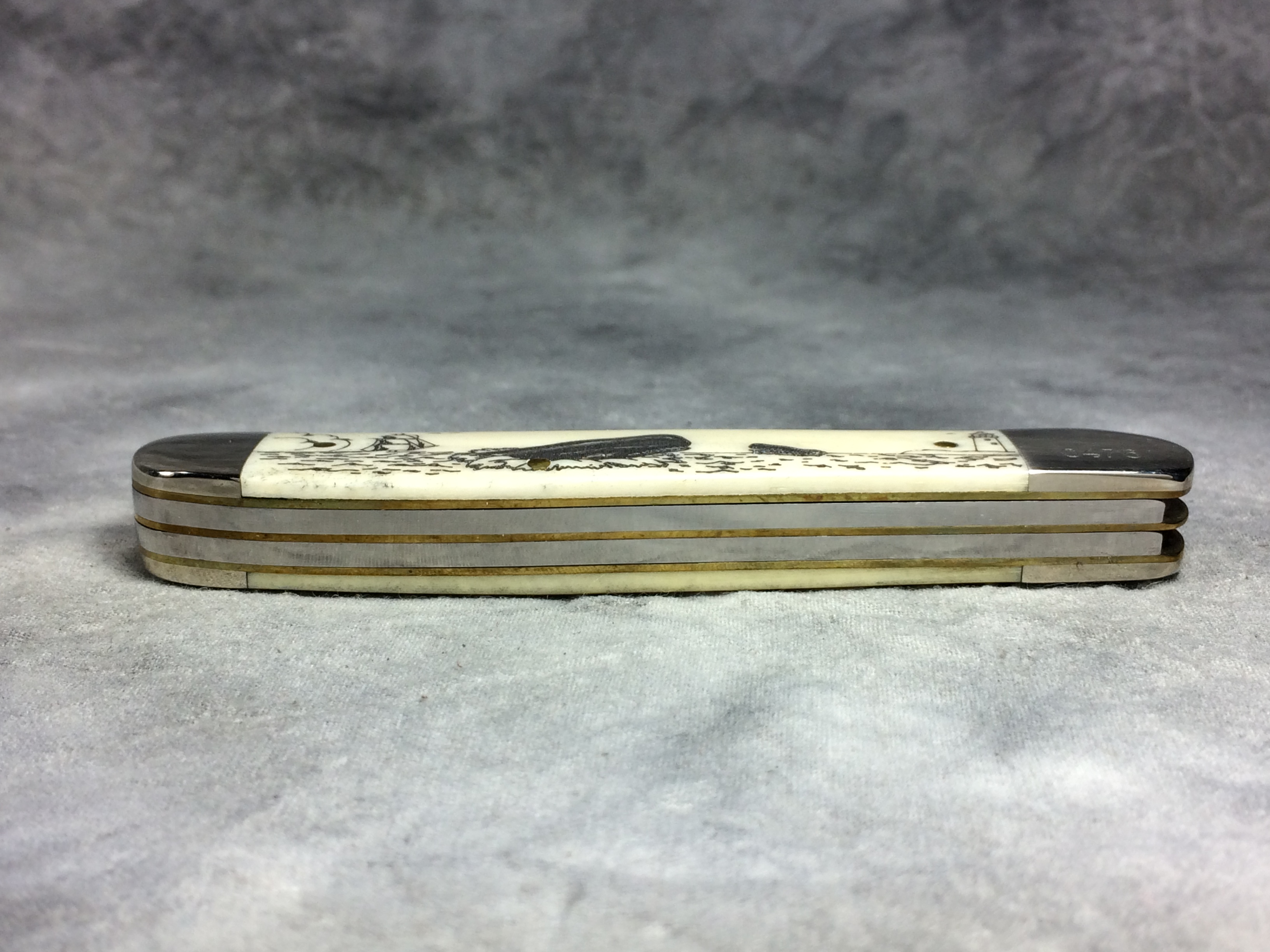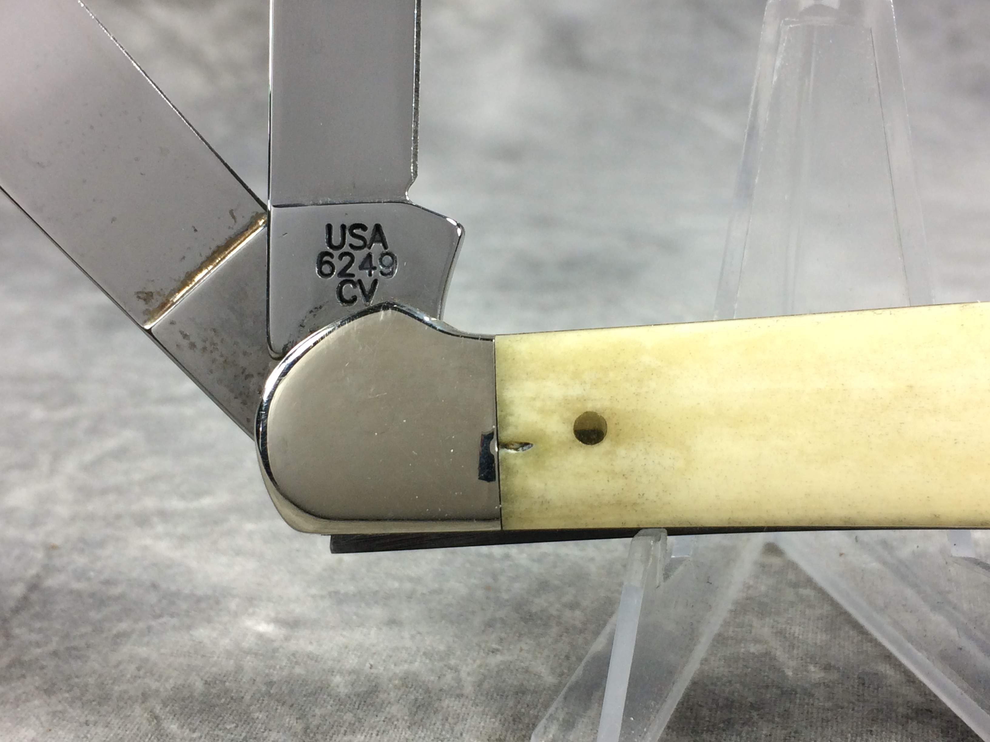 December 22, 2025 - 4 inches closed. 7 inches open. Made in USA. "CASE XX U.S.A. * " (1 dot) and "6249 CV" tang stamps. Chrome Vanadium blades. Smooth natural bone handle with nautical scrimshaw design. Nickel Silver bolsters. Brass liner.
