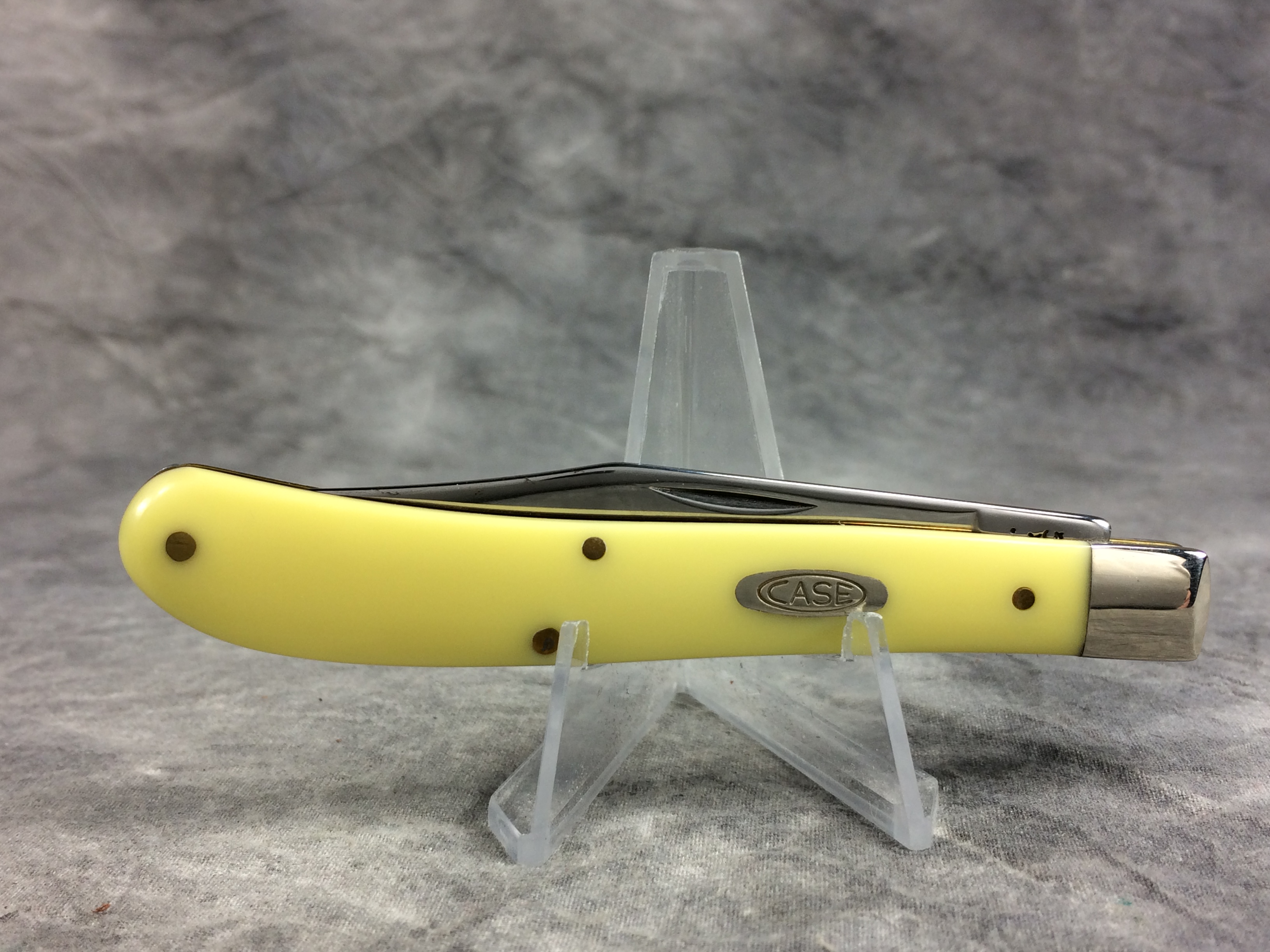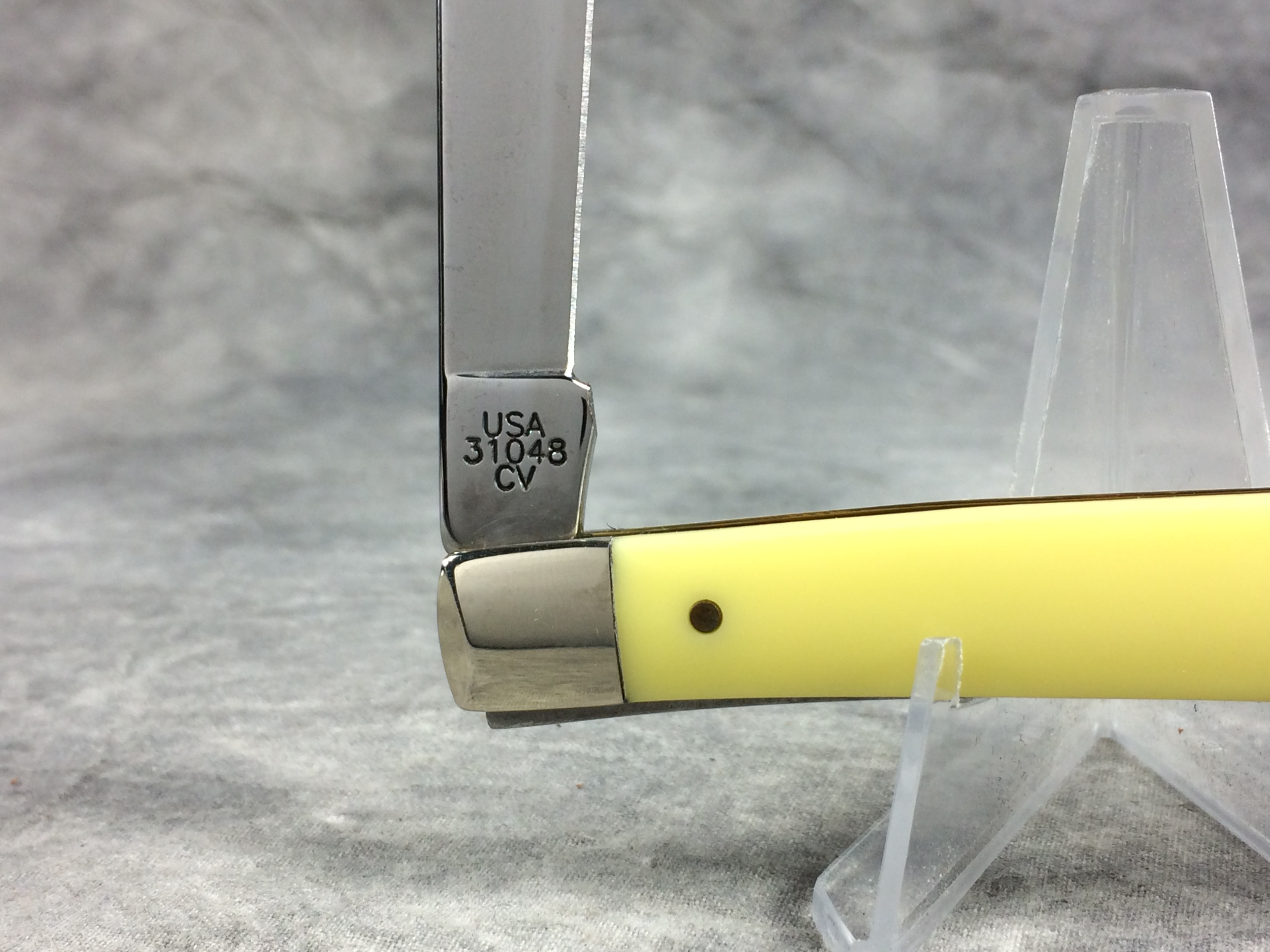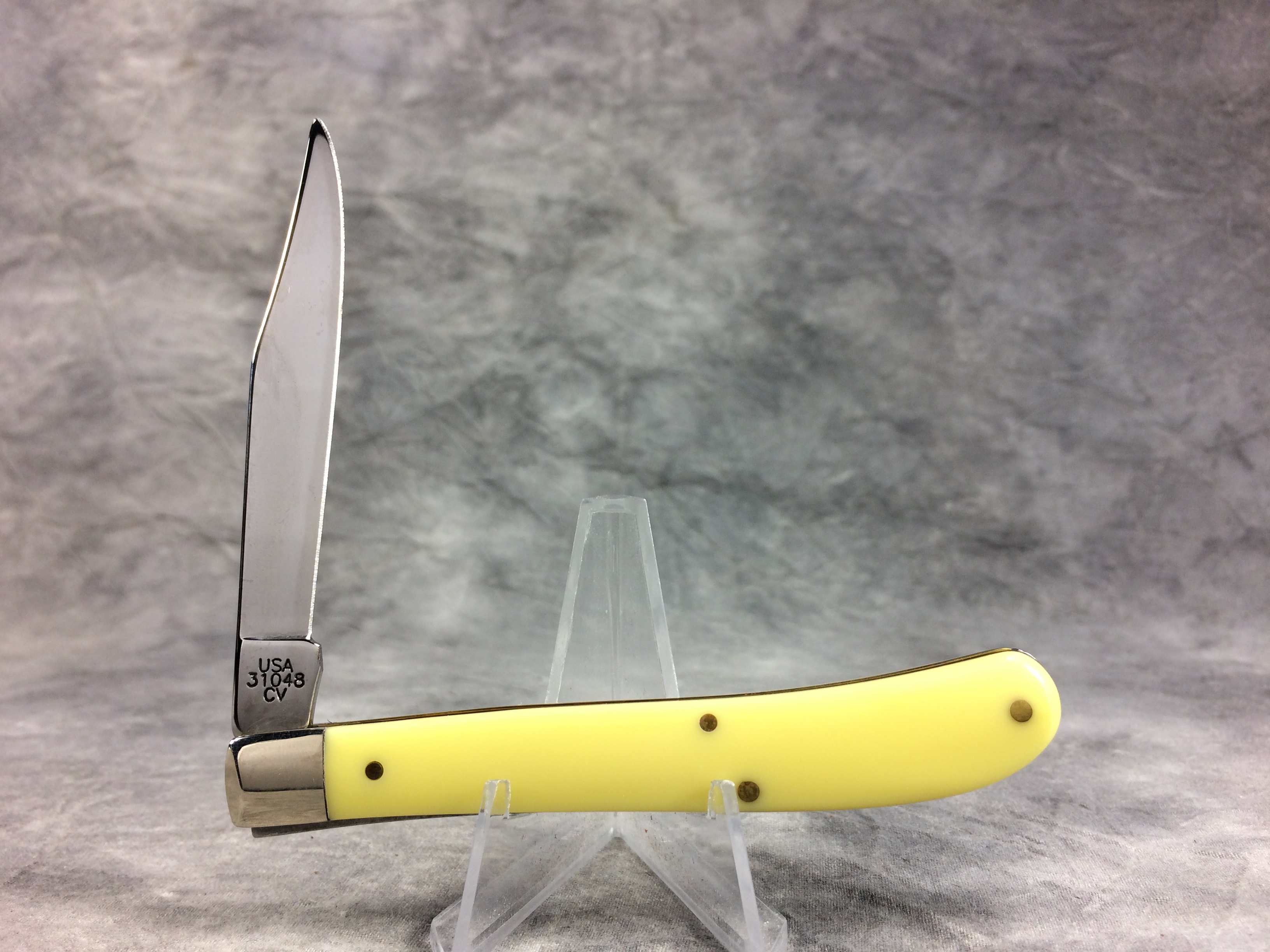December 07, 2025 - 4 inches closed. 7-1/4 inches open. Made in USA. "  x*x*x   CASE XX  *x*x*  " and "USA 31048 CV"  tang stamps. Double Oval Open C "CASE" shield. Chrome vanadium blade. Yellow Composite handle. Nickel Silver bolsters. Brass liner.