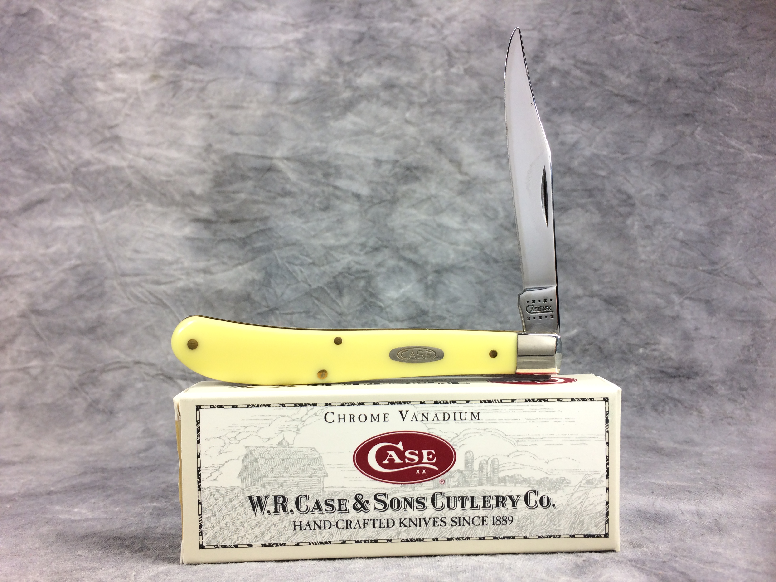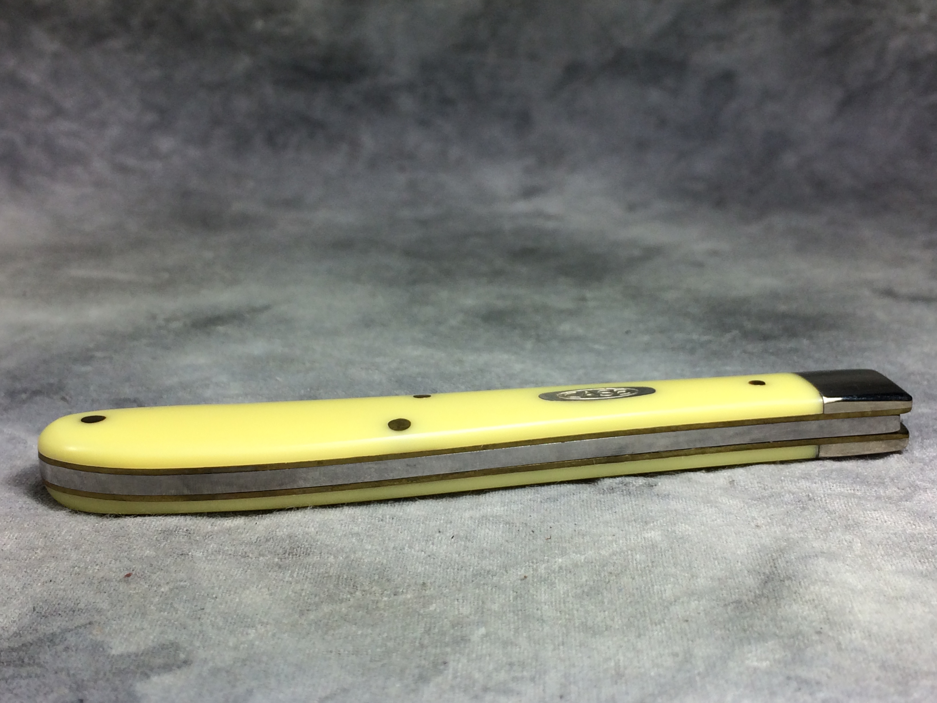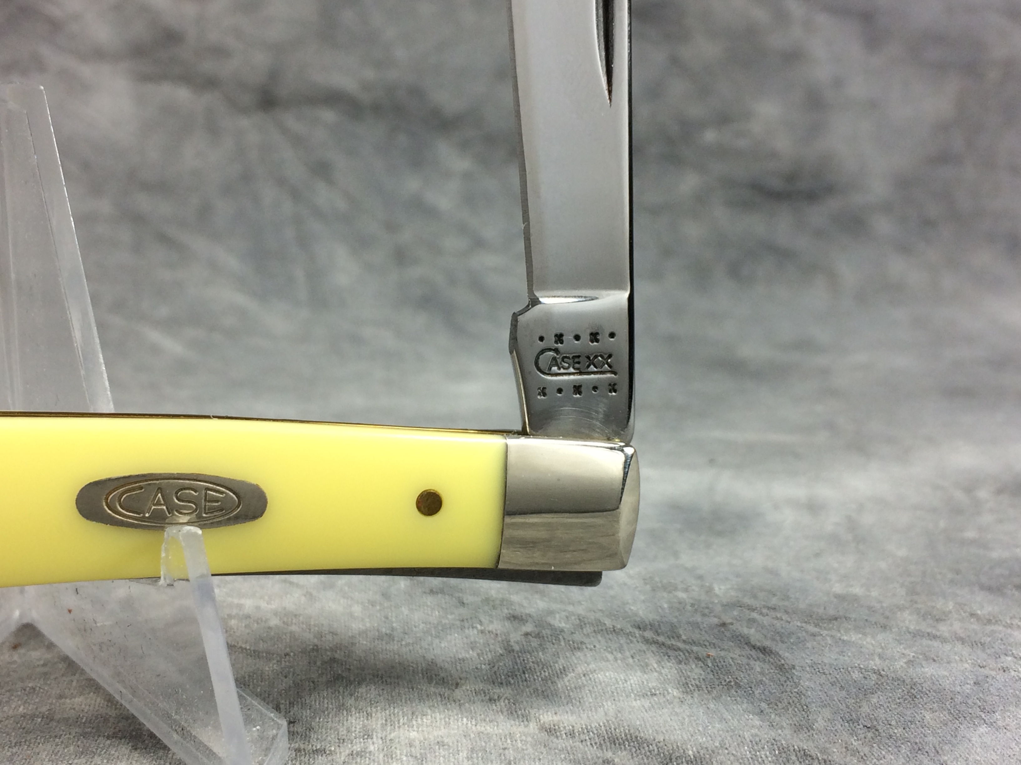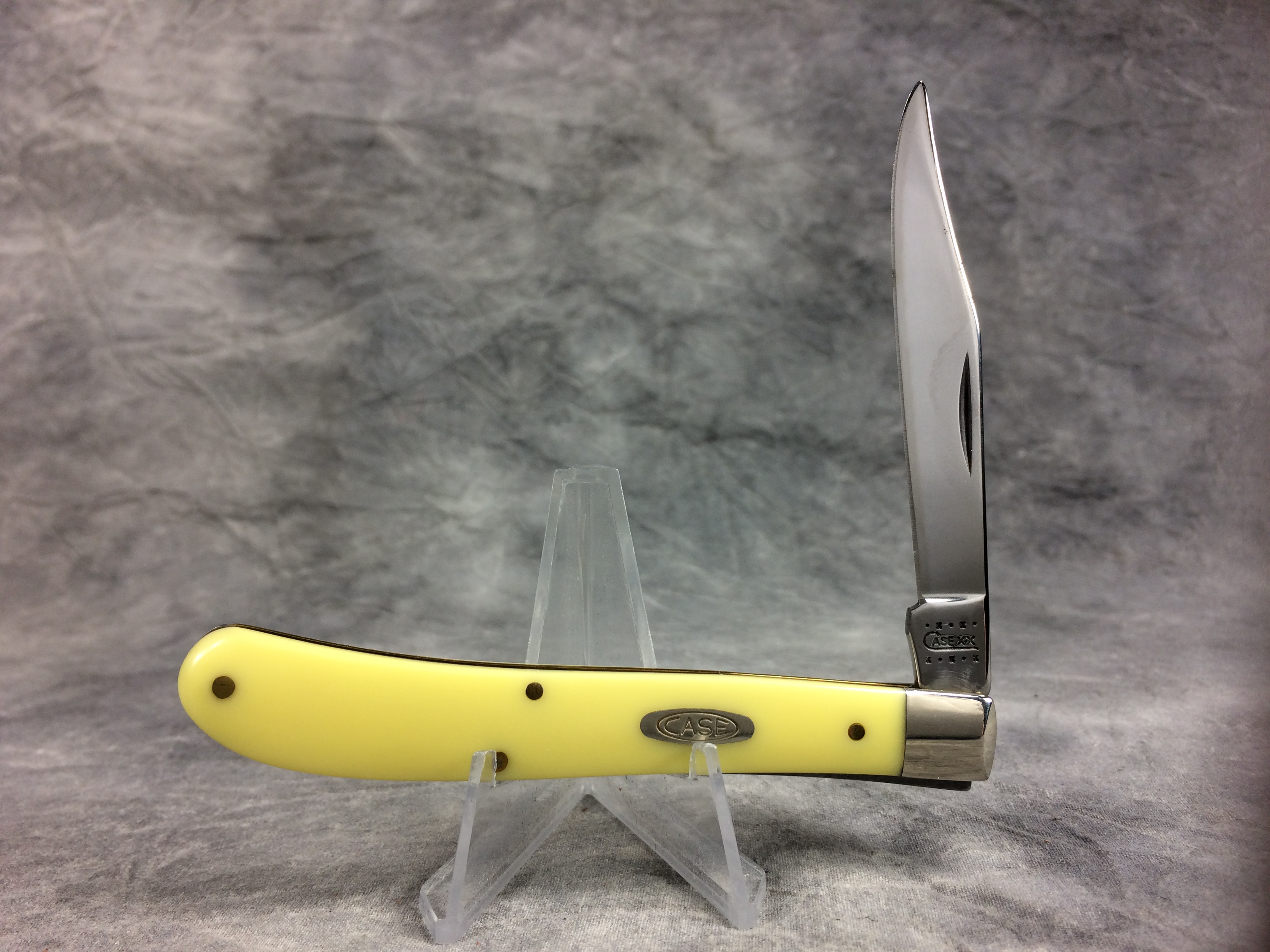December 07, 2025 - 4 inches closed. 7-1/4 inches open. Made in USA. "  x*x*x   CASE XX  *x*x*  " and "USA 31048 CV"  tang stamps. Double Oval Open C "CASE" shield. Chrome vanadium blade. Yellow Composite handle. Nickel Silver bolsters. Brass liner.