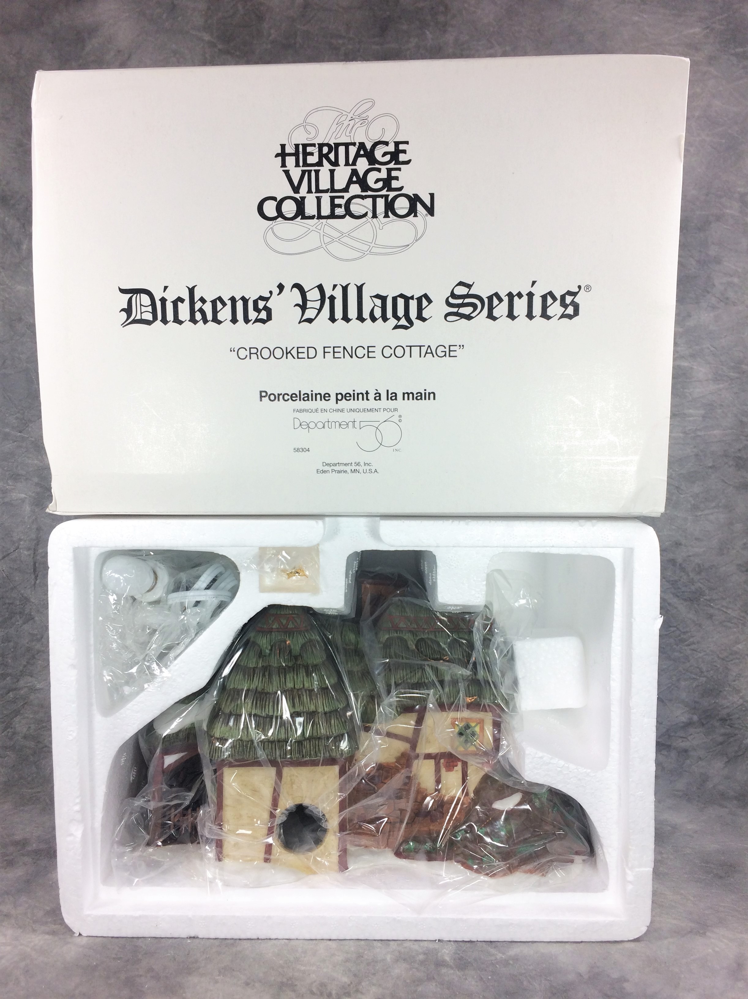 January 16, 2026 - 5-3/4 inches tall. Dickens' Village Series, "CROOKED FENCE COTTAGE". The Heritage Village Collection. Item number #58304. Made exclusively for Department 56. With light and power cord.