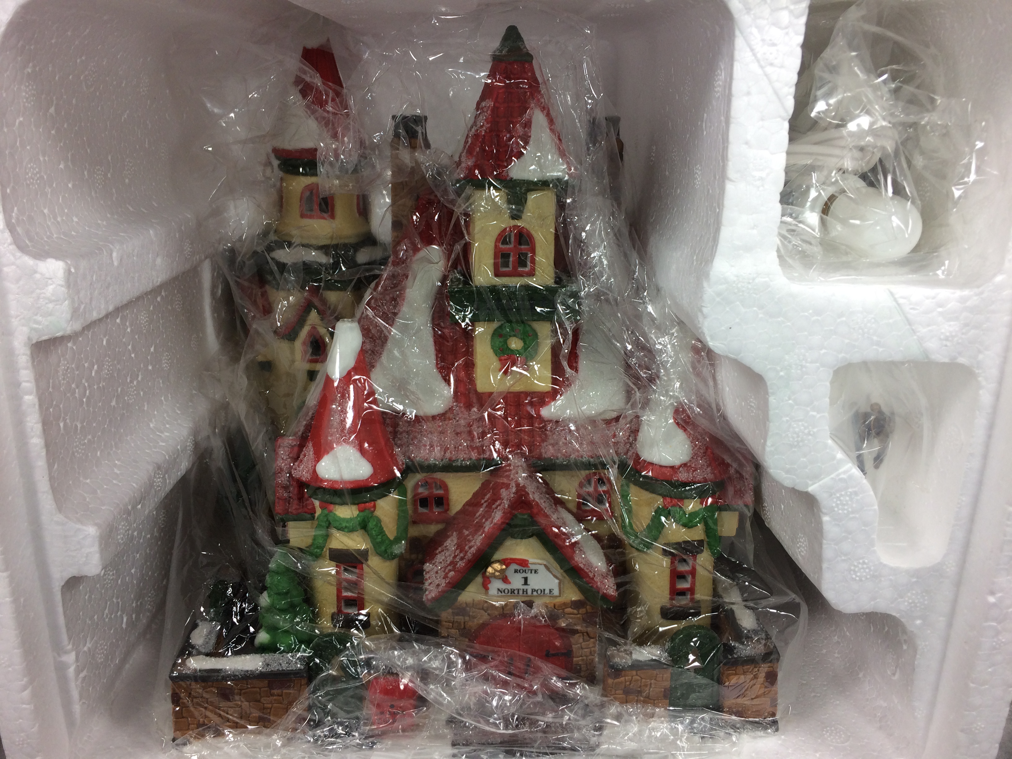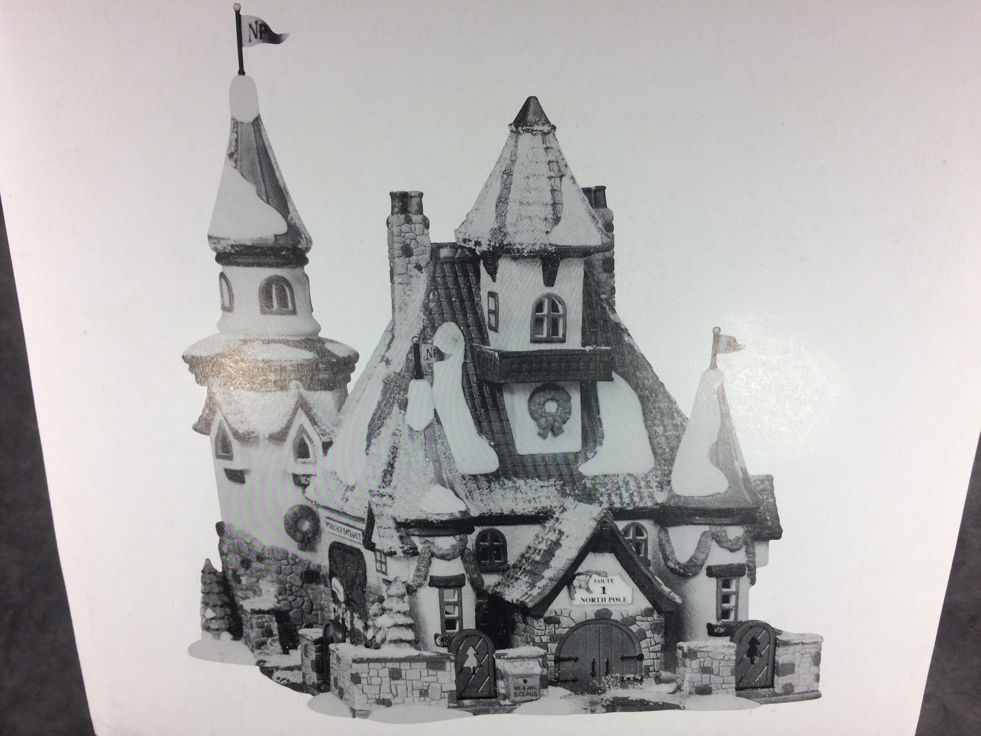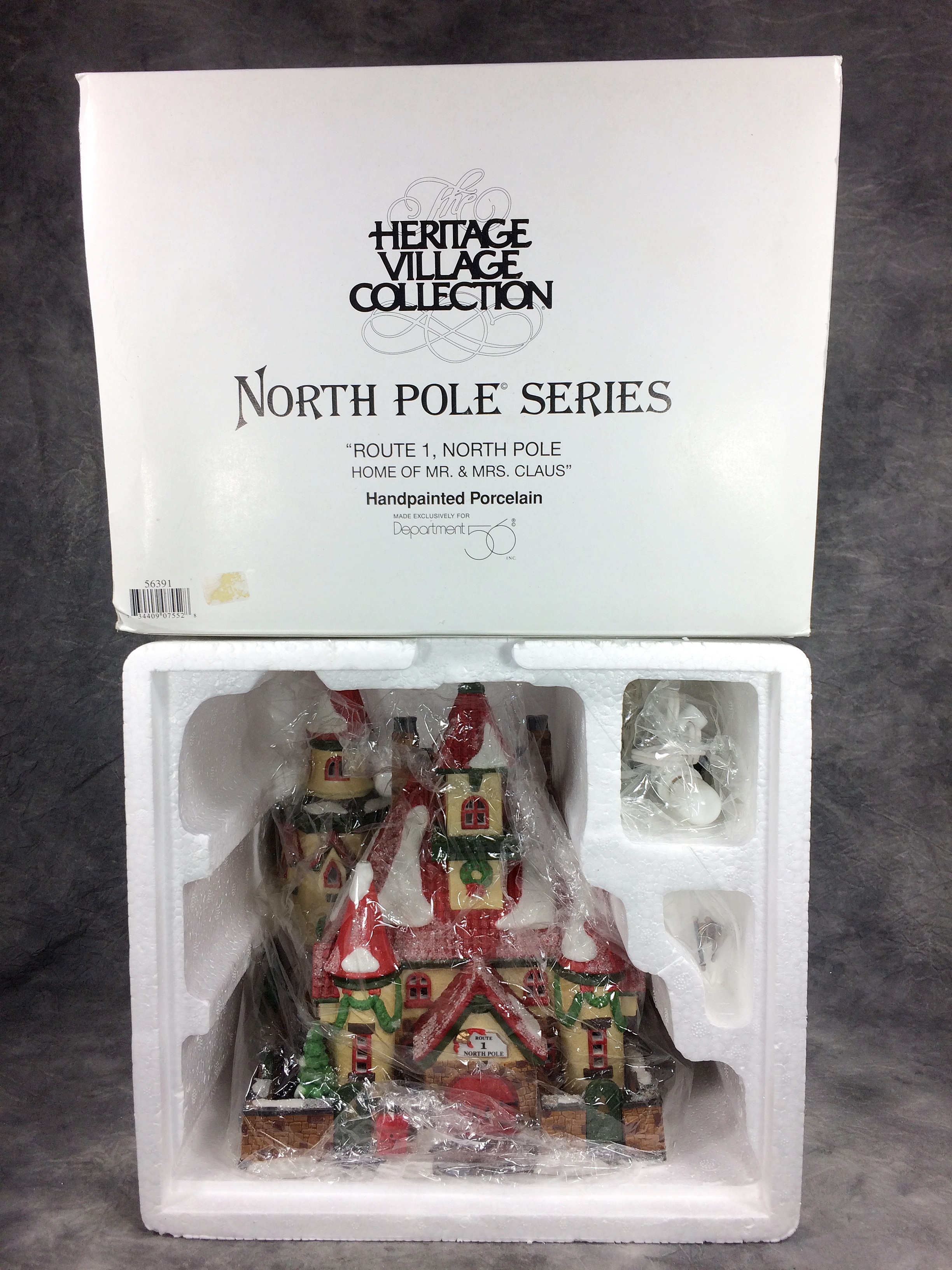 April 19, 2026 - 8-3/4 inches tall. North Pole Series. "ROUTE 1, NORTH HOME OF MR. & MRS. CLAUS". The Heritage Village Collection. Item number #56391. Made exclusively for Department 56. Comes with lights and power cord.