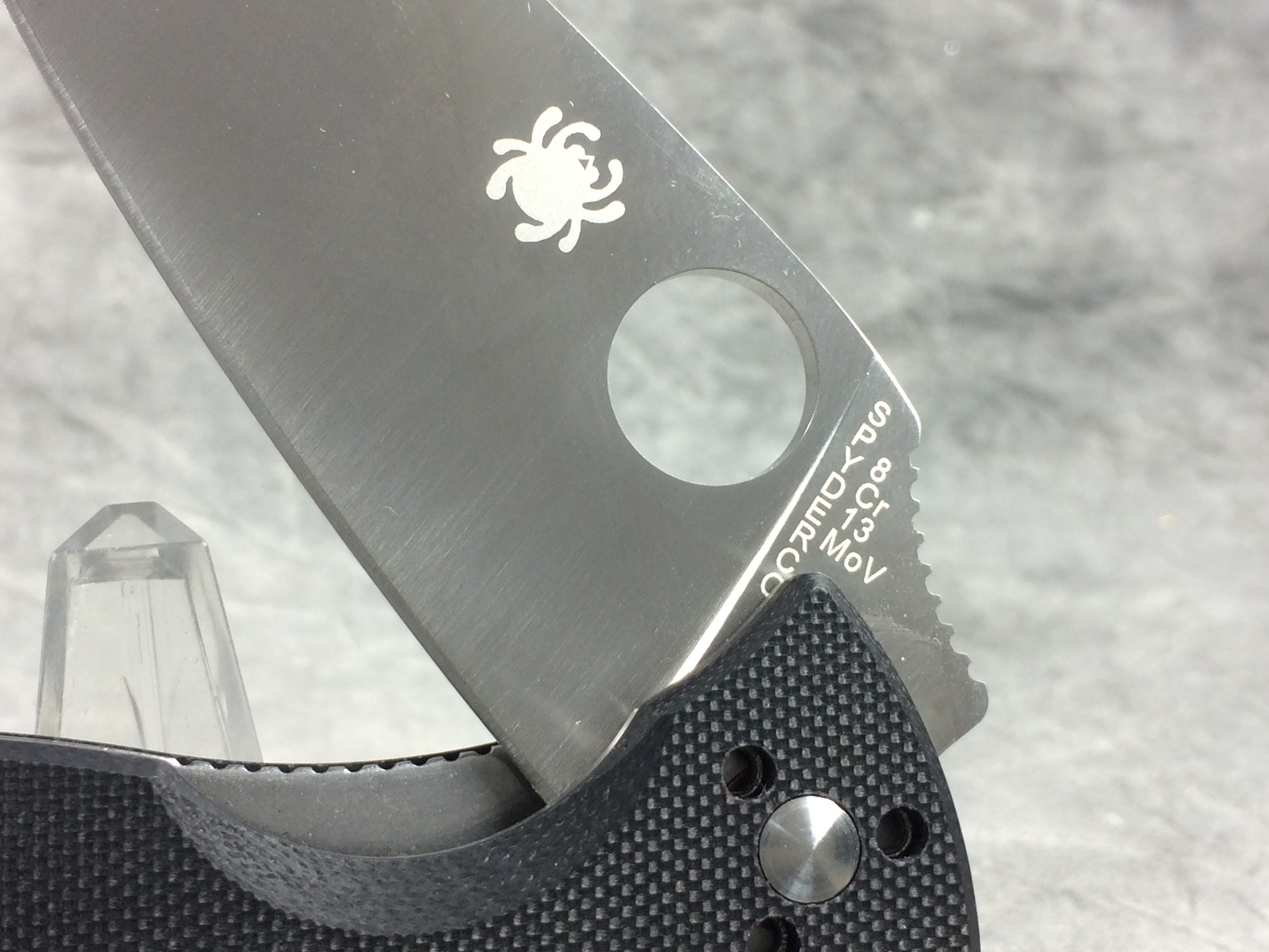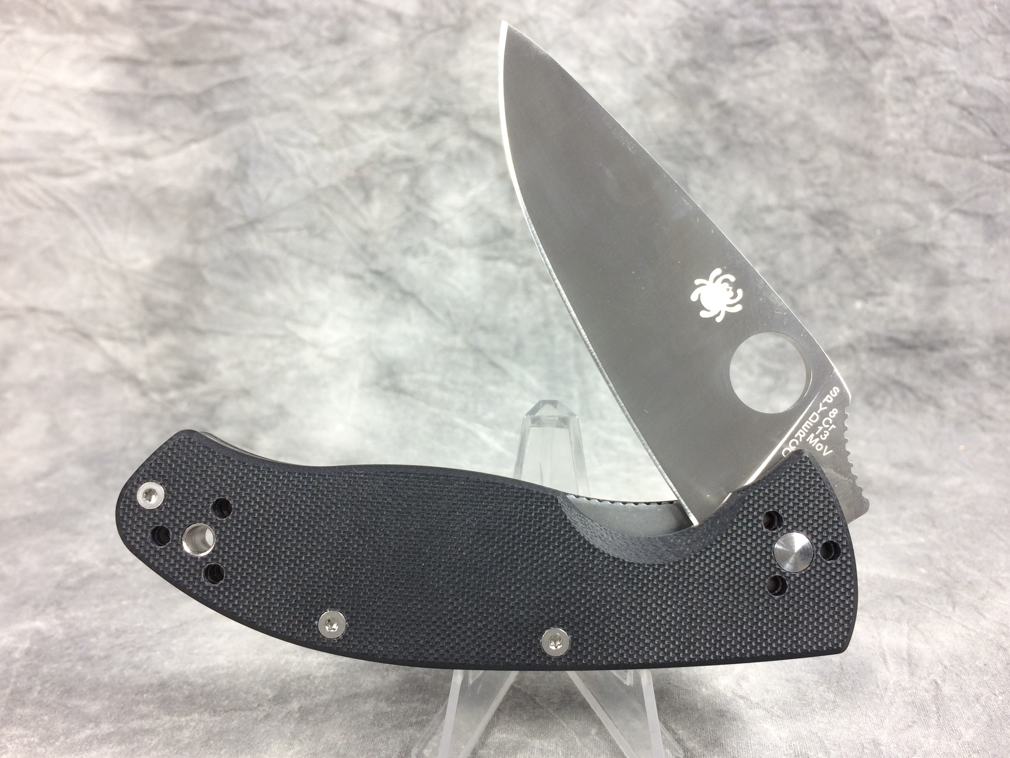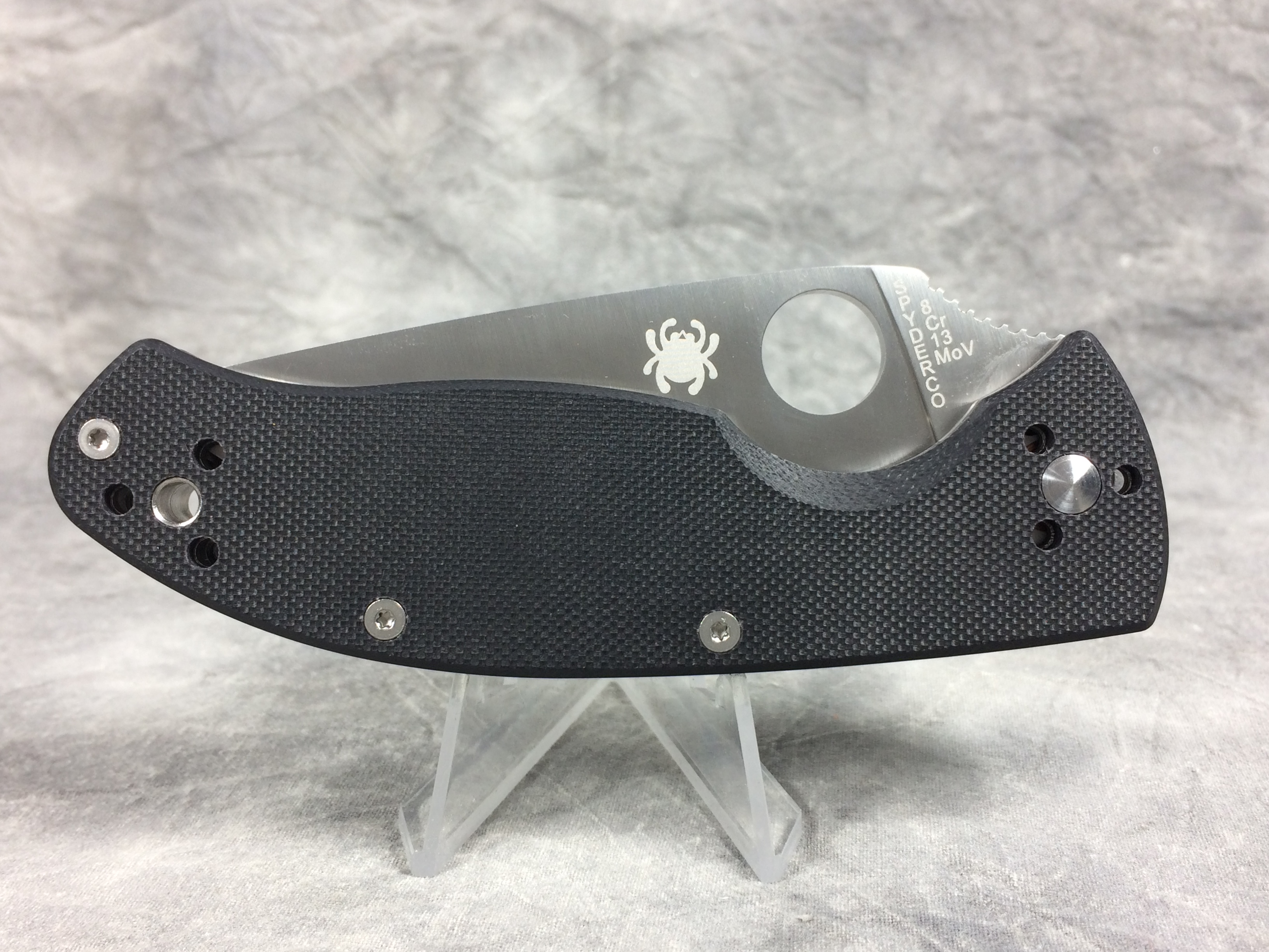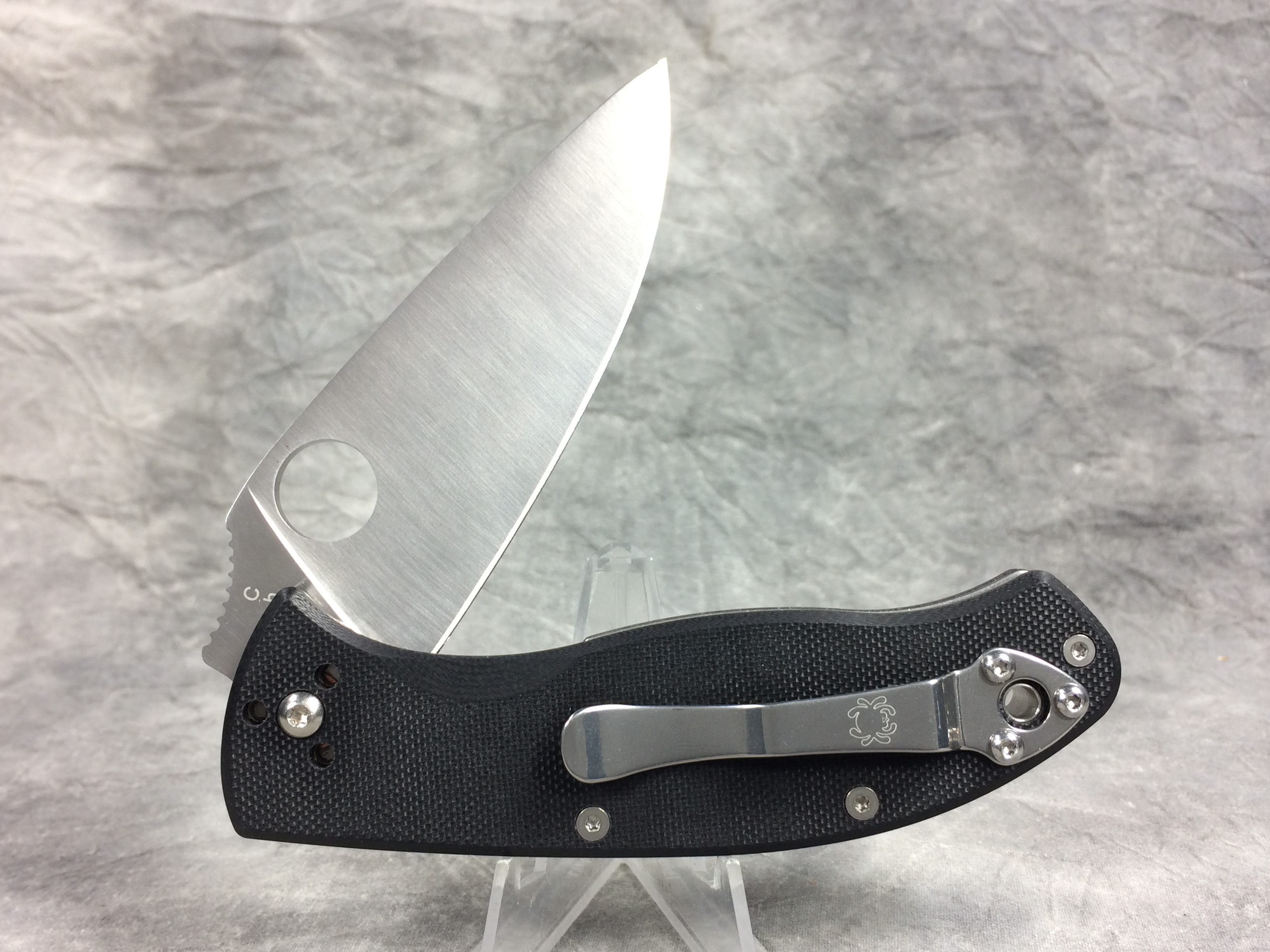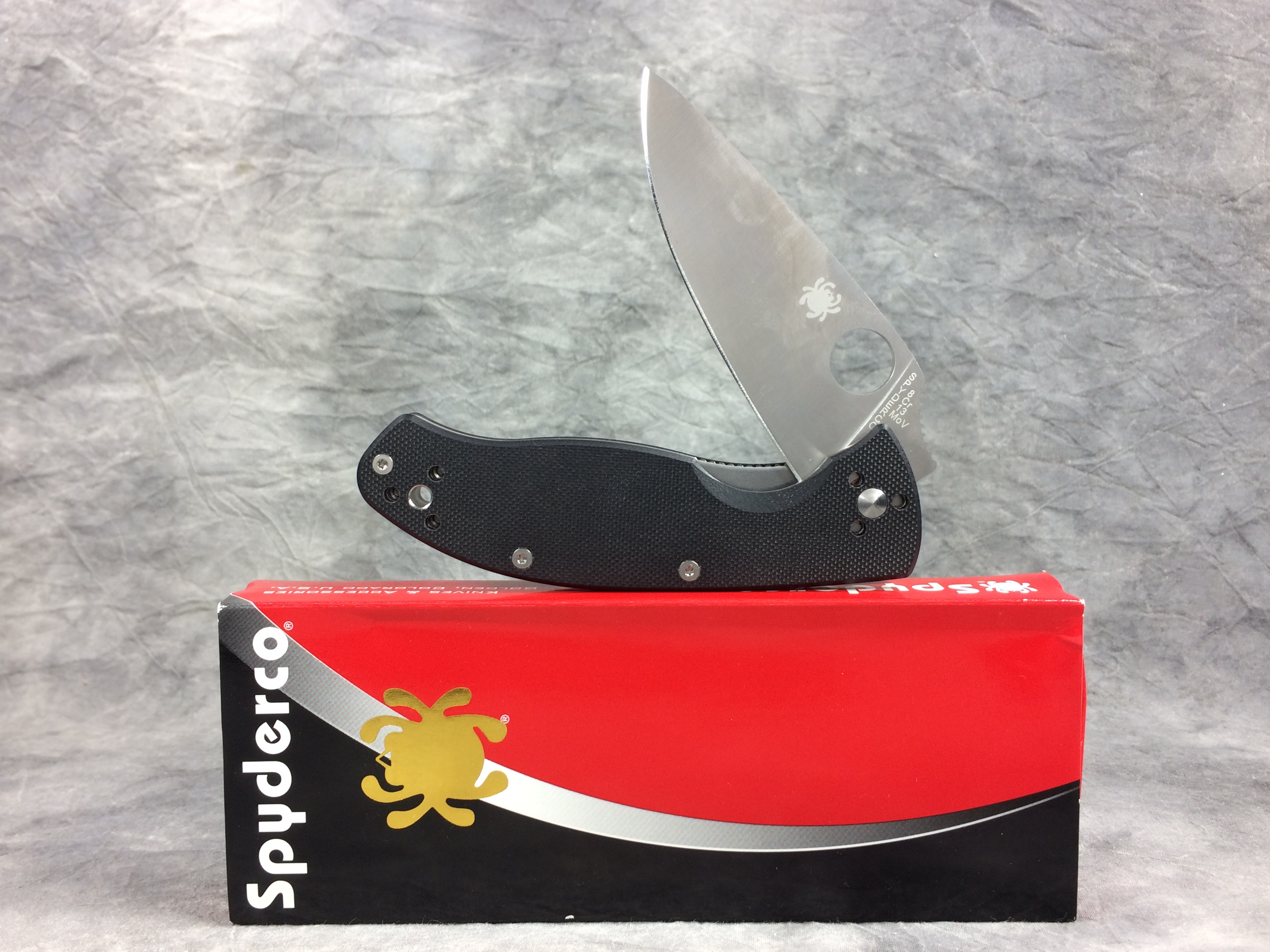 December 22, 2025 - 4-3/8 inches closed. 7-3/4 inches open. Black G10 laminate handle. Dual skeletonized stainless steel liners. Four-way pocket clip. "SPYDERCO 8Cr13Mov" and "China" tang stamps. 8Cr13Mov stainless steel blade etched with Spyderco logo. With original box and paperwork.