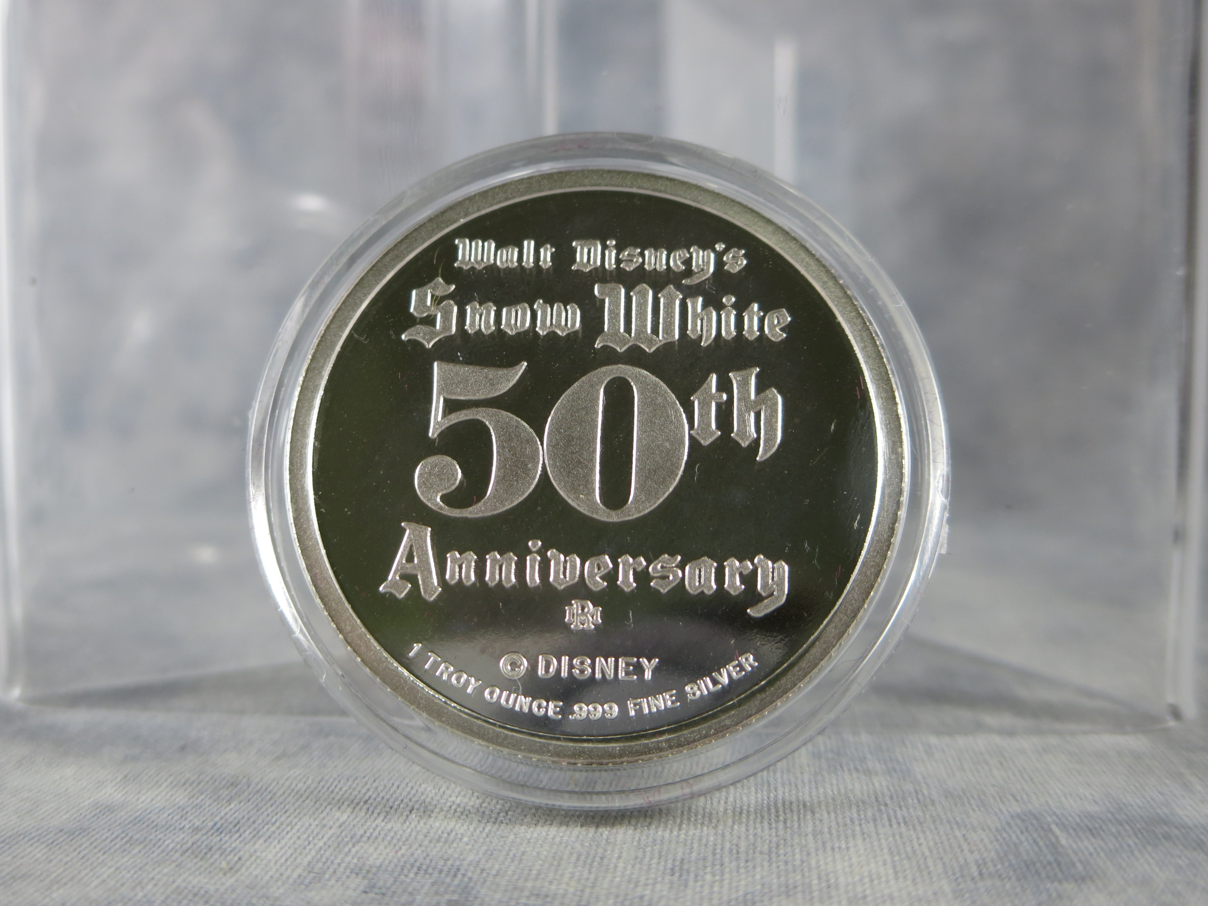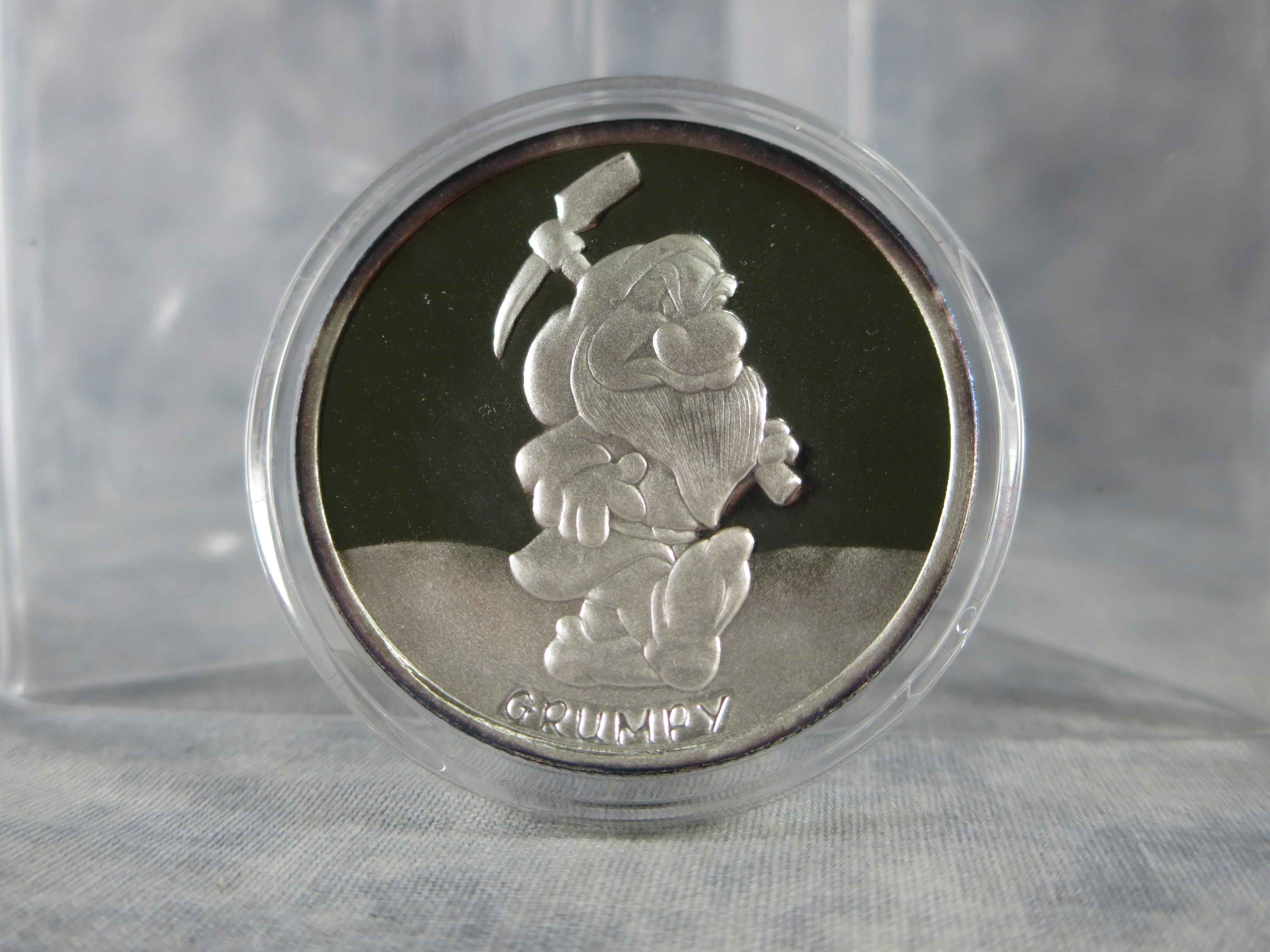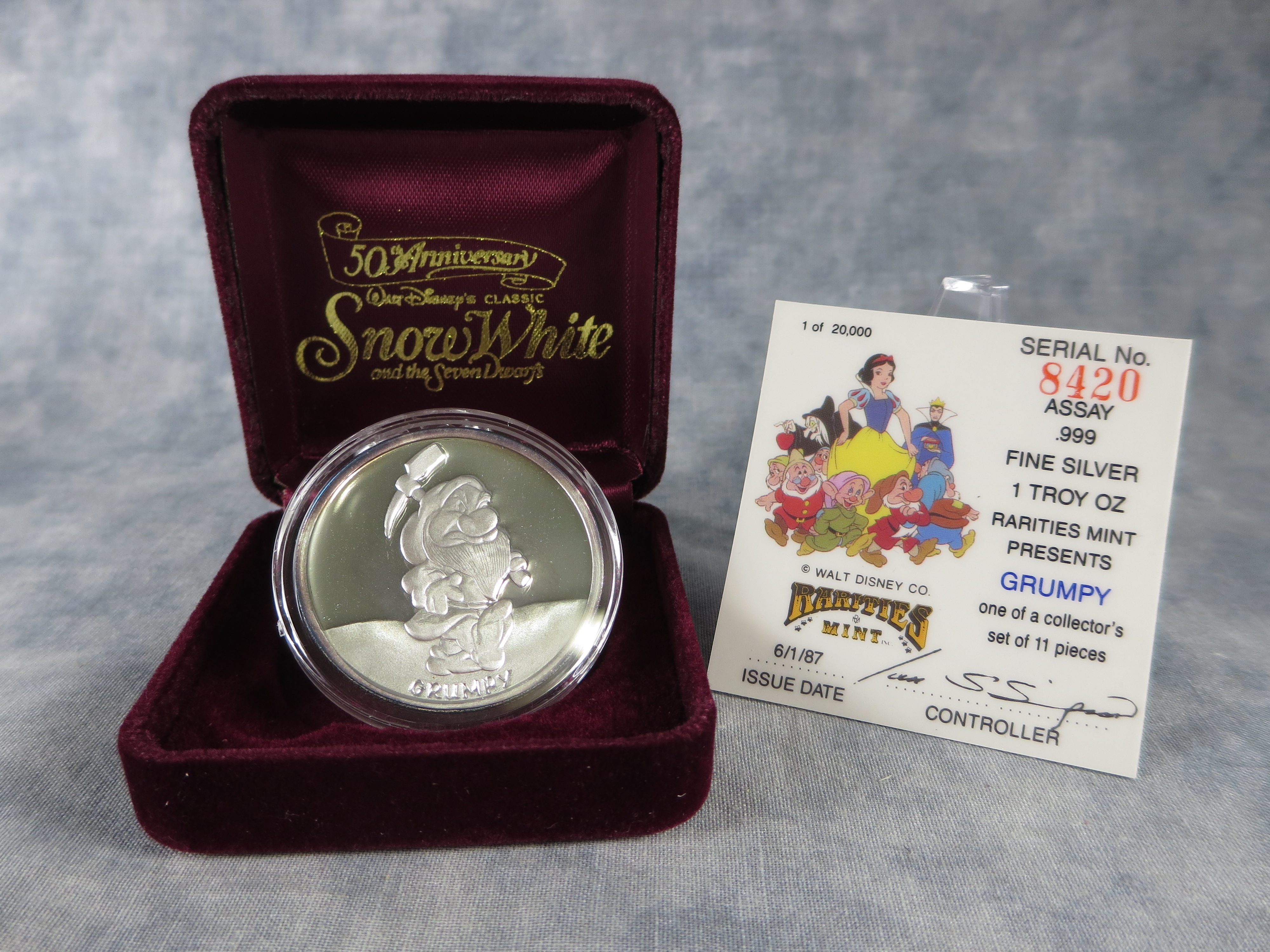 April 05, 2026 - Rarities Mint. Strictly Limited Edition of 20,000 medals. 1 troy ounce .999 Fine Silver proof Grumpy medal commemorating the 50th Anniversary of Walt Disney's Snow White and the Seven Dwarfs, released in 1937. 1-1/2 inch medal is encased in a hard plastic coin holder, housed inside a velvet display box with a serially numbered Certificate of Authenticity certified 6/1/87.