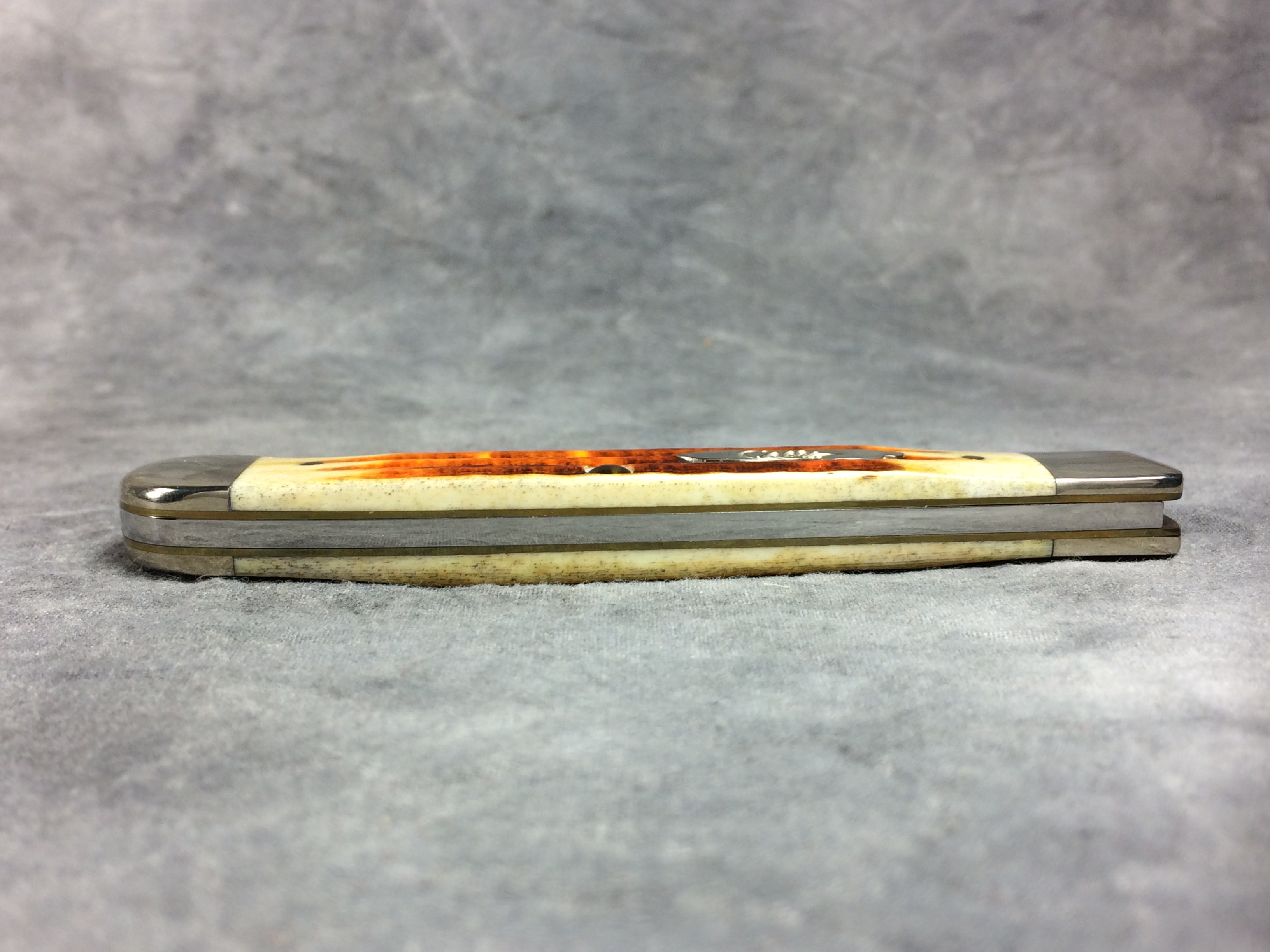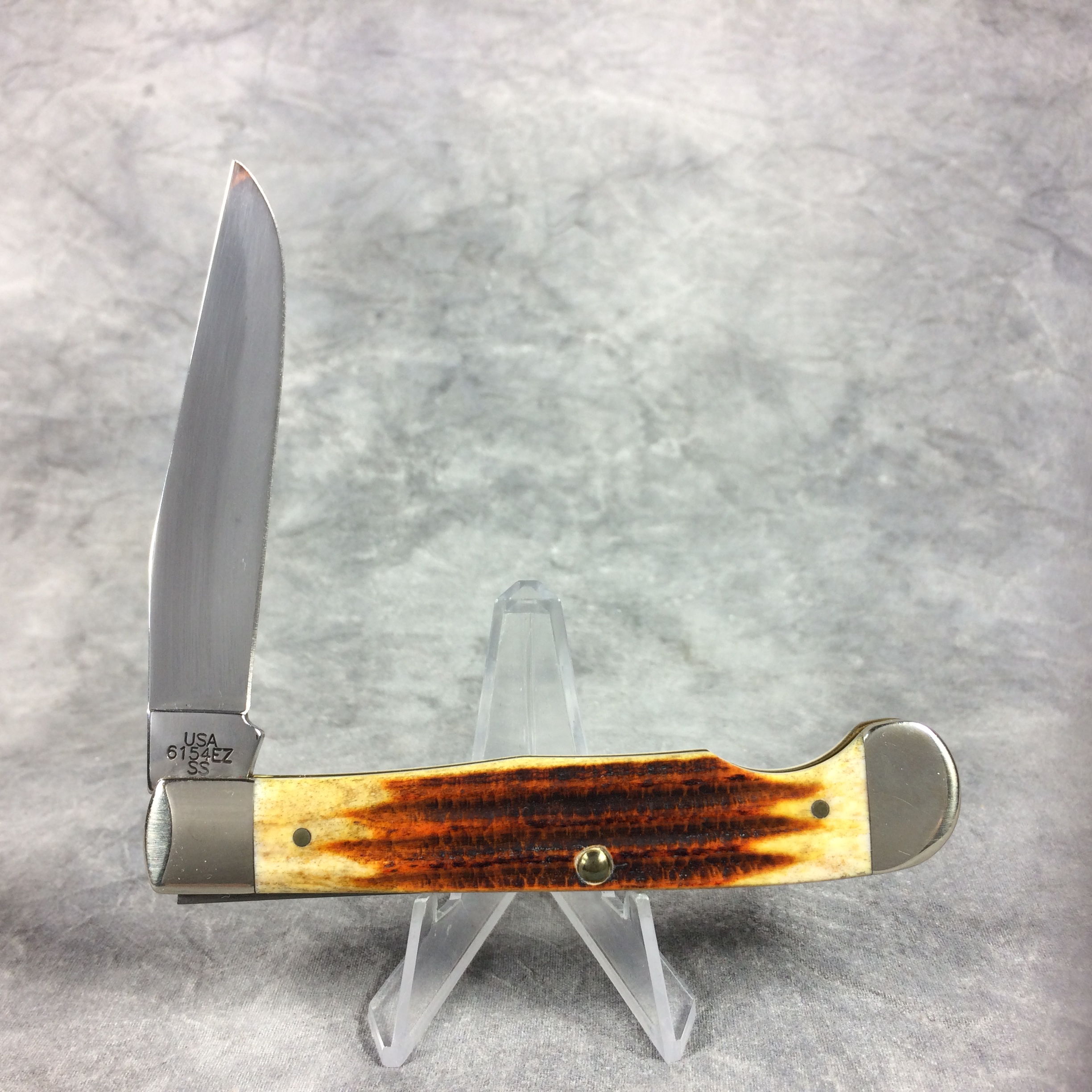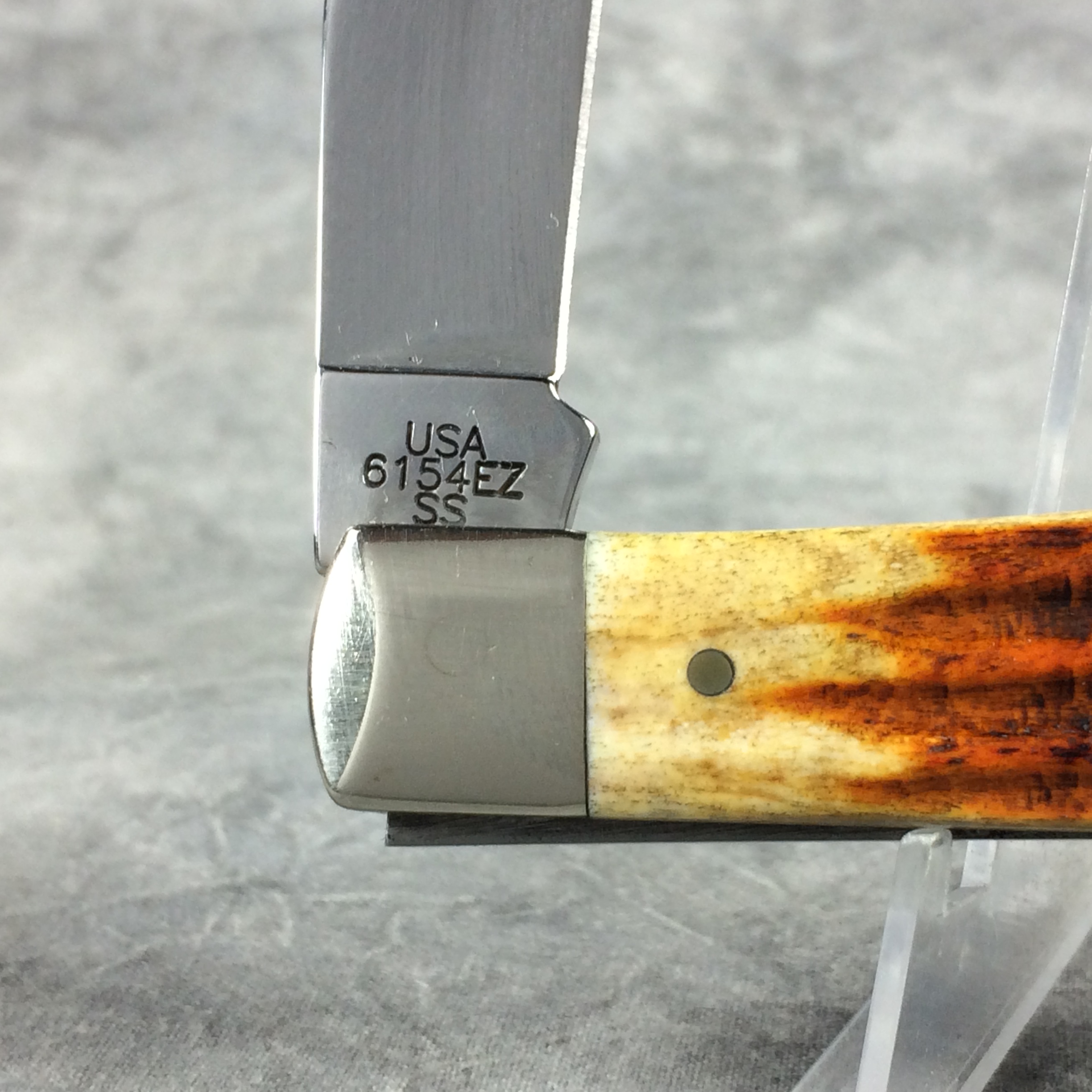 November 03, 2025 - 4-1/8 inches closed. 7-1/4 inches open. Made in USA. "  x x x  Case XX   x x*  " (with lightning bolt S) and "USA 6154EZ SS" tang stamps. Oval long-C script "Case xx" shield. Stainless Steel blade. Antique jigged bone handle. Nickel Silver bolsters. Brass liner.