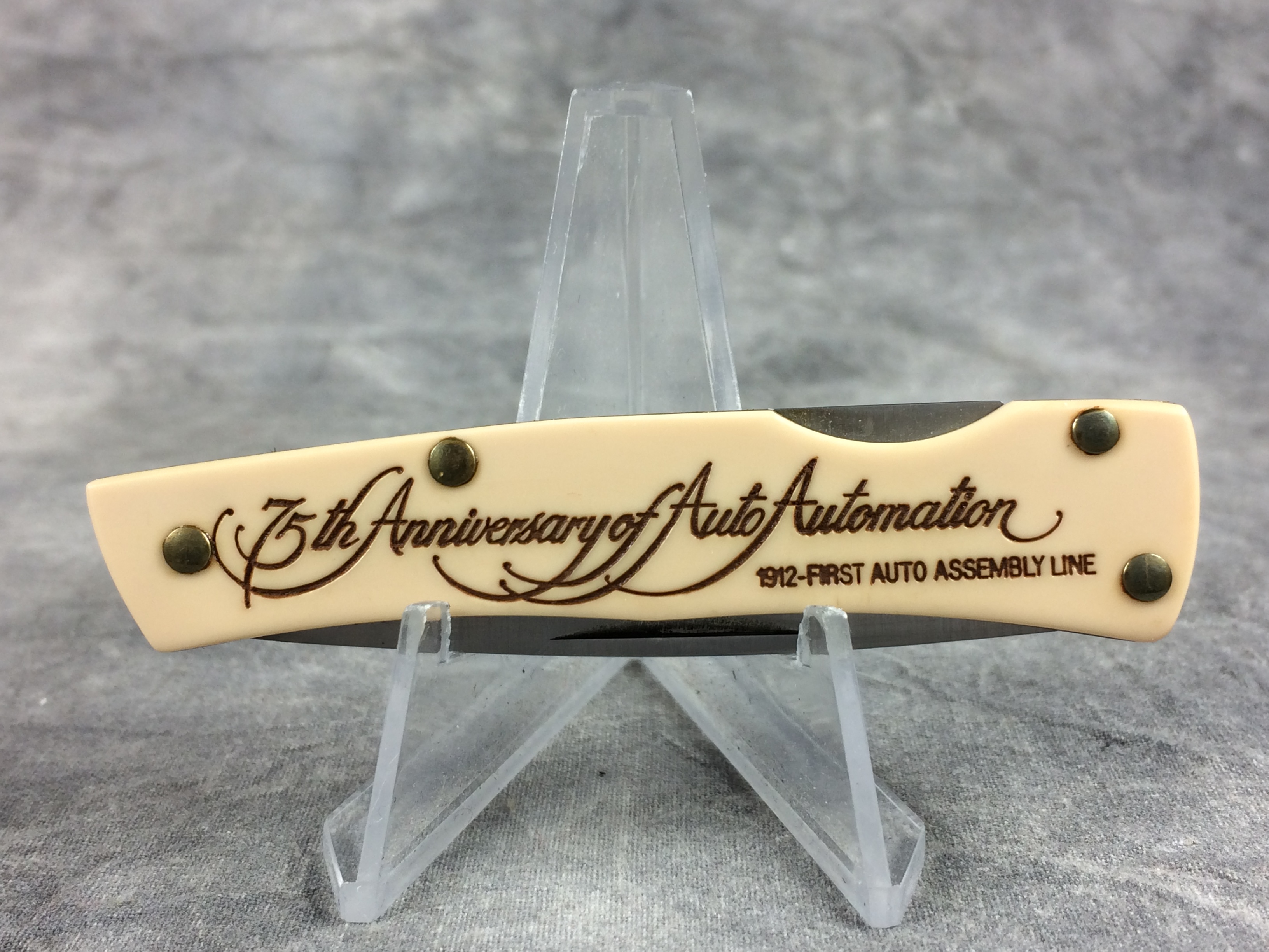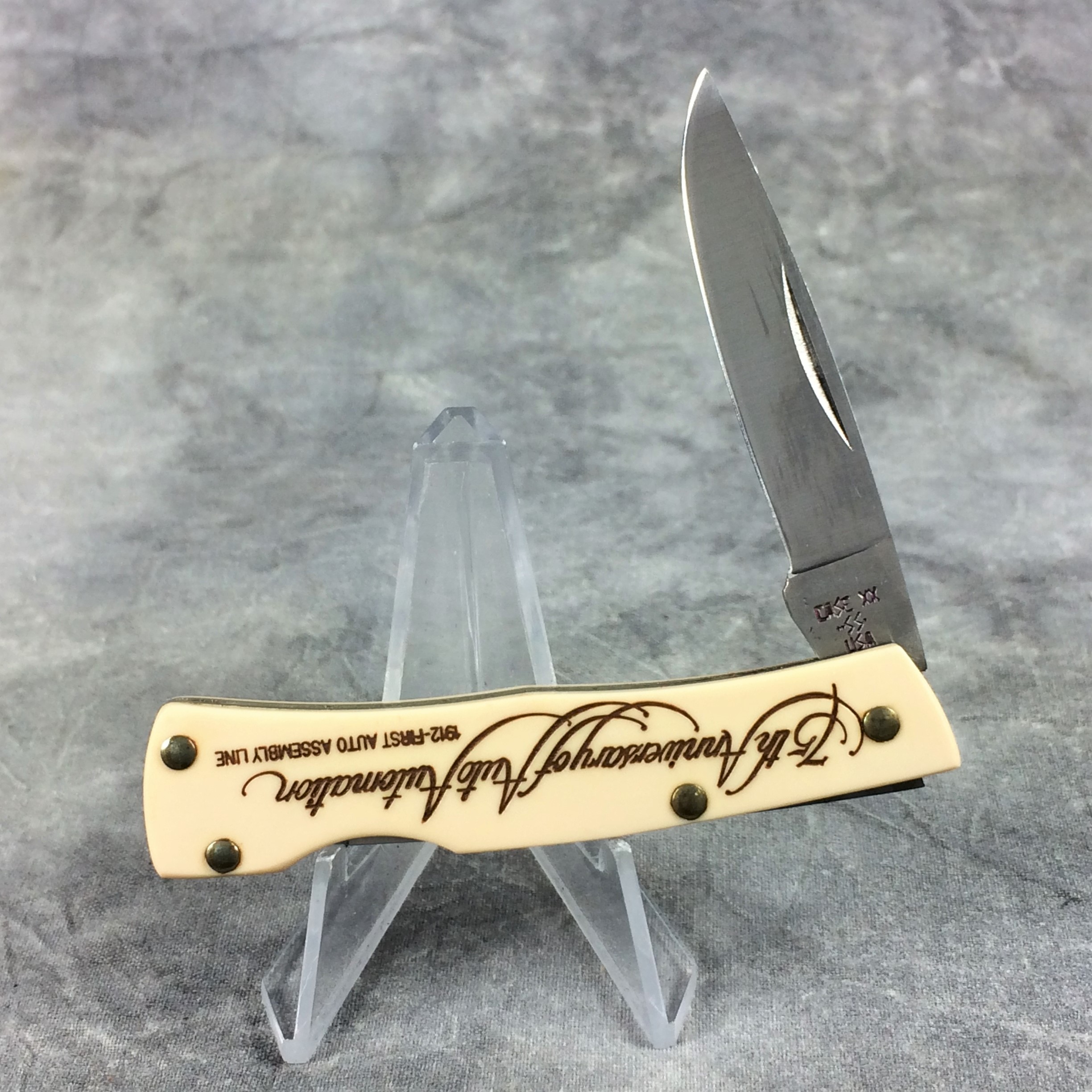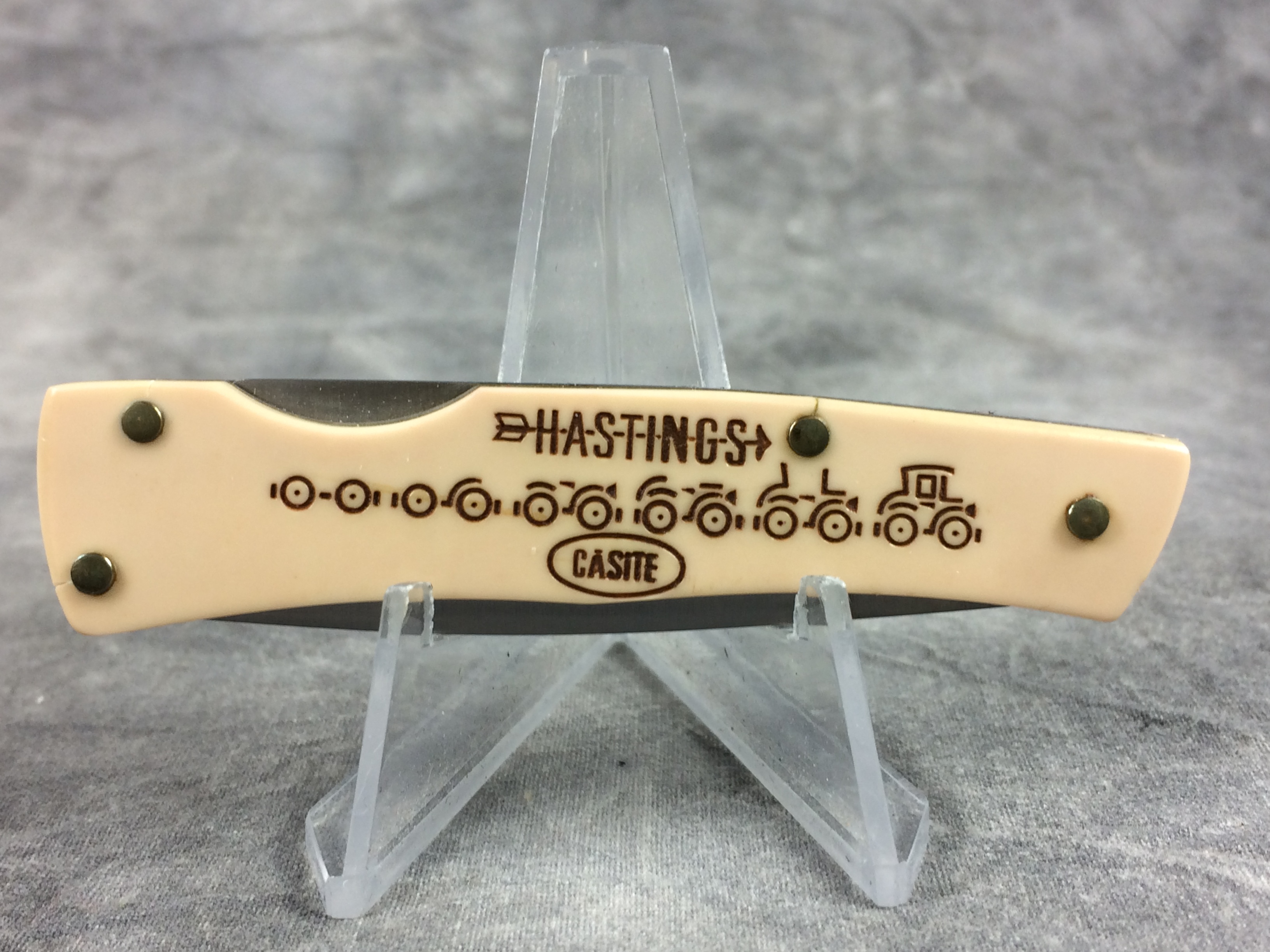 January 08, 2026 - 3 inches closed. 5-1/4 inches open. Made in USA. "CASE XX **SS* USA" (3 dot with lightning bolt S) and "41059 L SSP" tang stamps. Stainless steel blade. Cream composition handle reads '75th Anniversary Auto Automation' on front and 'HASTINGS' and 'CASITE' in an oval with a car assembly line. Brass liner.