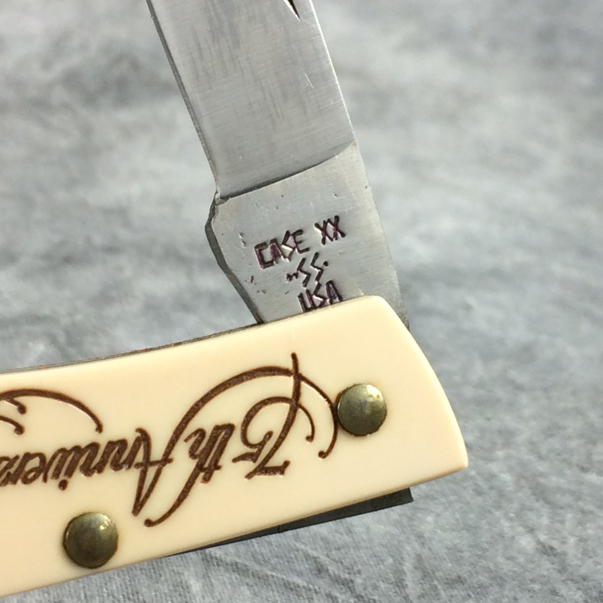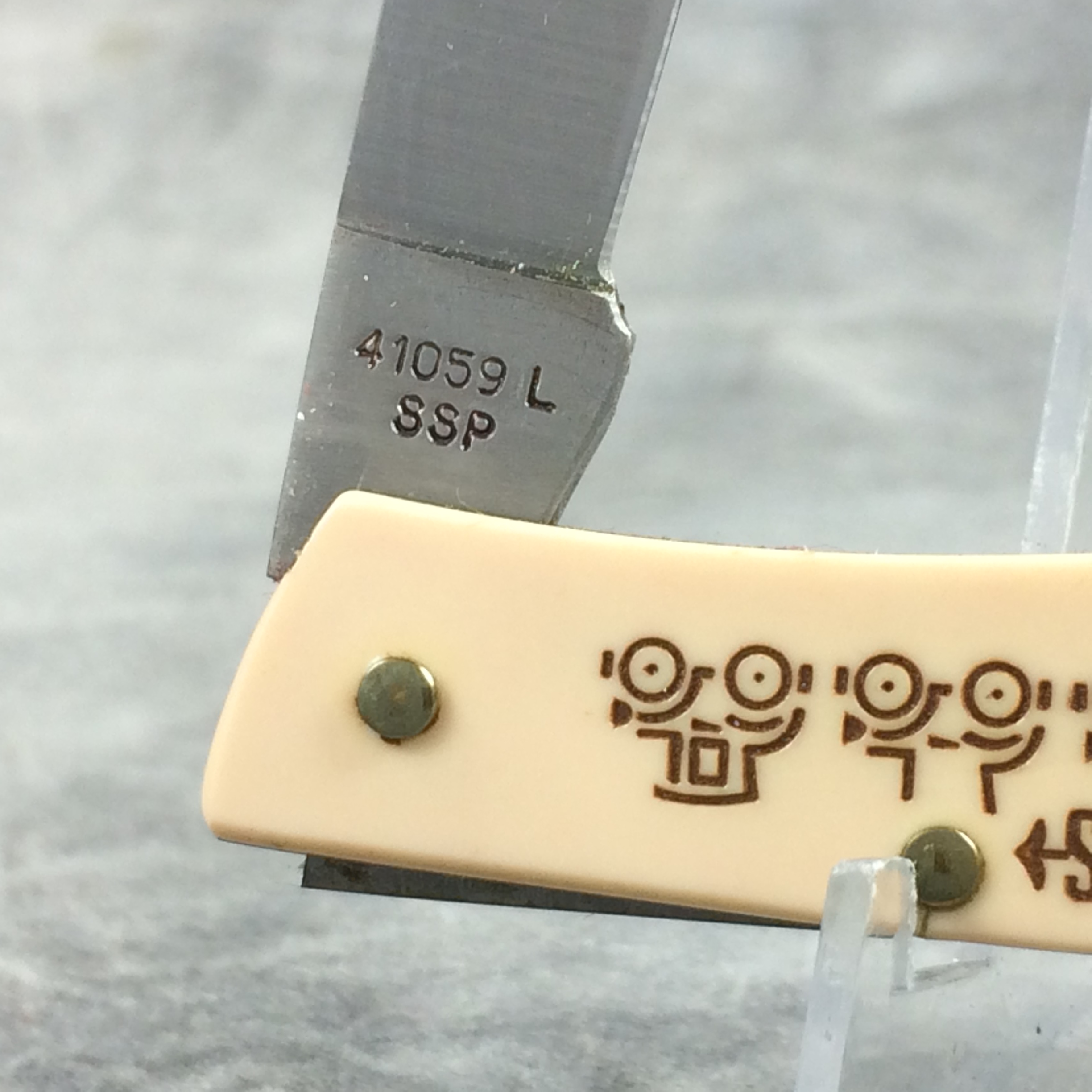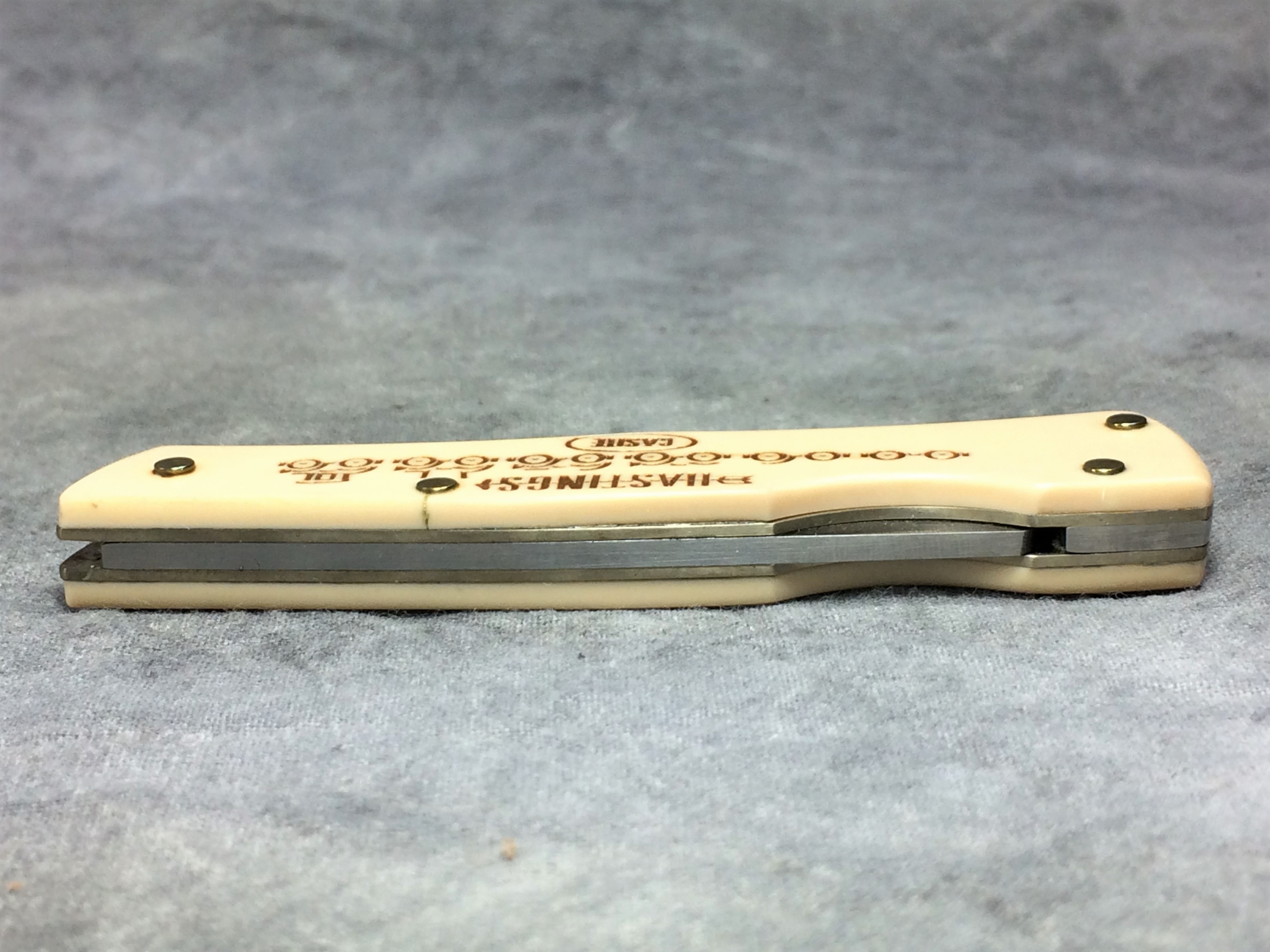 January 08, 2026 - 3 inches closed. 5-1/4 inches open. Made in USA. "CASE XX **SS* USA" (3 dot with lightning bolt S) and "41059 L SSP" tang stamps. Stainless steel blade. Cream composition handle reads '75th Anniversary Auto Automation' on front and 'HASTINGS' and 'CASITE' in an oval with a car assembly line. Brass liner.