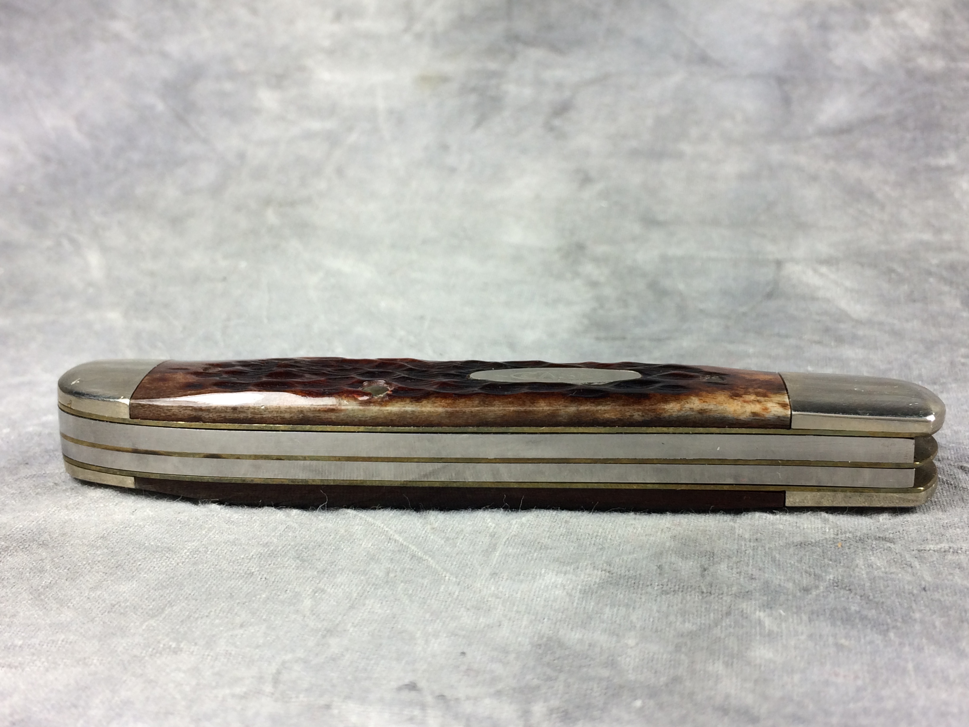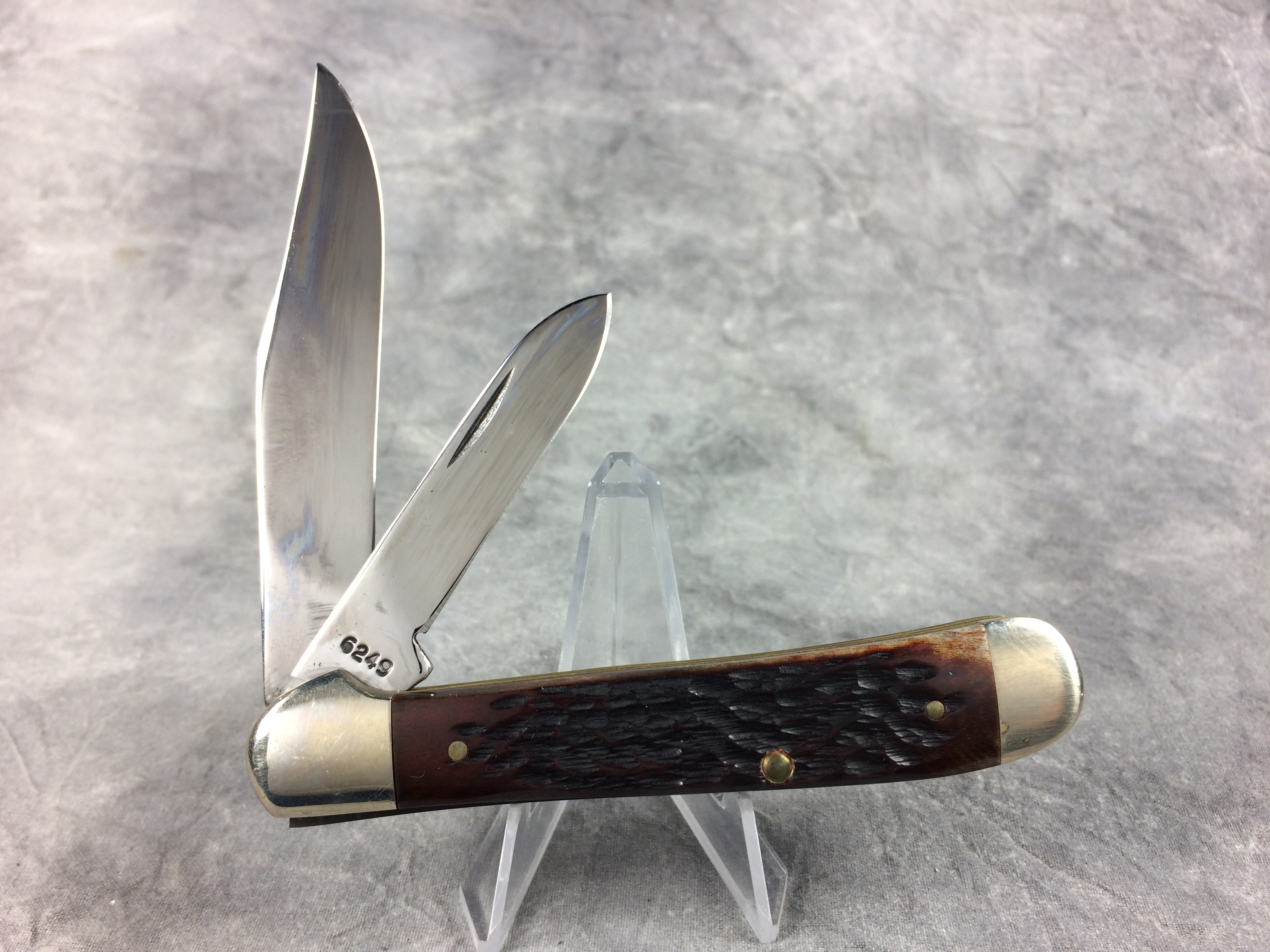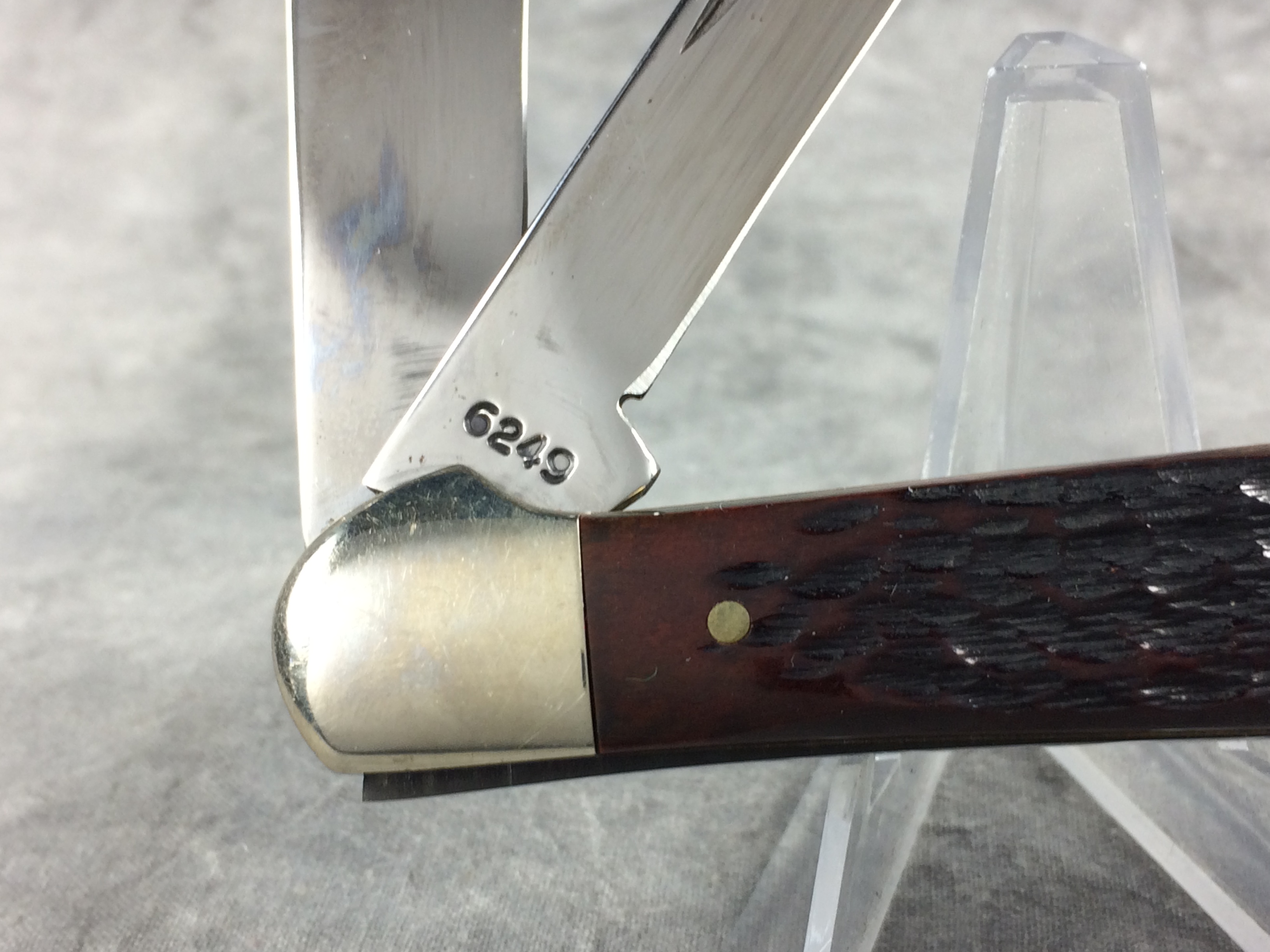 December 22, 2025 - 4 inches closed. 7 inches open. Made in USA. "CASE XX ******* U.S.A." (7 dot with lightning bolt S) and "6249" tang stamps. Double Oval 'Open C' CASE shield. Chrome Vanadium blades. Main blade etched with UNIFI INC. logo and serial #083. Jigged Bone handle. Nickel Silver bolsters. Brass liner.