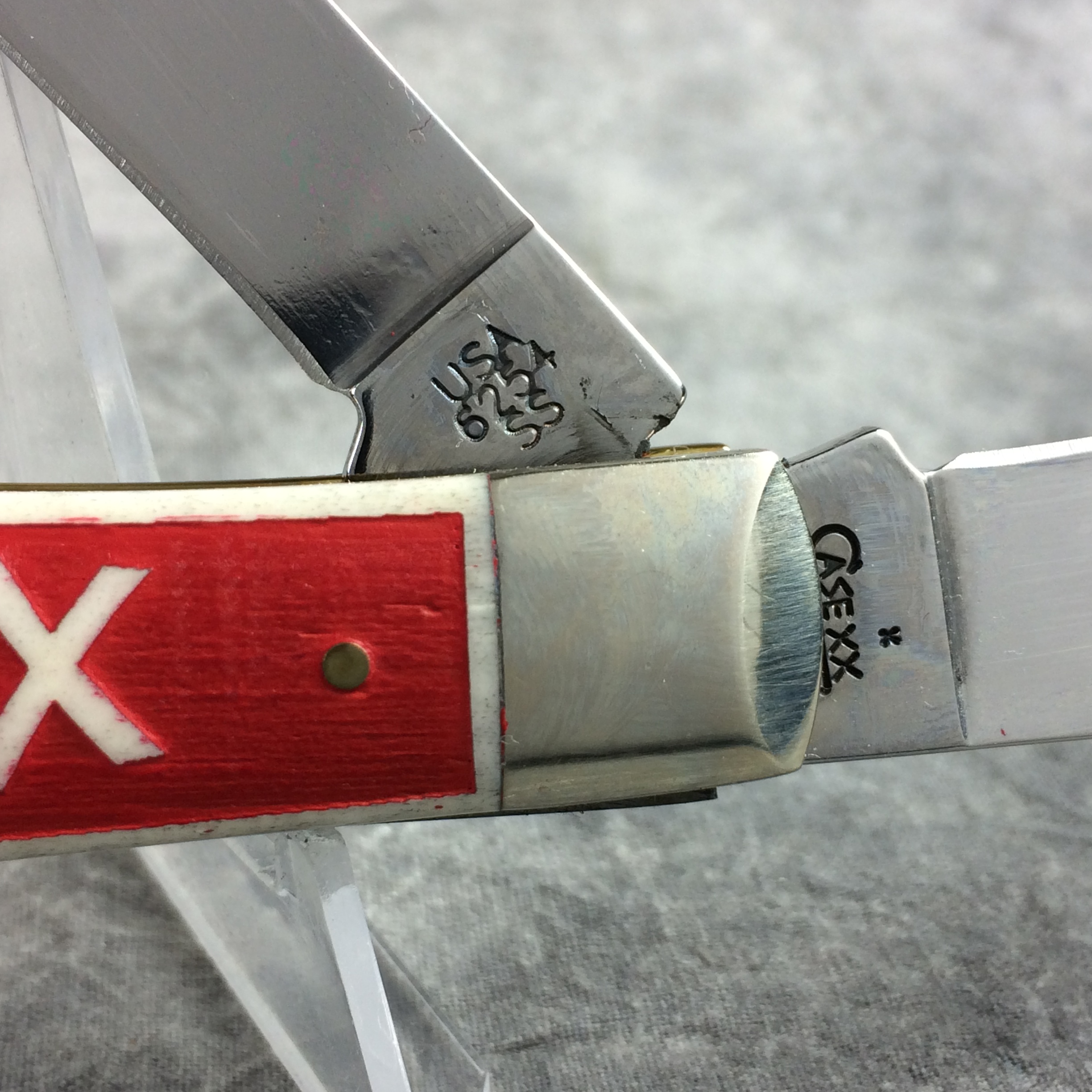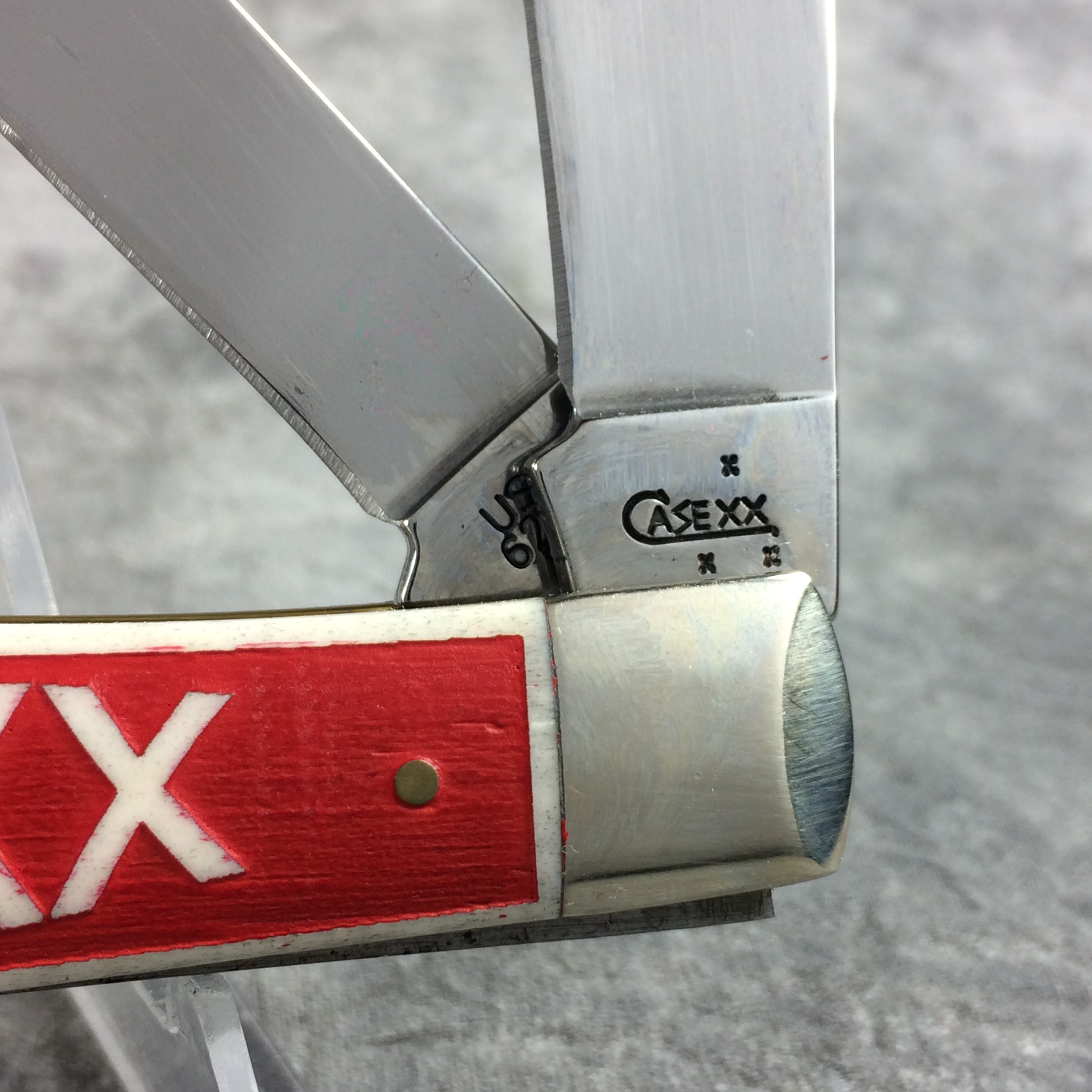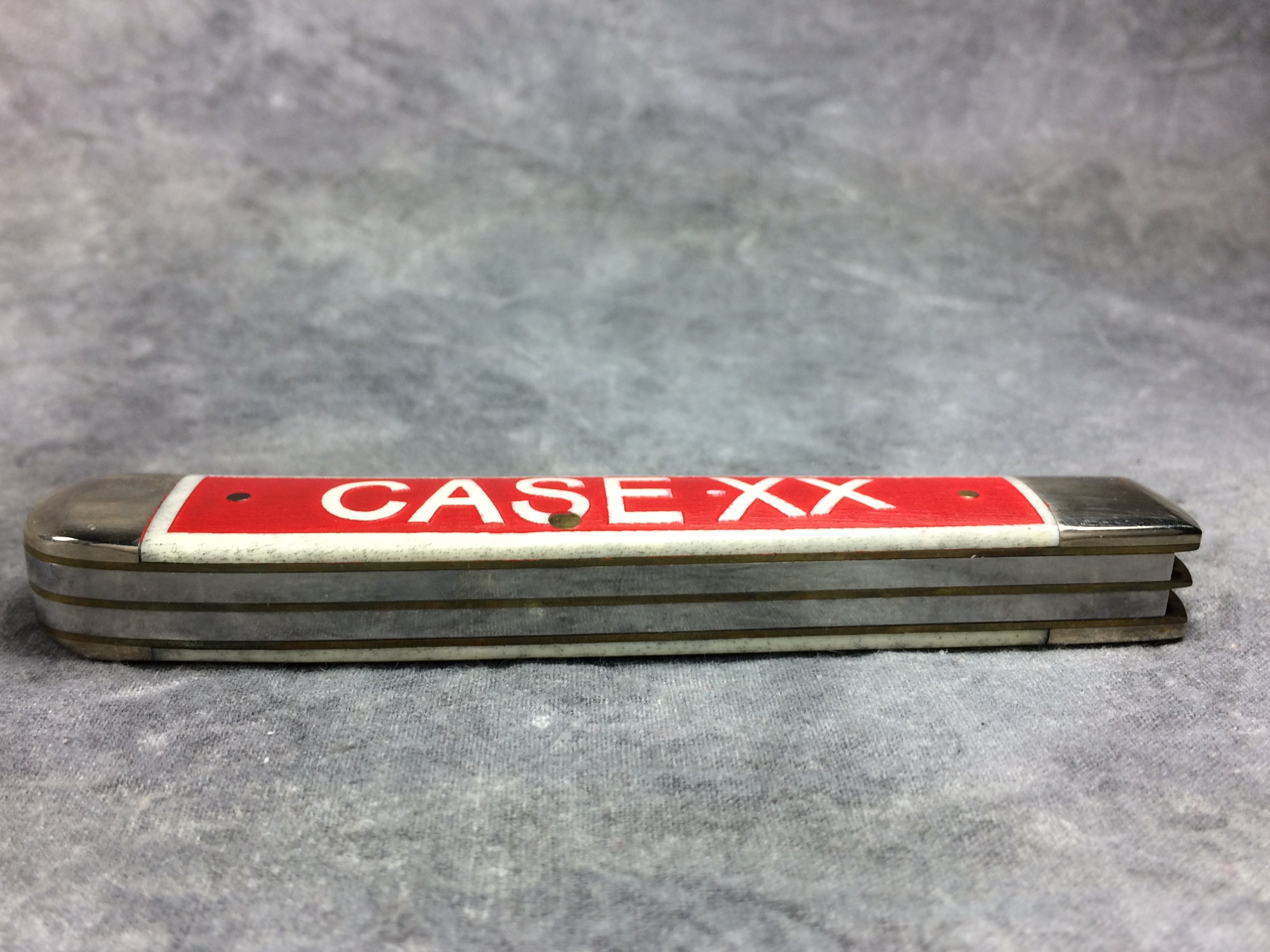 November 14, 2025 - 4-1/8inches closed. 7-3/8 inches open. Made in USA. "   x  CASE XX   x x " (with lightning bolt S) and "USA 6254 SS" tang stamps. No shield. Stainless steel blades. Smooth natural bone handle with laser etched "CASE-XX" against red fill background. Nickel Silver bolsters. Brass liner.