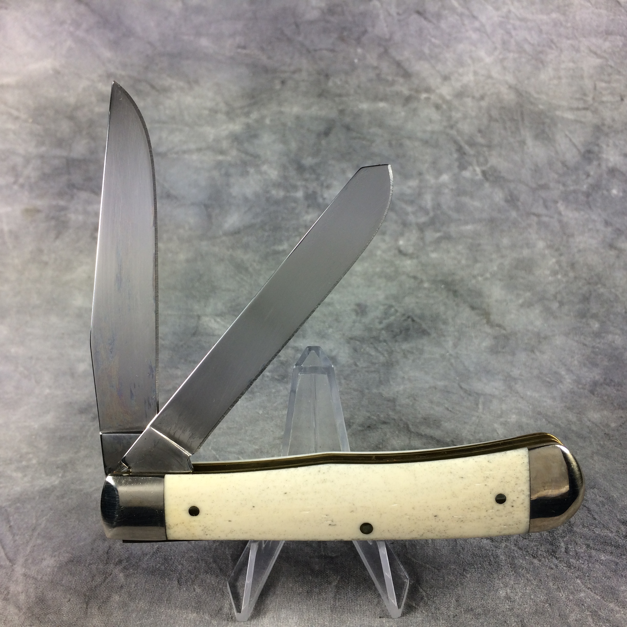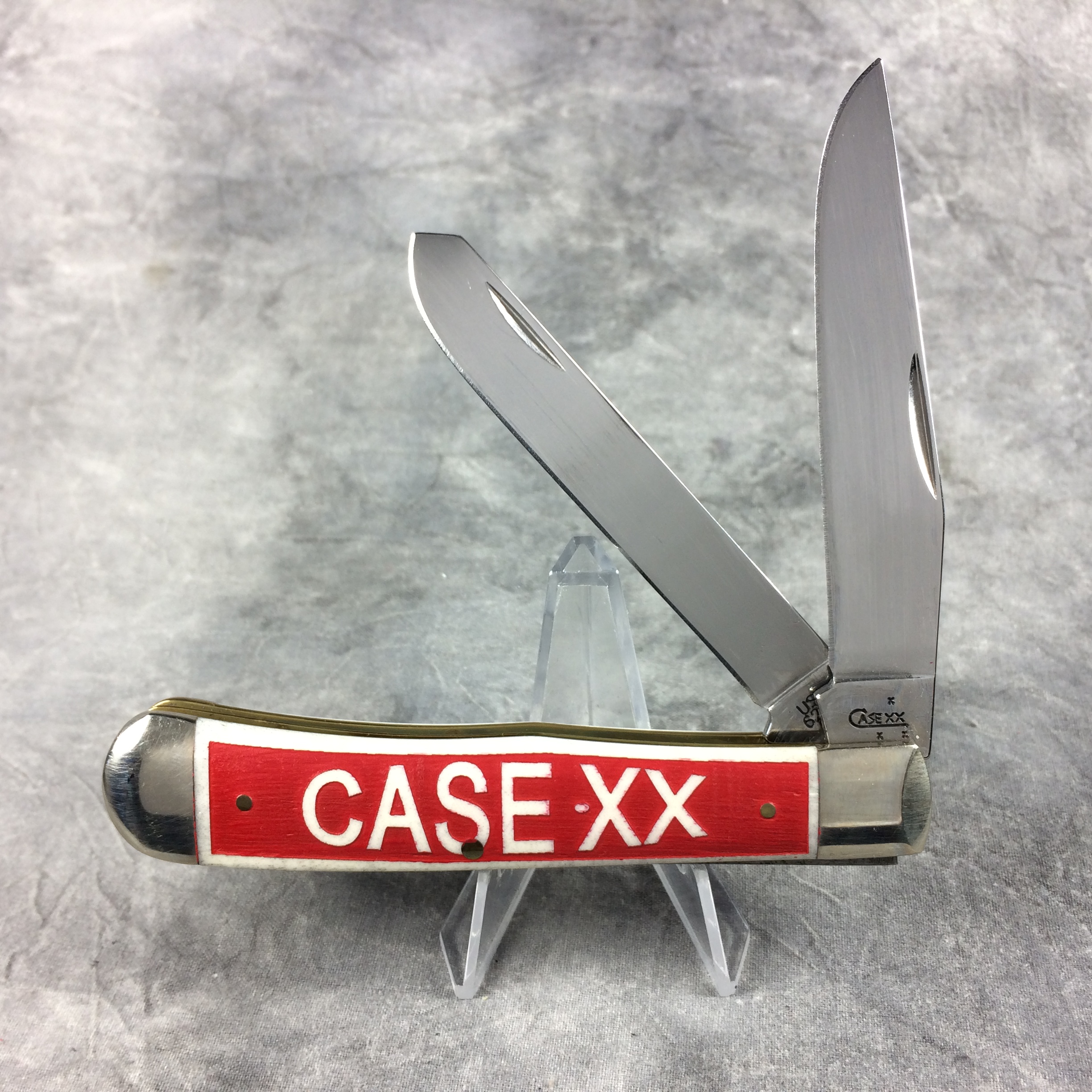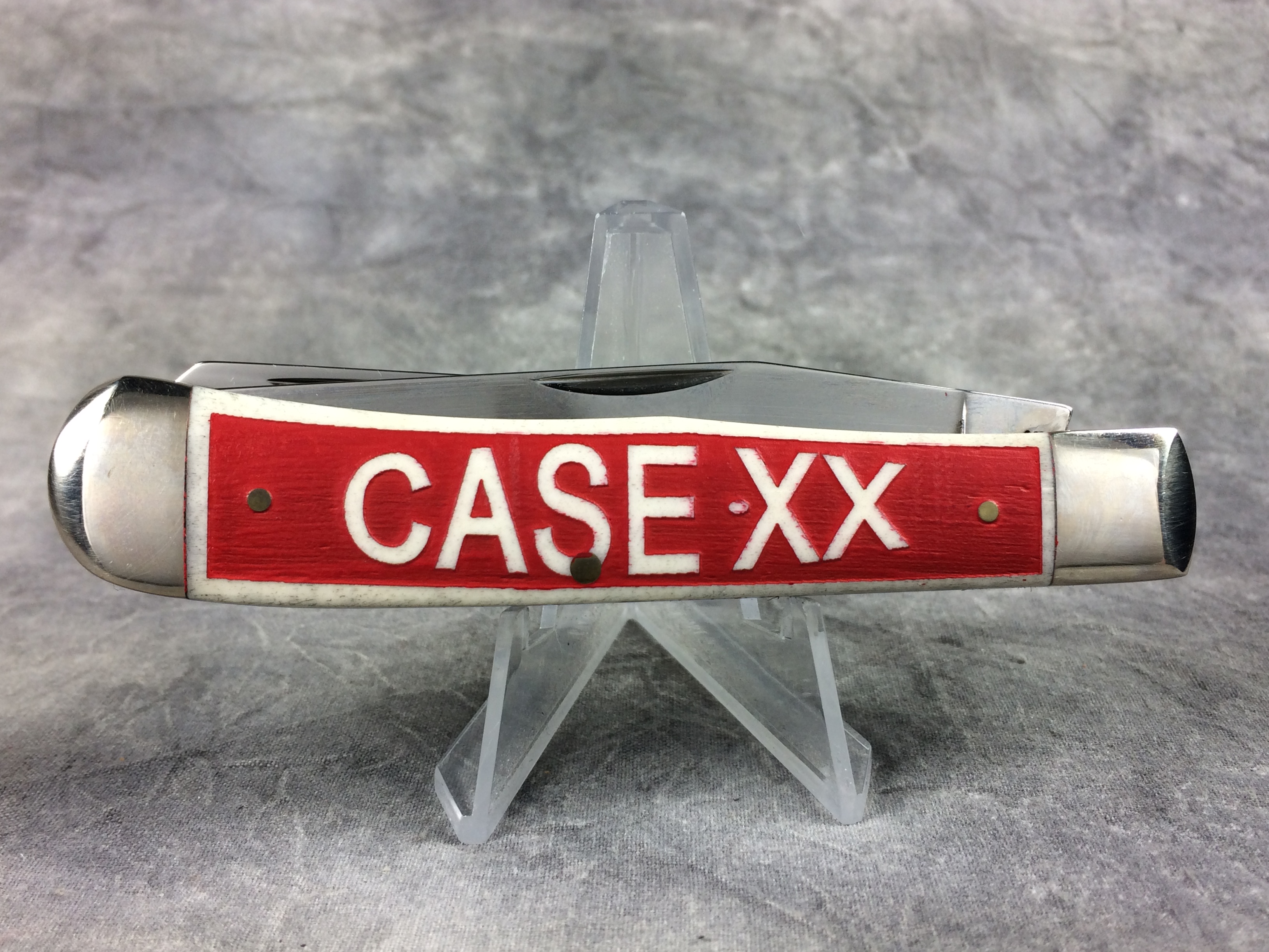 November 14, 2025 - 4-1/8inches closed. 7-3/8 inches open. Made in USA. "   x  CASE XX   x x " (with lightning bolt S) and "USA 6254 SS" tang stamps. No shield. Stainless steel blades. Smooth natural bone handle with laser etched "CASE-XX" against red fill background. Nickel Silver bolsters. Brass liner.