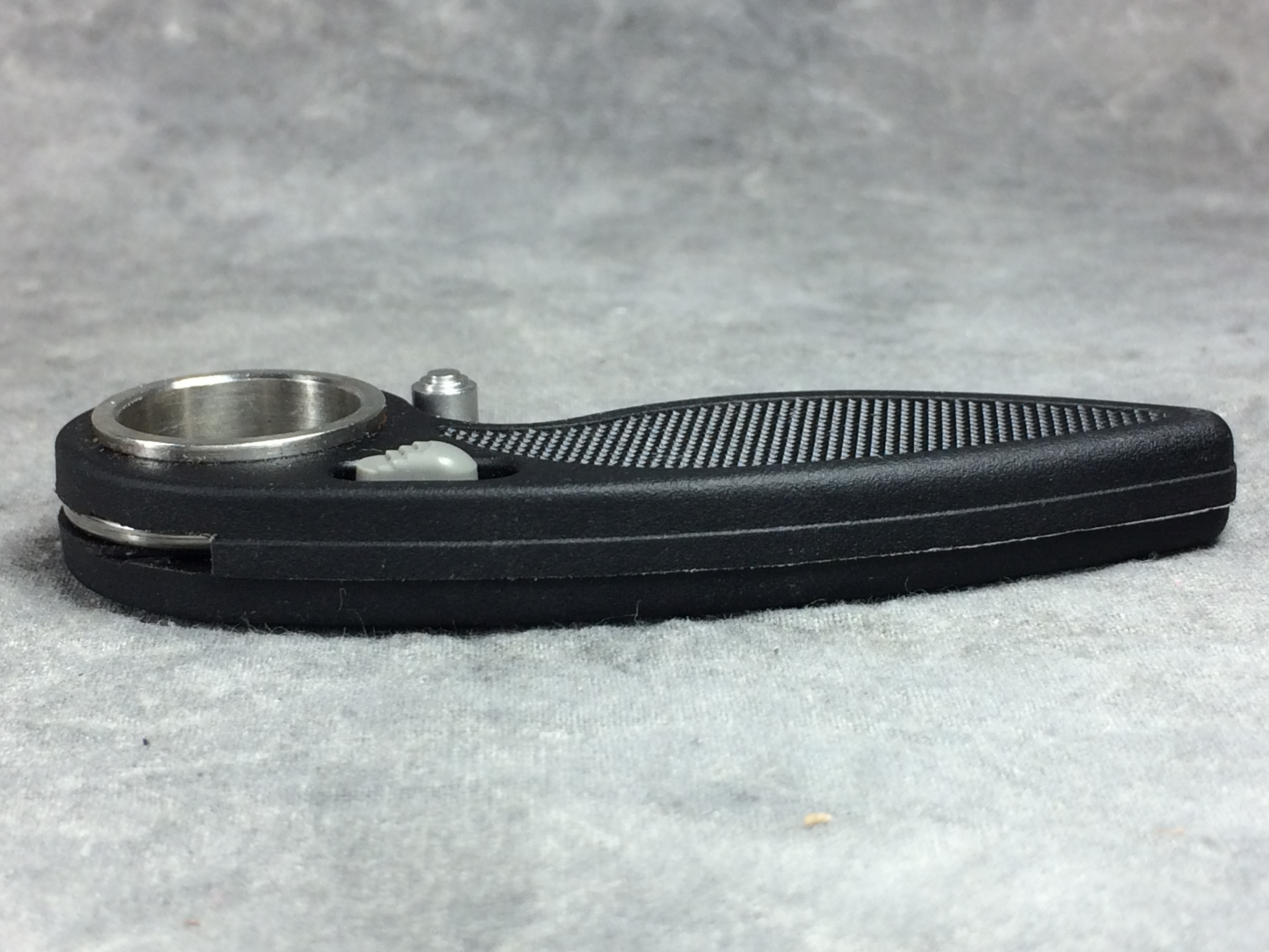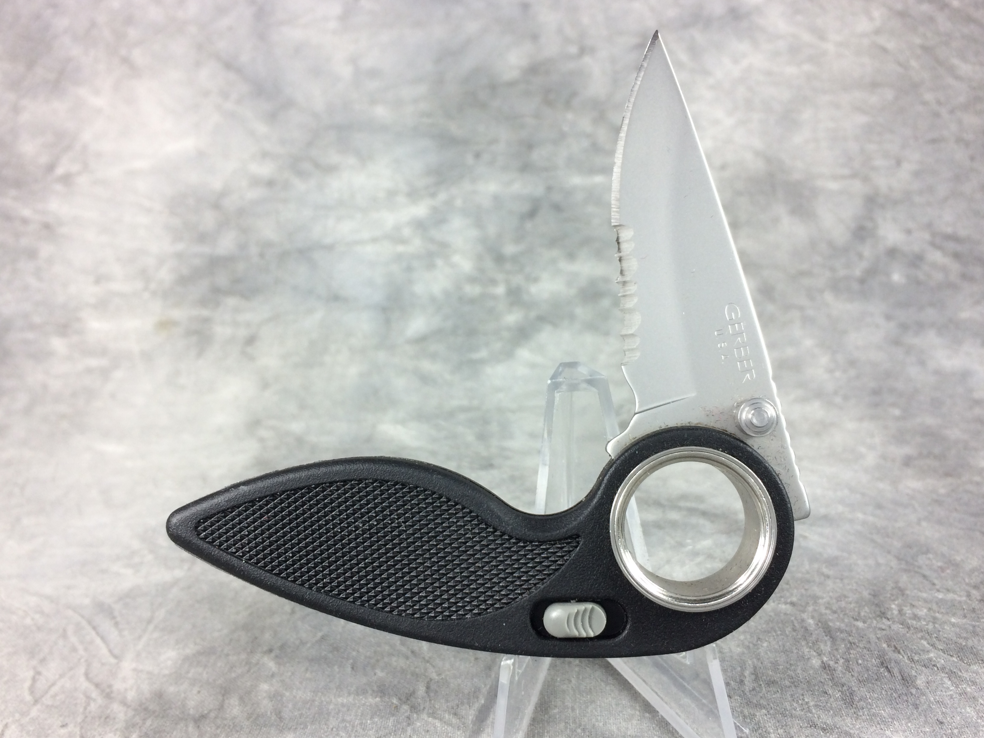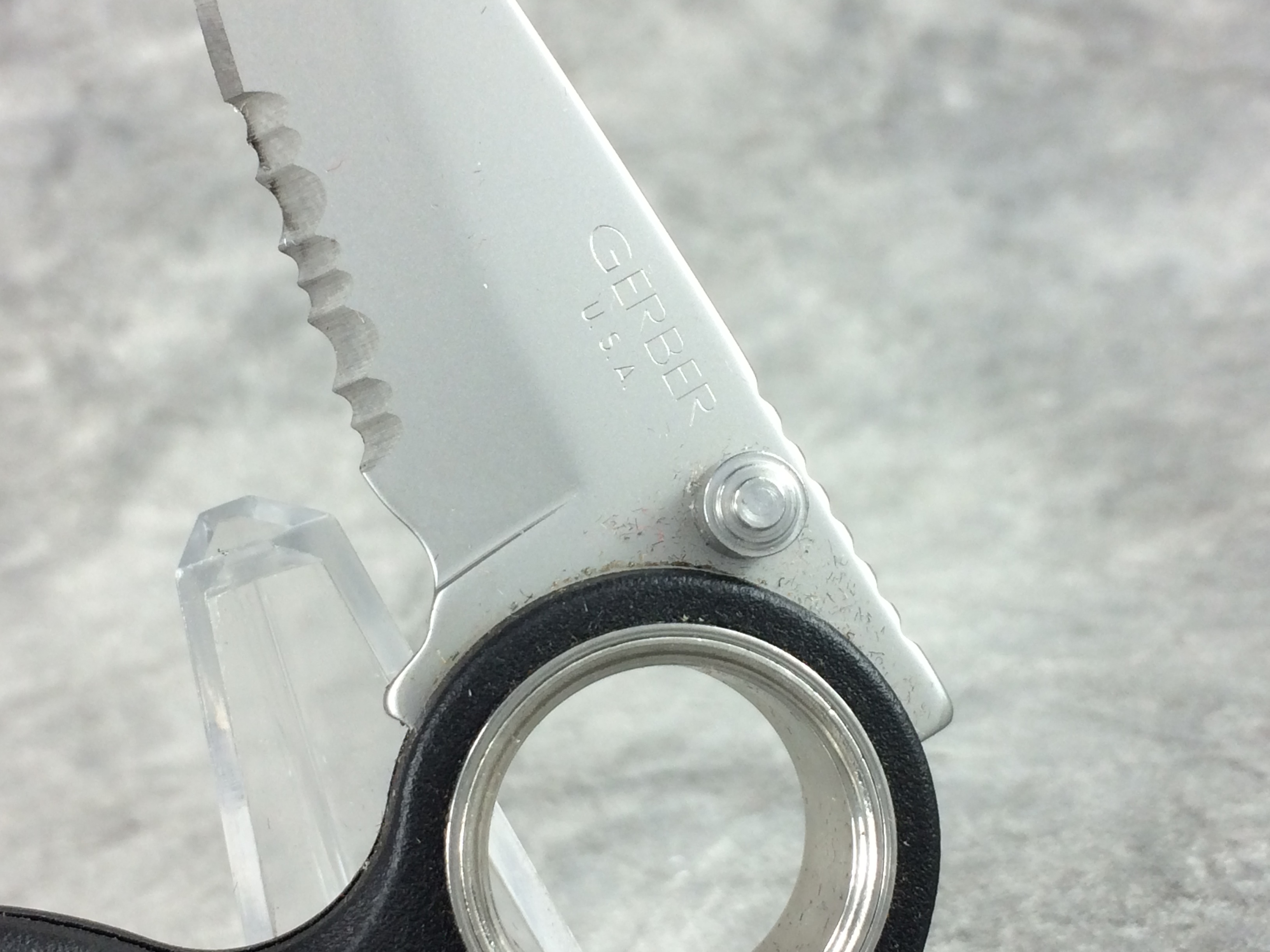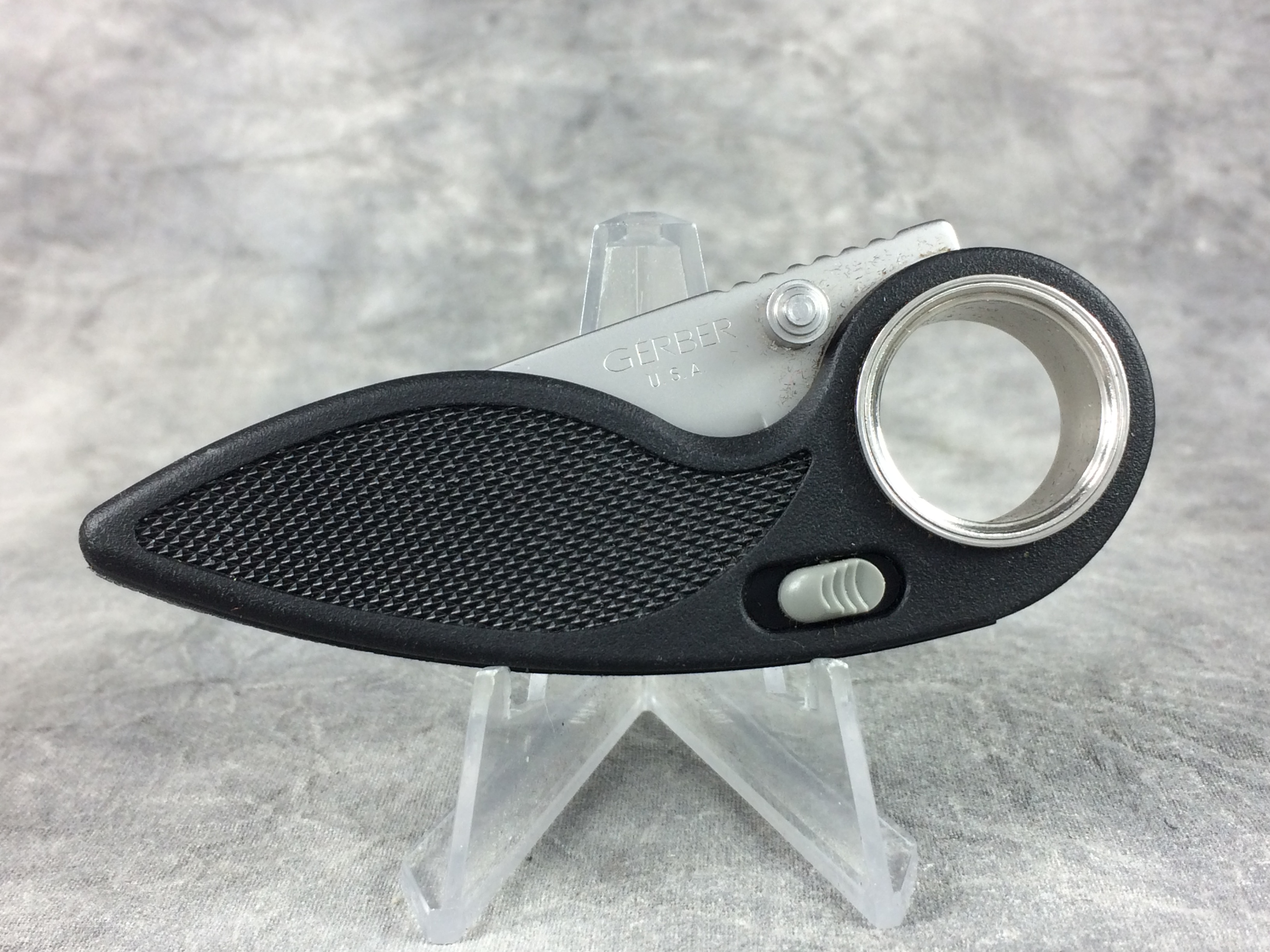 March 09, 2026 - 3-1/2 inches closed. 5-3/4 inches open. "GERBER U.S.A." etched onto blade. Dual thumb studs for easy opening. Black fiberglass handle. Jimping on the spine. Features large pivot hole for better stability.