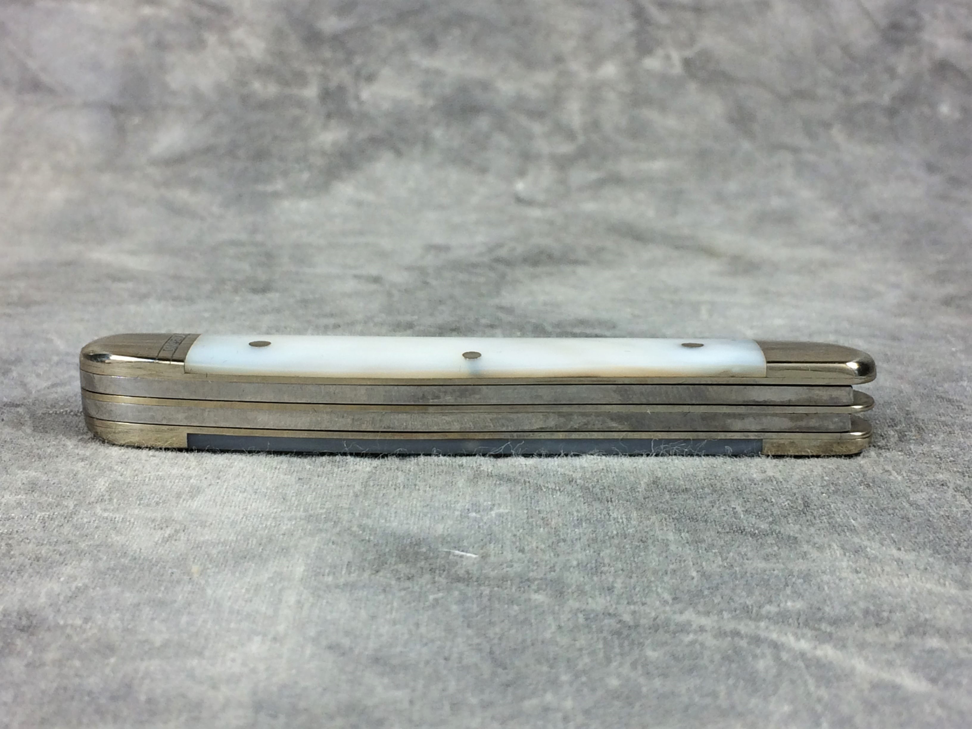 November 06, 2025 - 3-1/4 inches closed. 5-3/4 inches open. Made in USA. Long C script " x x x CASE XX   x*x* " (with lightning bolt S) and "USA 82087 SS" tang stamps. No shield. Stainless steel blades. Genuine mother of pearl handle. Nickel Silver bolsters and liner.