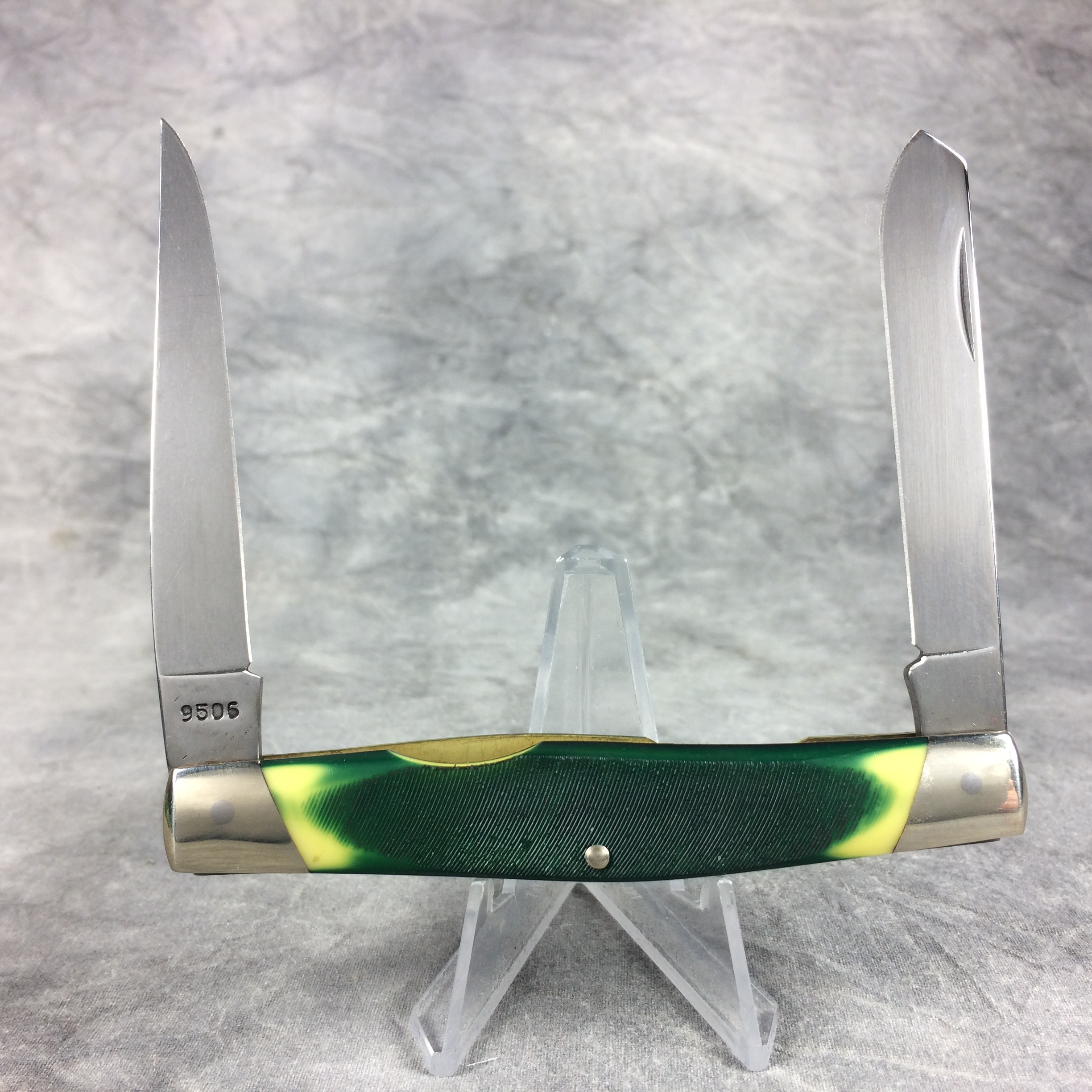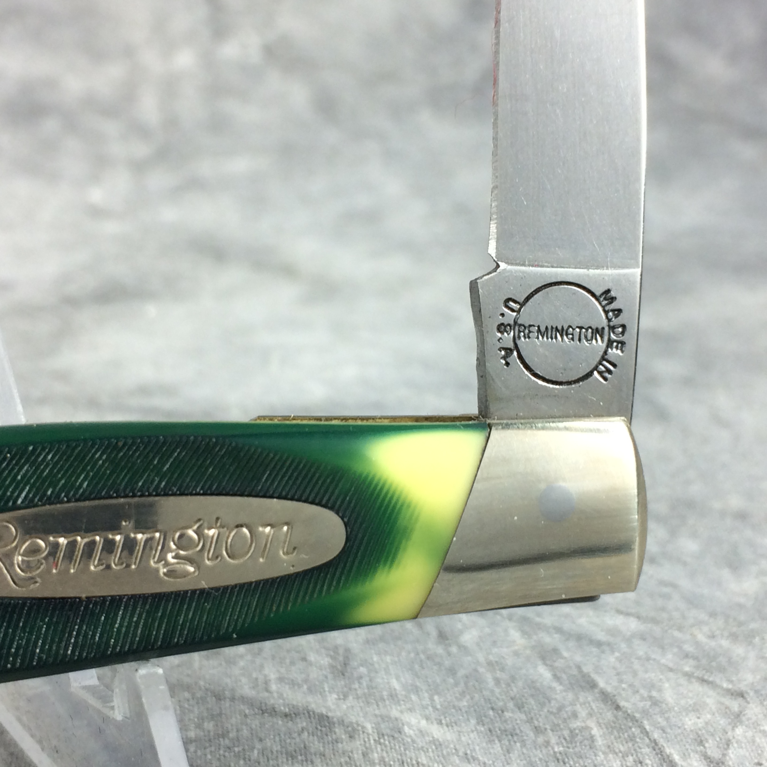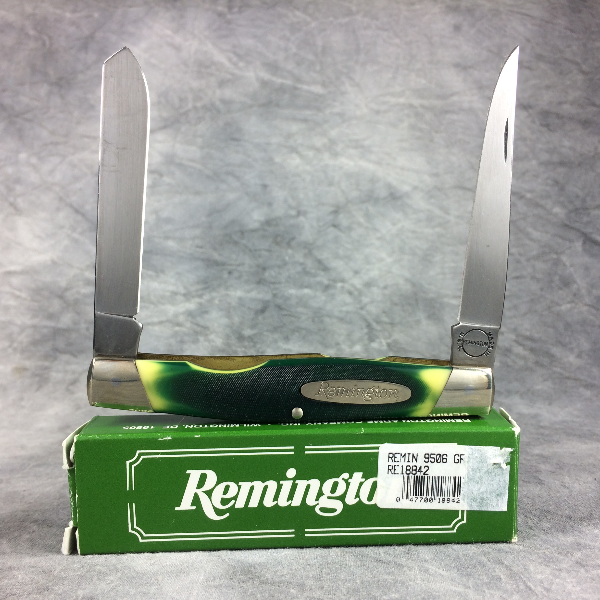 November 06, 2025 - 2-Blade Skinner Knife. 3-7/8 inches closed. 6-7/8 inches open. "REMINGTON (in circle) MADE IN USA (around circle)" and "9506" tang stamps. Oval "Remington" shield. High carbon steel blades. Yello and green sawcut delrin handle. Nickel silver bolsters and brass liners. With original box and paperwork.