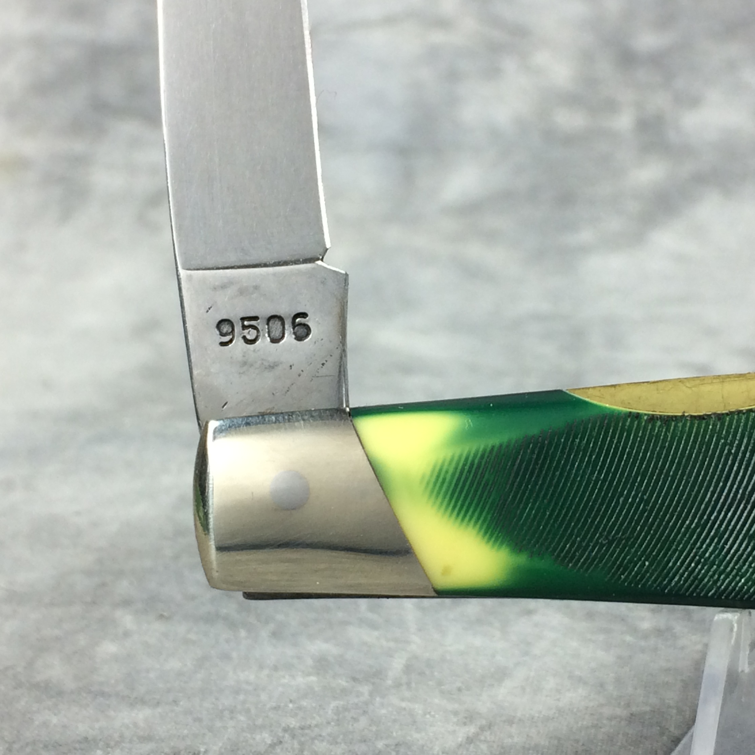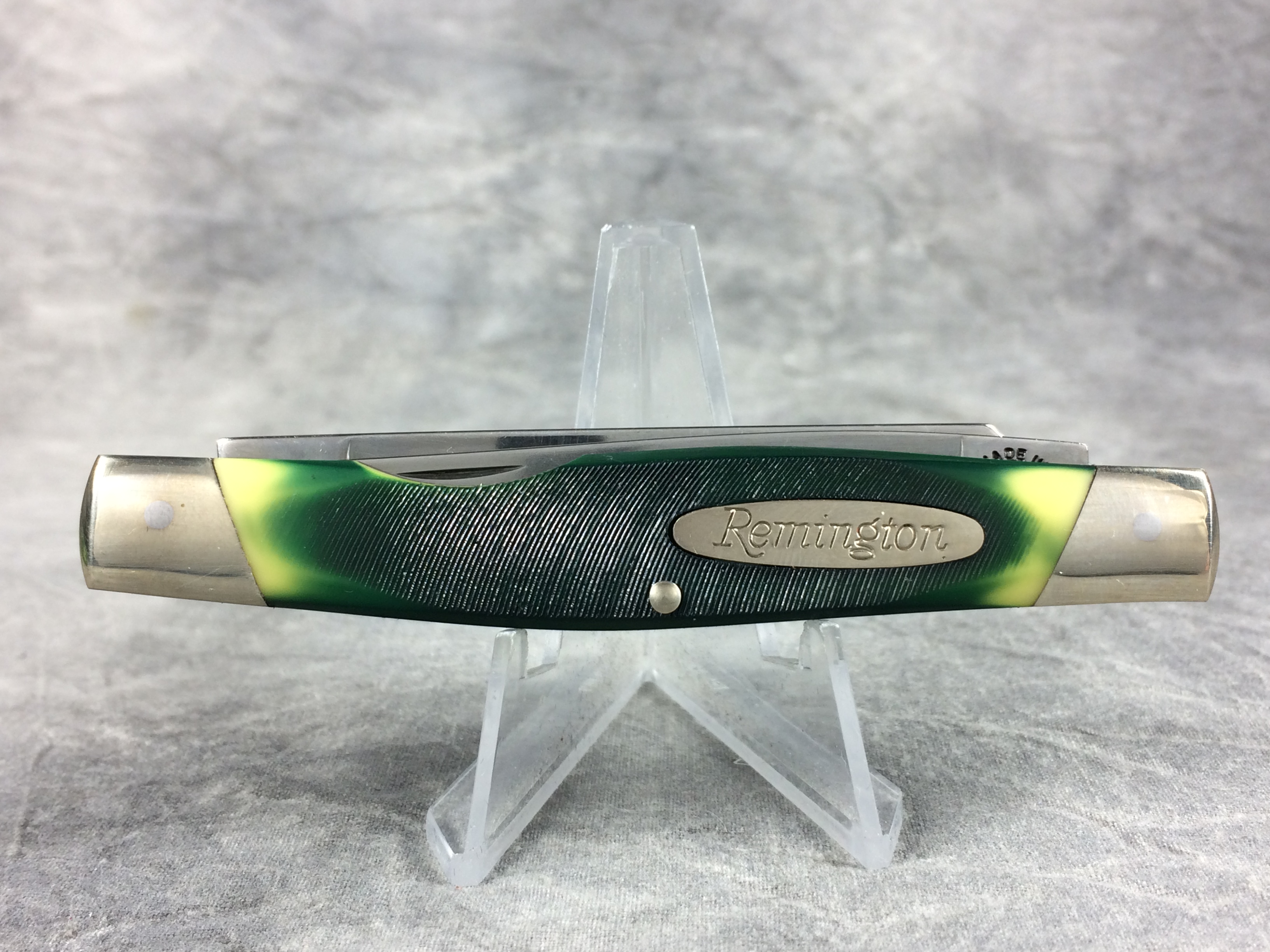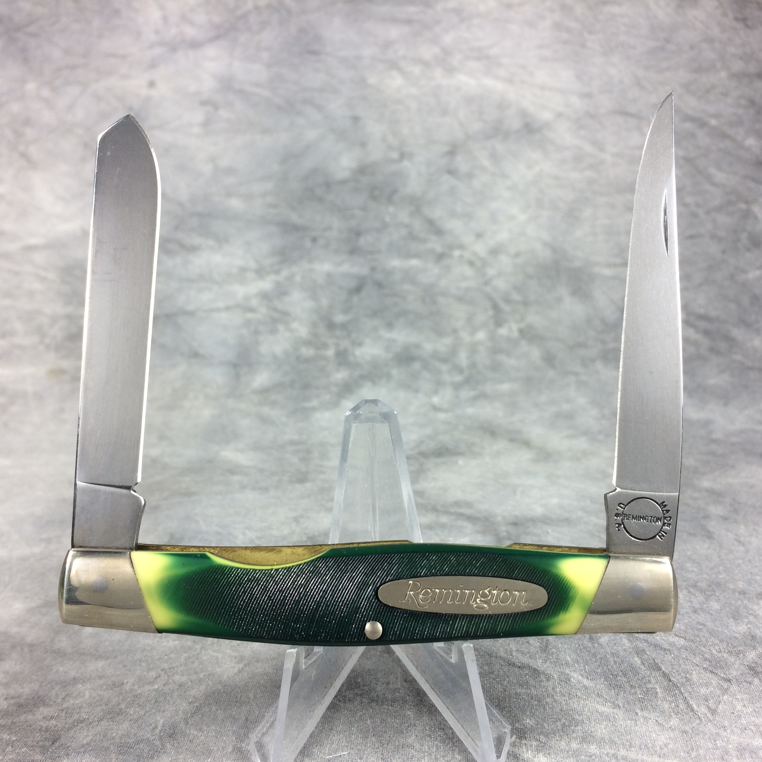 November 06, 2025 - 2-Blade Skinner Knife. 3-7/8 inches closed. 6-7/8 inches open. "REMINGTON (in circle) MADE IN USA (around circle)" and "9506" tang stamps. Oval "Remington" shield. High carbon steel blades. Yello and green sawcut delrin handle. Nickel silver bolsters and brass liners. With original box and paperwork.