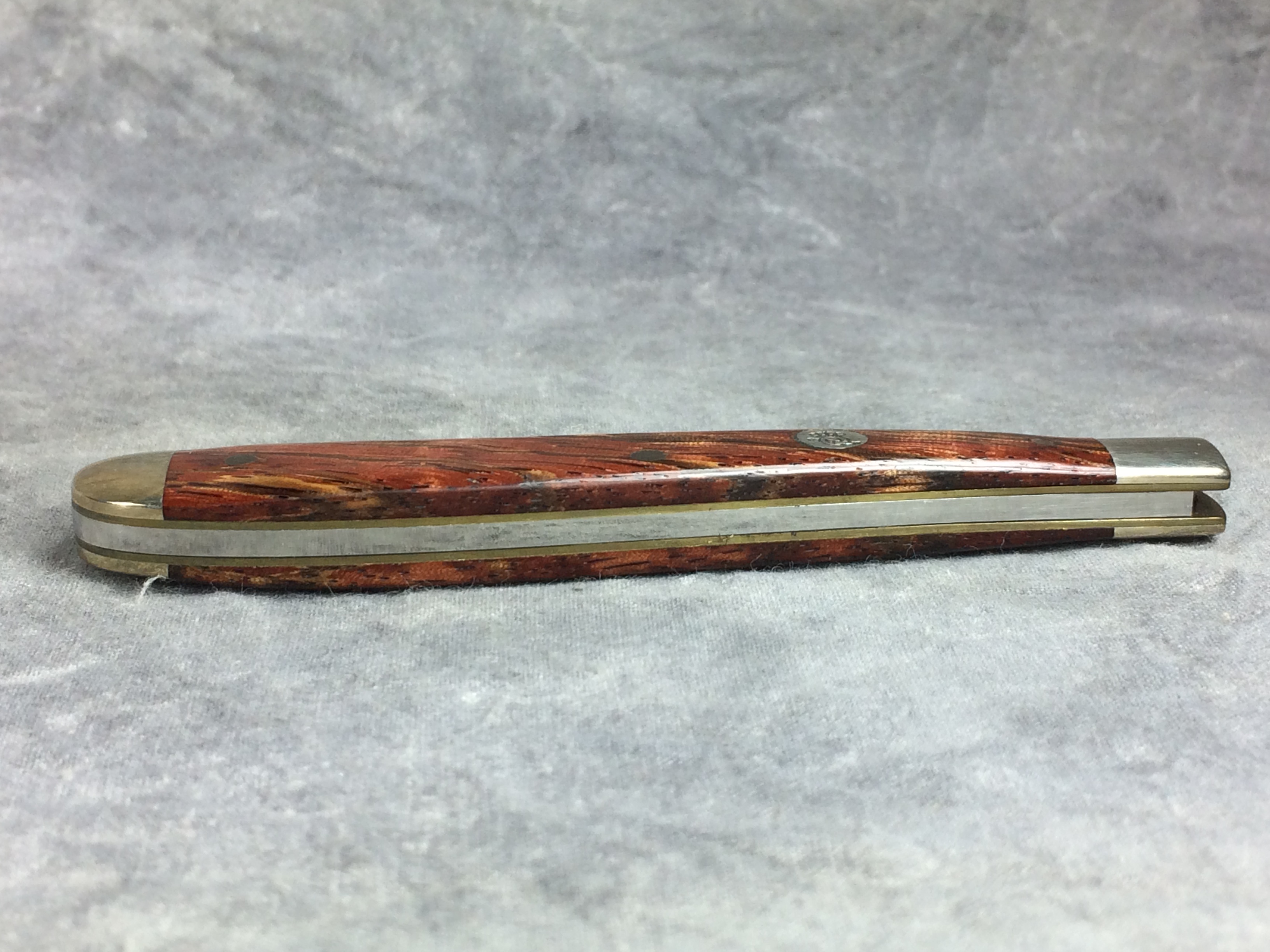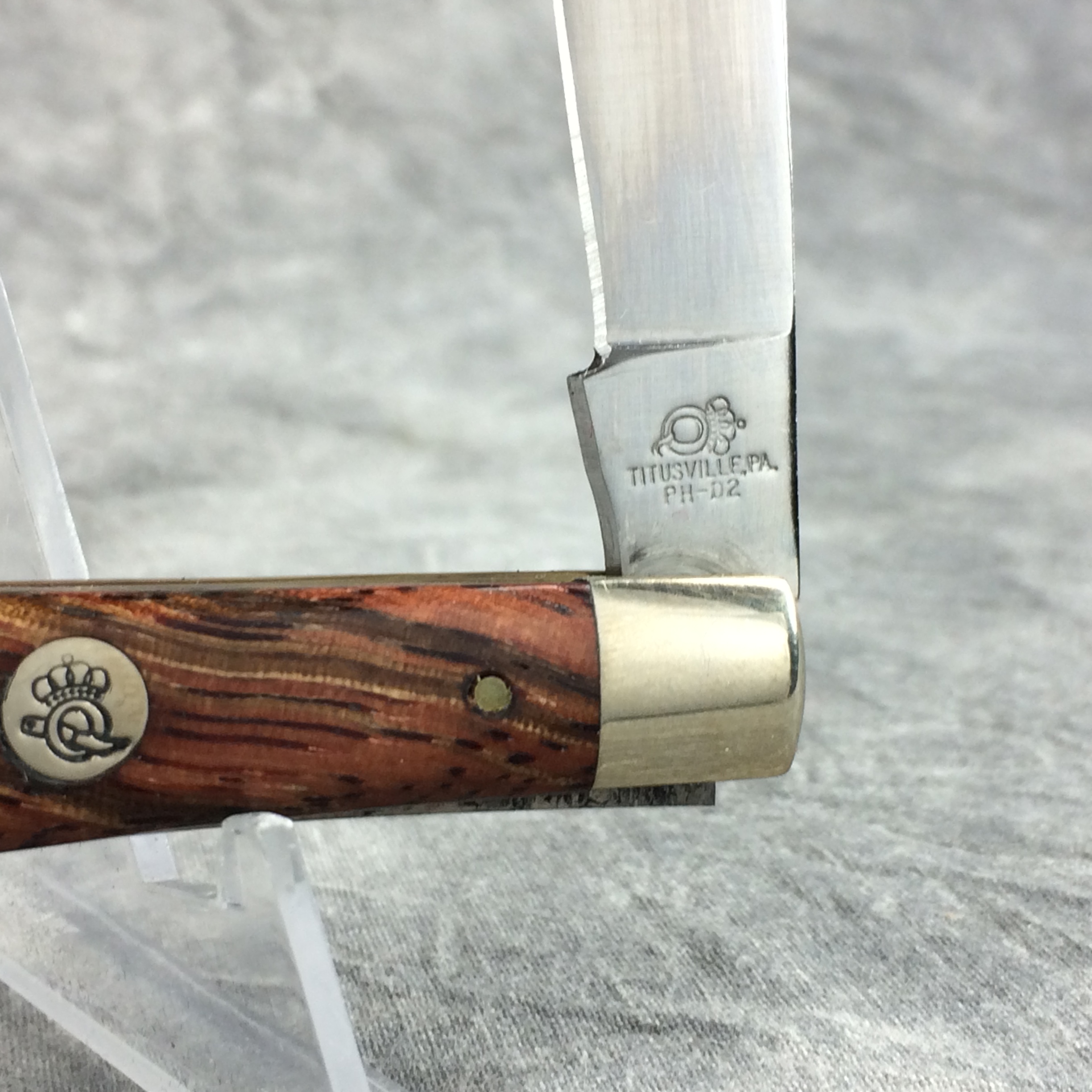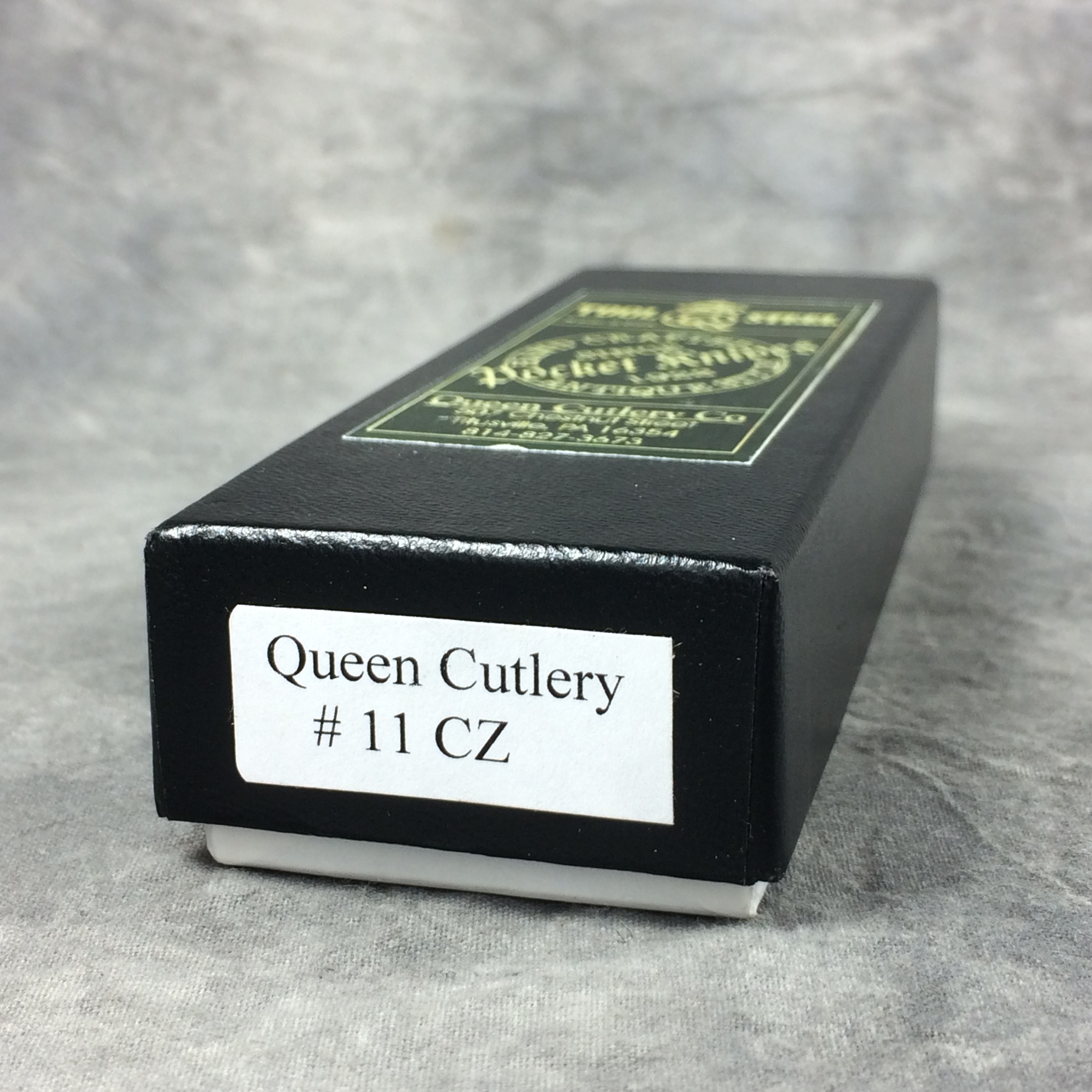November 03, 2025 - 4 inches closed. 7-3/8 inches open. Queen logo over "Titusville, PA PH-D2" tang stamp. D2 Steel blade stamped "Queen Cutlery Co #11 Tool Steel". Beautiful curly maple handle. Circle shield with Queen logo. Nickel Silver bolsters. Brass liner. With original box.