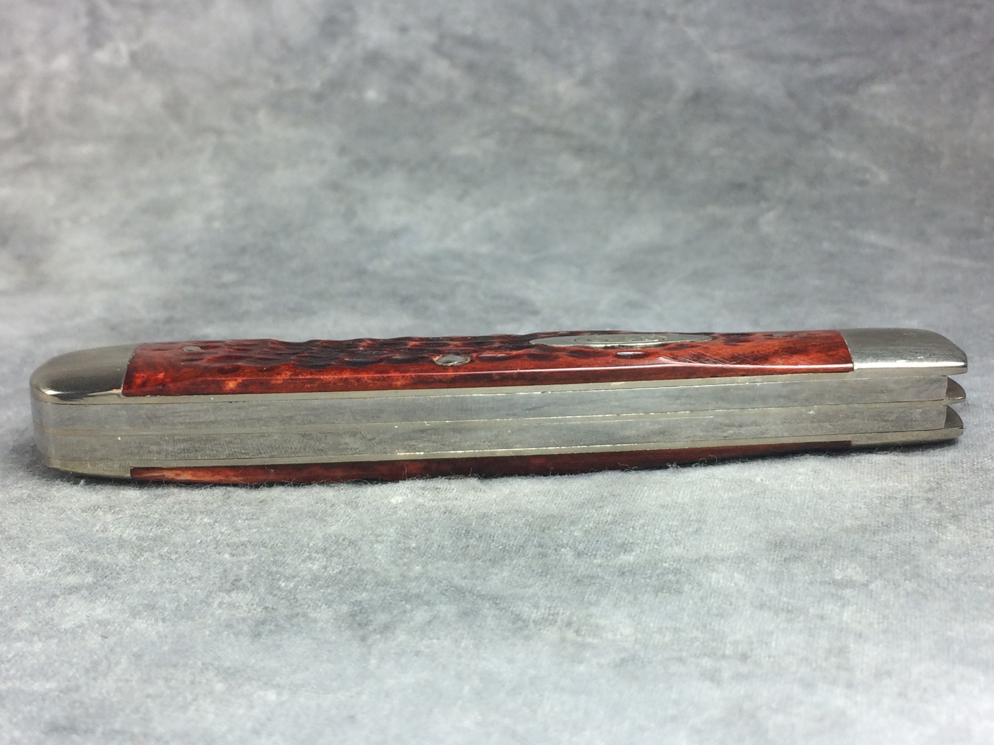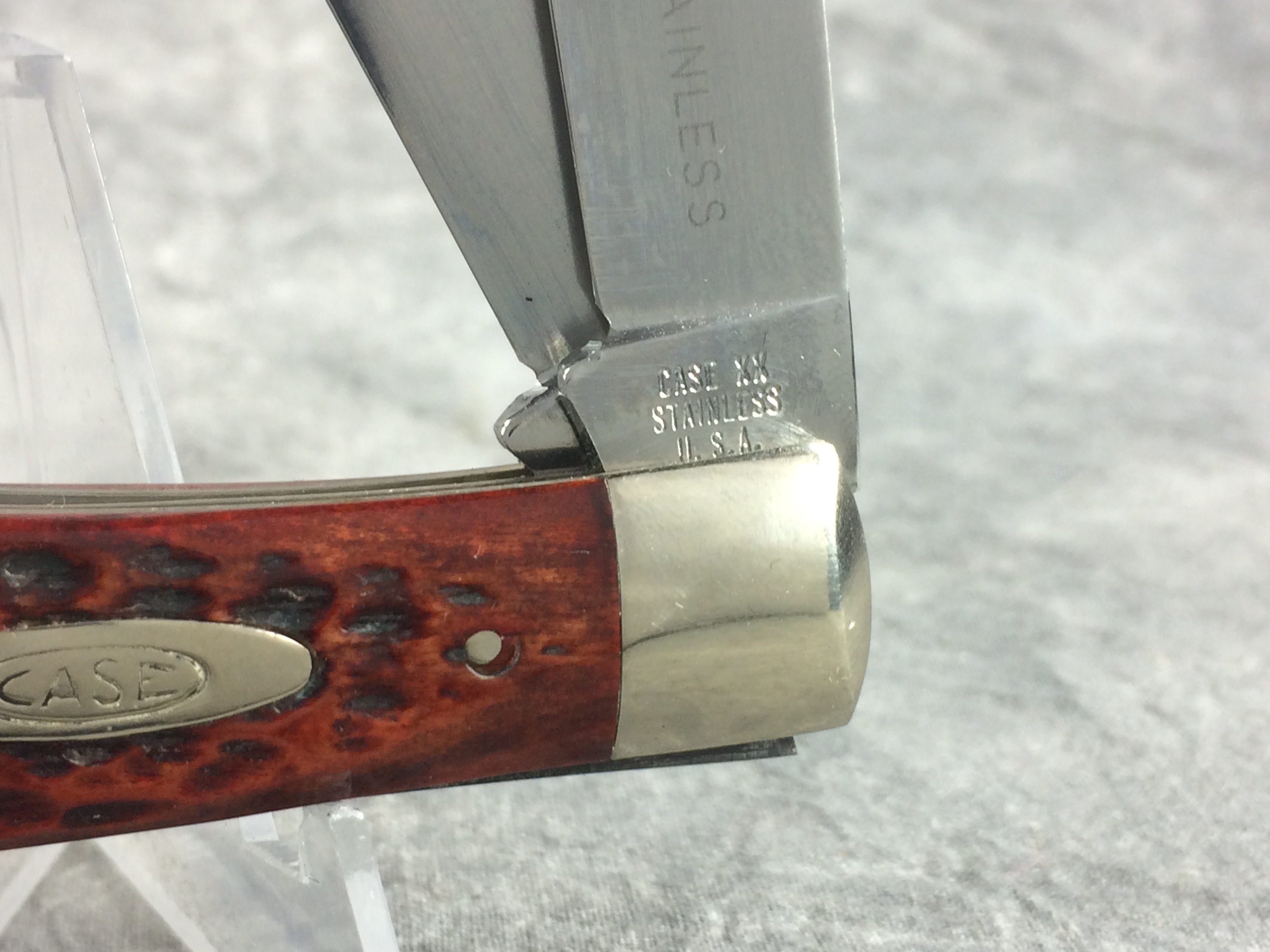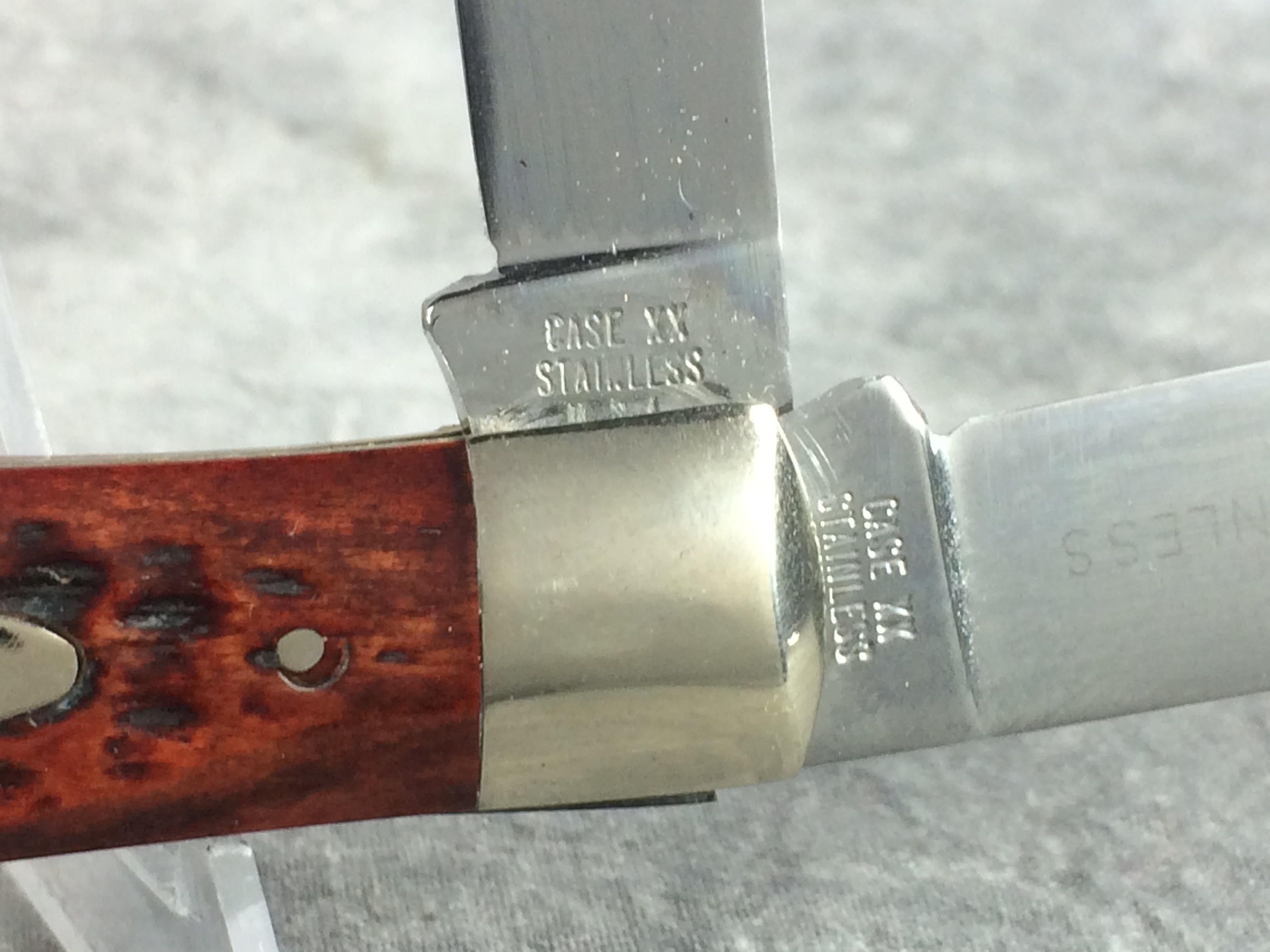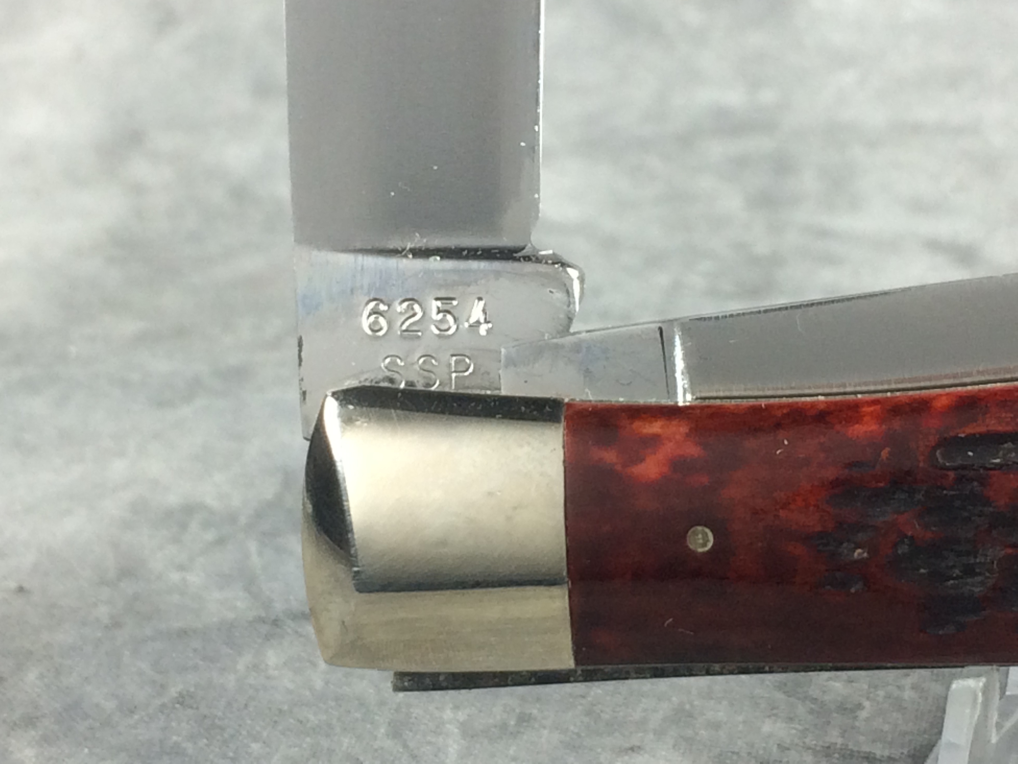 April 24, 2026 - 4-1/8 inches closed. 7-3/8 inches open. Made in USA. "CASE XX STAINLESS U.S.A." (on both blades) and "6254 SSP" tang stamps. Double oval open-C "CASE" shield. Satin finish stainless steel blades. Master blade stamped "TESTED XX STAINLESS". Red/brown jigged bone handle. Nickel Silver bolsters. Brass liner.