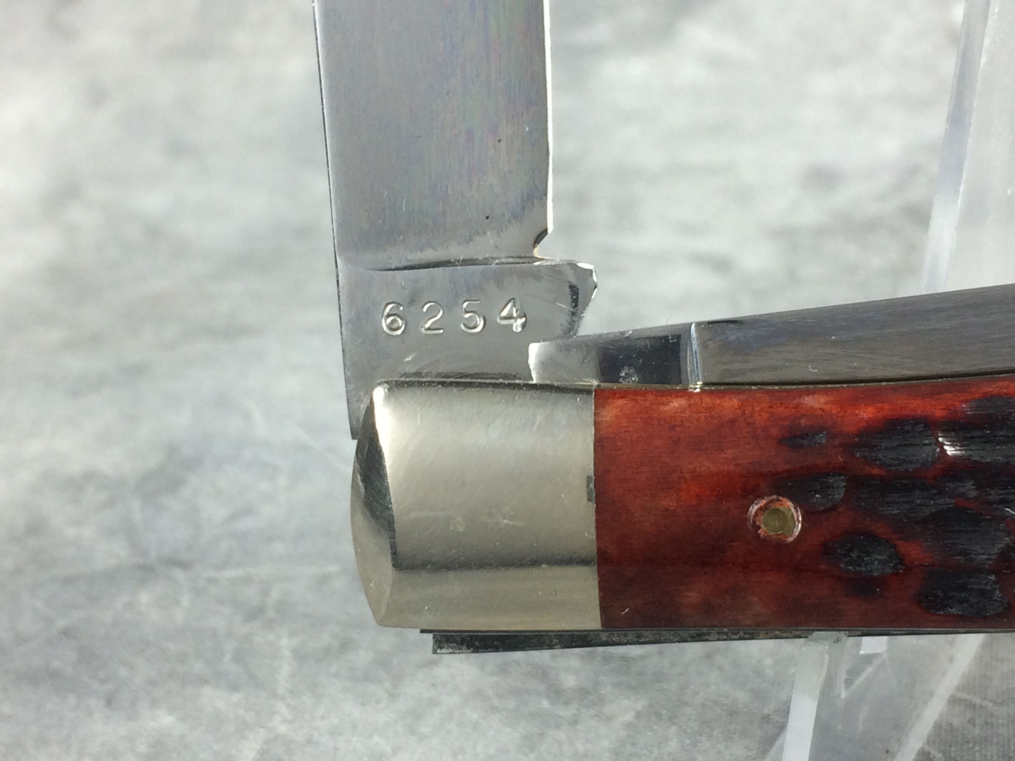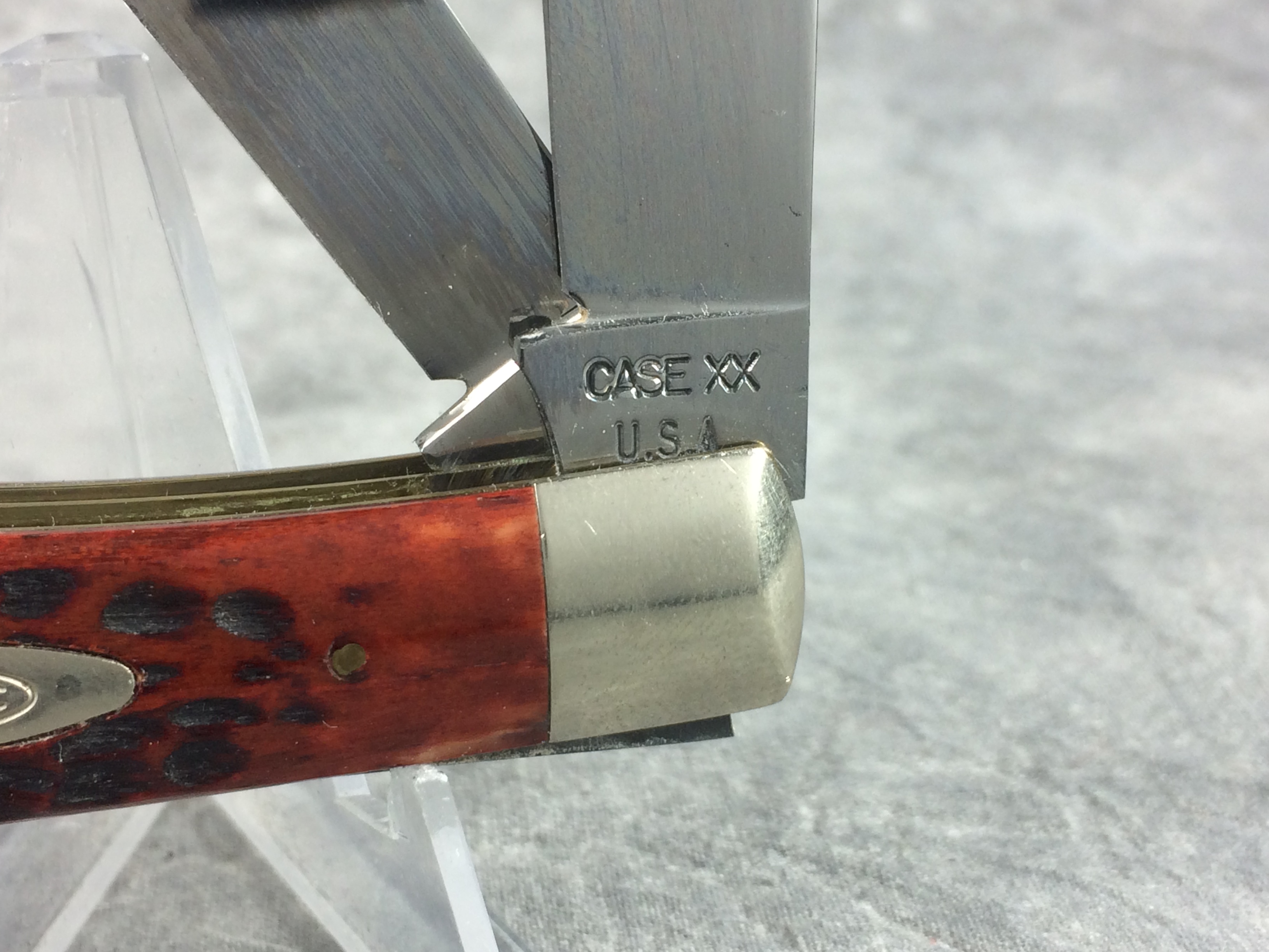 December 22, 2025 - 4-1/8 inches closed. 7-3/8 inches open. Made in USA. "CASE XX U.S.A." (10 dot - not all dots are visible, but based on position, there appear to be 10 dots) and "6254" tang stamps. Double oval open-C "CASE" shield. Mirror finish chrome vanadium blades. Red/brown jigged bone handle. Nickel Silver bolsters. Brass liner.