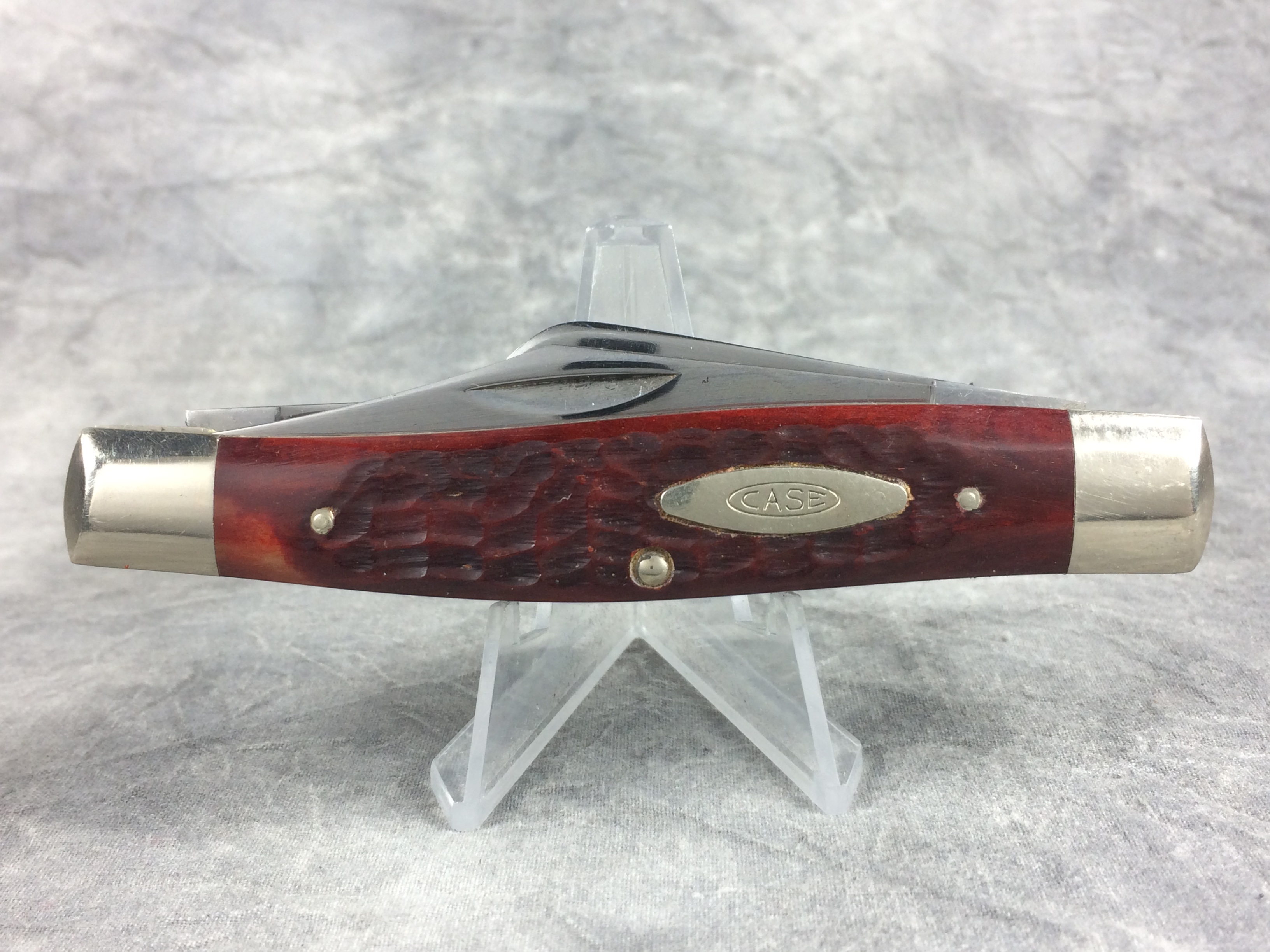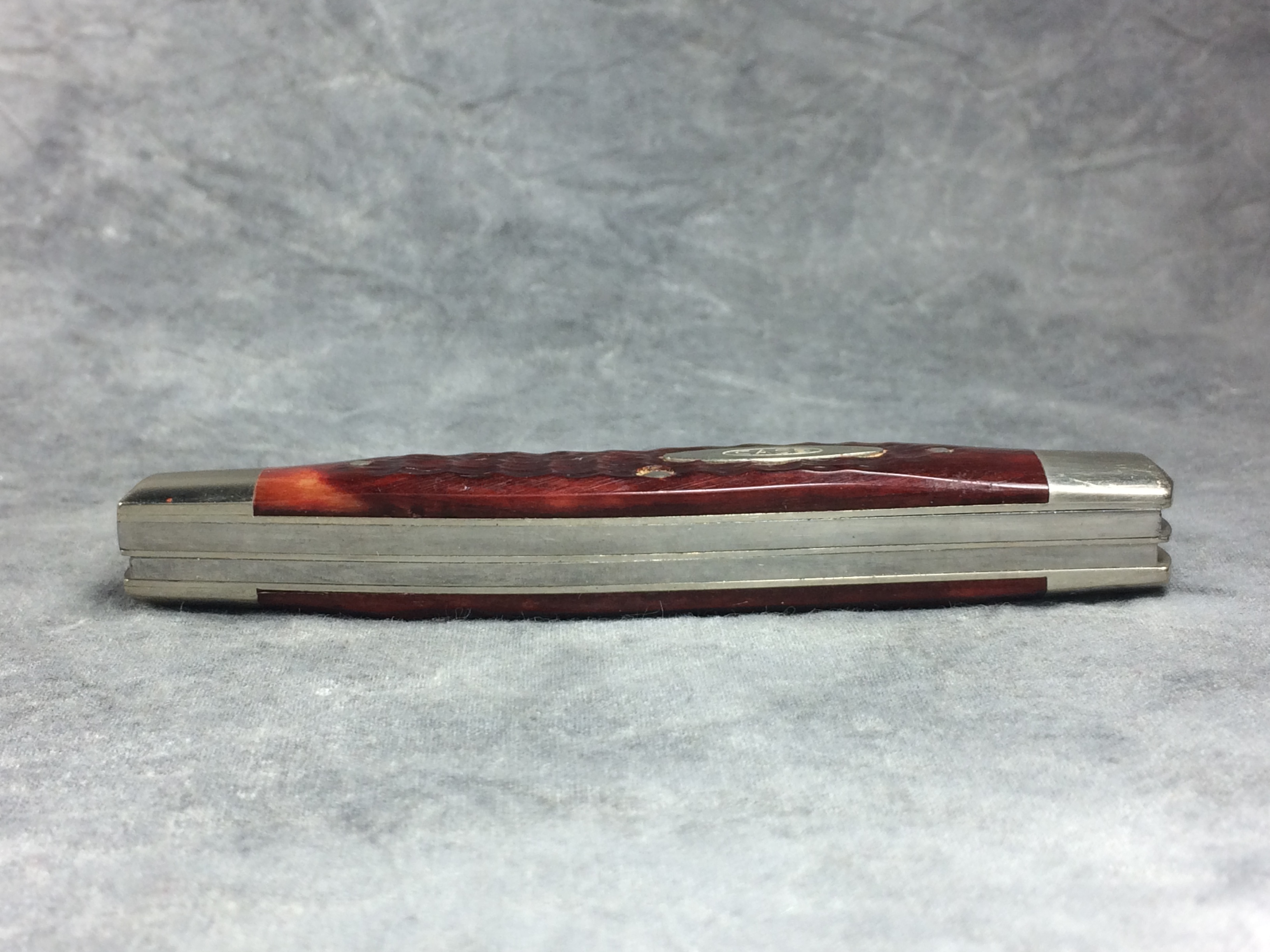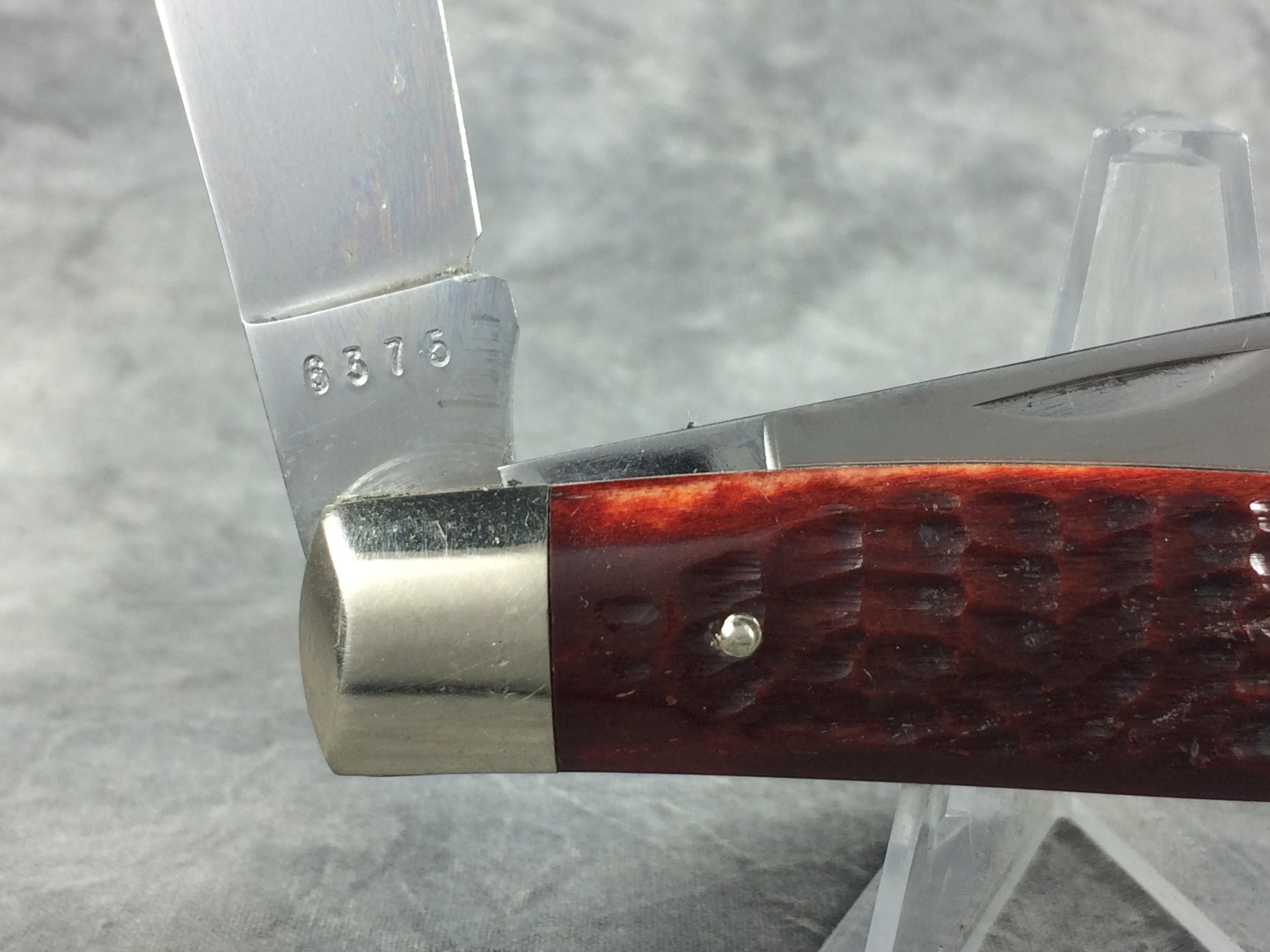 November 03, 2025 - 4-1/4 inches closed. 7-1/2 inches open. Made in USA. "Case XX U.S.A. ****** " (6 dot) and "6375" tang stamps. Double oval 'Open C' CASE shield. Chrome vanadium blades. Brown/Red Jigged Bone handle. Nickel Silver bolsters and liner.