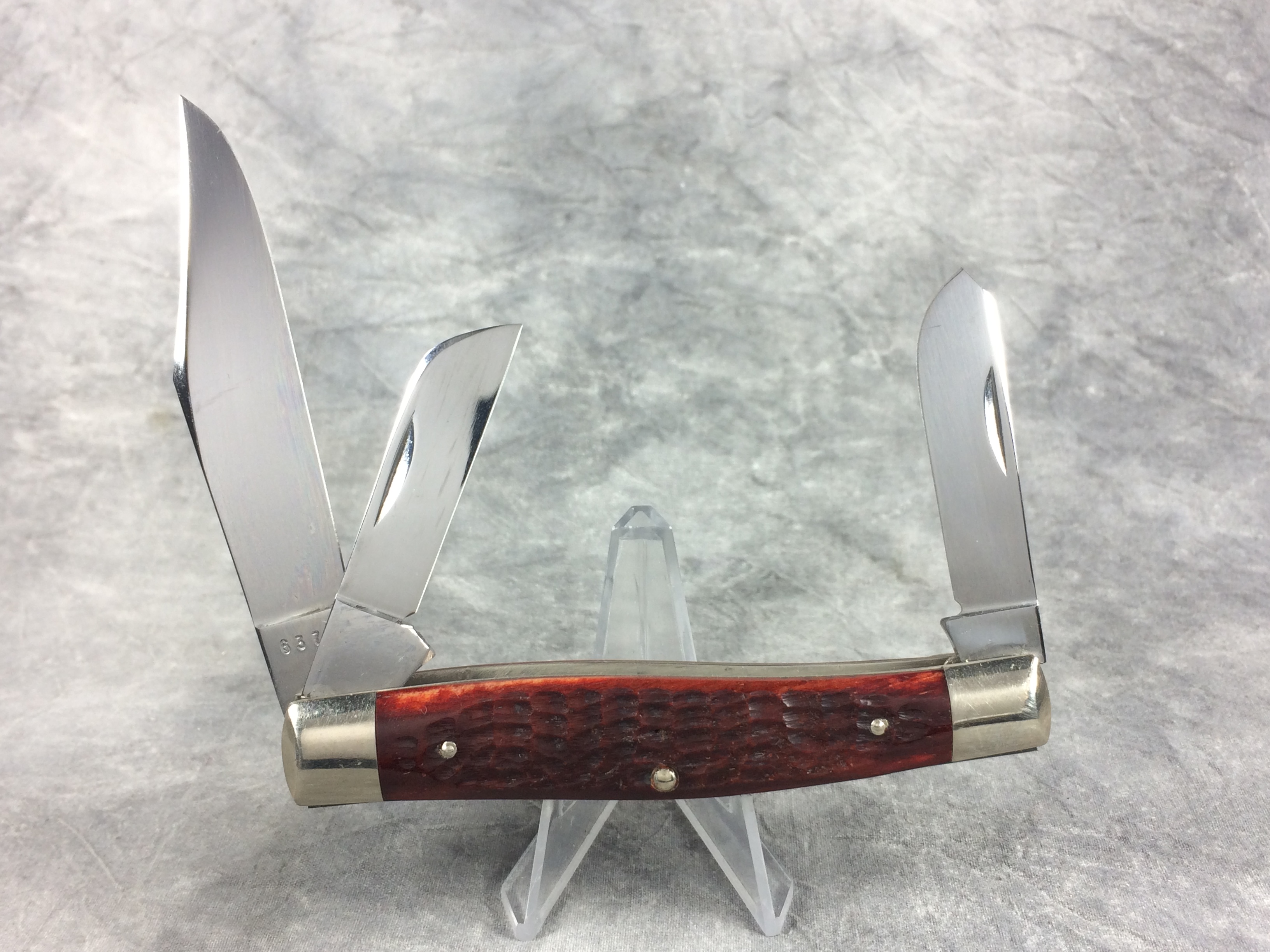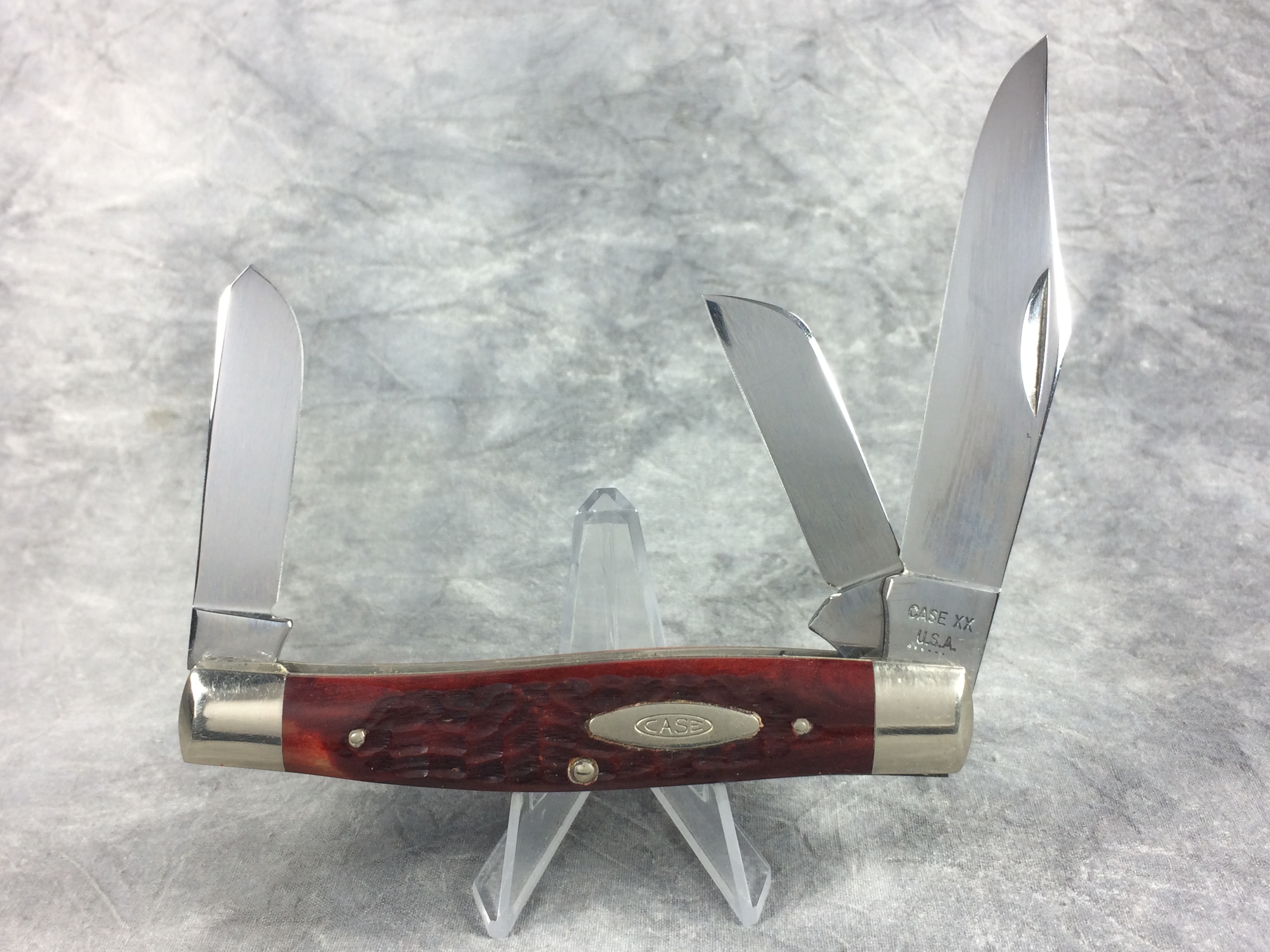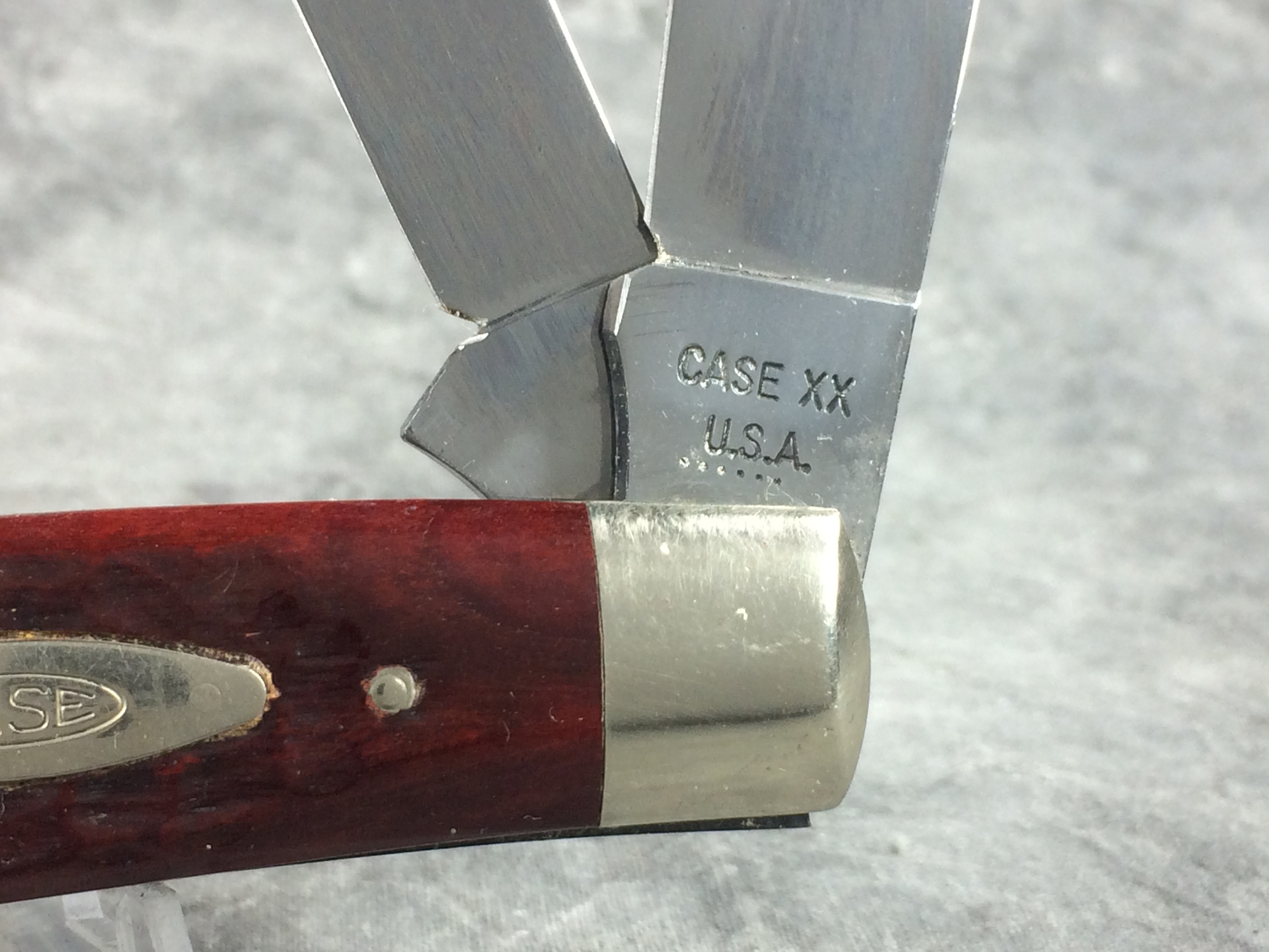 November 03, 2025 - 4-1/4 inches closed. 7-1/2 inches open. Made in USA. "Case XX U.S.A. ****** " (6 dot) and "6375" tang stamps. Double oval 'Open C' CASE shield. Chrome vanadium blades. Brown/Red Jigged Bone handle. Nickel Silver bolsters and liner.