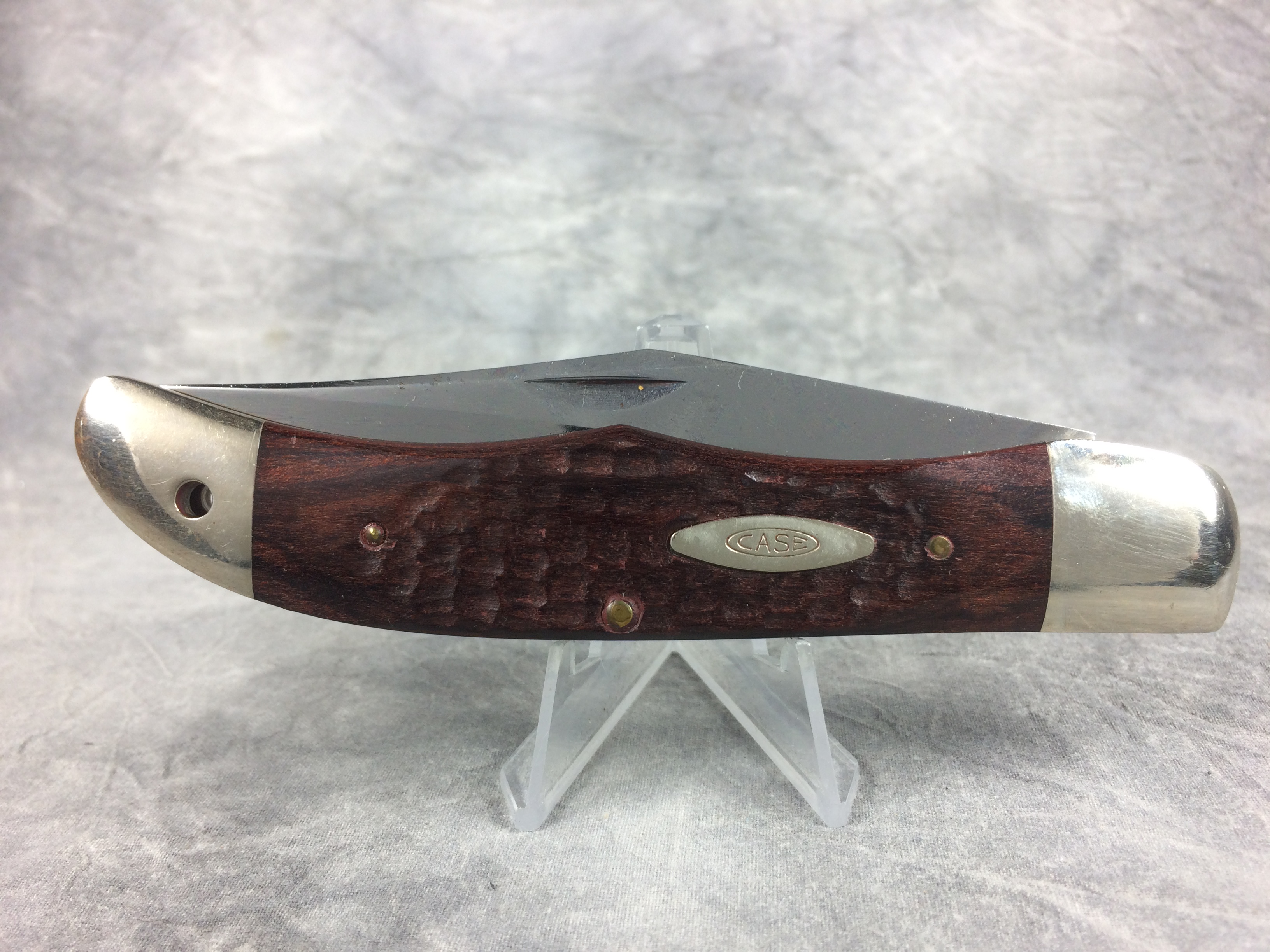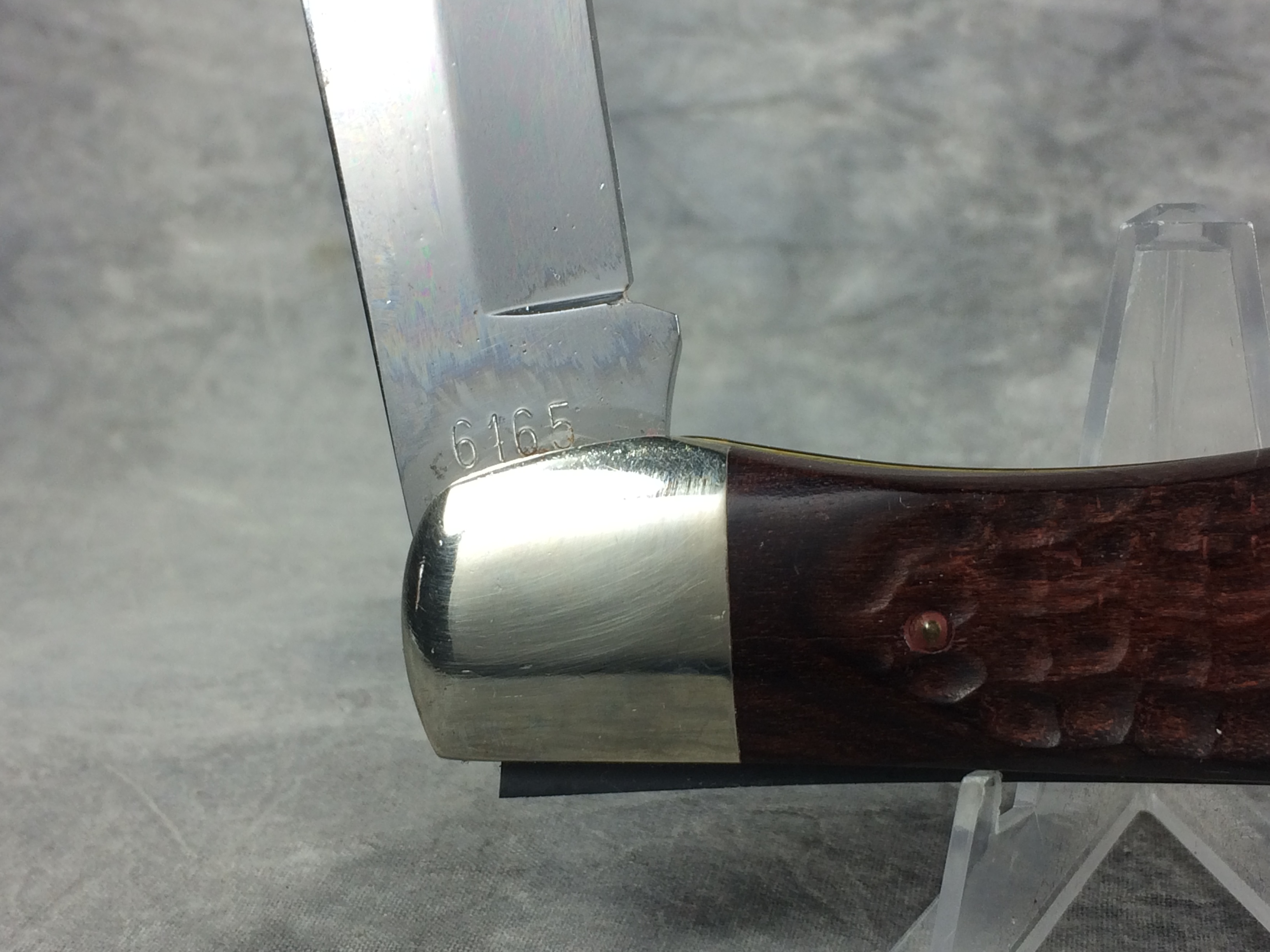 January 08, 2026 - 5-1/4 inches closed. 9-1/4 inches open. Made in USA. "CASE XX ********** " (10 dot) and "6165" tang stamps. Double Oval 'Open C' CASE shield. Chrome Vanadium blade. Brown Jigged pakkawood handle. Nickel Silver bolsters. Brass liner.