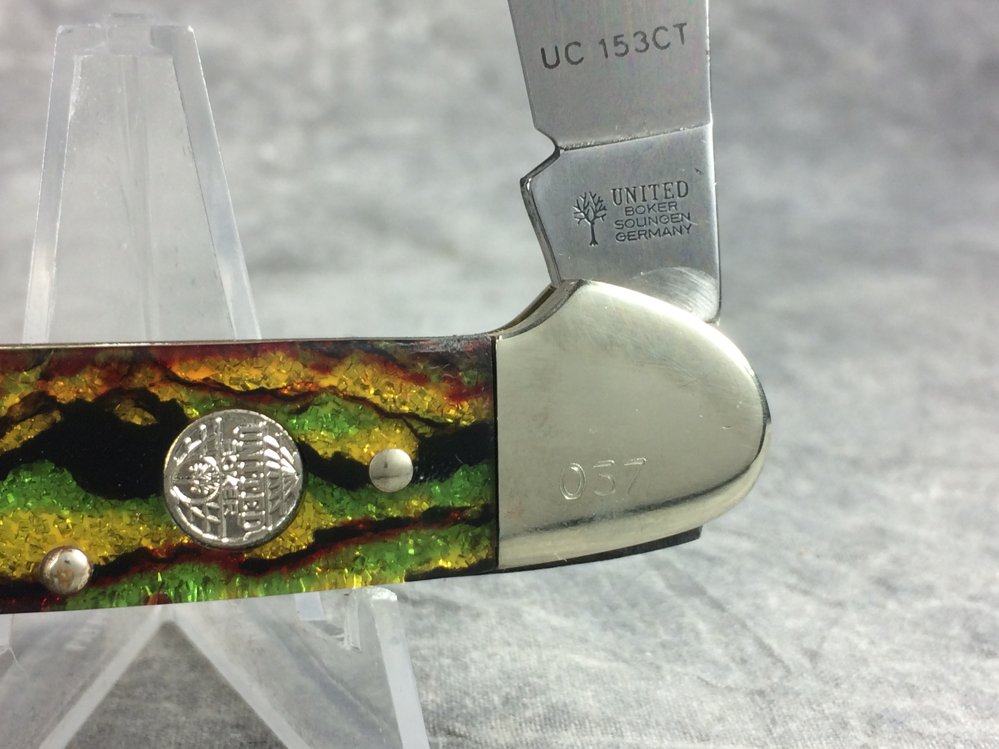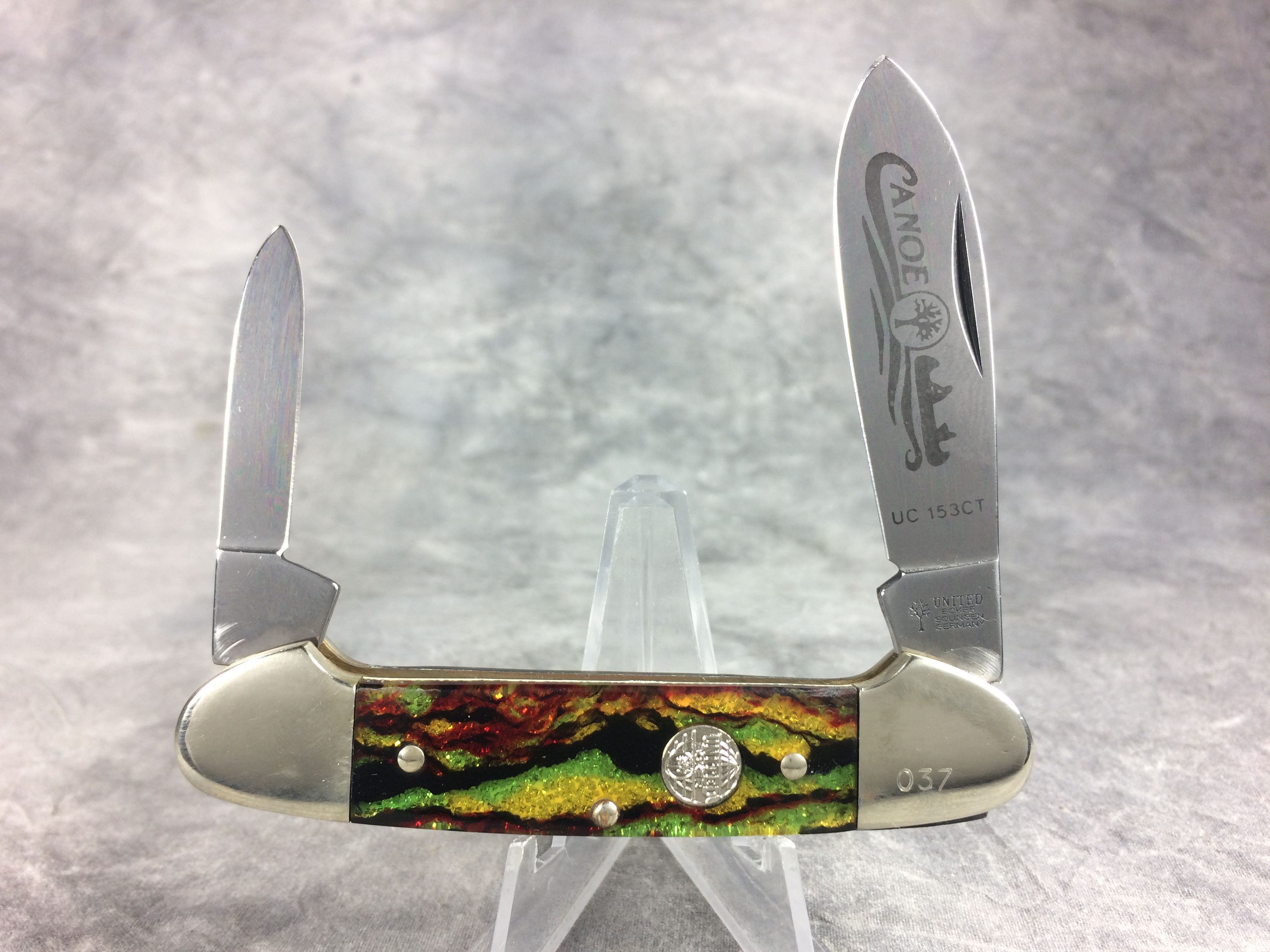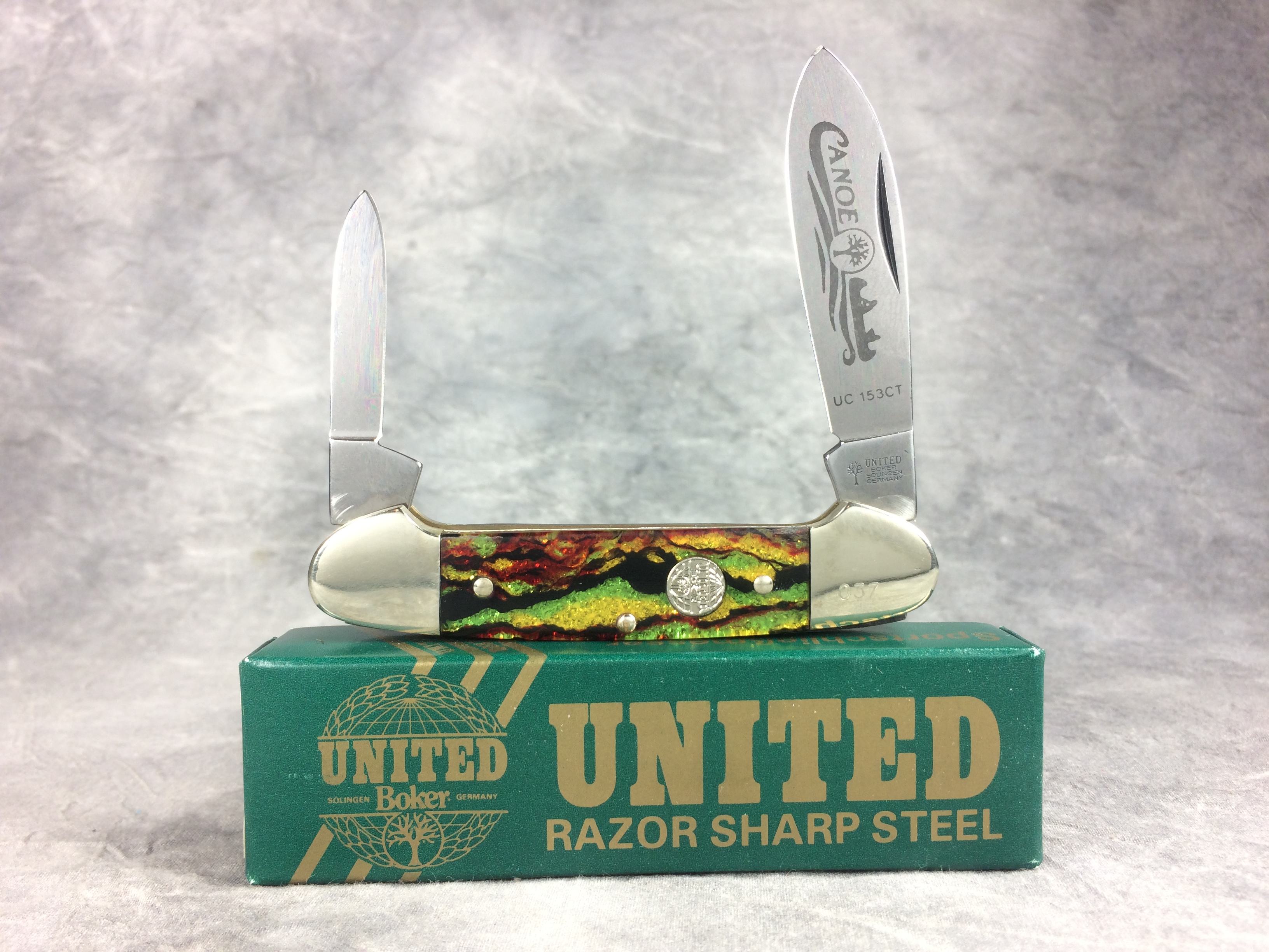 November 03, 2025 - 3-5/8 inches closed. 6-1/8 inches open. "UNITED BOKER SOLINGEN GERMANY" with tree logo" tang stamp. Circle "UNITED BOKER" shield. Stainless steel blades. Master blade etched "Canoe" and "UC153CT". Christmas tree celluloid handles. Nickel Silver bolsters. Front right bolster etched with serial #037. Brass liner. With original box.