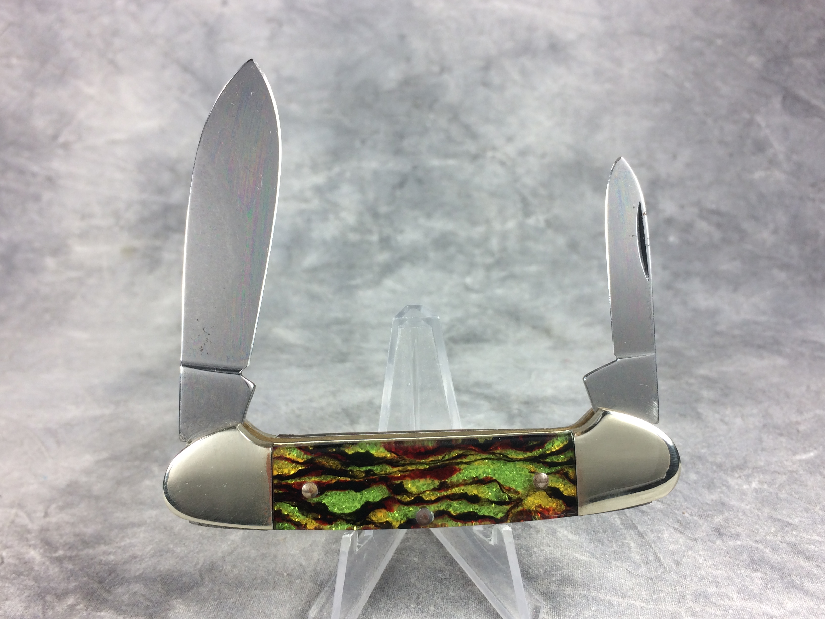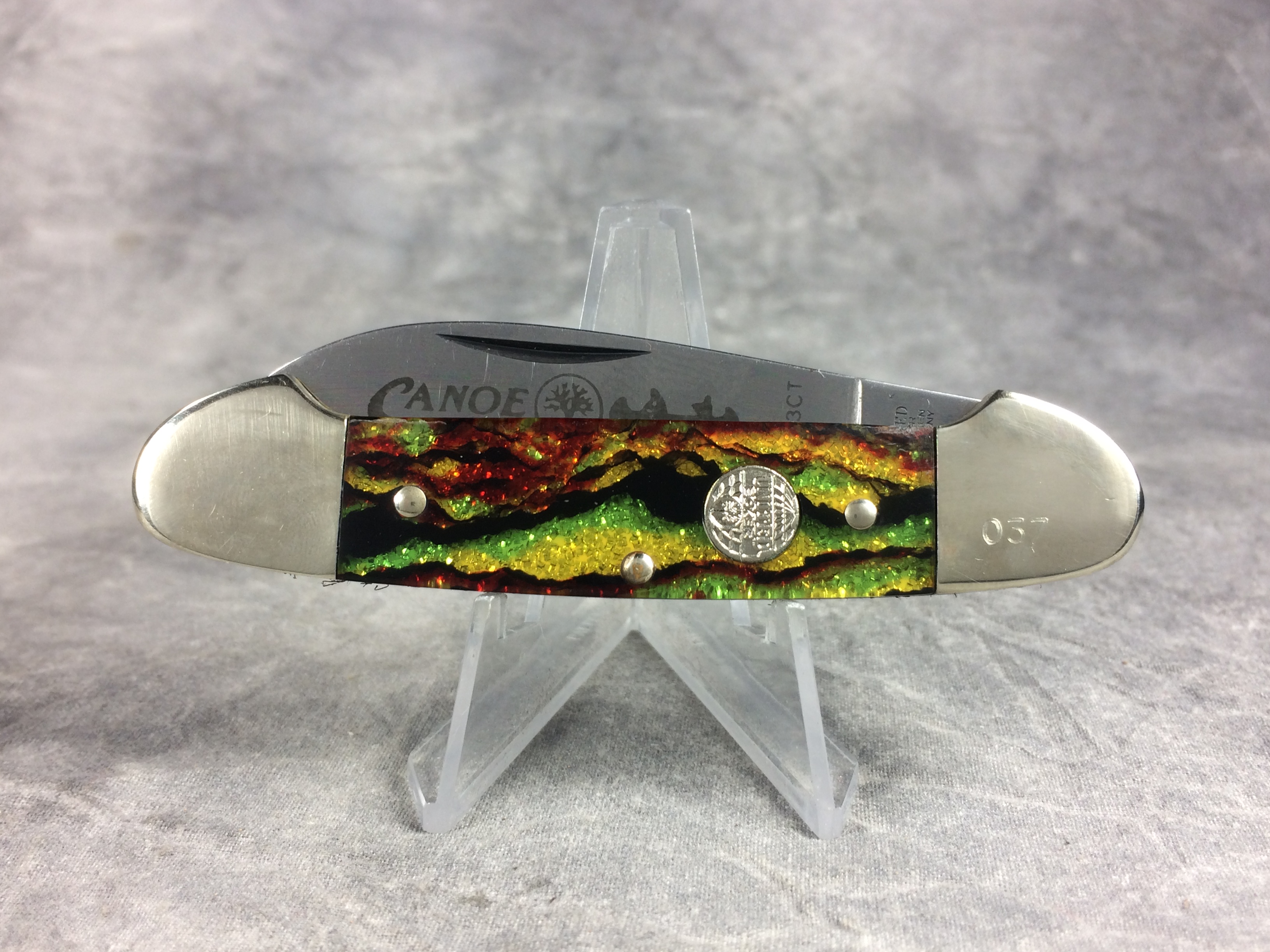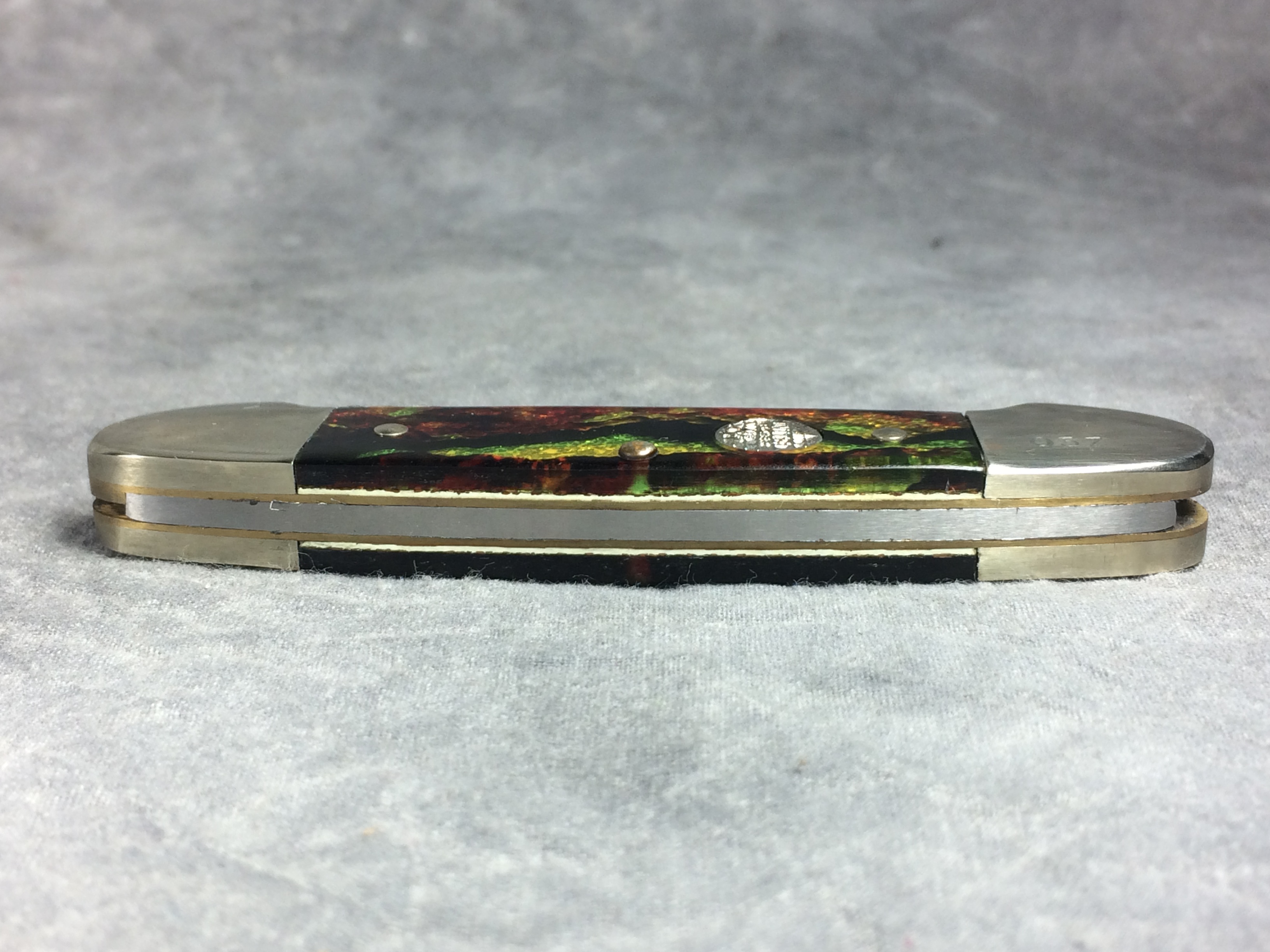 November 03, 2025 - 3-5/8 inches closed. 6-1/8 inches open. "UNITED BOKER SOLINGEN GERMANY" with tree logo" tang stamp. Circle "UNITED BOKER" shield. Stainless steel blades. Master blade etched "Canoe" and "UC153CT". Christmas tree celluloid handles. Nickel Silver bolsters. Front right bolster etched with serial #037. Brass liner. With original box.