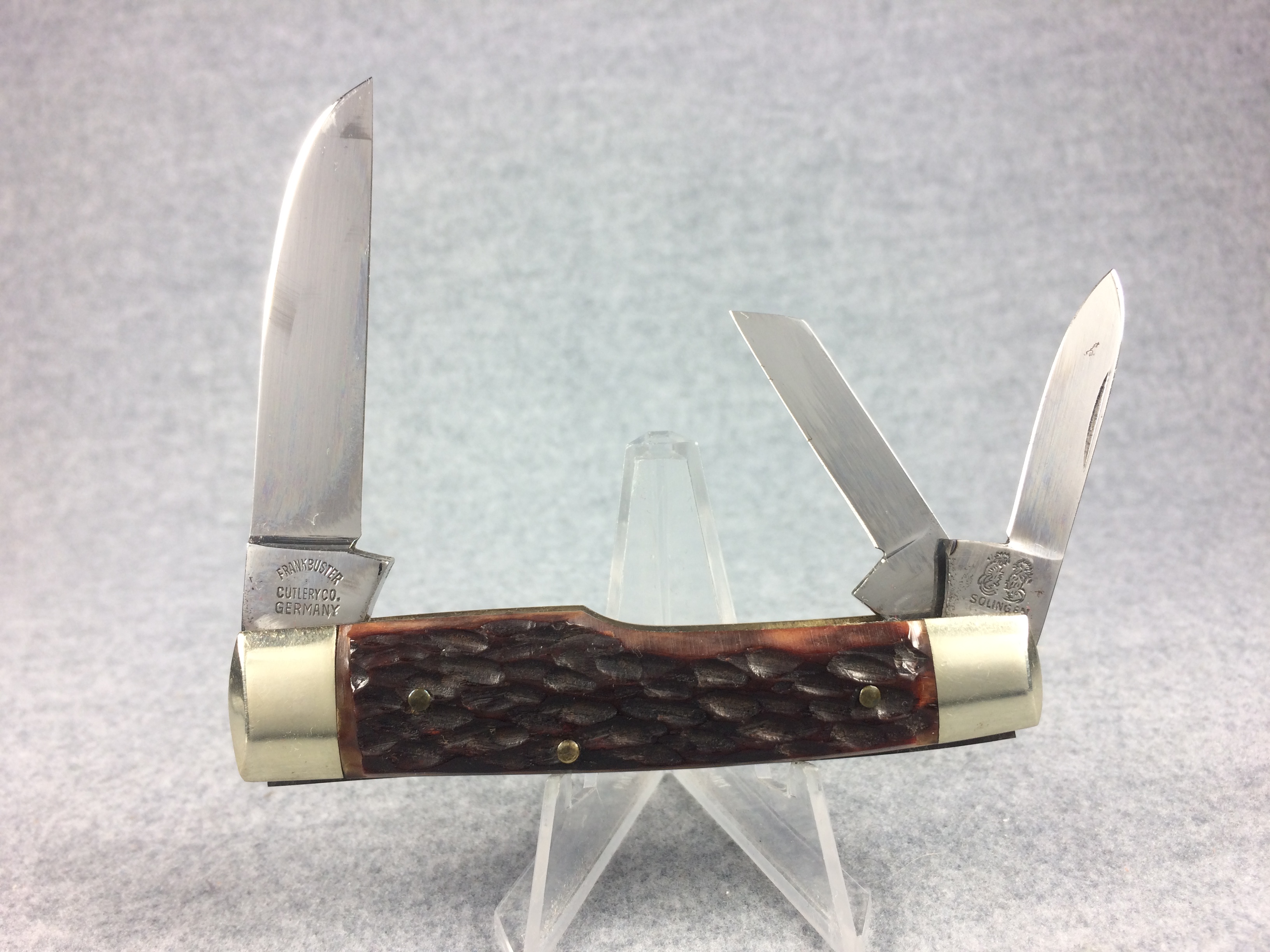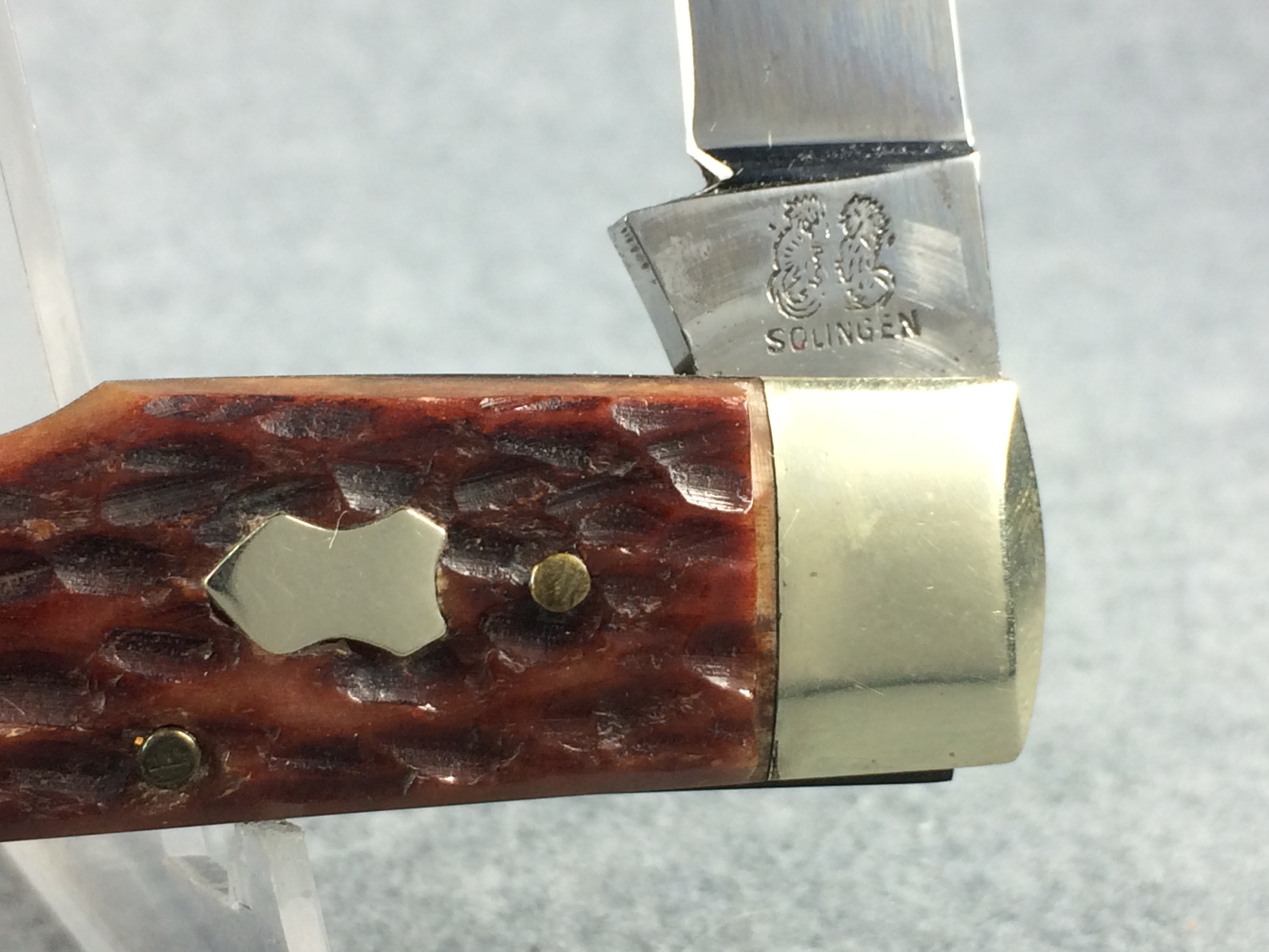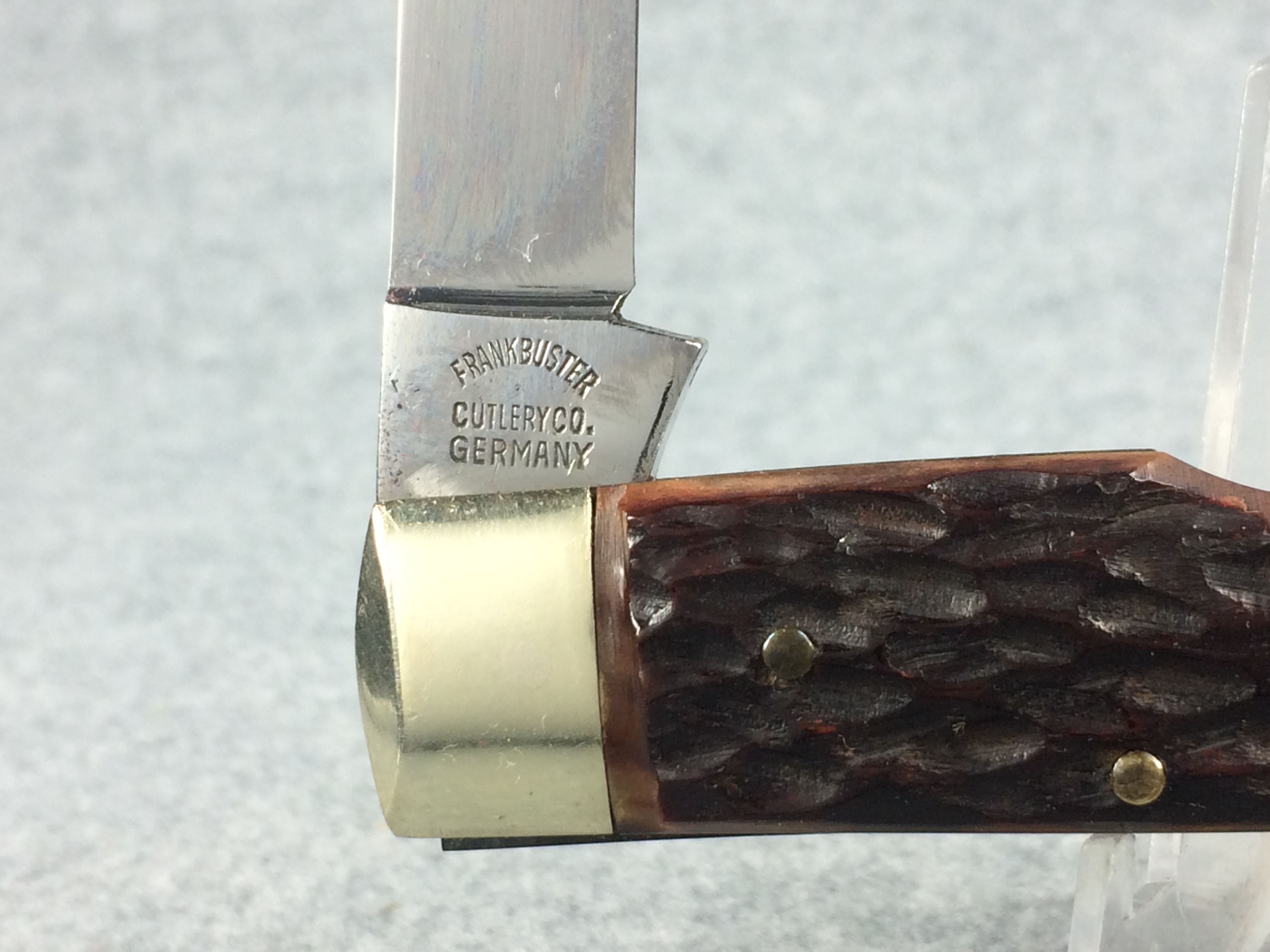 November 06, 2025 - 3-1/2 inches closed. 6 inches open. Made in Germany. Fight'n Rooster logo with "SOLINGEN" and "FRANK BUSTER CUTLERY CO. GERMANY" tang stamps. Master blade etched "FIGHT'N ROOSTER" with logo. Brown jigged bone handle. Nickel Silver bolsters. Brass liner.