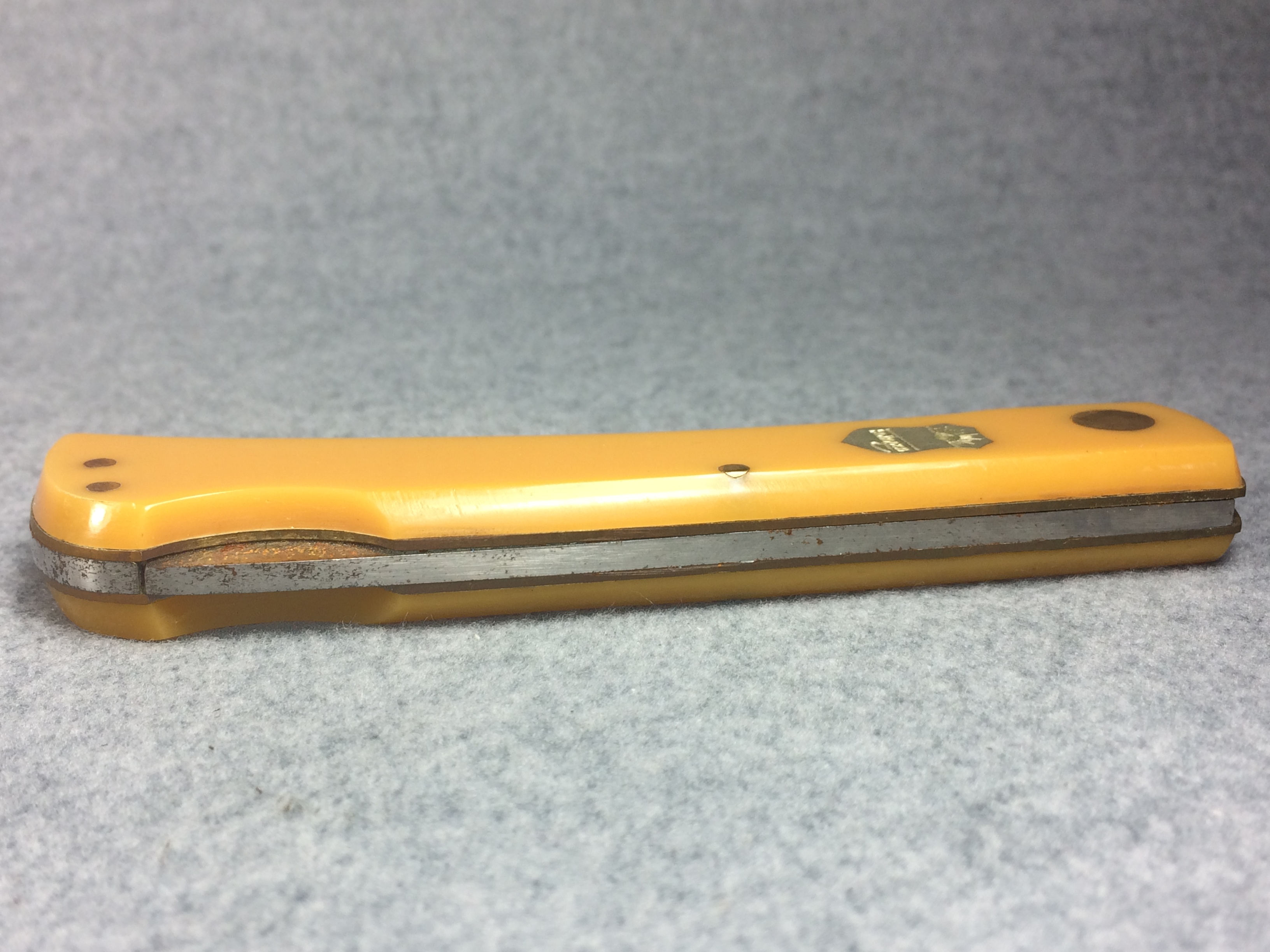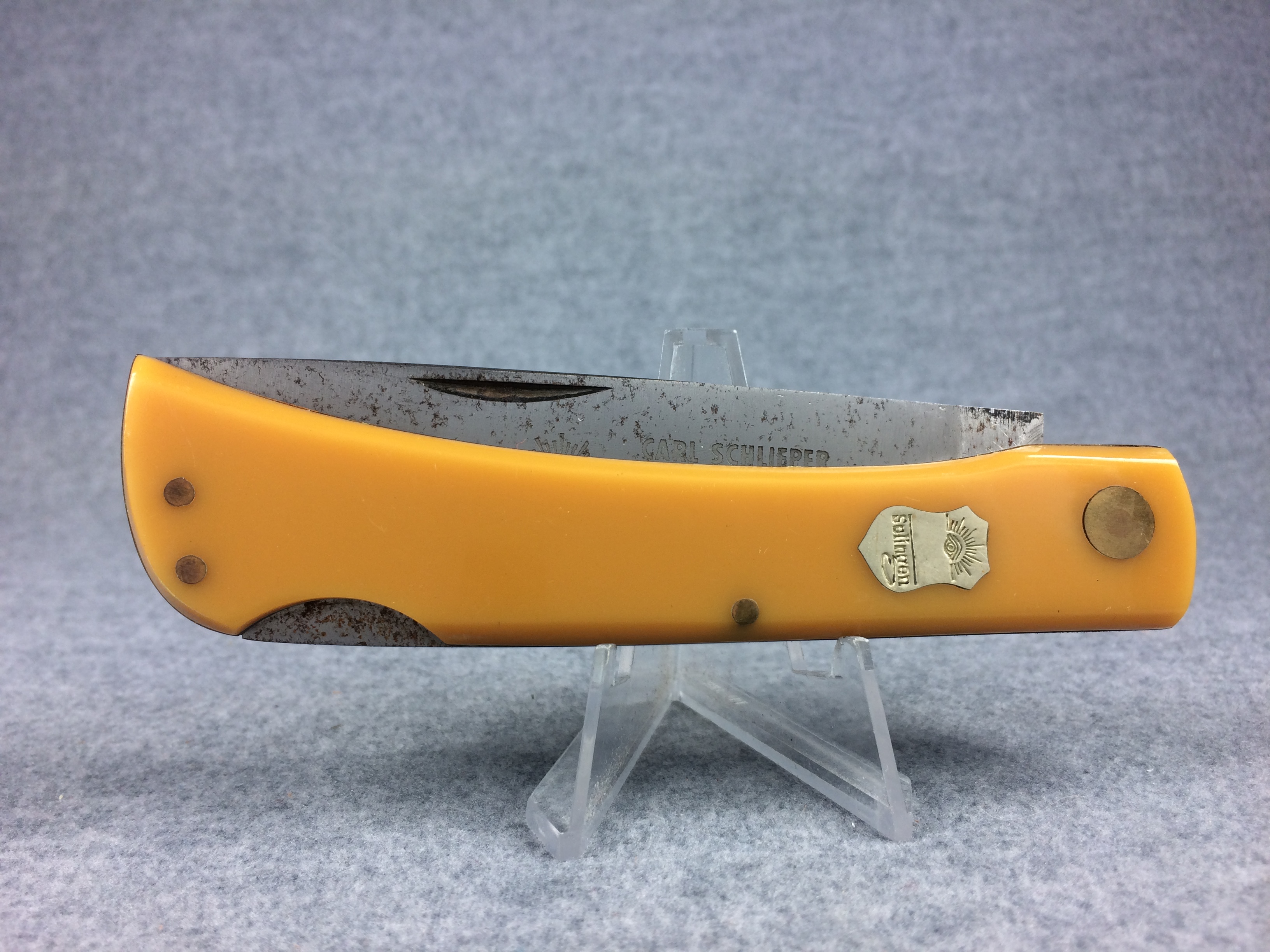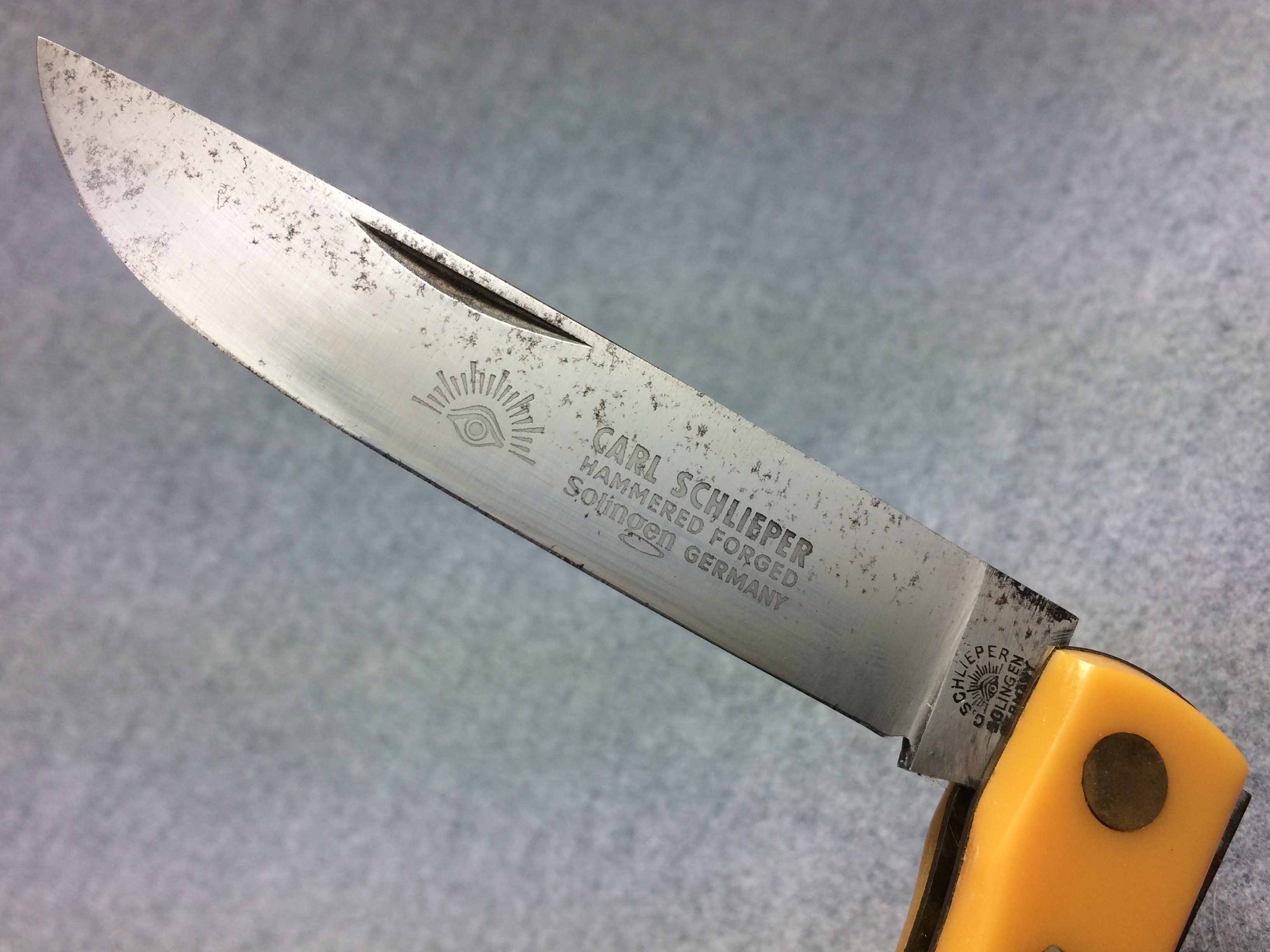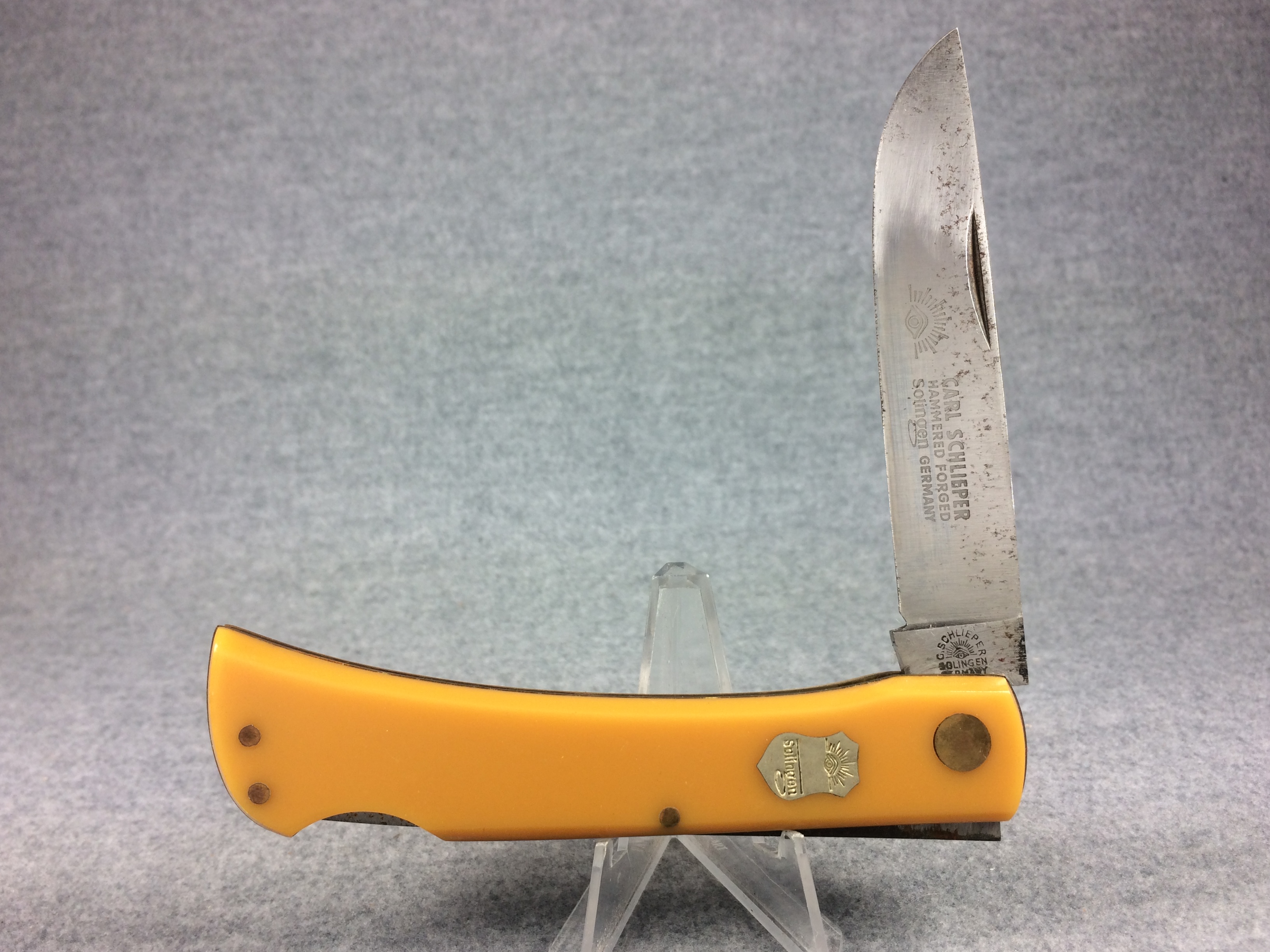 November 06, 2025 - 4-5/8 inches closed. 8-1/2 inches open. Made in Germany. "C. SCHLIEPER SOLINGEN GERMANY" with eye logo and "99YL" tang stamps. "Solingen" under eye logo badge shield. Stainless steel blade stamped "CARL SCHLIEPER HAMMER FORGED SOLINGEN GERMANY" with eye logo. Yellow composition handle. Brass liner. No box.