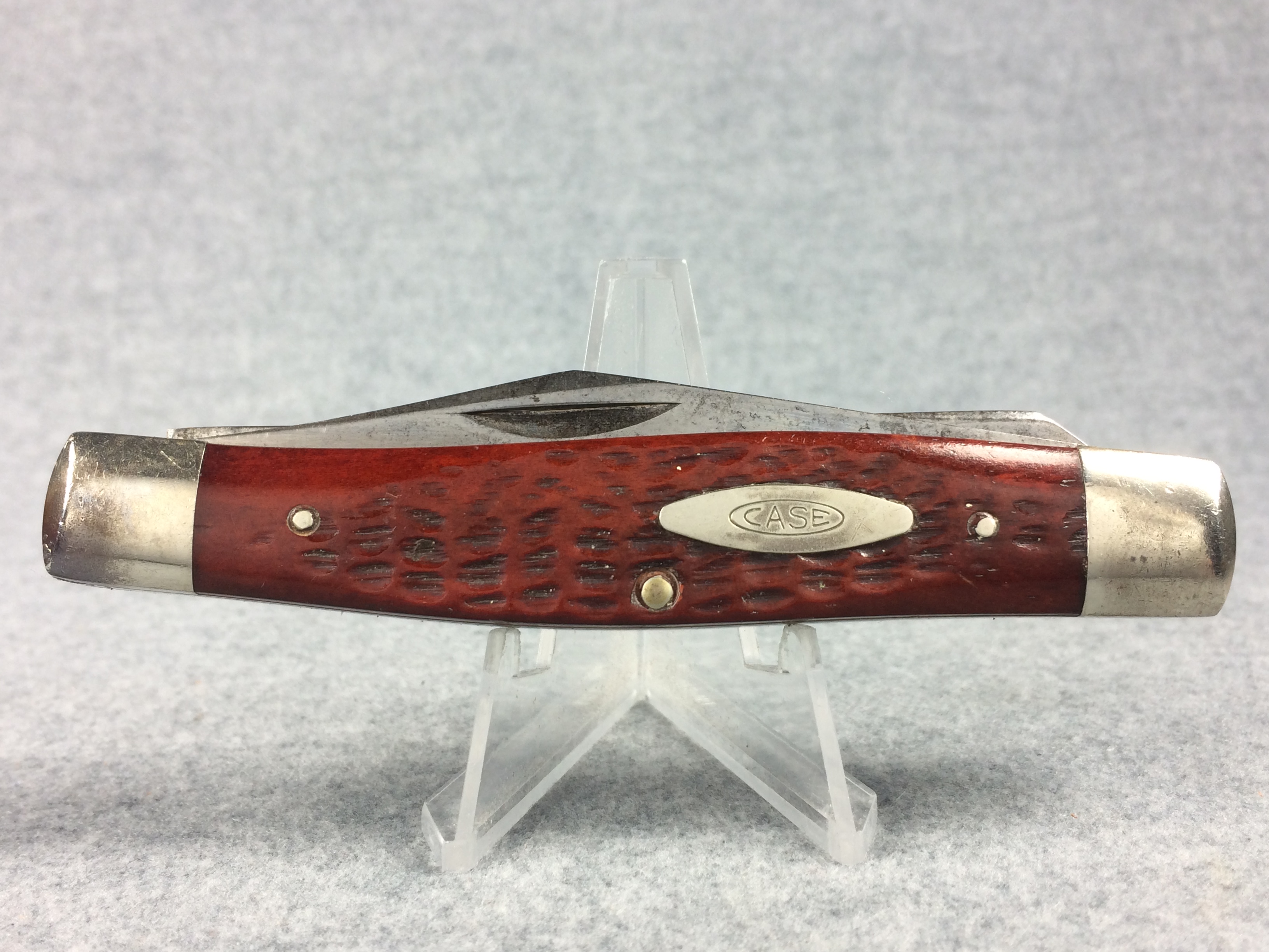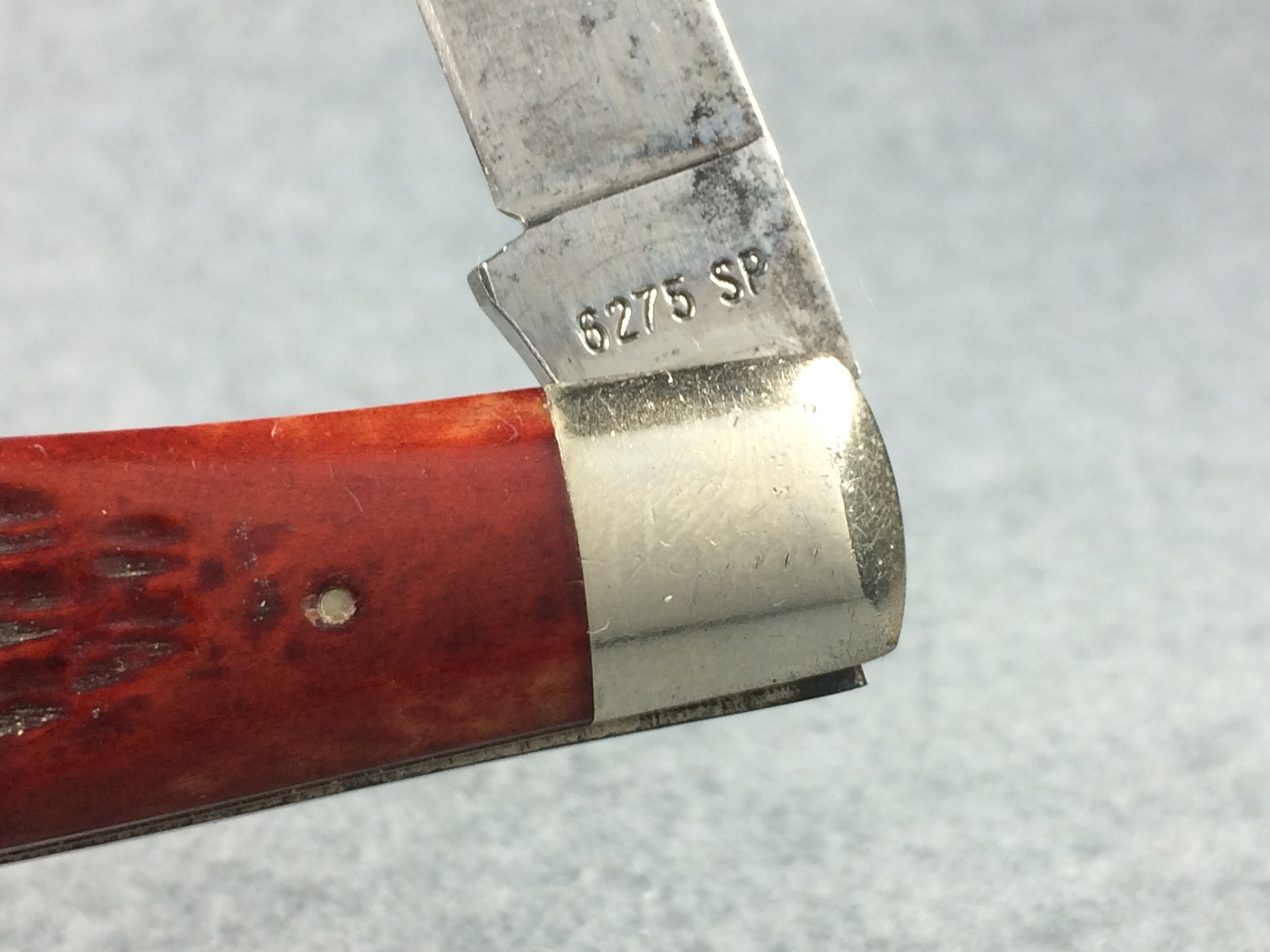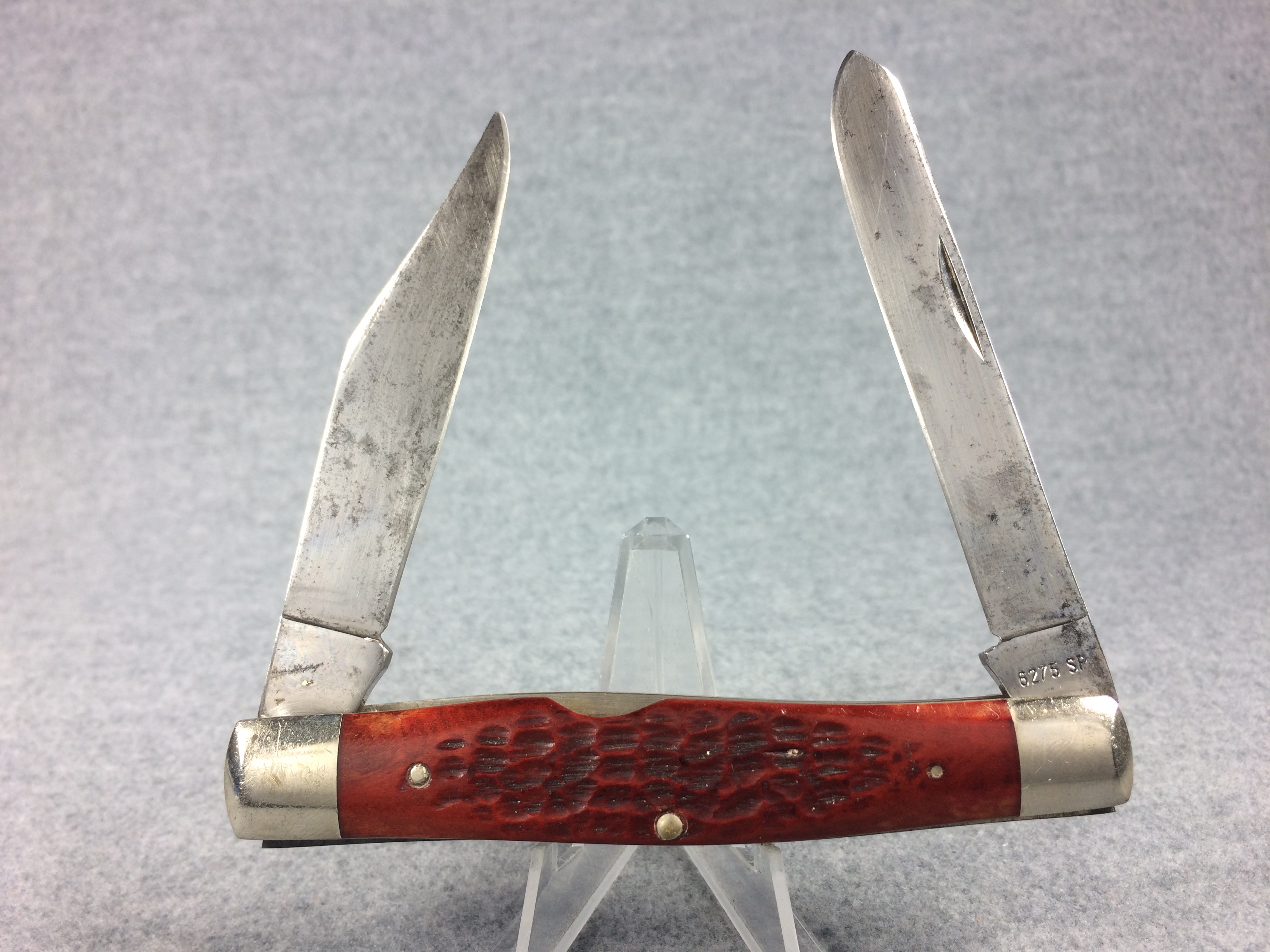 April 24, 2026 - 4-1/4 inches closed. 7-1/2 inches open. Made in USA. "  CASE XX ***** USA" (5 dot) and "6275 SP" tang stamps. Double oval Open-C "CASE" shield. Stainless Steel blades. Red/Brown Jigged bone handle. Nickel Silver bolsters and liner.
