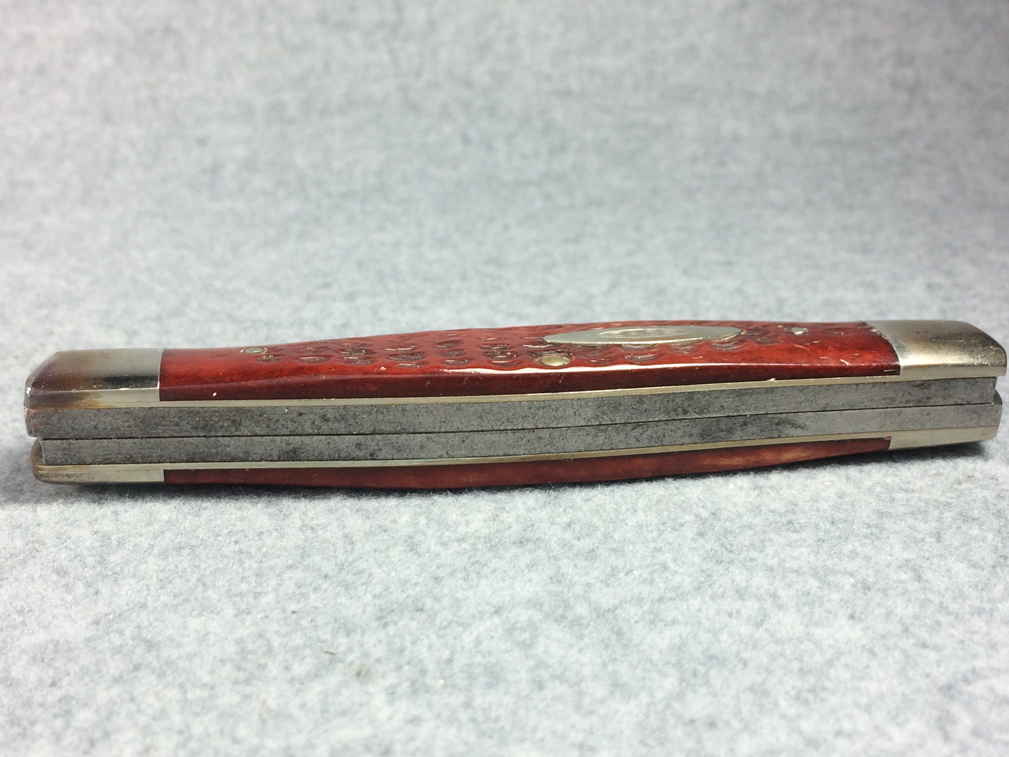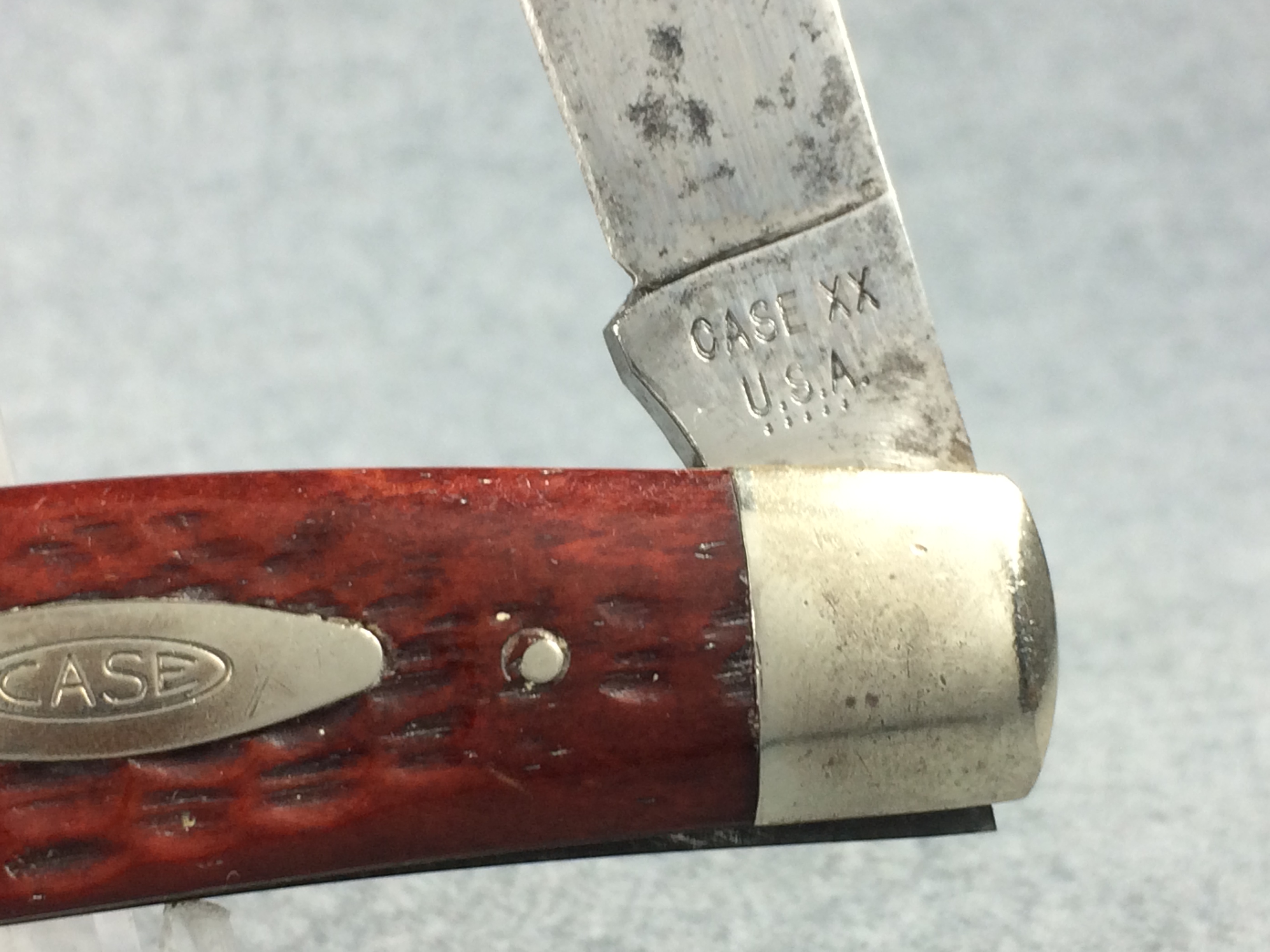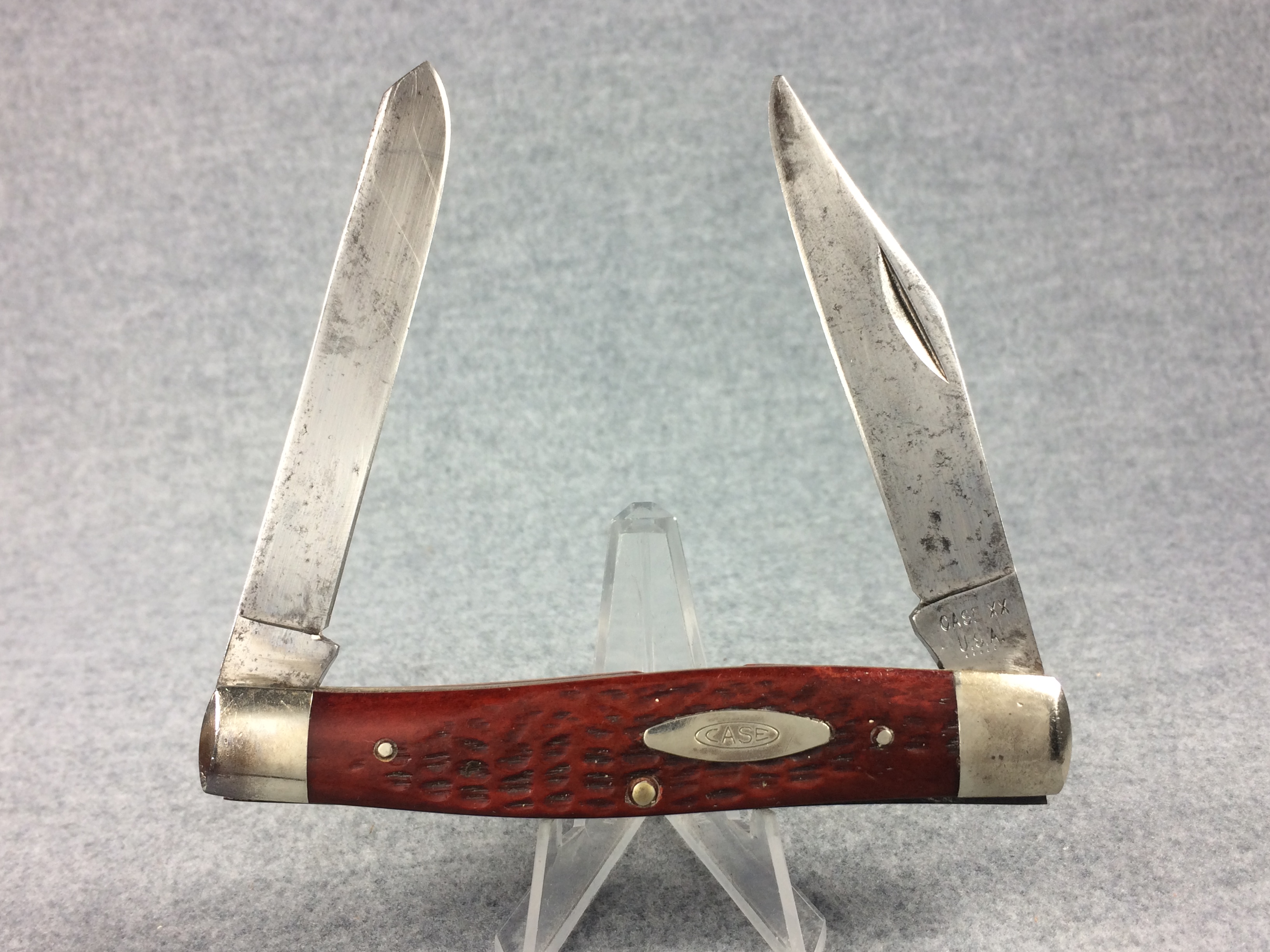 April 24, 2026 - 4-1/4 inches closed. 7-1/2 inches open. Made in USA. "  CASE XX ***** USA" (5 dot) and "6275 SP" tang stamps. Double oval Open-C "CASE" shield. Stainless Steel blades. Red/Brown Jigged bone handle. Nickel Silver bolsters and liner.