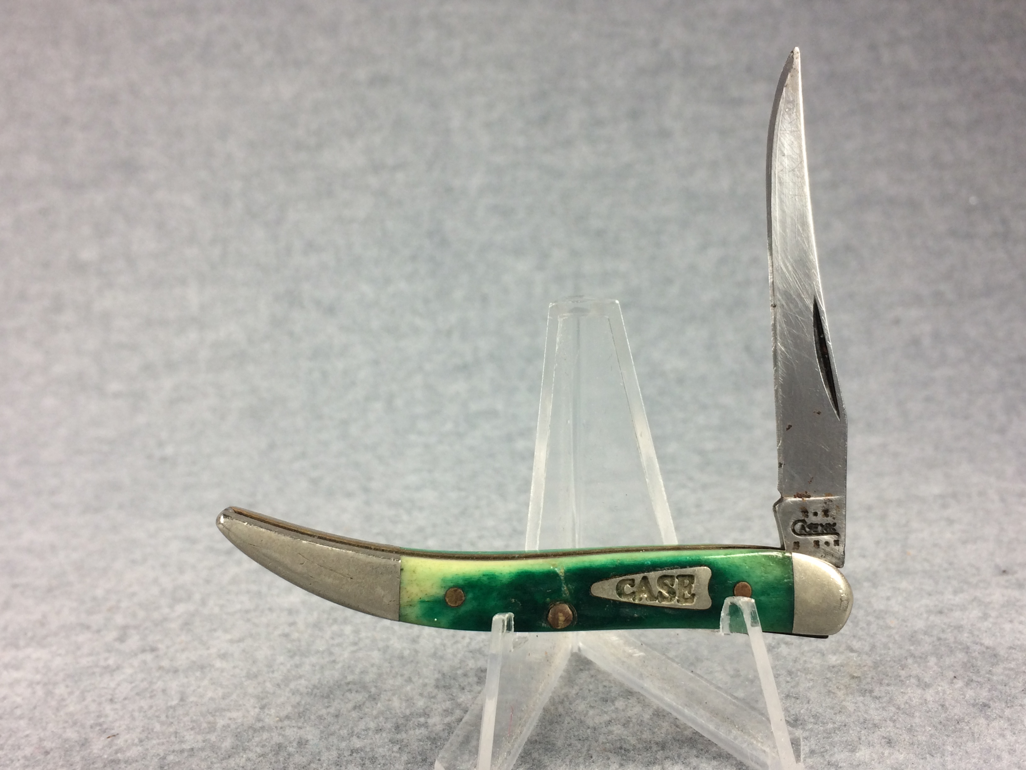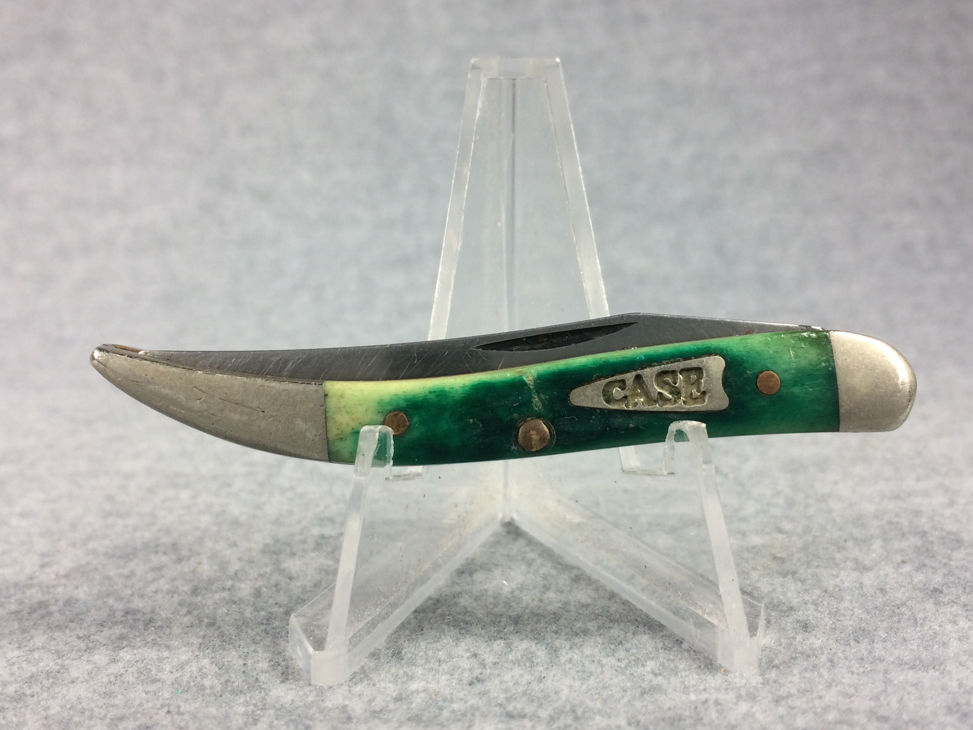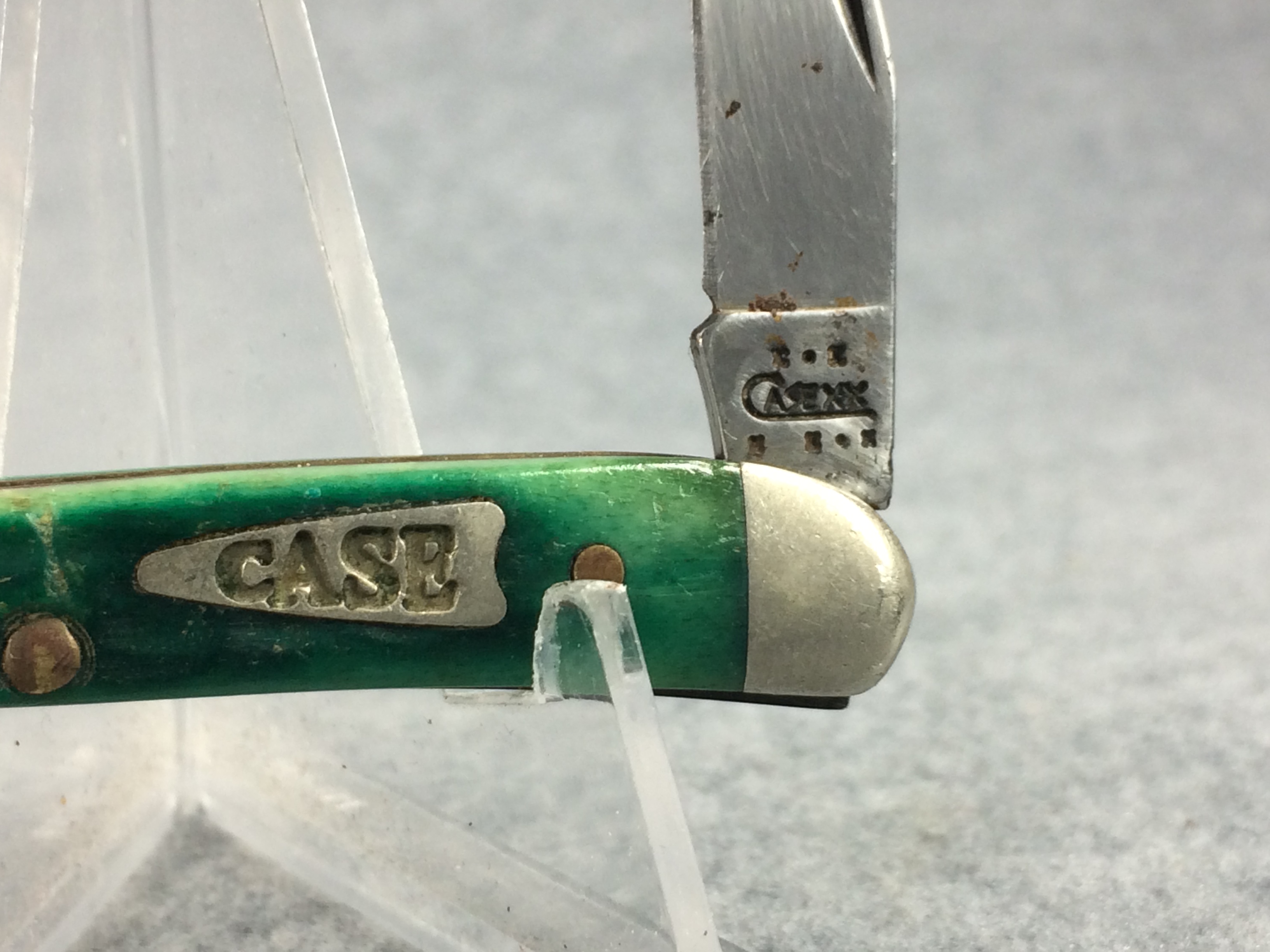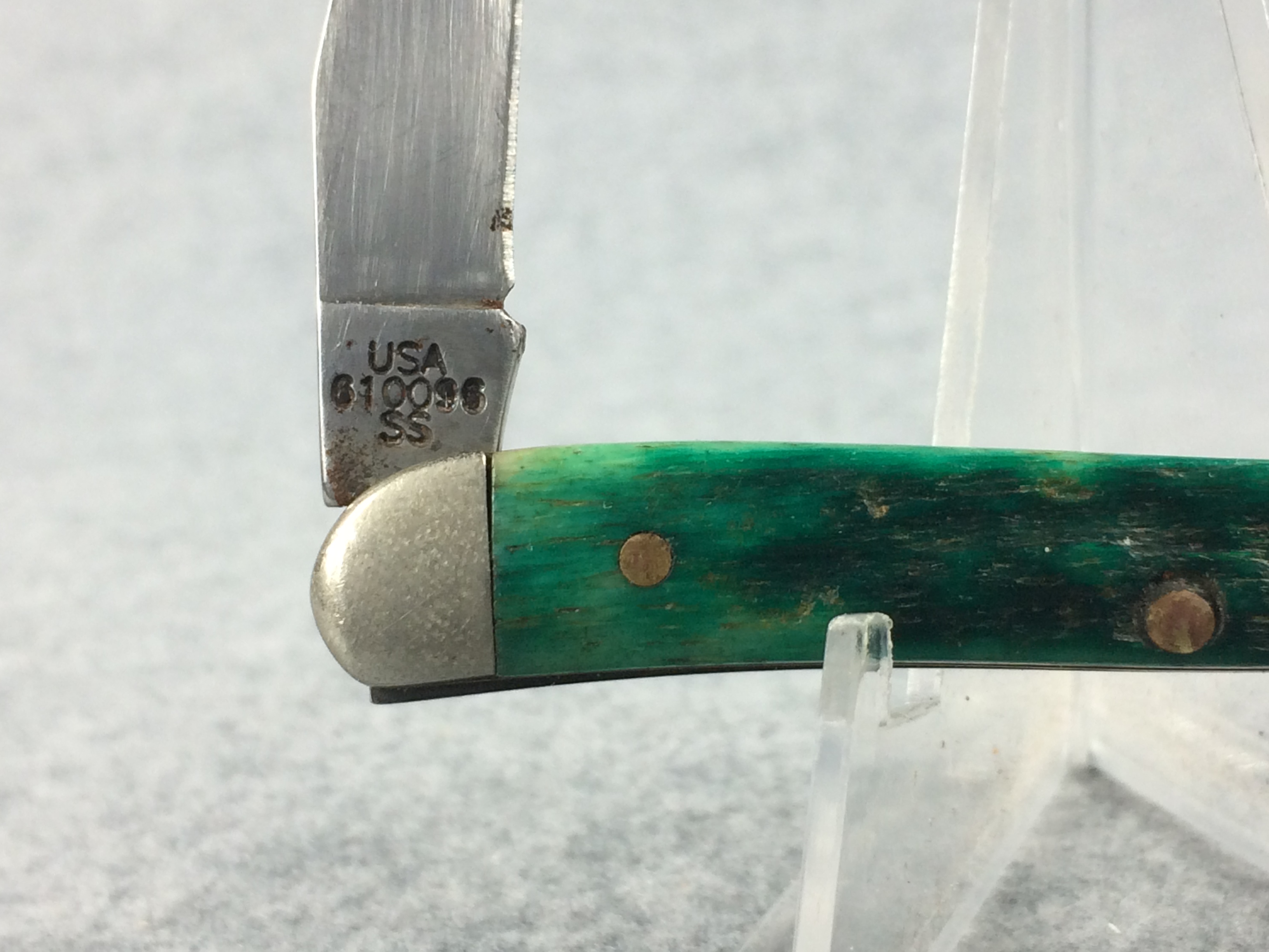 November 14, 2025 - 3 inches closed. 5-1/4 inches open. Made in USA. "  x*x  Case XX  x x*x " (with lightning bolt S) and "USA 610096 SS" tang stamps. Arrow closed-C "CASE" shield. Stainless Steel blade. Green jigged bone handle. Nickel Silver bolsters. Brass liner.