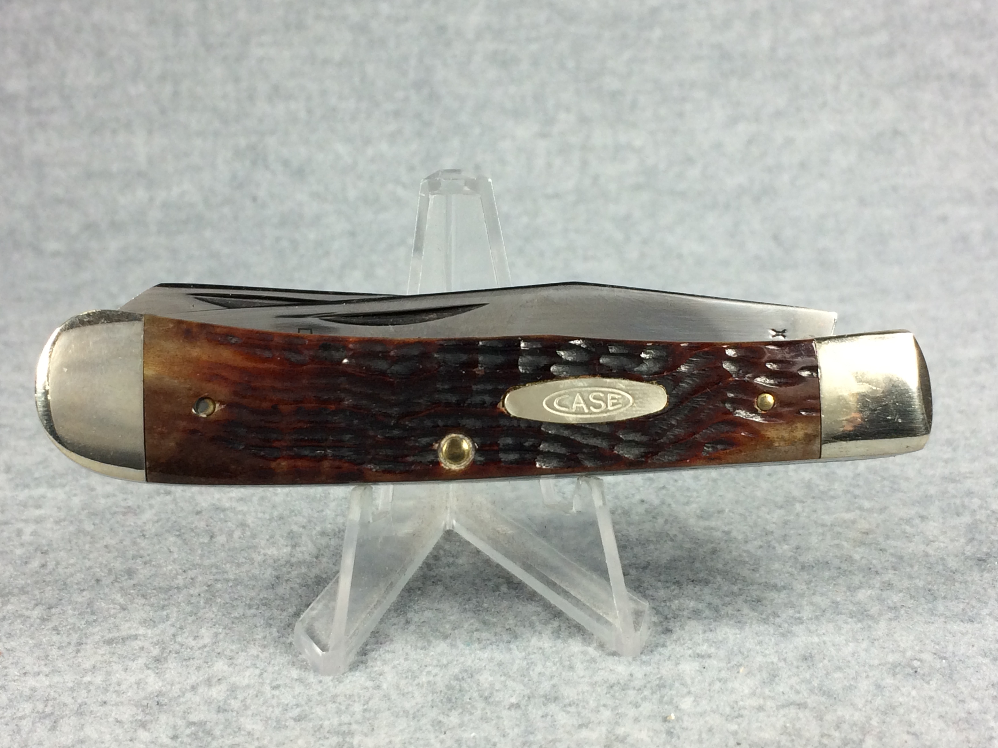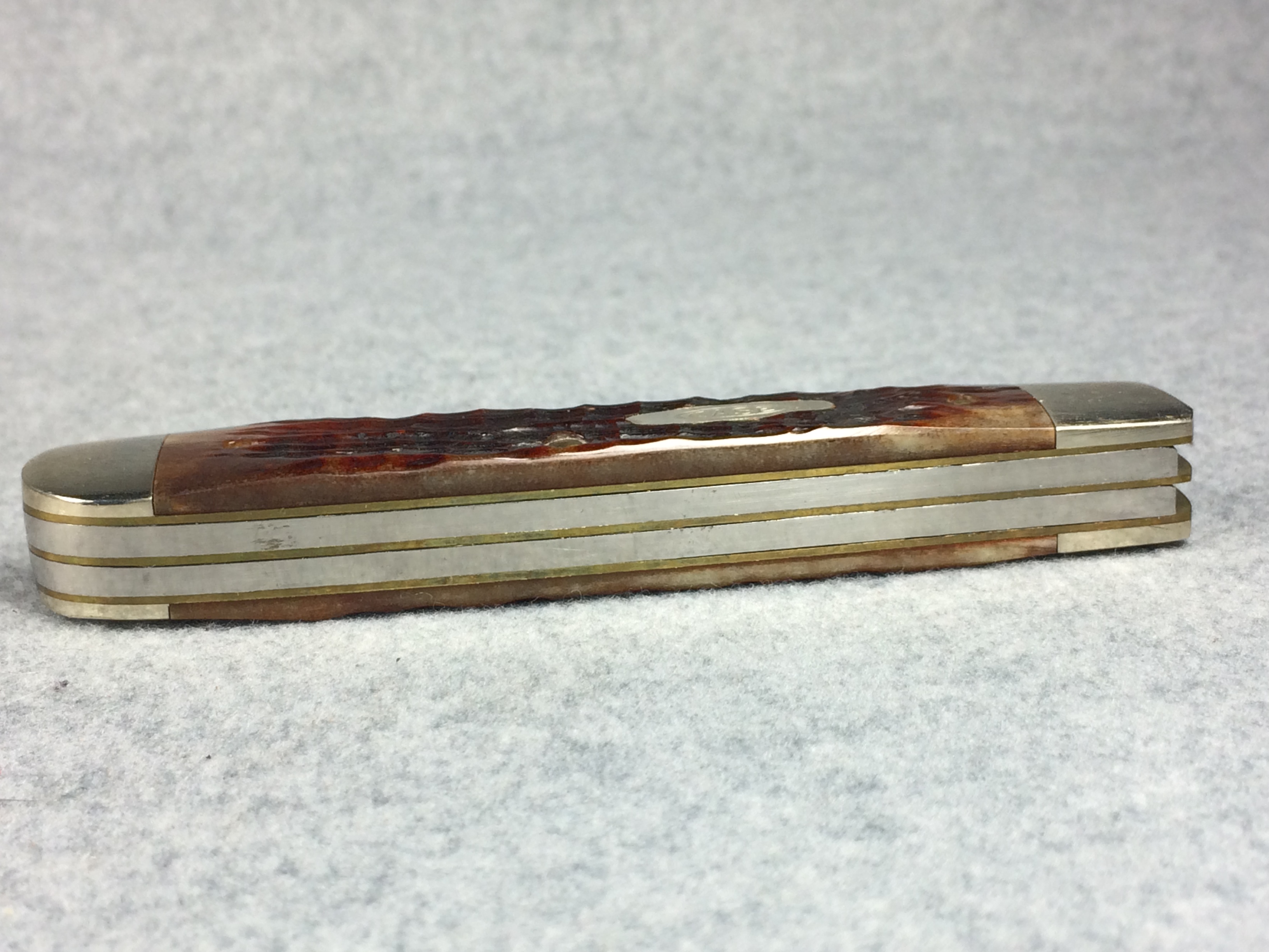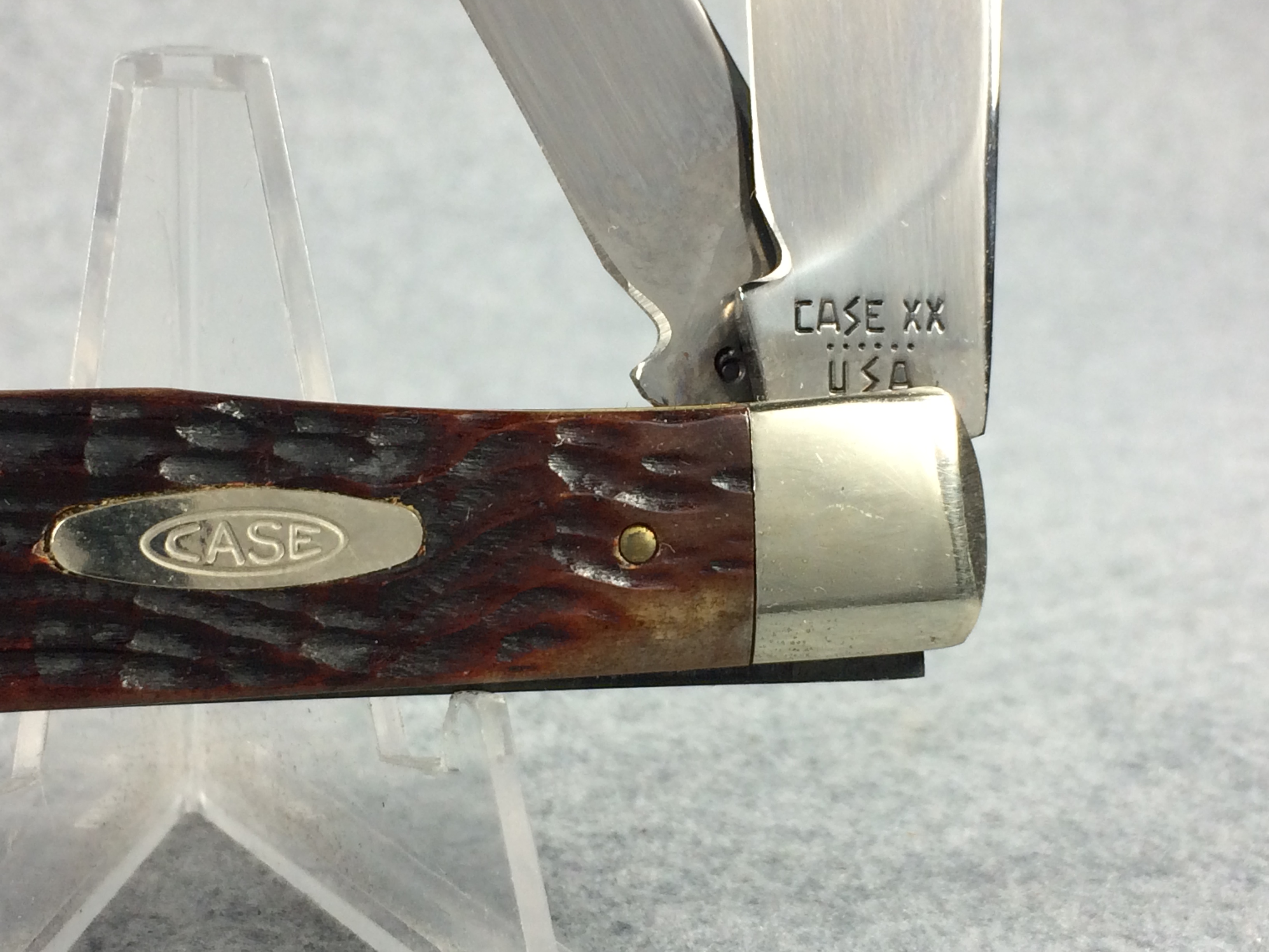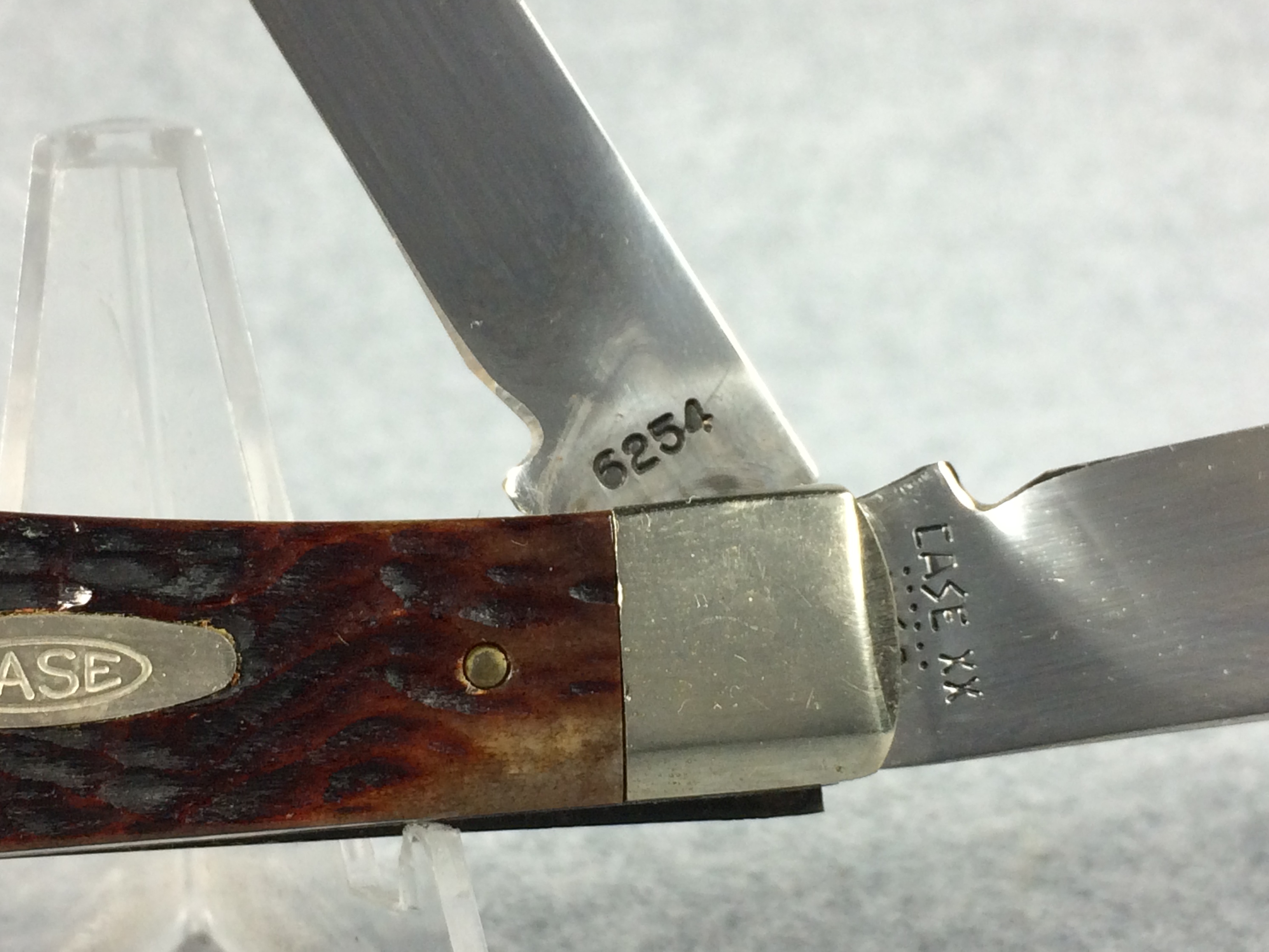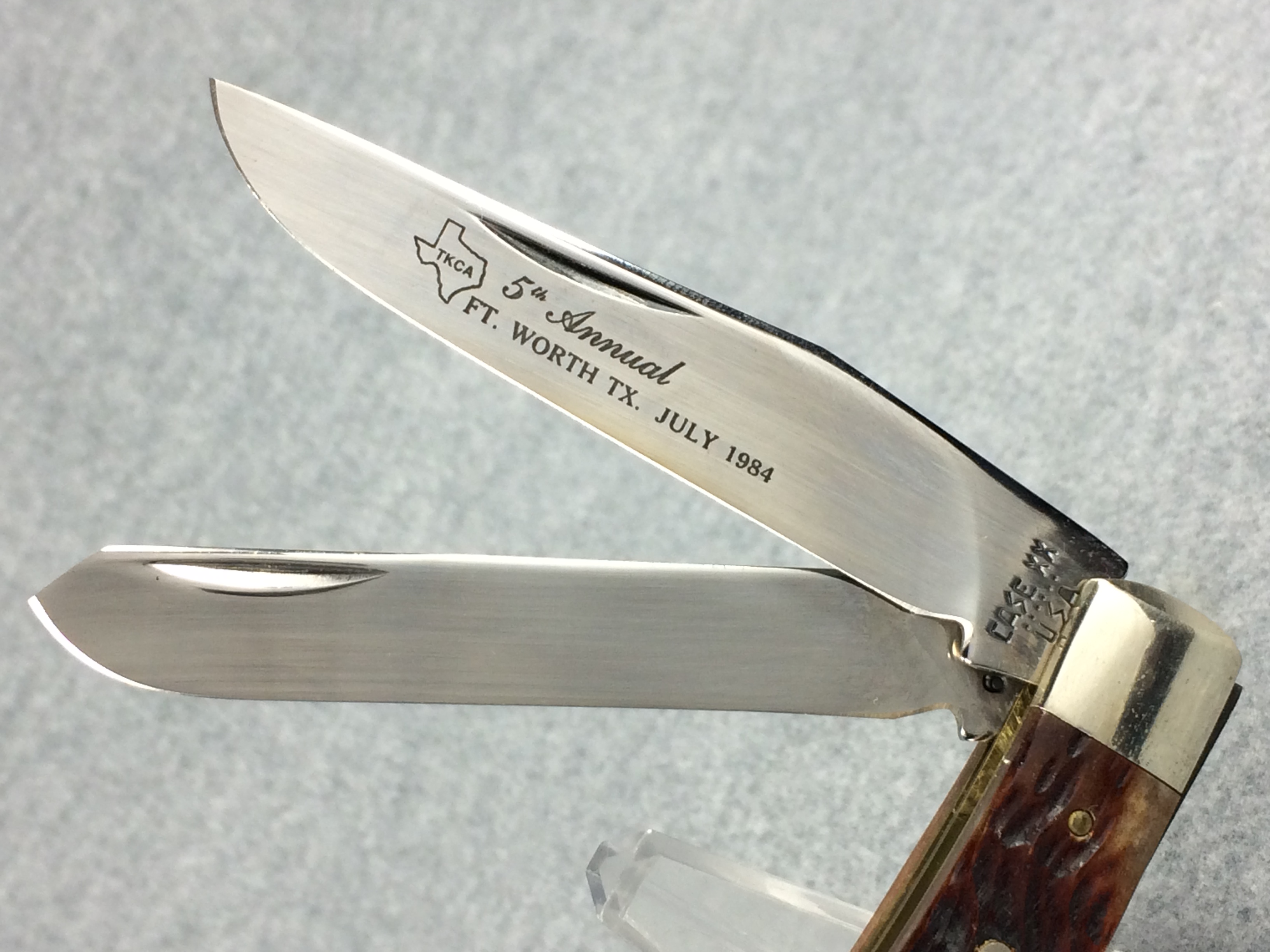 December 22, 2025 - 4-1/8 inches closed. 7-3/8 inches open. Made in USA. "CASE XX ****** USA" (6 dot with lightning bolt S) and "6254" tang stamps. Double oval open C "CASE" shield. Chrome vanadium blades. Master blade stamped with TKCA logo and "5th Annual FT. WORTH TX July 1984". Jigged bone handles. Nickel Silver bolsters. Brass liner.
