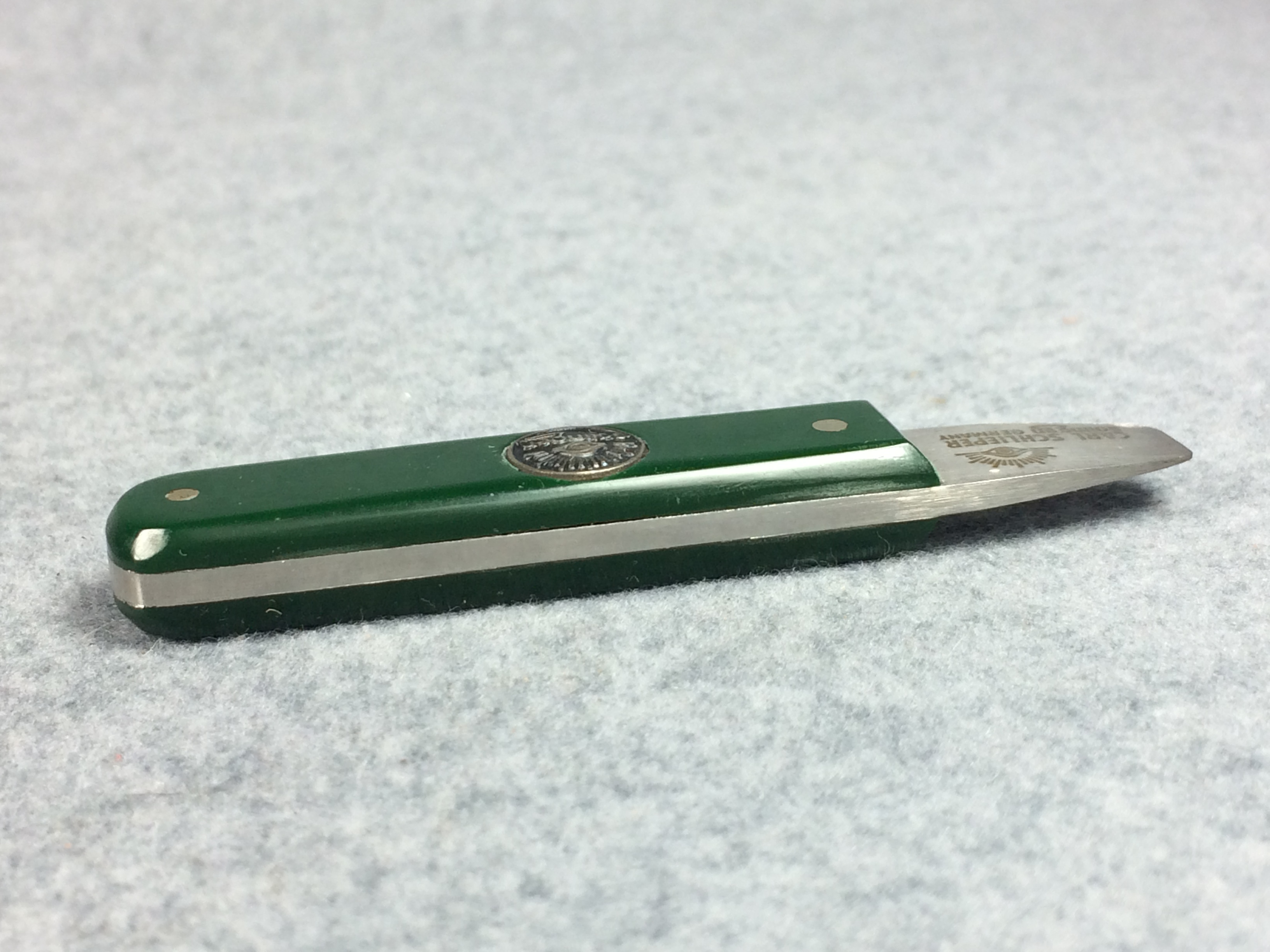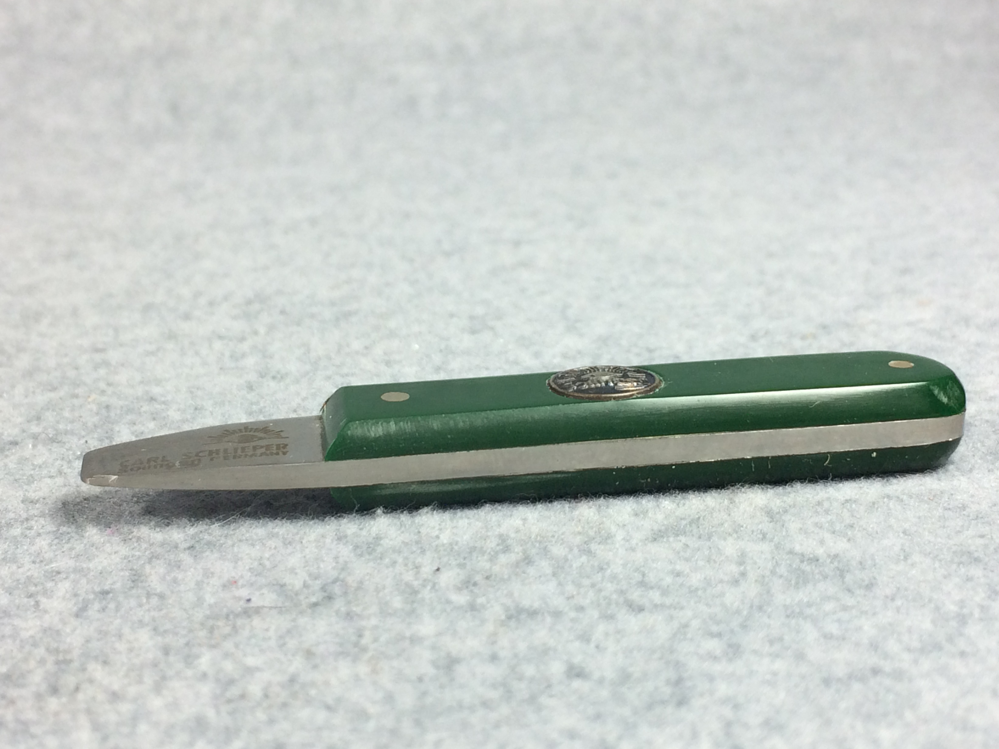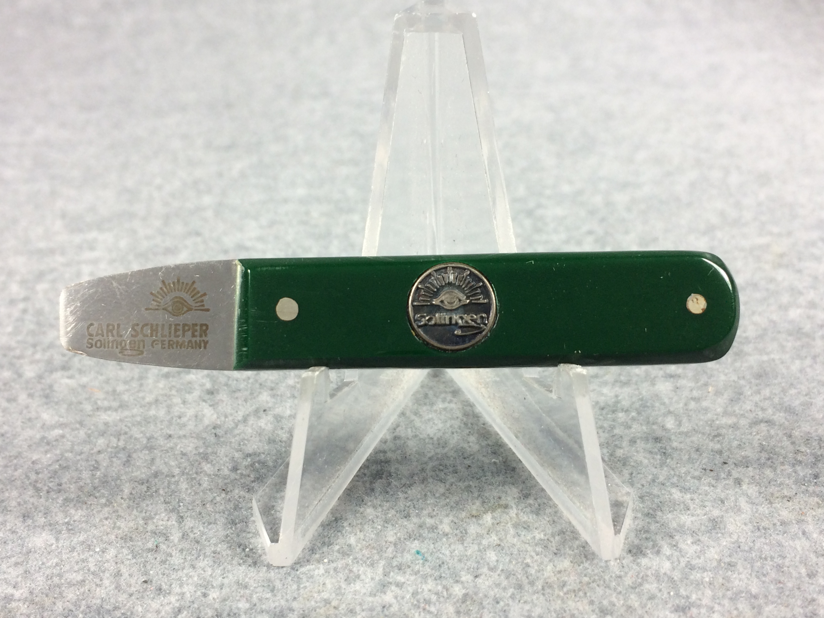 November 03, 2025 - Vintage knife pick. 2-7/8 inches long. Made in Germany. Pick stamped with eye logo and "CARL SCHLIEPER Solingen GERMANY". Round "Solingen" under eye logo shield. Smooth green composition handle.