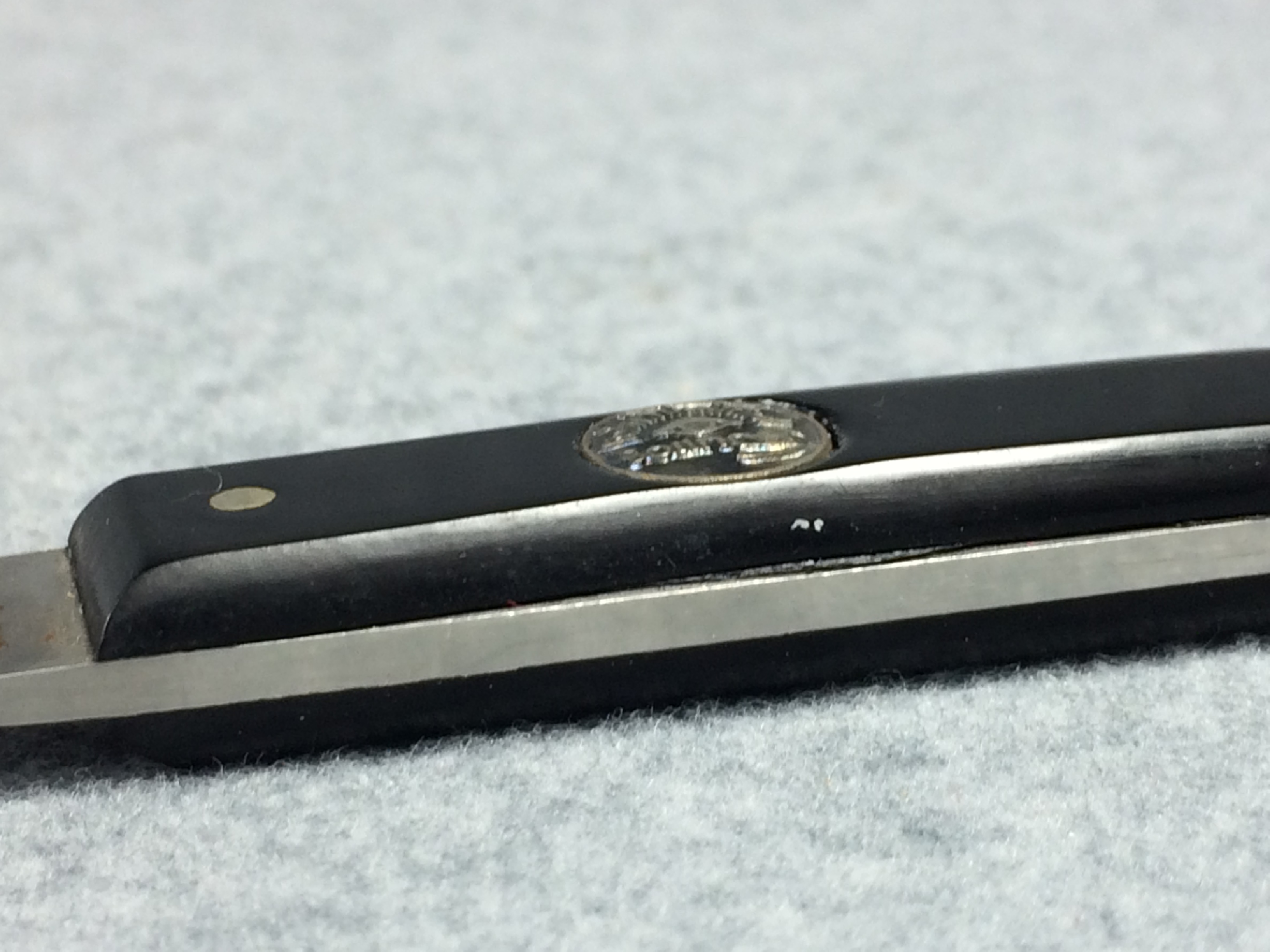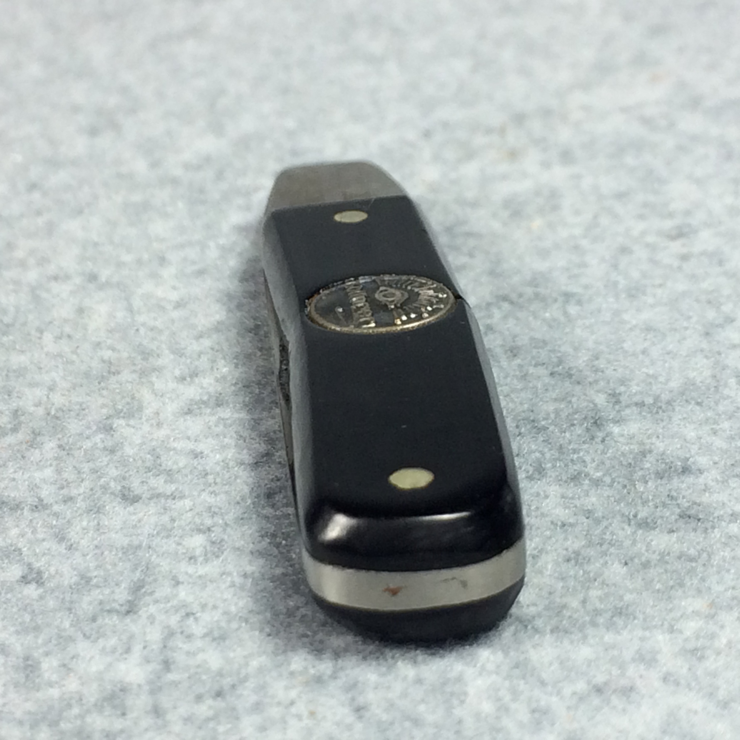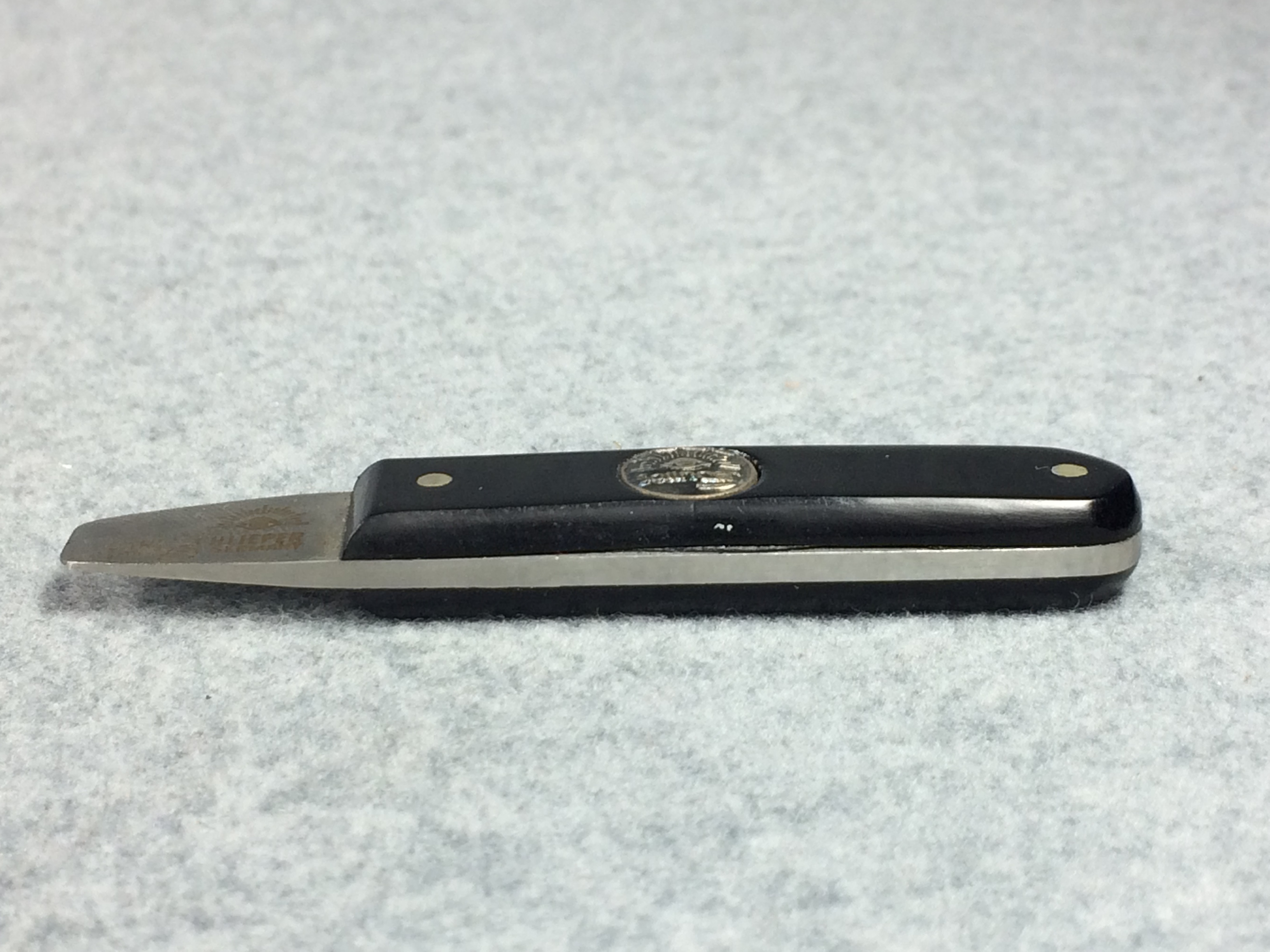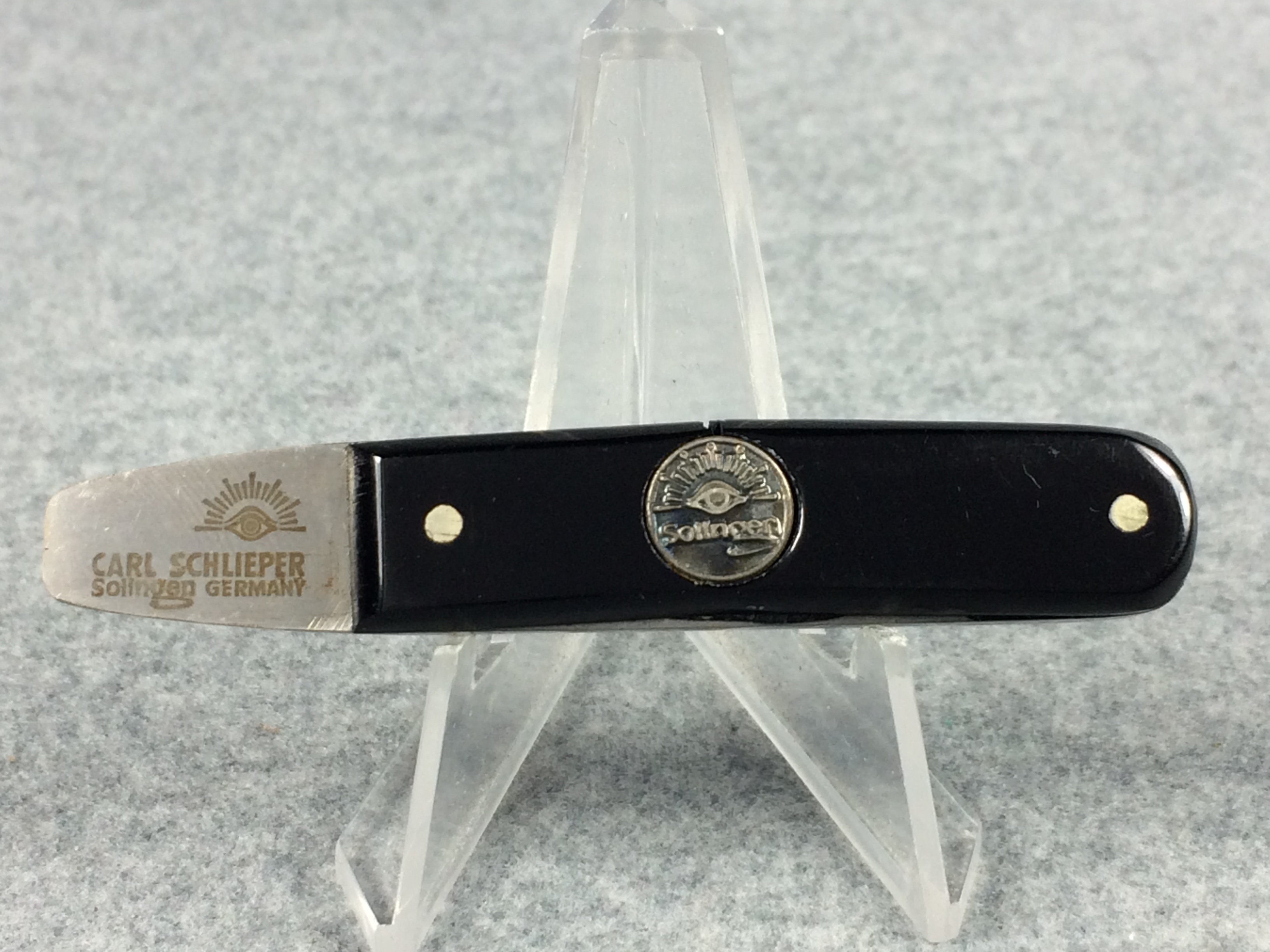 March 09, 2026 - Vintage knife pick. 2-7/8 inches long. Made in Germany. Pick stamped with eye logo and "CARL SCHLIEPER Solingen GERMANY". Round "Solingen" under eye logo shield. Smooth black composition handle.