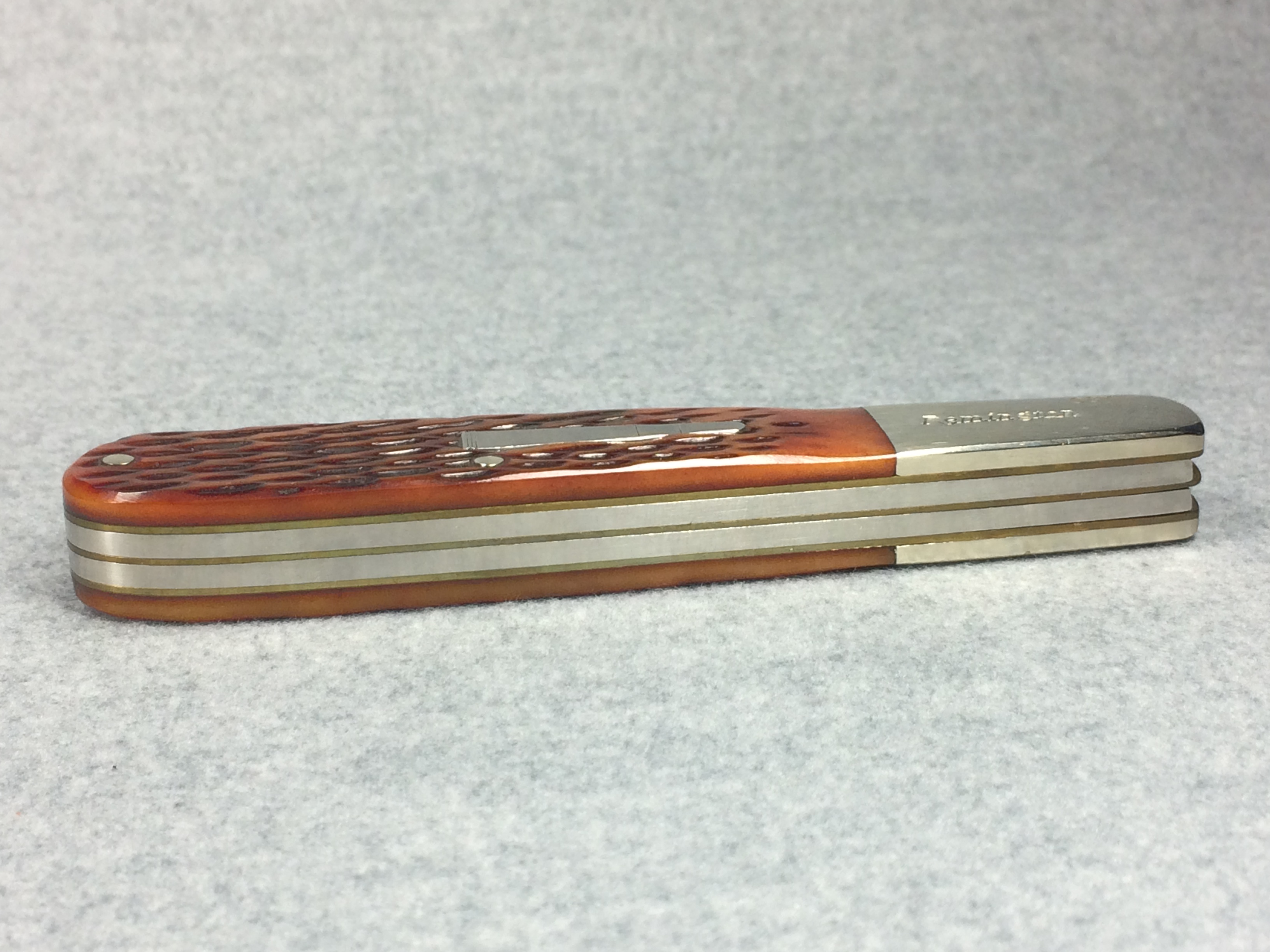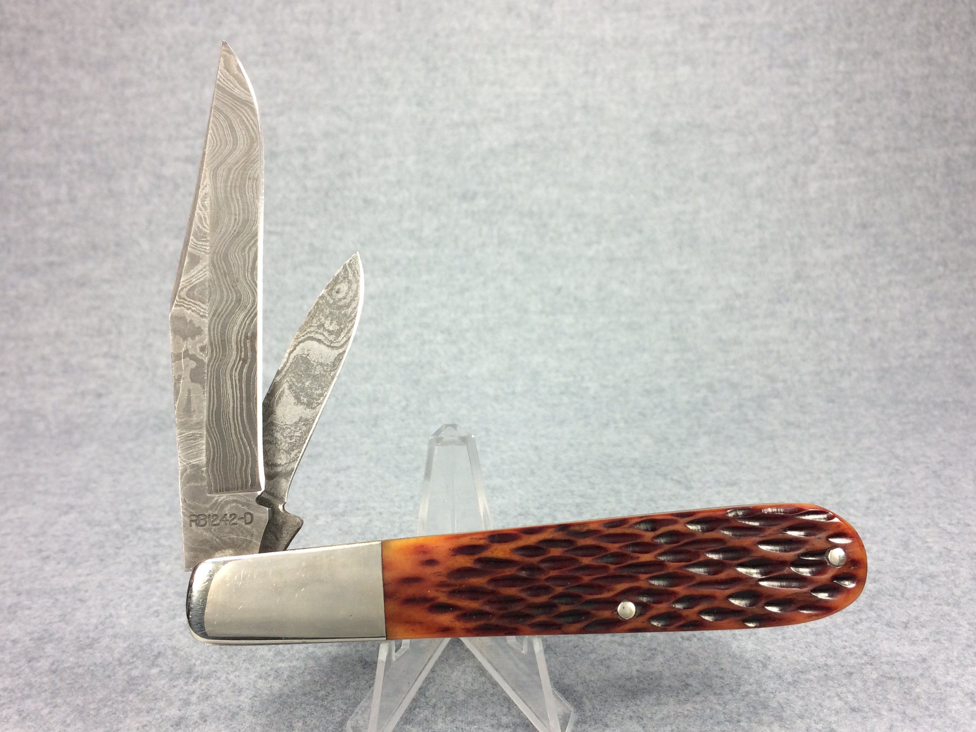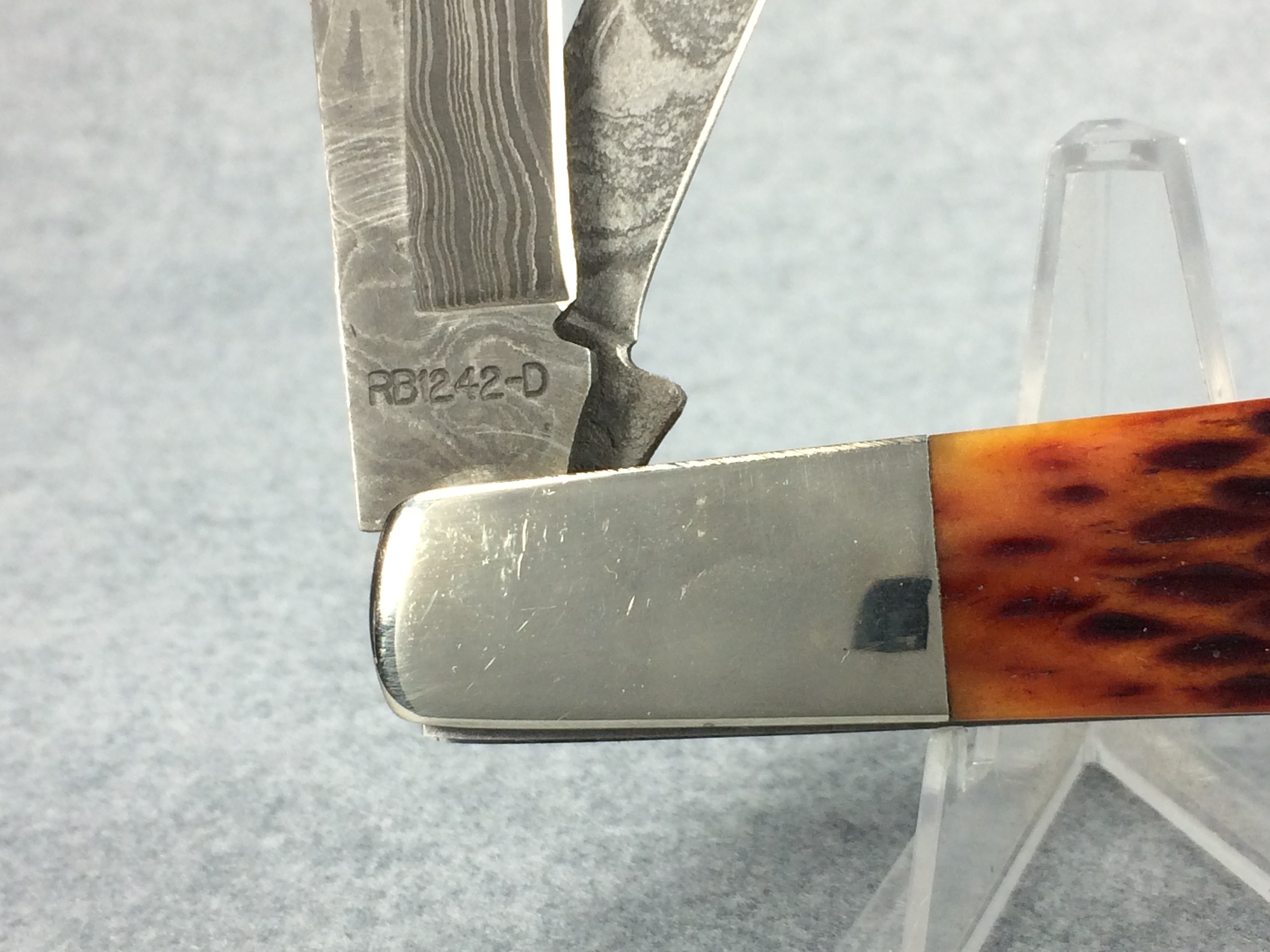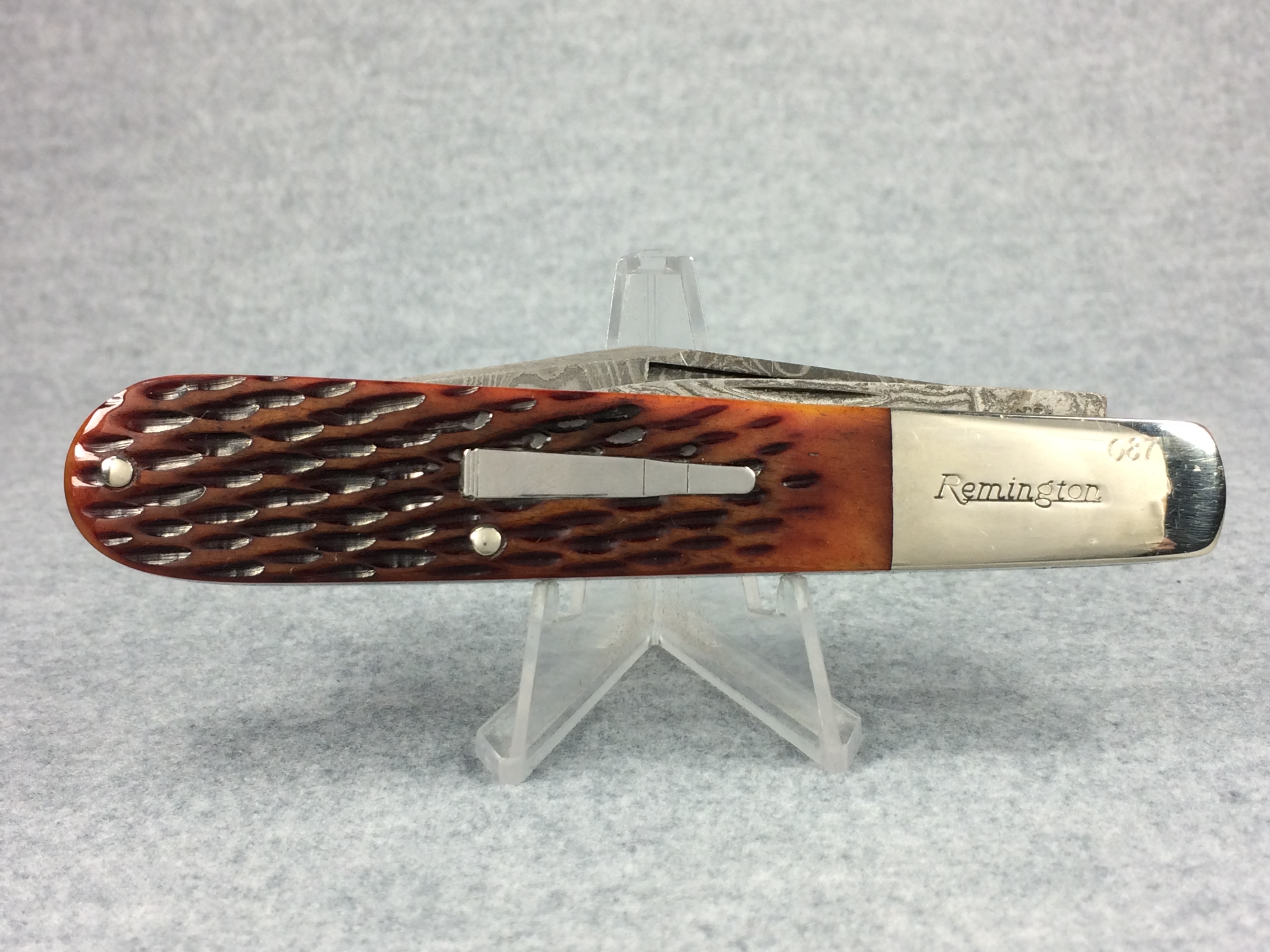 November 03, 2025 - 2-Blade Big Daddy Barlow Bullet Knife. Limited Edition. 5 inches closed. 9 inches open. Made in USA. "Remington UMC Made in USA",  'RB1242-D' and '2009' tang stamps. Bullet shield. Damascus blades. Jigged Bone handle. Nickel Silver bolsters. Front right bolster etched "Remington" and with serial #087. Brass liner. No box.