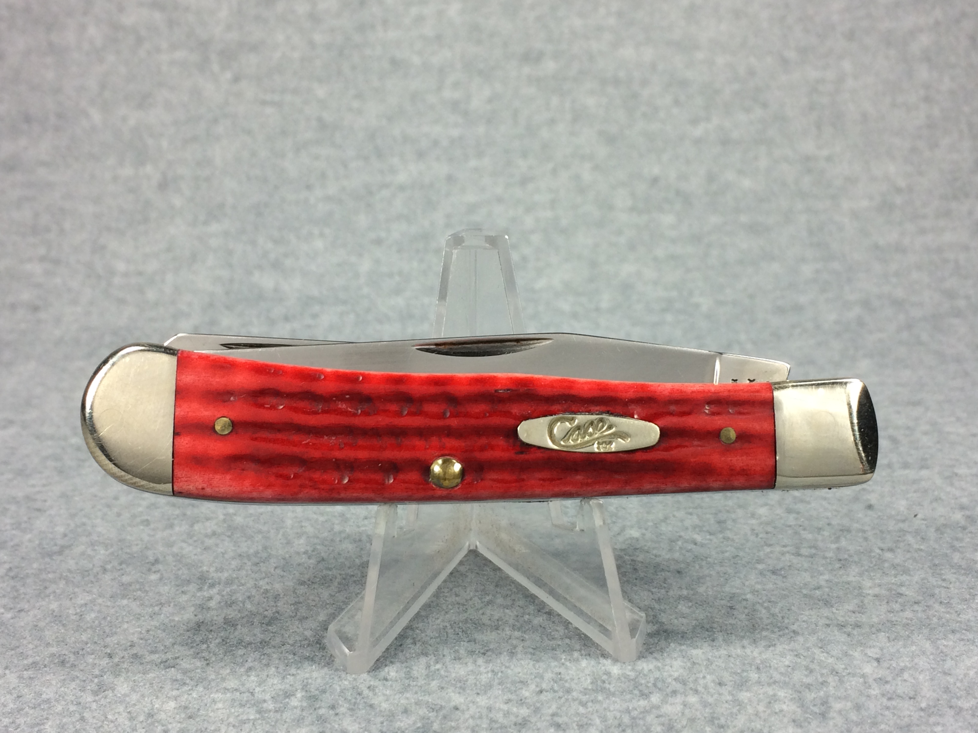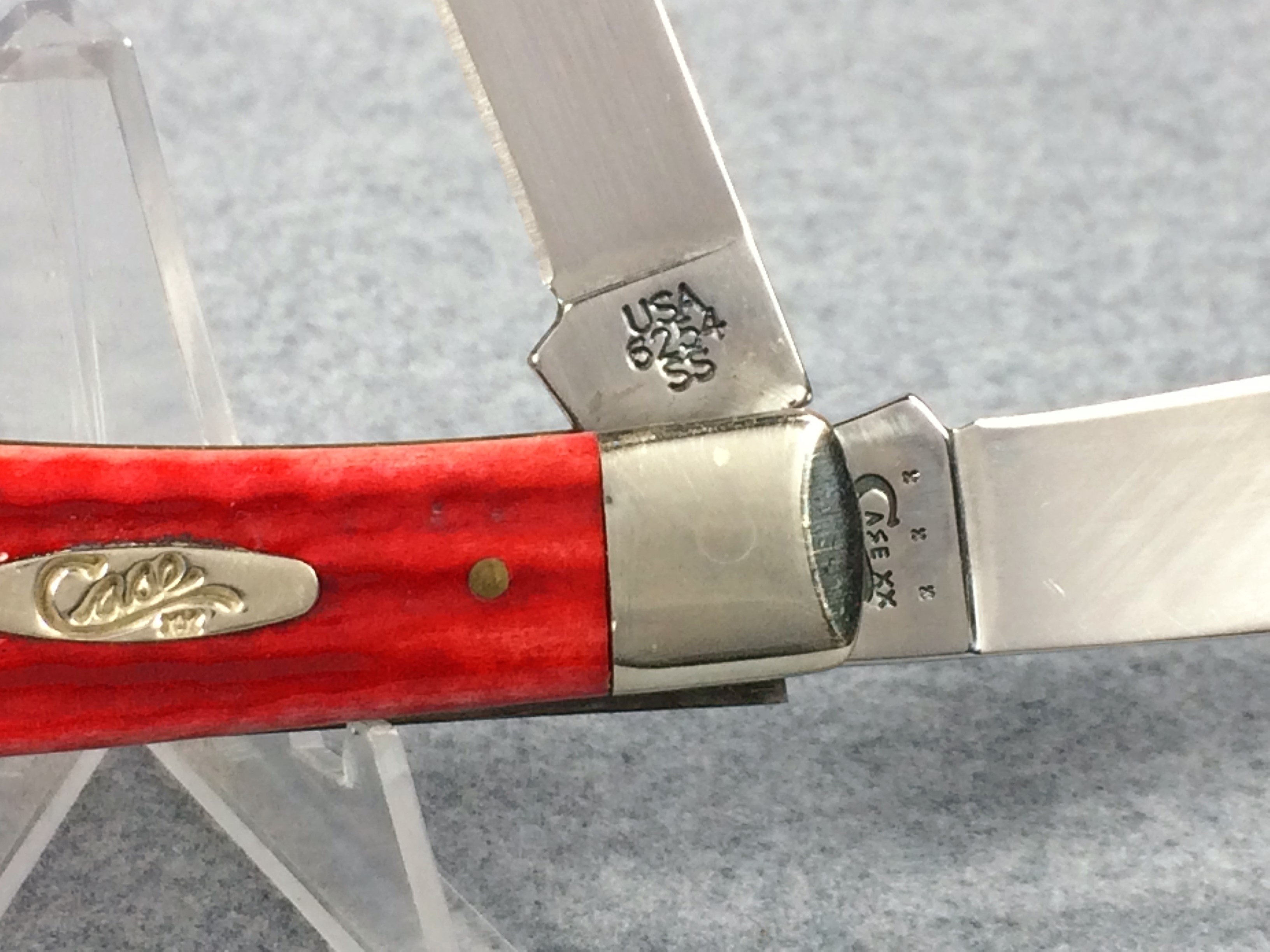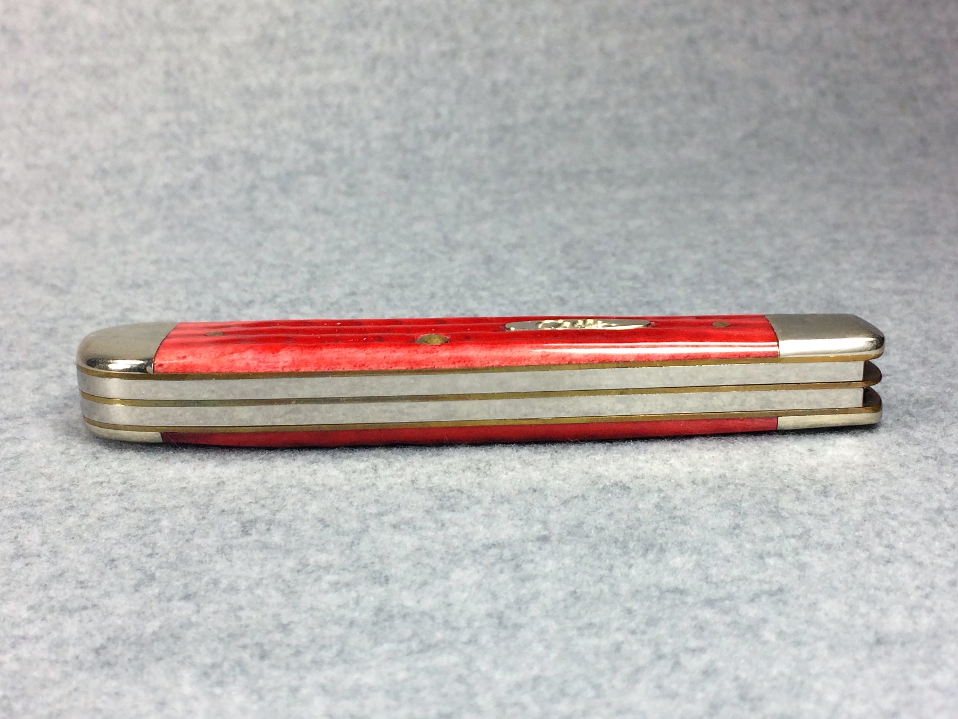 January 08, 2026 - 4-1/8 inches closed. 7-3/8 inches open. Made in USA. "  x x x  CASE XX   x*x*  " (with lightning bolt S) and "USA 6254 SS" tang stamps. Oval long-C script "Case xx" shield. Stainless steel blades. Red jigged bone handle. Nickel Silver bolsters and brass liner.