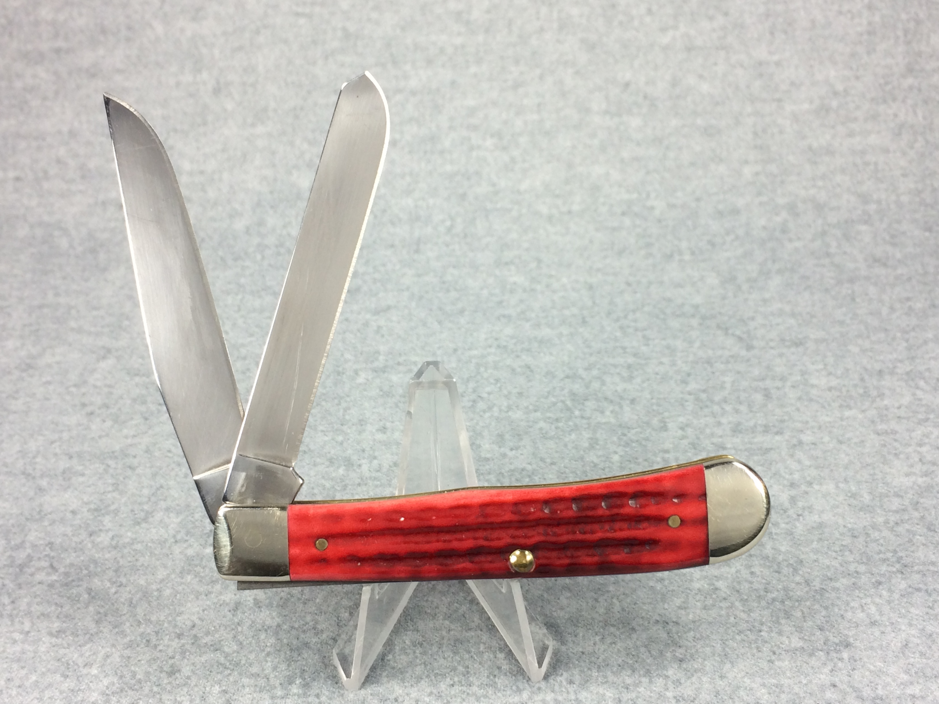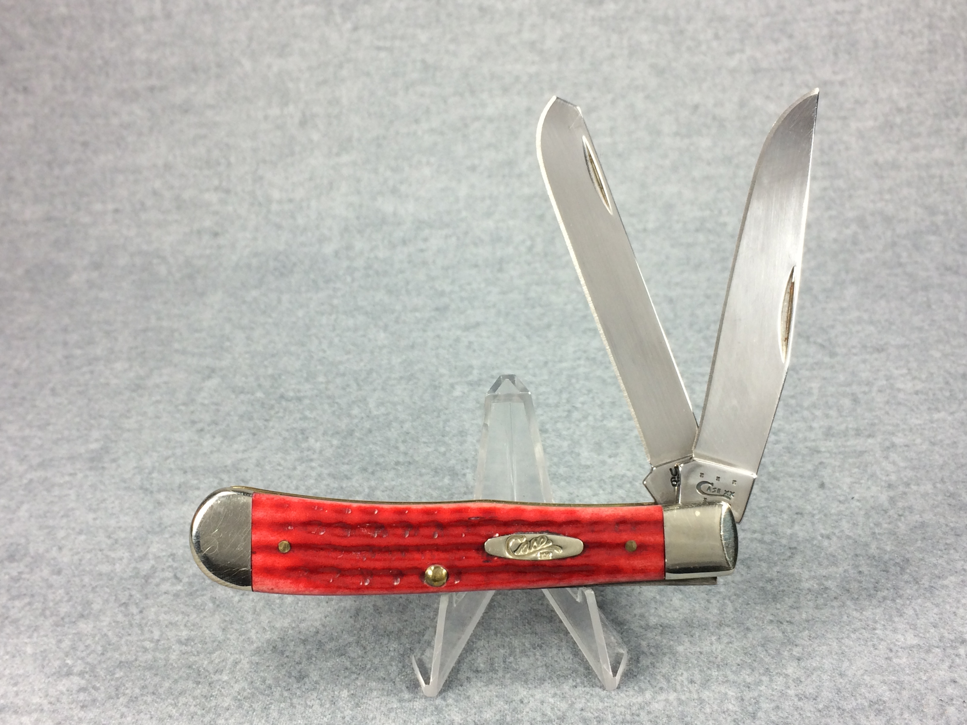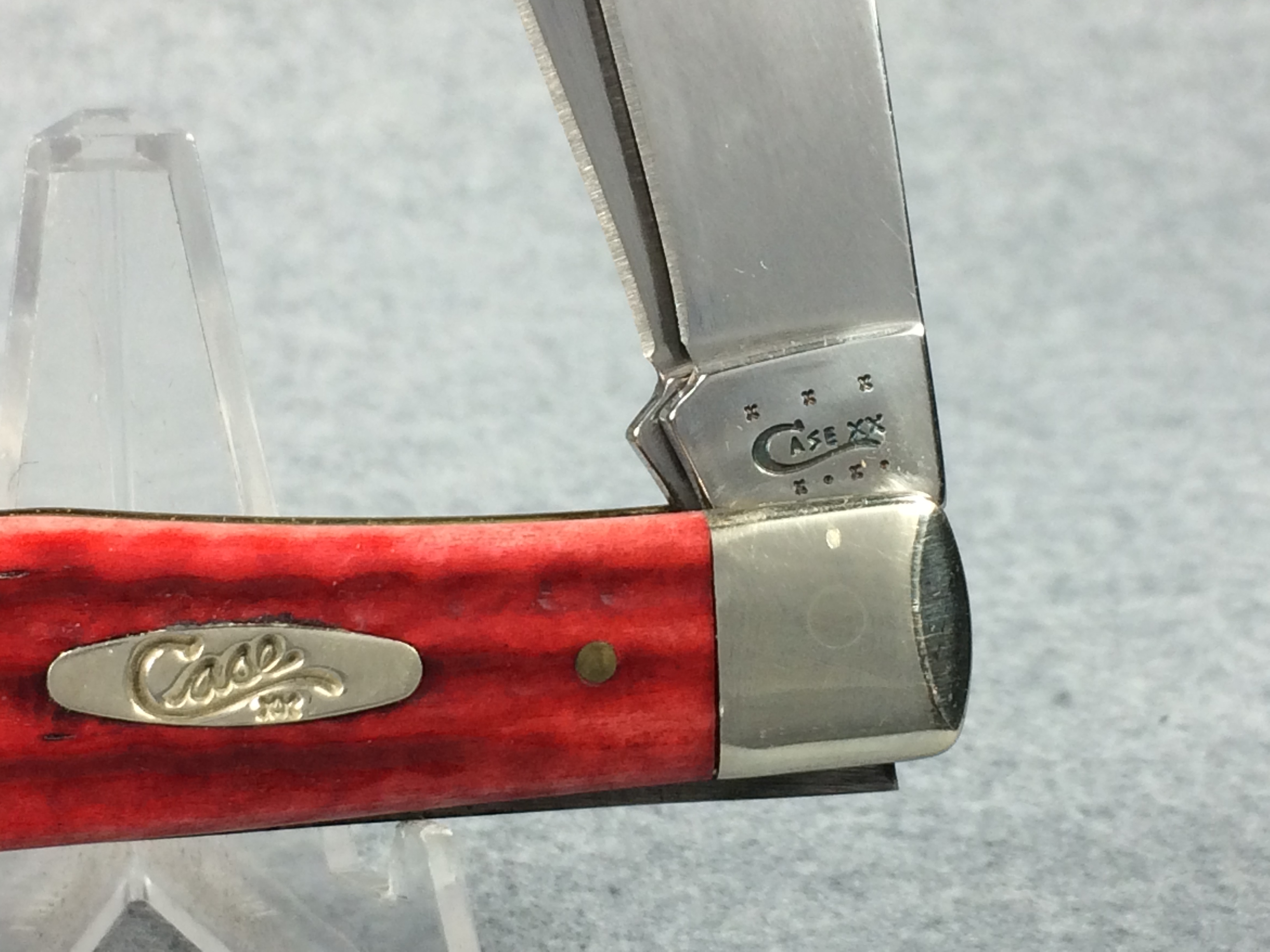 January 08, 2026 - 4-1/8 inches closed. 7-3/8 inches open. Made in USA. "  x x x  CASE XX   x*x*  " (with lightning bolt S) and "USA 6254 SS" tang stamps. Oval long-C script "Case xx" shield. Stainless steel blades. Red jigged bone handle. Nickel Silver bolsters and brass liner.