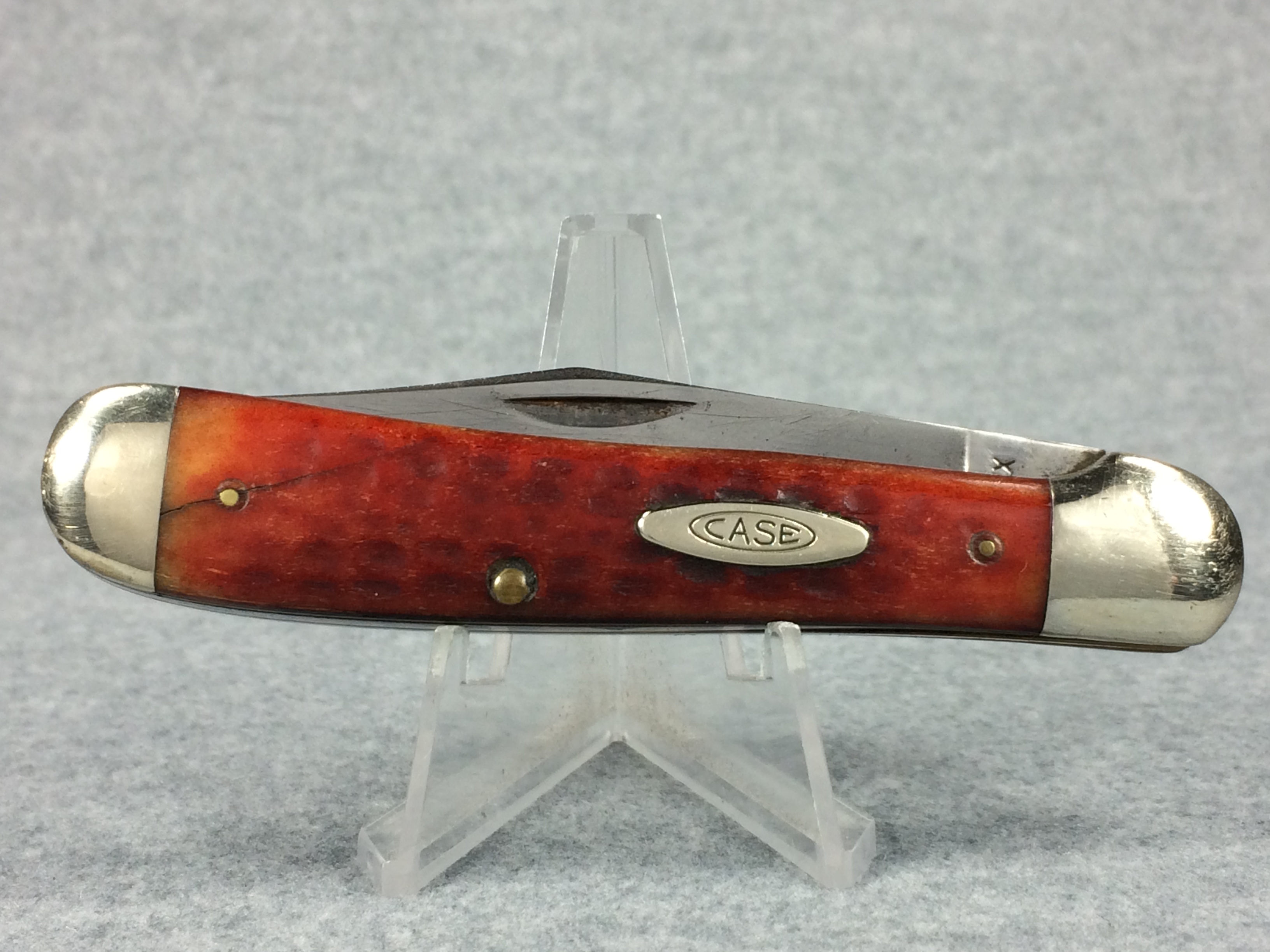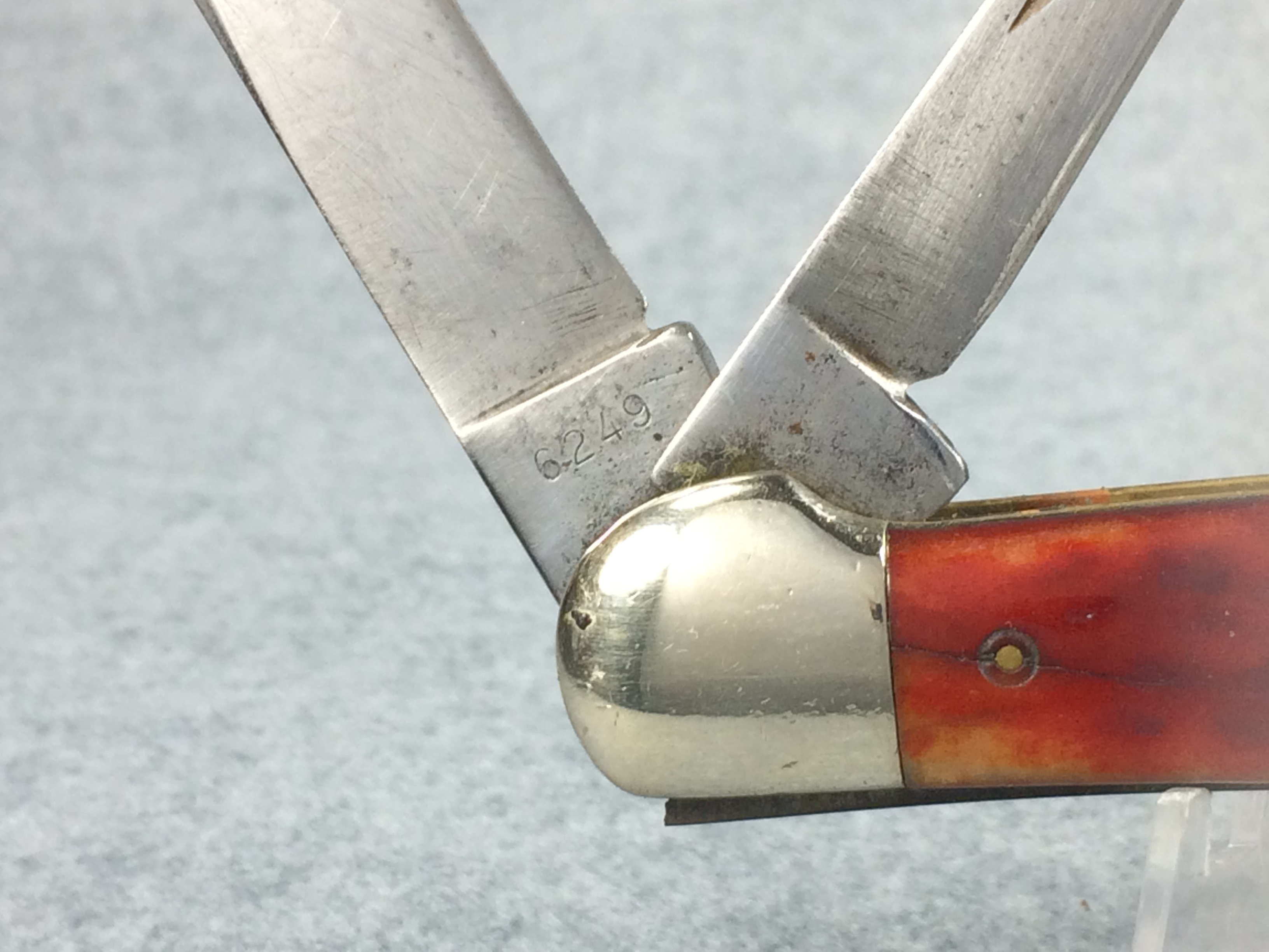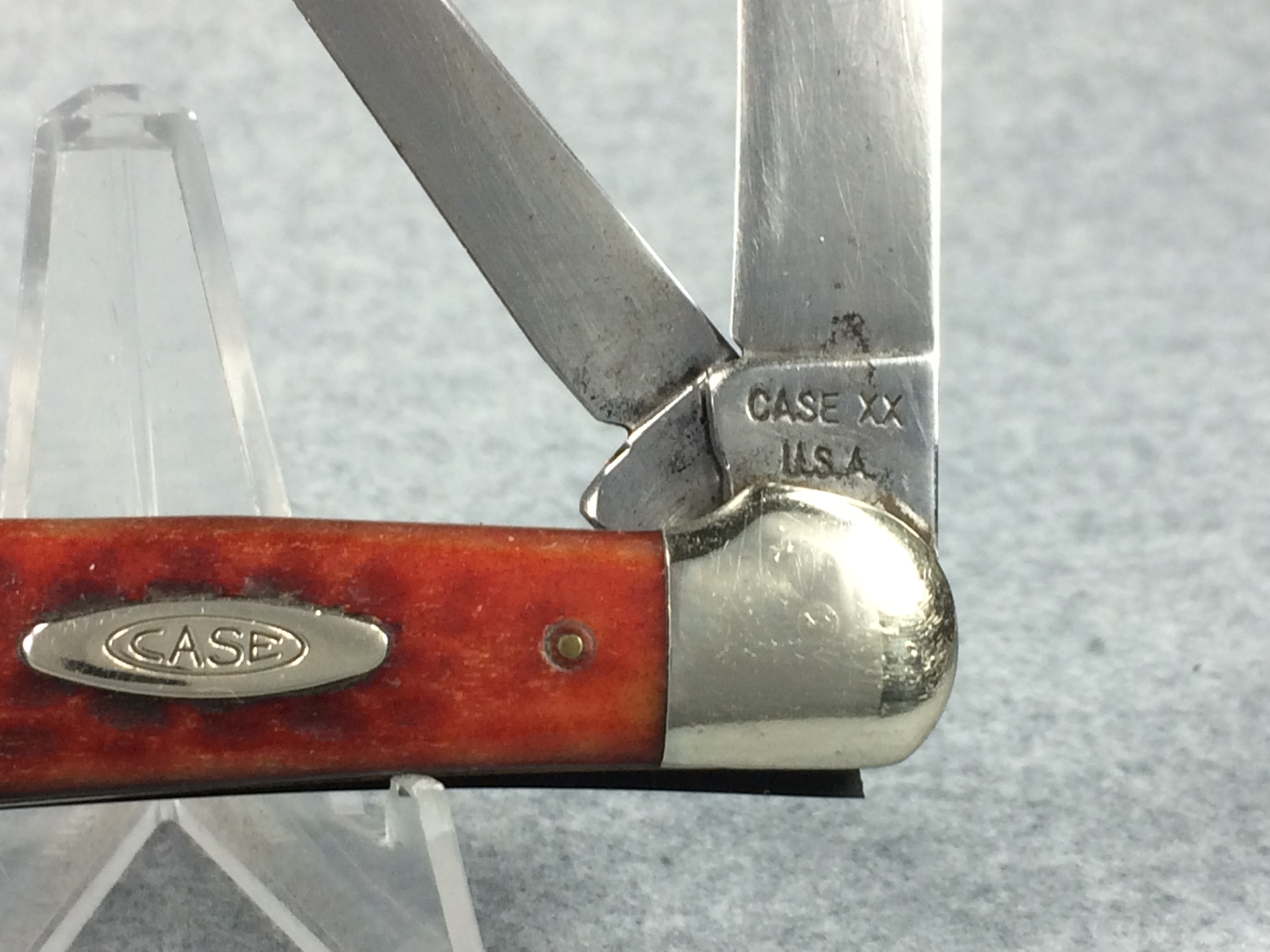 January 08, 2026 - 3-7/8 inches closed. 6-7/8 inches open. Made in USA. "CASE XX U.S.A." and "6249" tang stamps. Double Oval 'Open C' CASE shield. Chrome Vanadium blades. Red/Brown Jigged Bone handle. Nickel Silver bolsters. Brass liner.