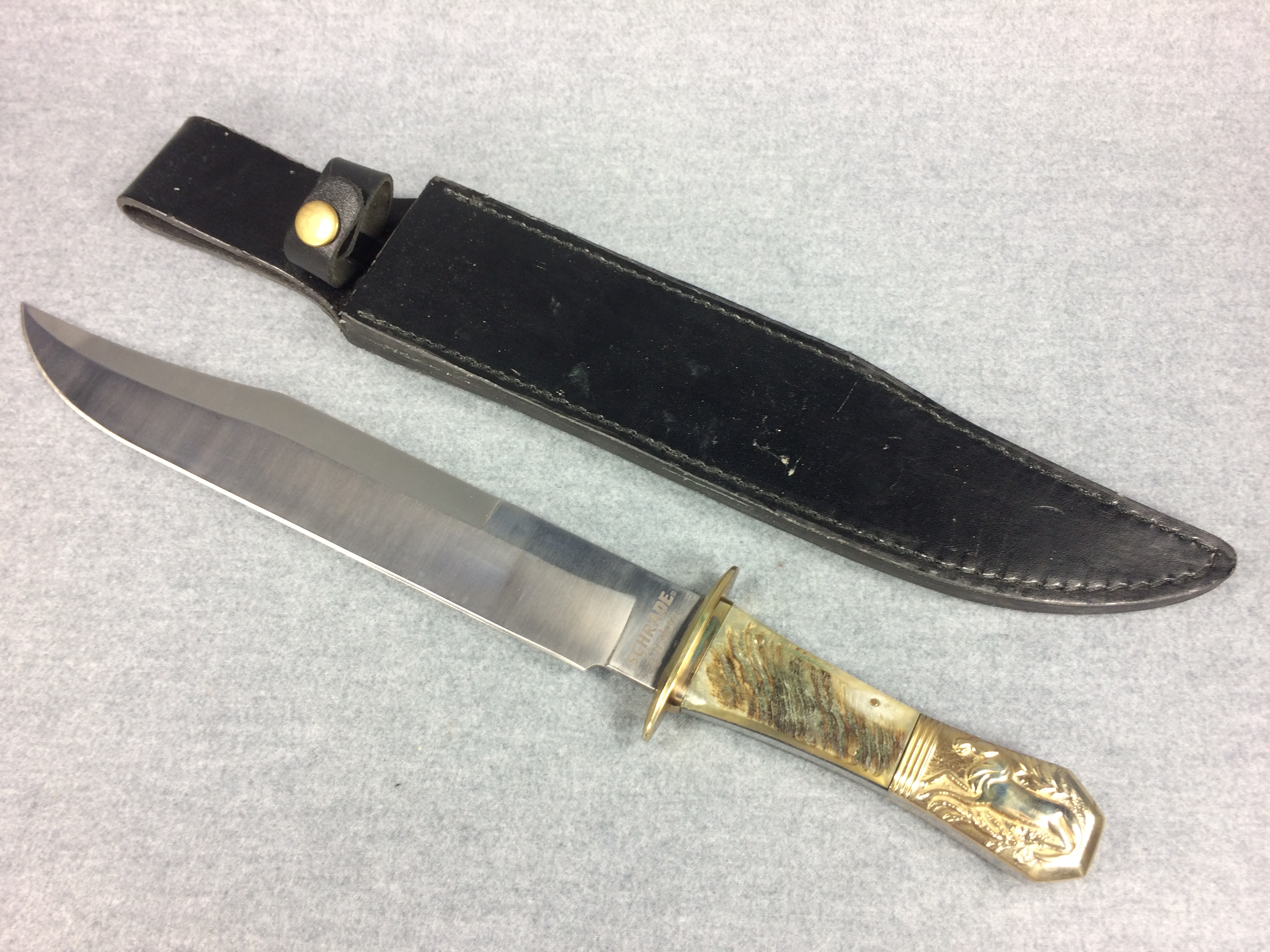April 03, 2026 - Fixed Blade Bowie Knife. 15 inches long overall. Blade is 10-1/4 inches long. "SCHRADE Custom" and "Stewart A Taylor & Sons SCH1850SH" tang stamps. Ram's horn handle. With black leather sheath.
