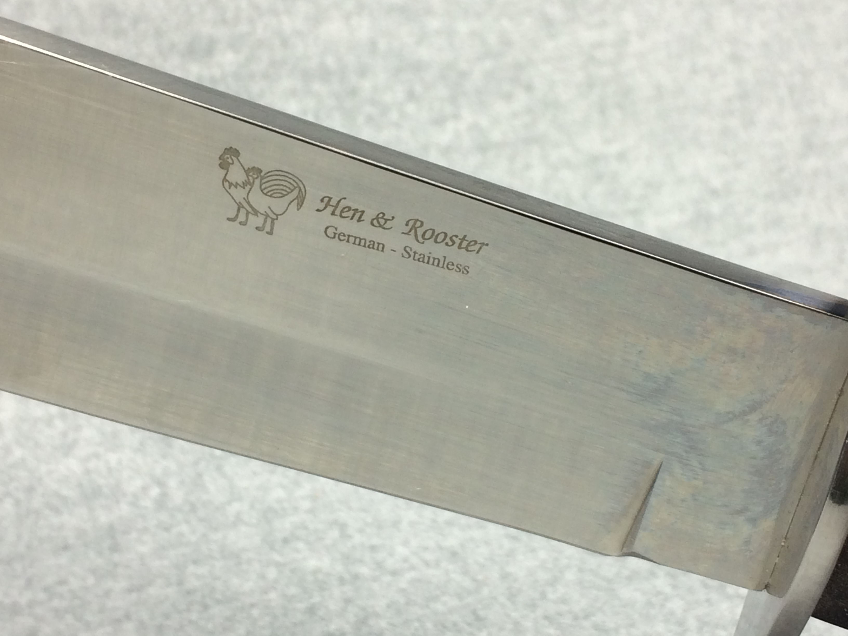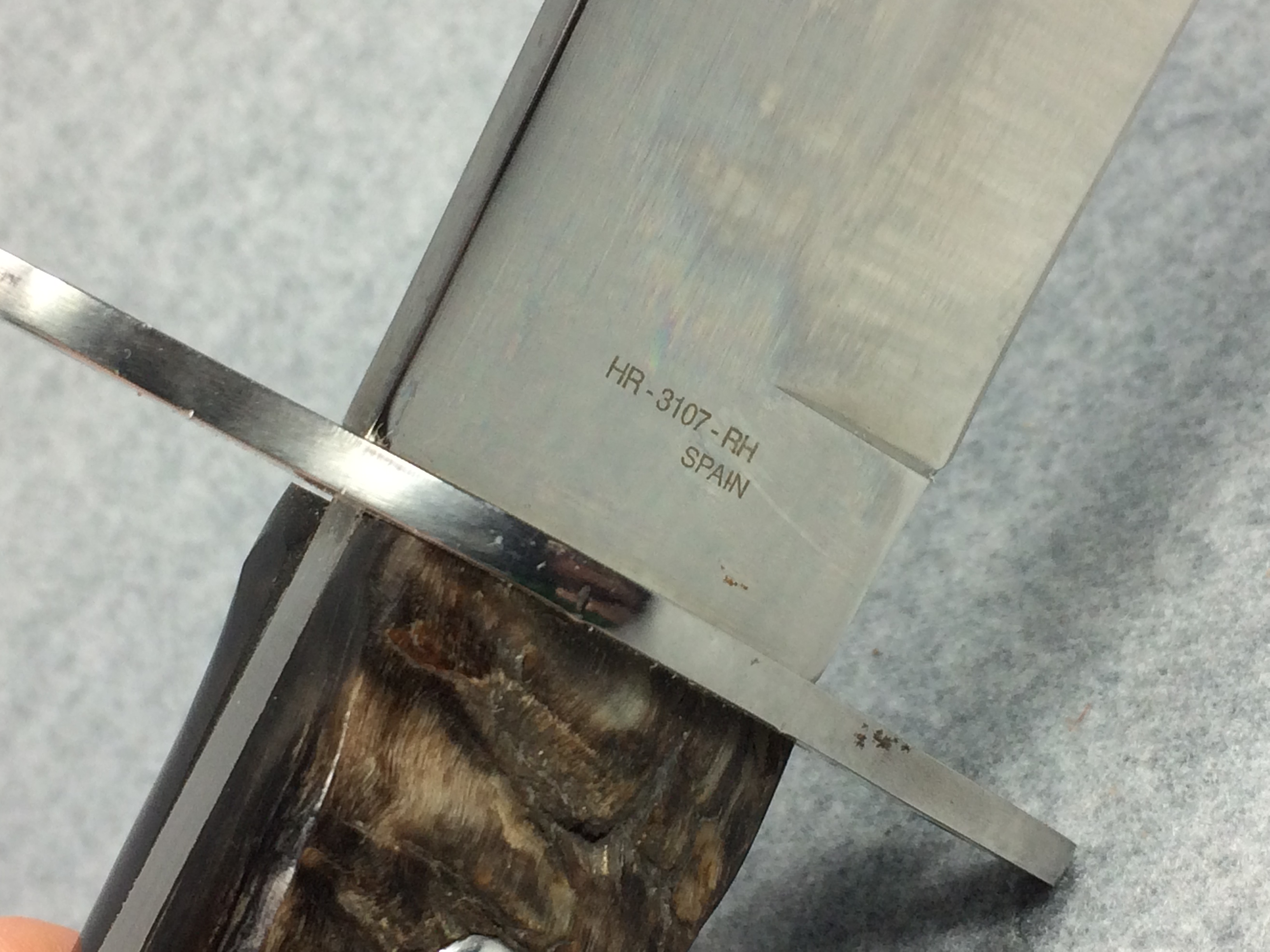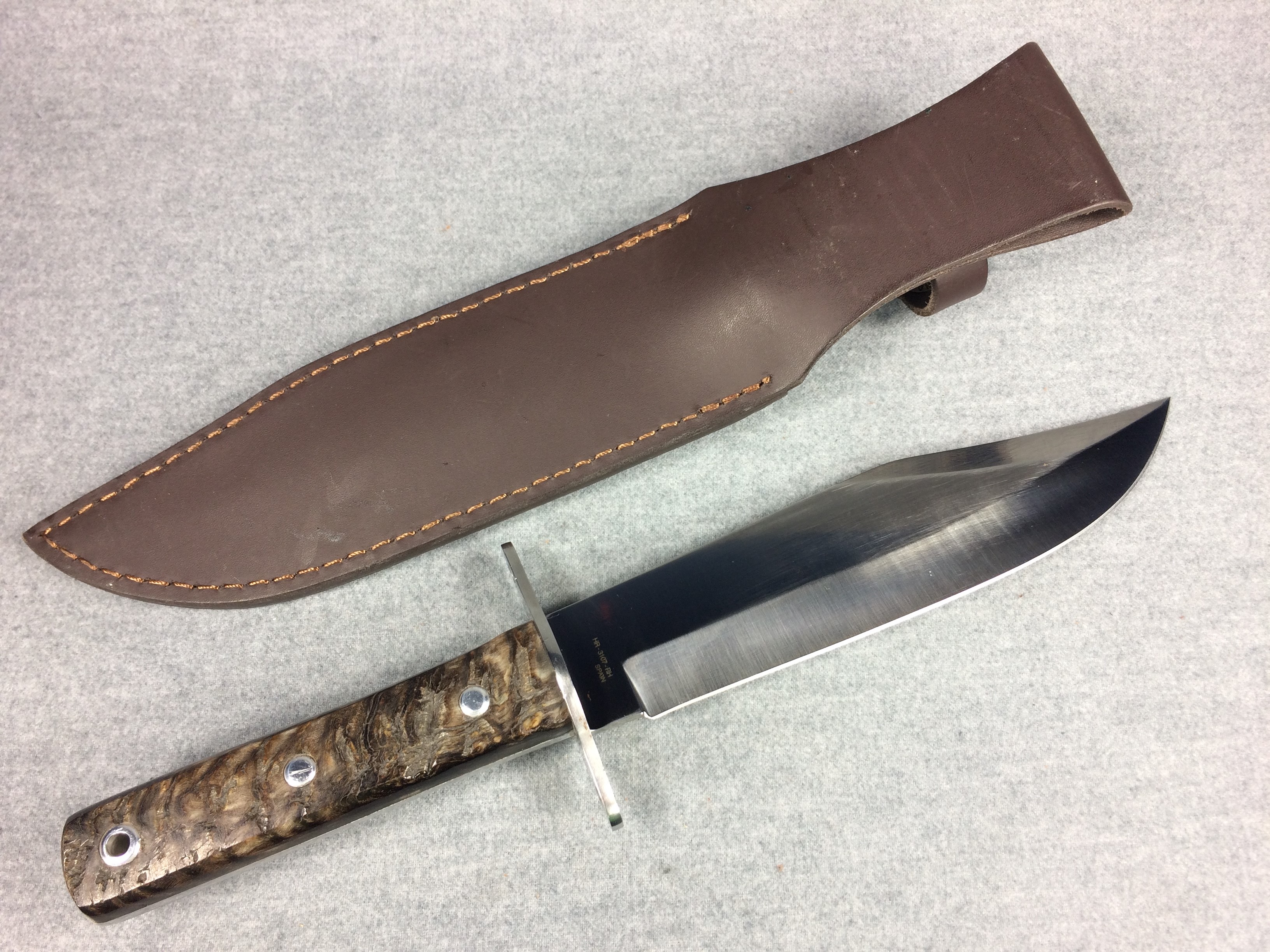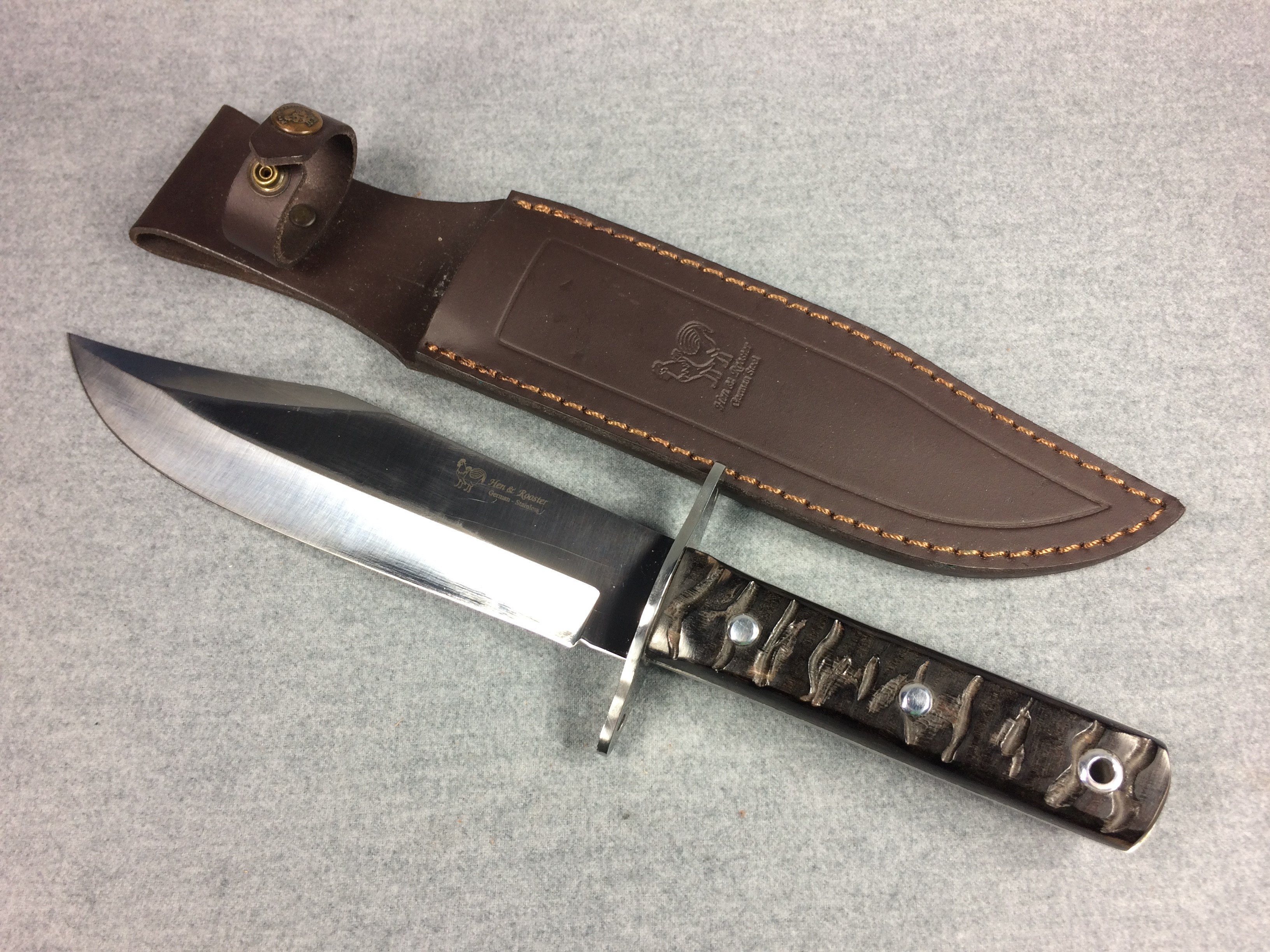 November 03, 2025 - Fixed Blade Bowie Knife. 13 inches long overall. Blade is 7-7/8 inches long. "HR-3107-RH SPAIN" tang stamp. Blade stamped "Hen & Rooster GERMAN STAINLESS" with Hen & Rooster logo. Ram's horn handle.