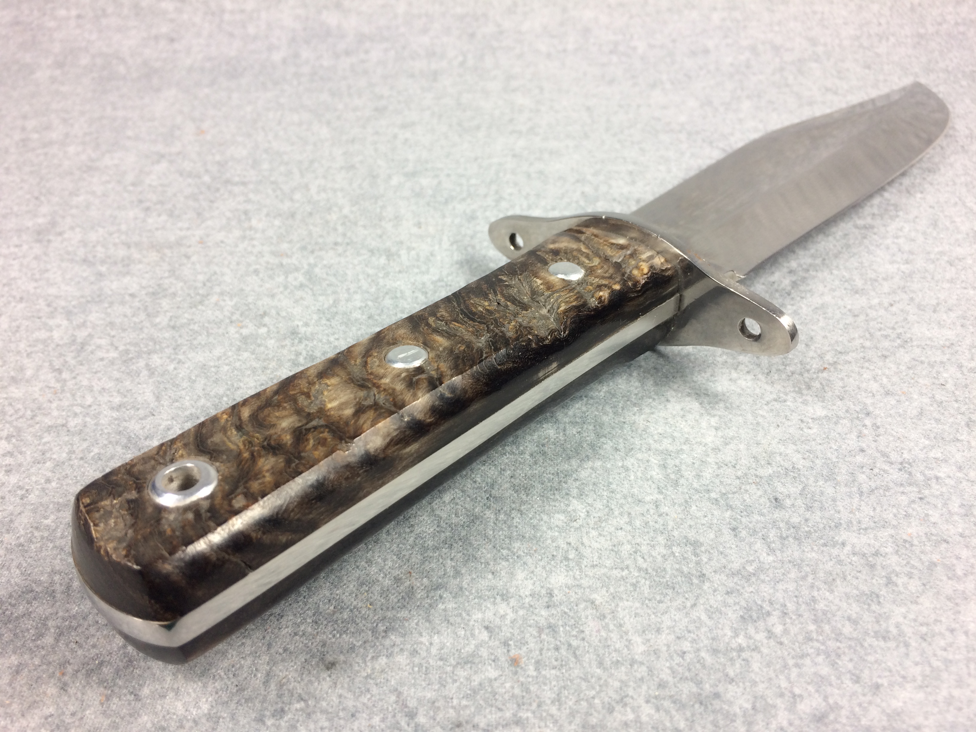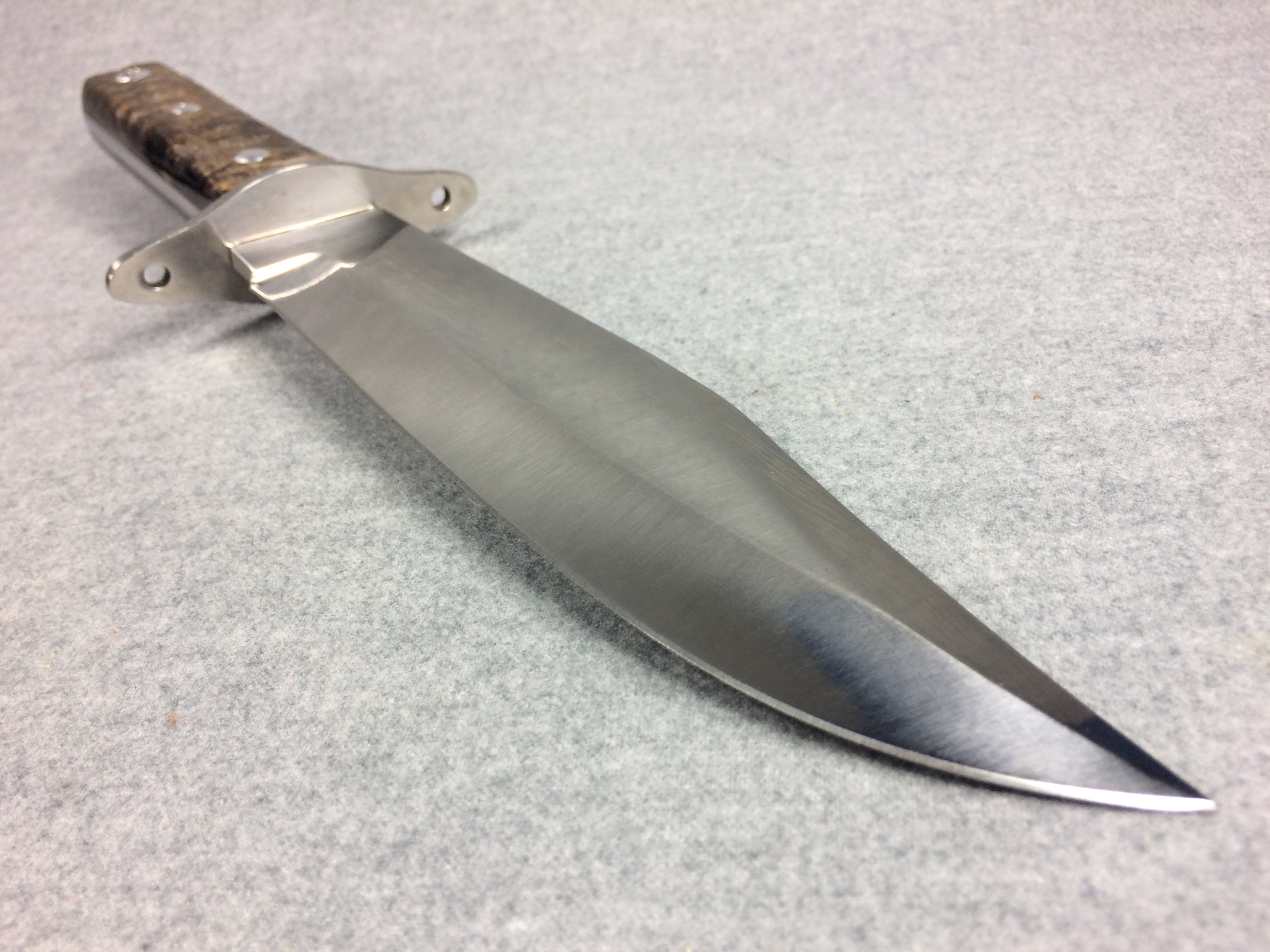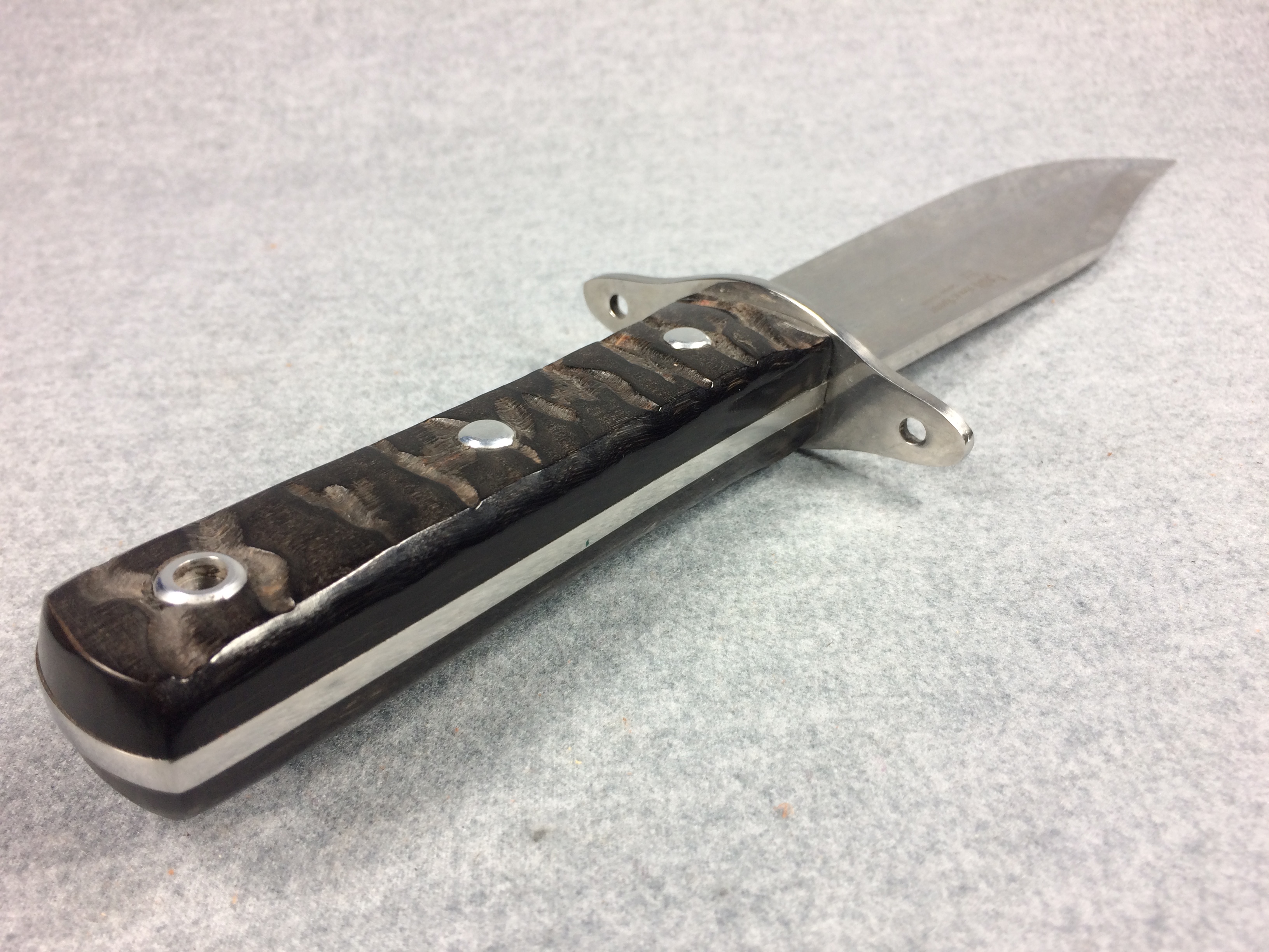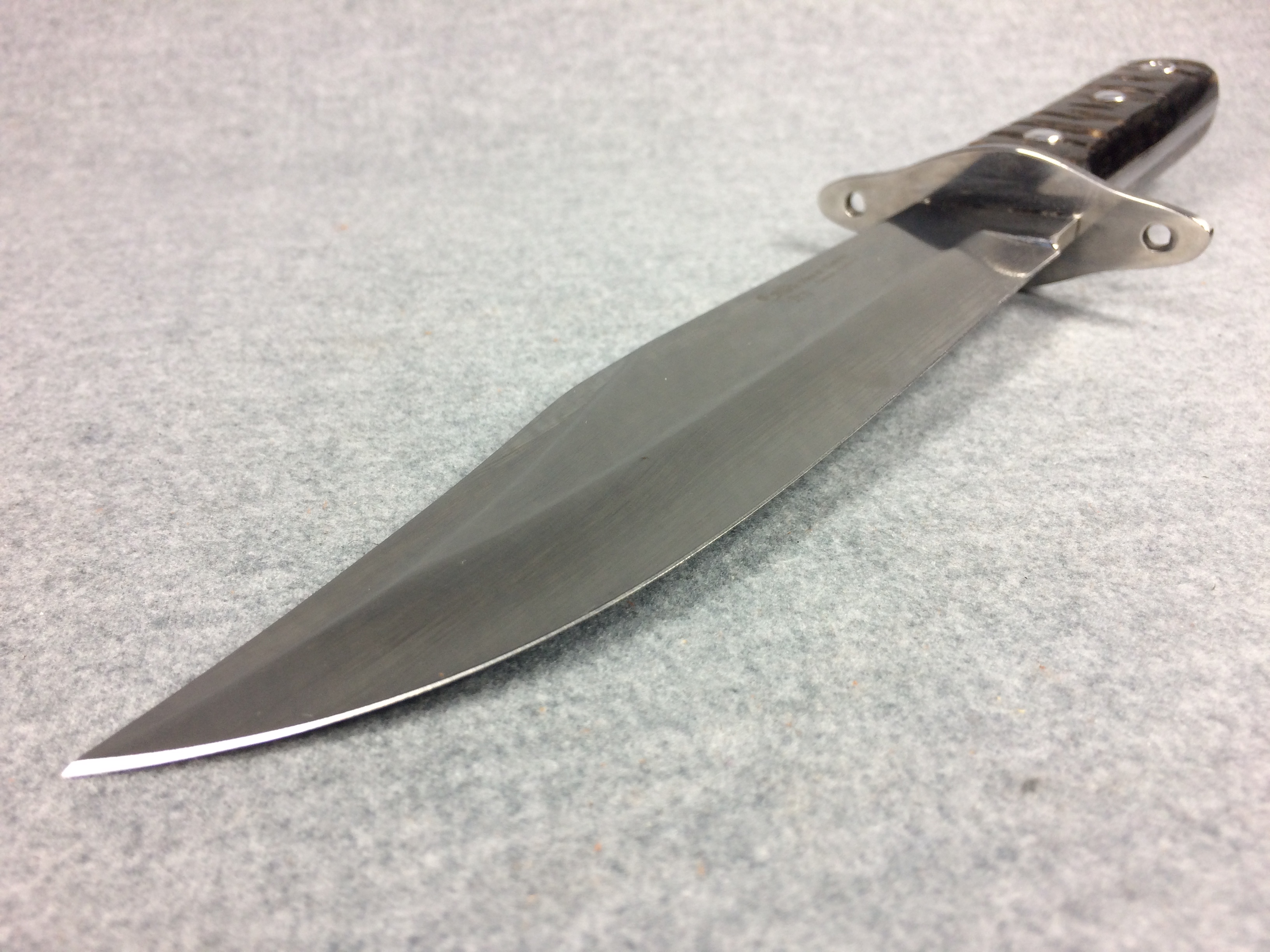 November 03, 2025 - Fixed Blade Bowie Knife. 13 inches long overall. Blade is 7-7/8 inches long. "HR-3107-RH SPAIN" tang stamp. Blade stamped "Hen & Rooster GERMAN STAINLESS" with Hen & Rooster logo. Ram's horn handle.